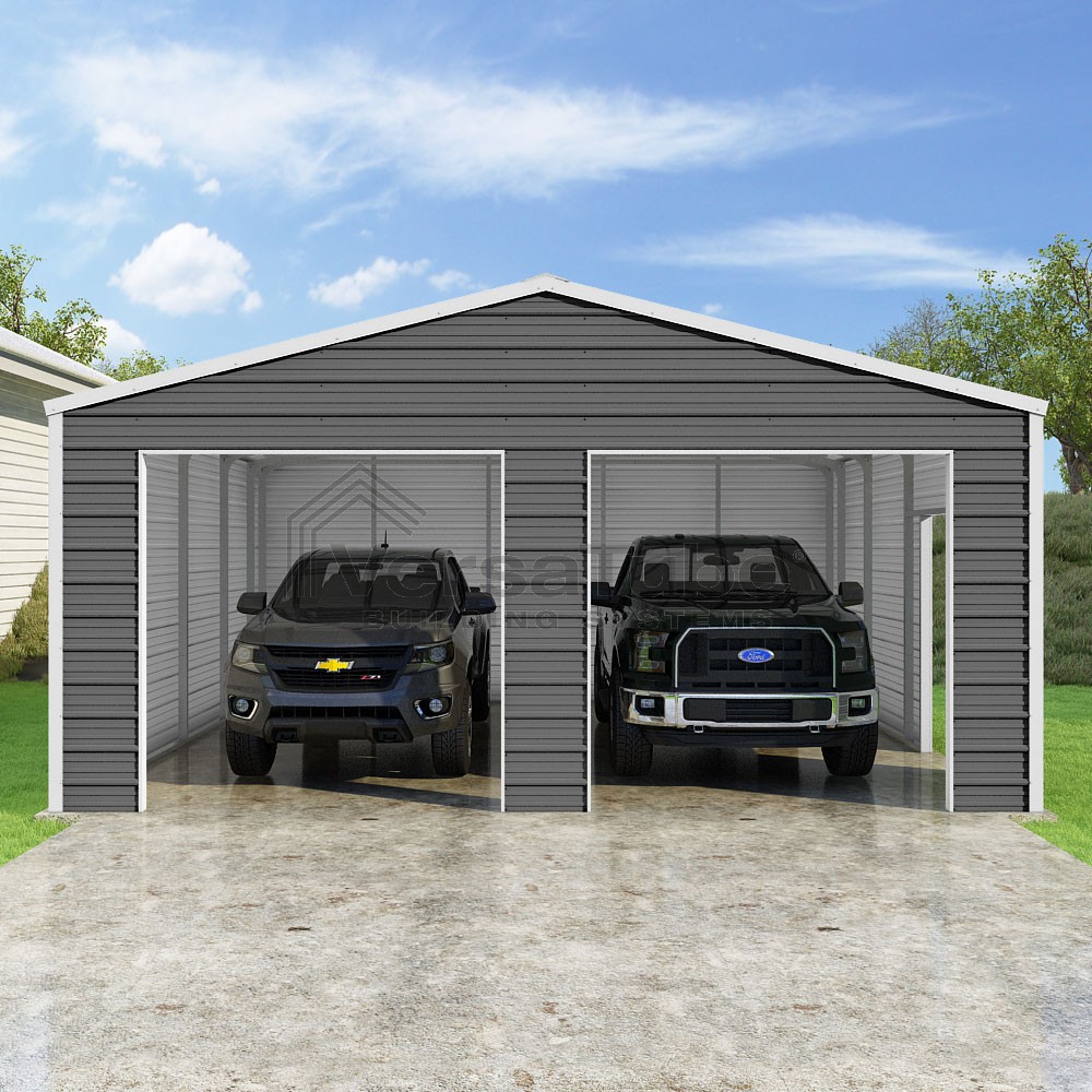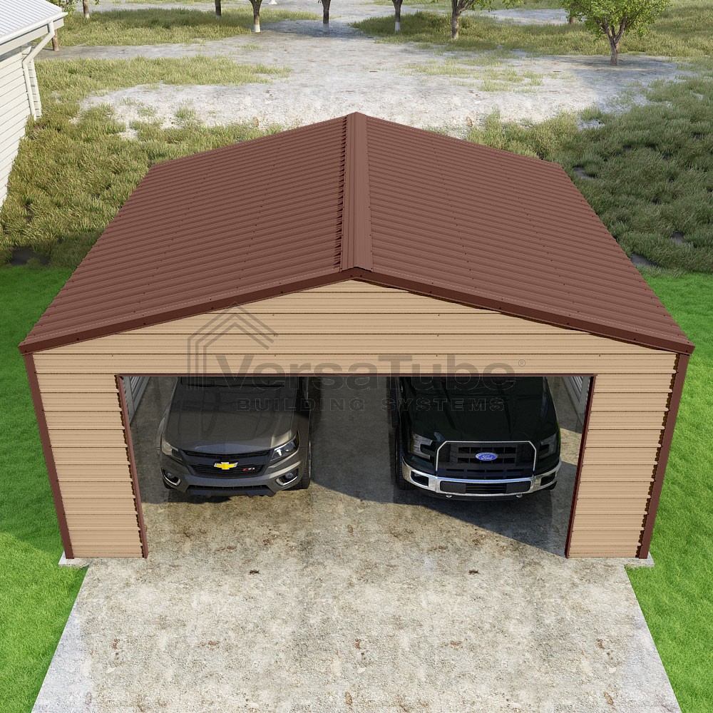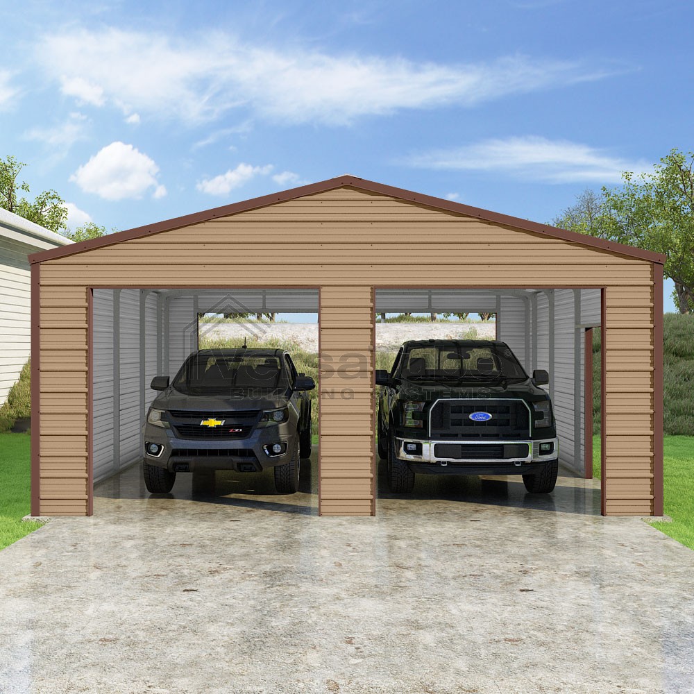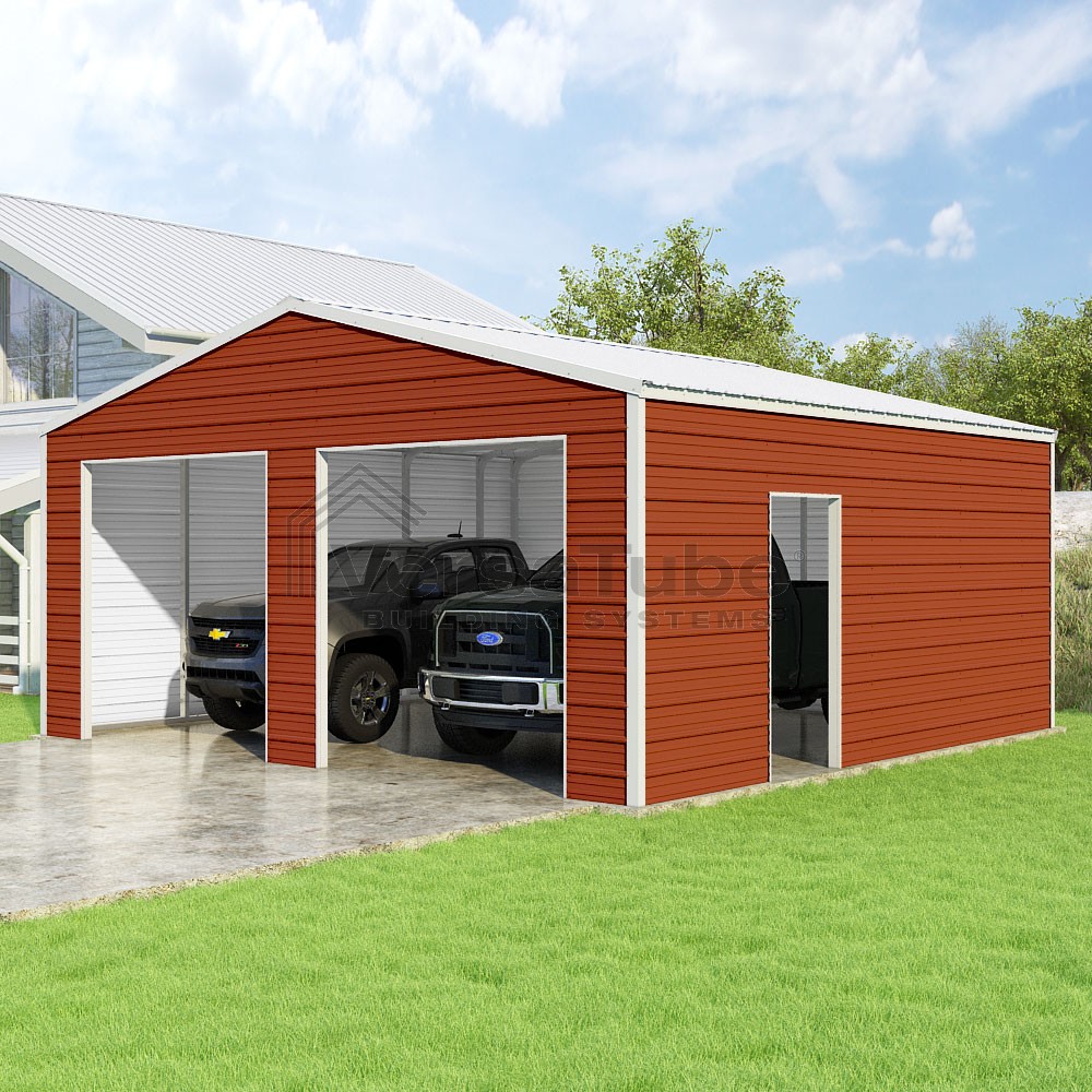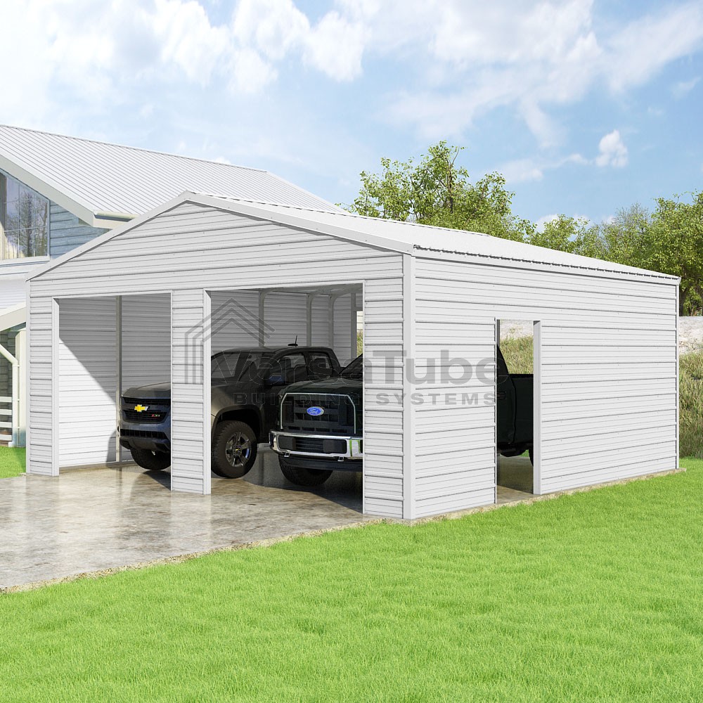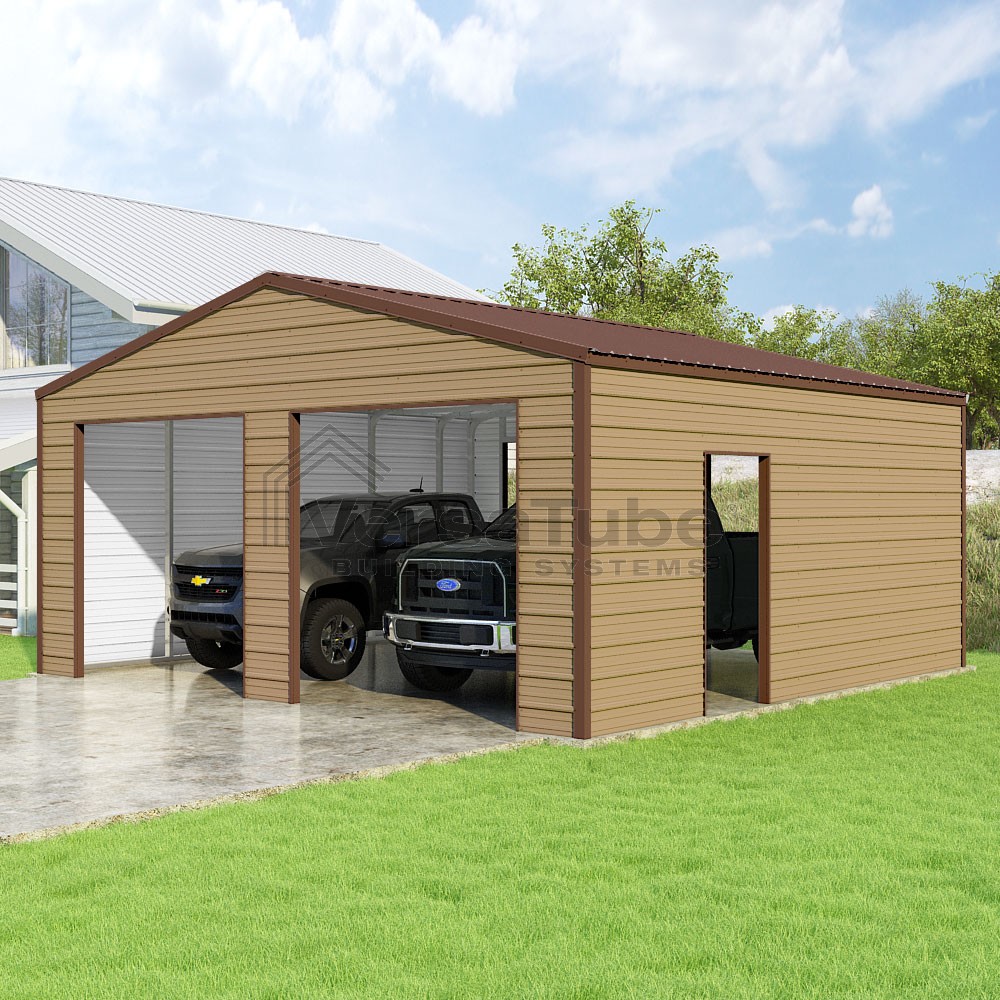 Frontier Series DIY garage kit features vertical sheet metal roof panels with horizontal siding panels..