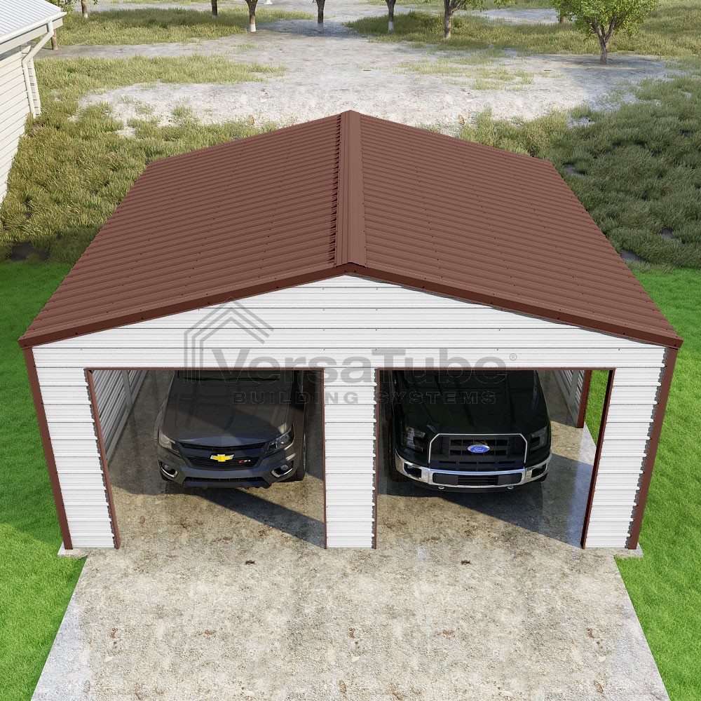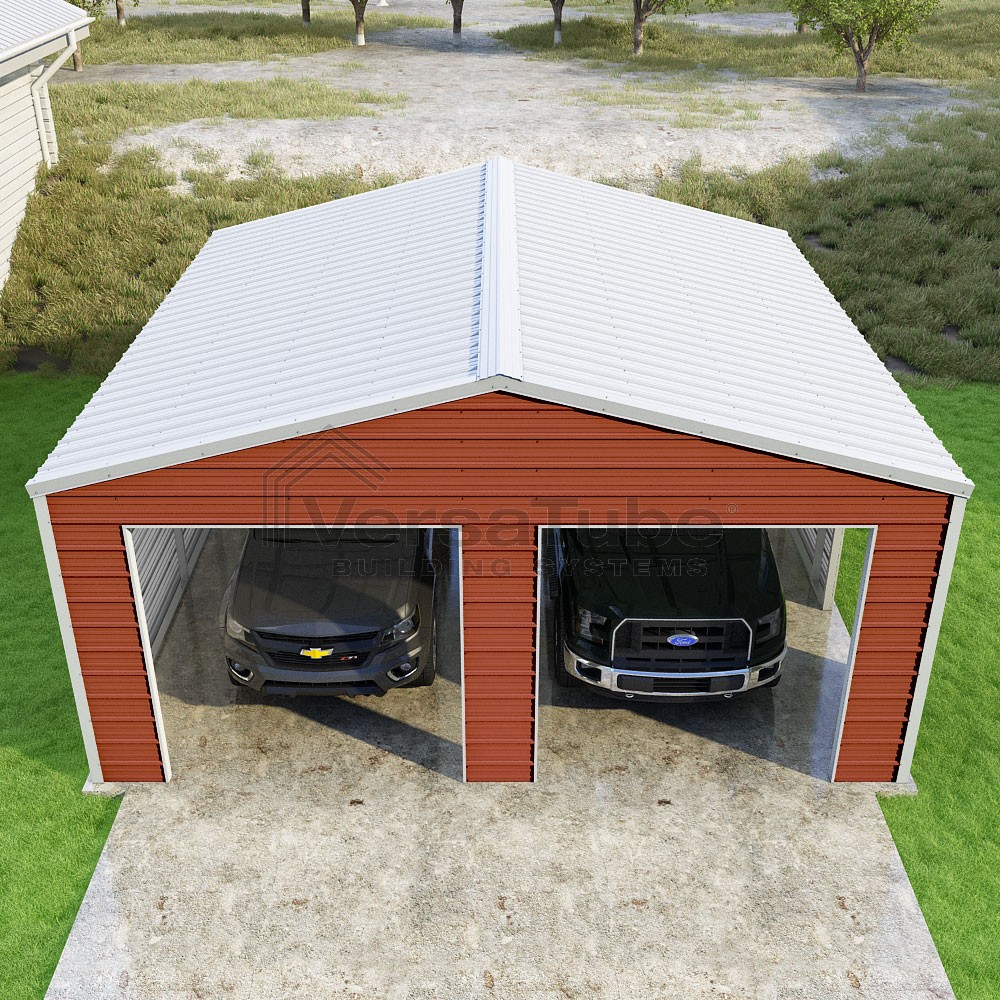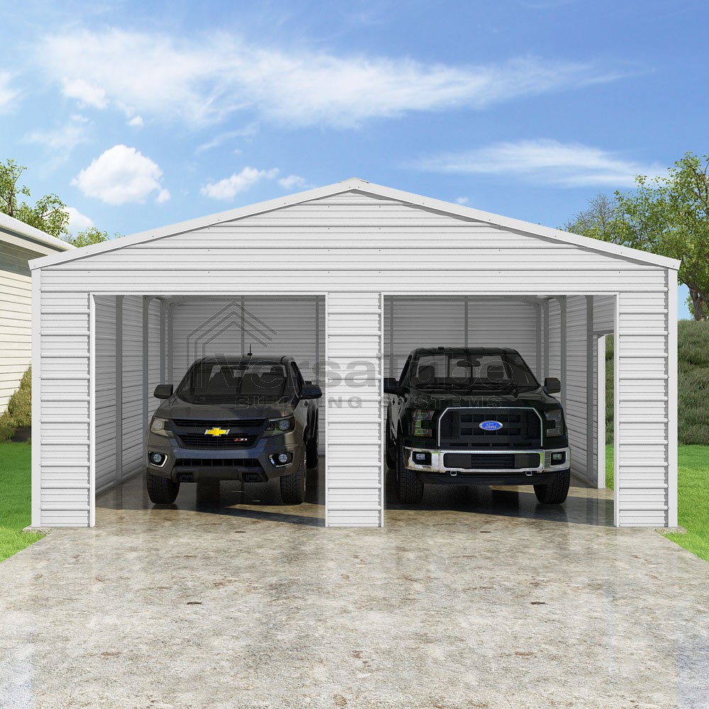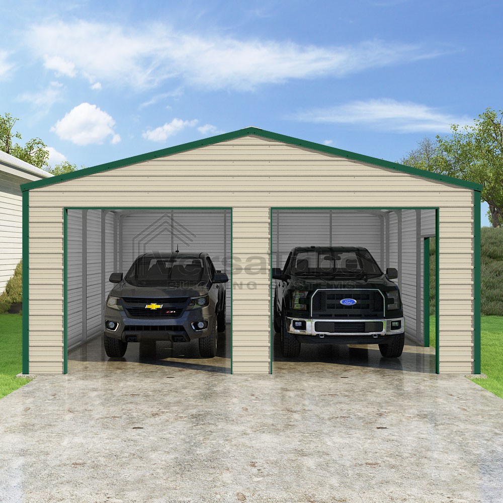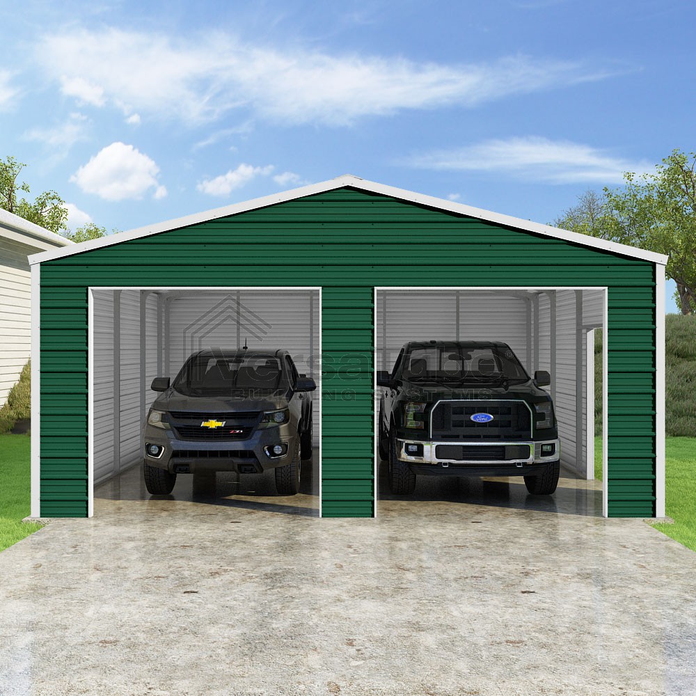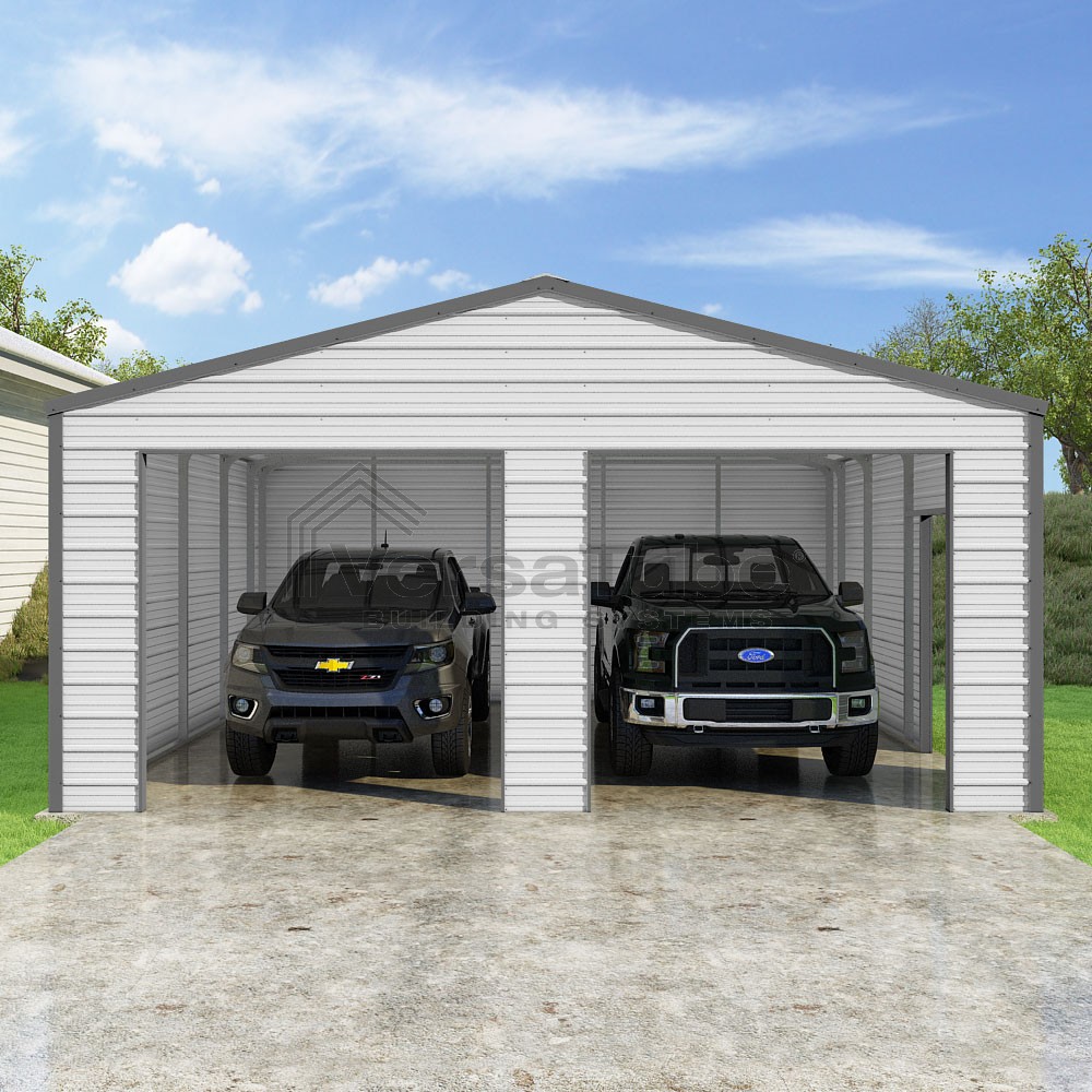 Frontier Series DIY garage kit features vertical sheet metal roof panels with horizontal siding panels..