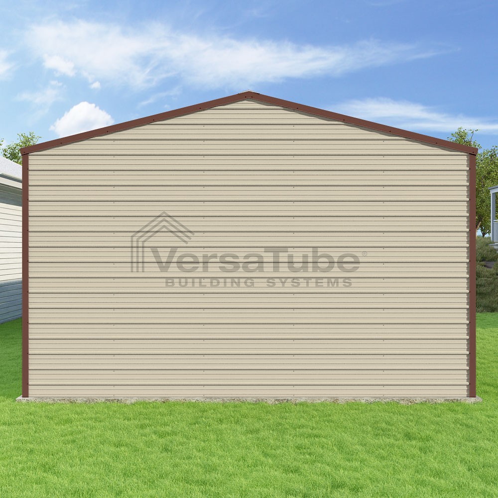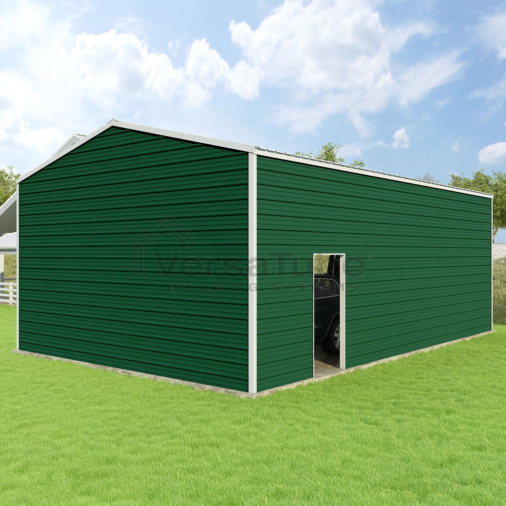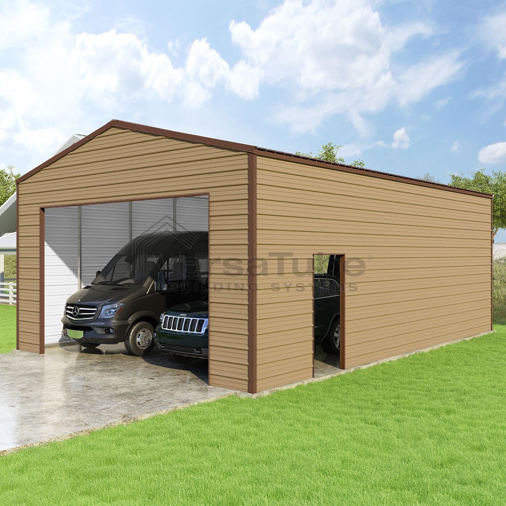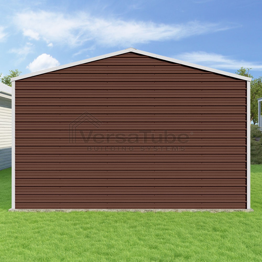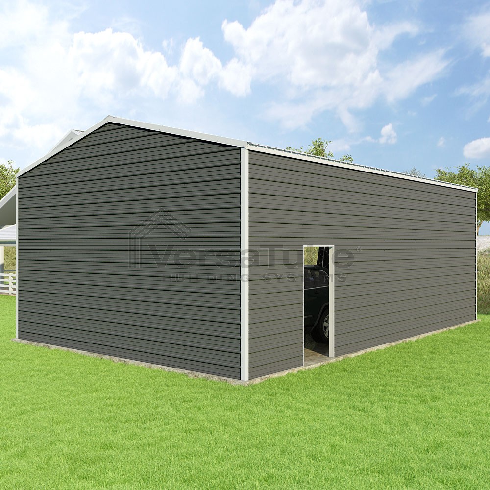 Frontier Series DIY garage kit features vertical sheet metal roof panels with horizontal siding panels..