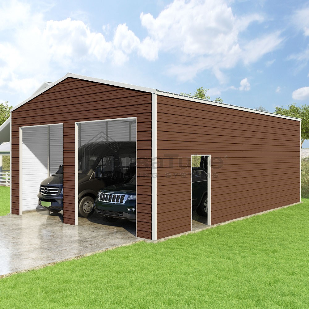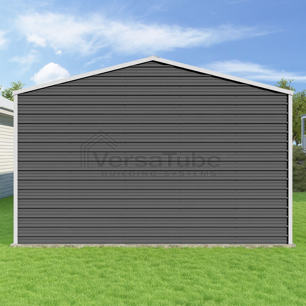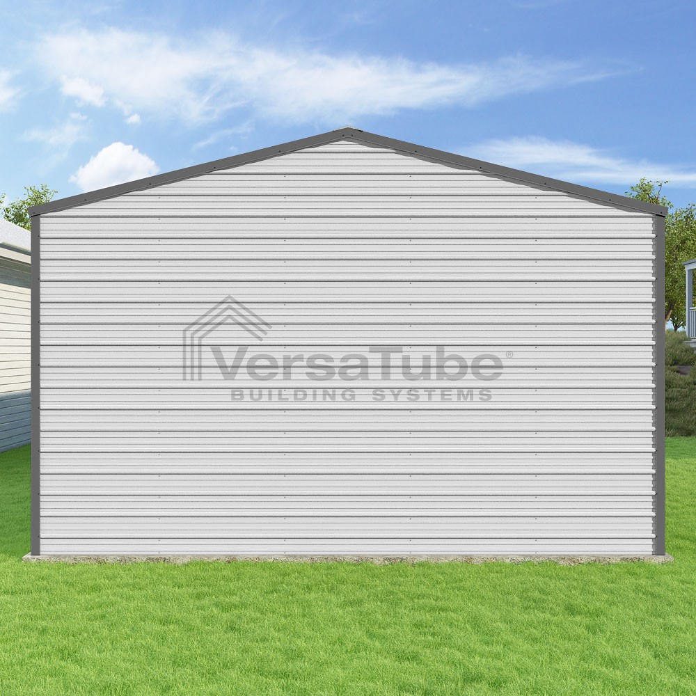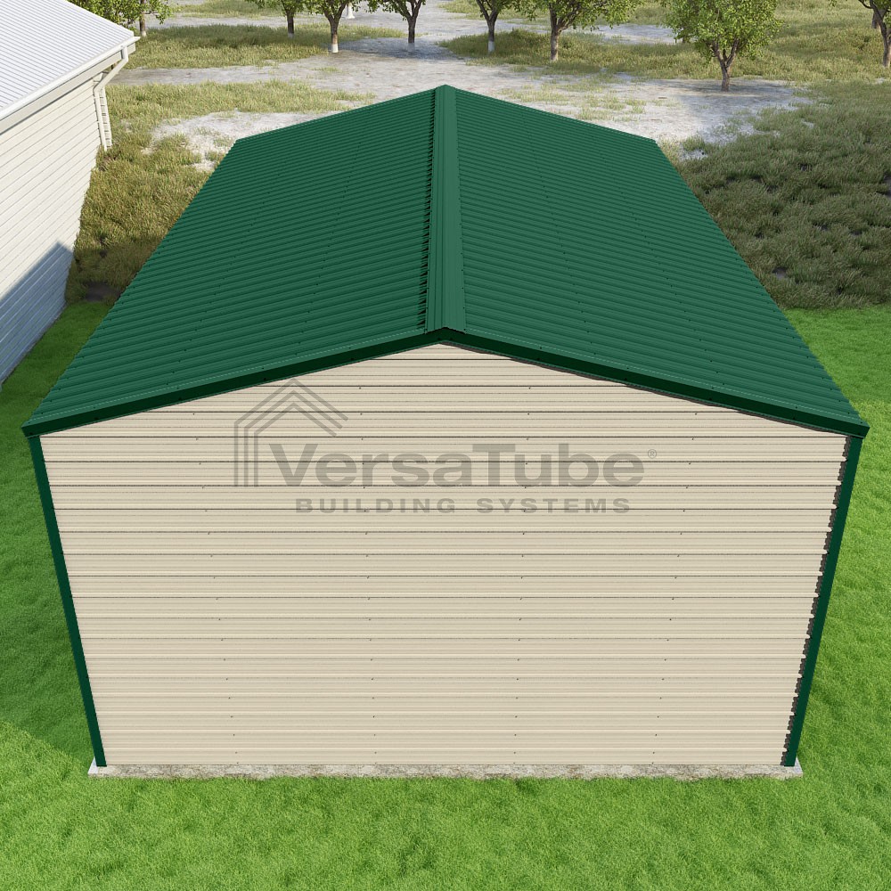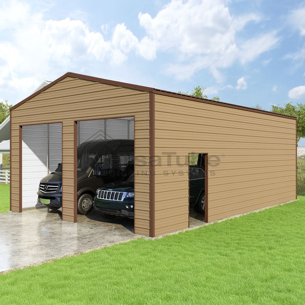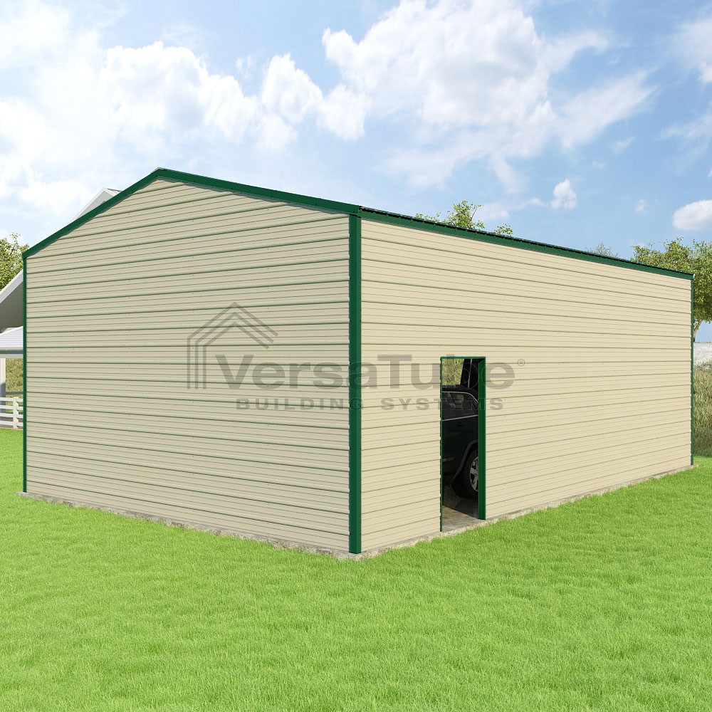 Frontier Series DIY garage kit features vertical sheet metal roof panels with horizontal siding panels..