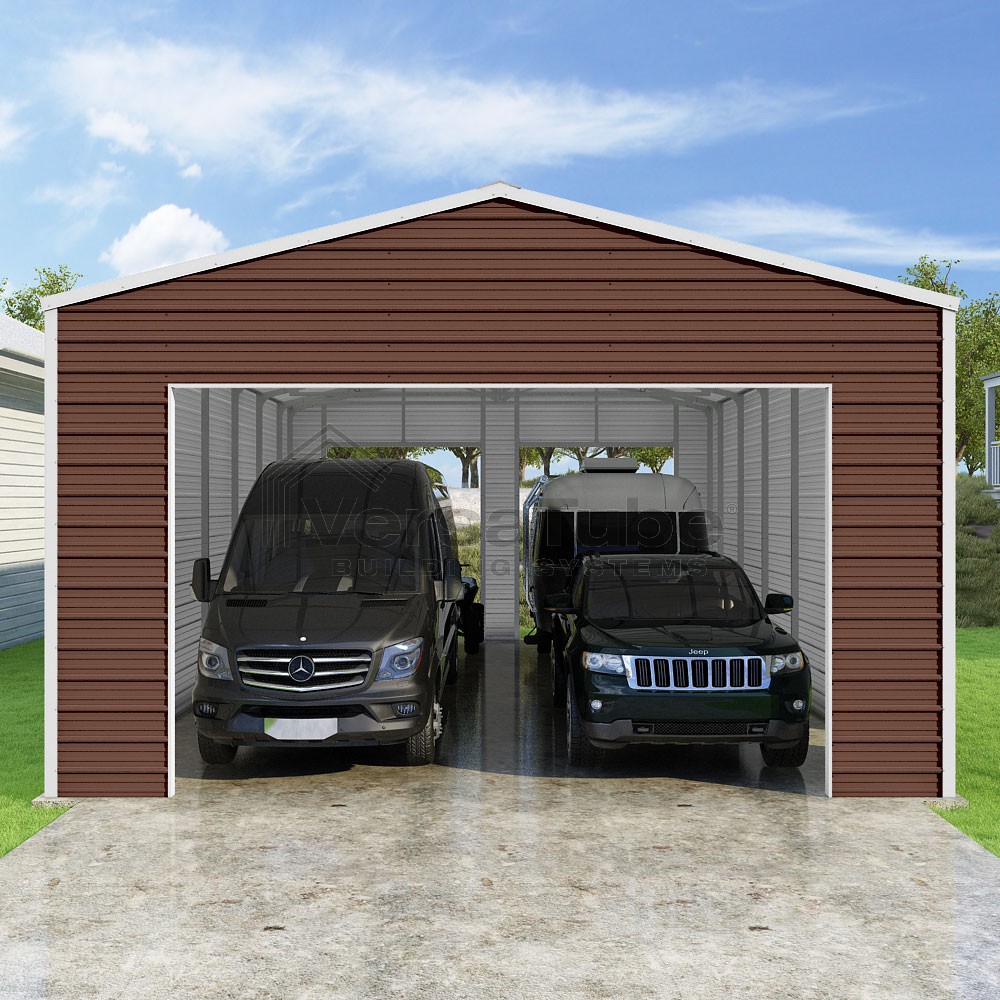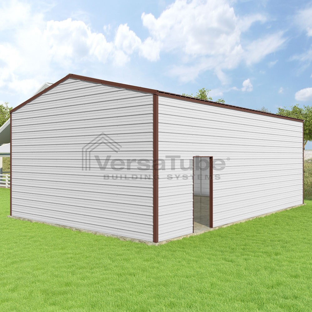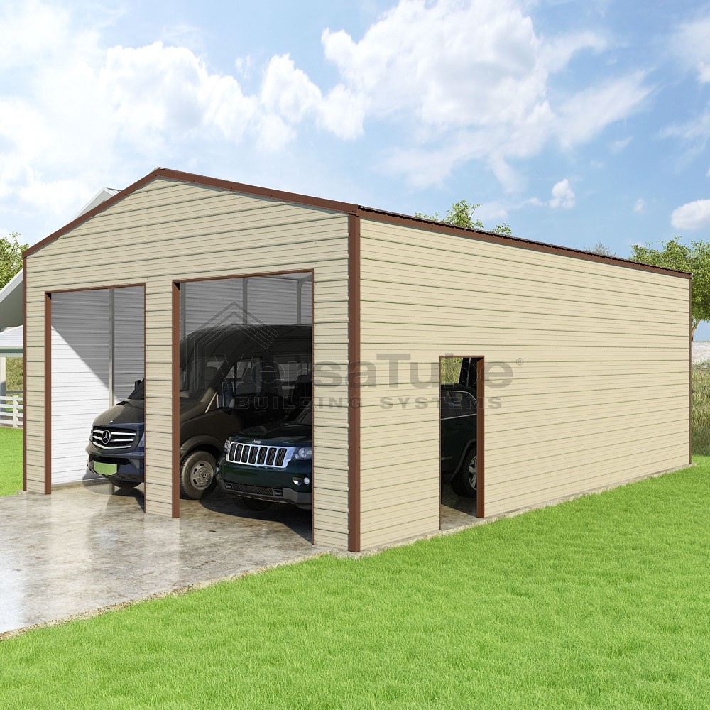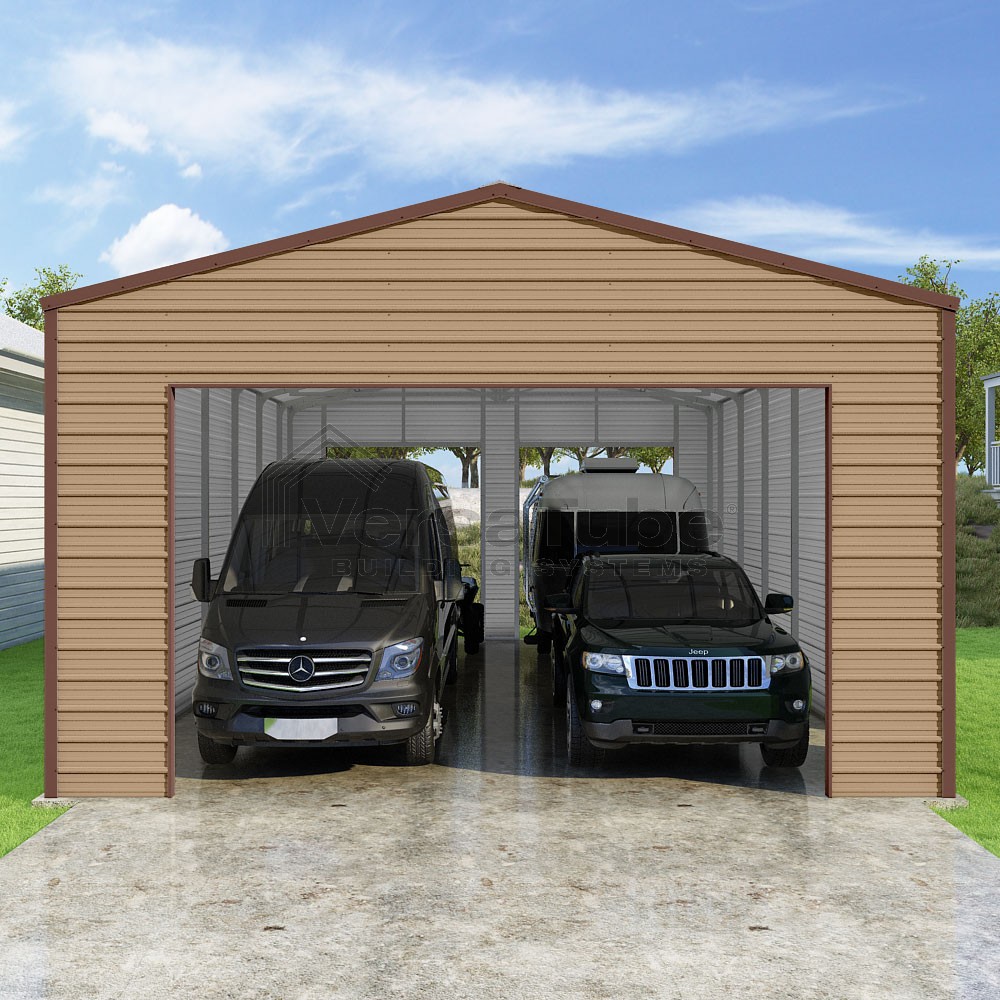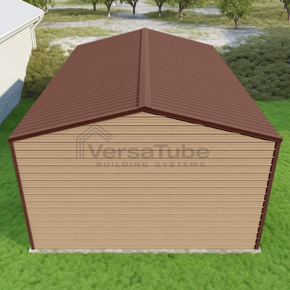 Frontier Series DIY garage kit features vertical sheet metal roof panels with horizontal siding panels..