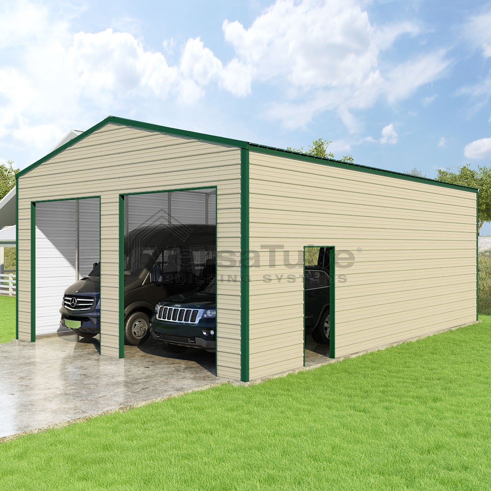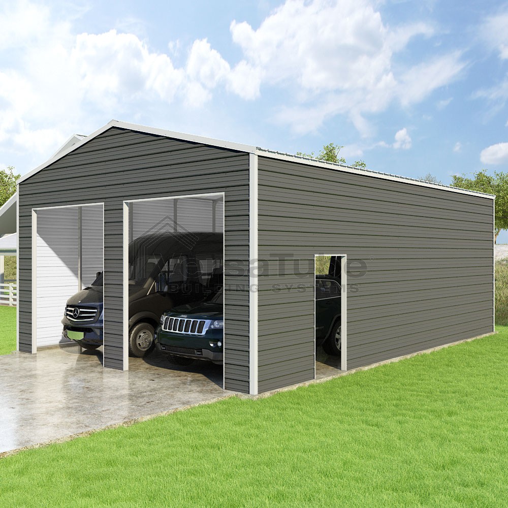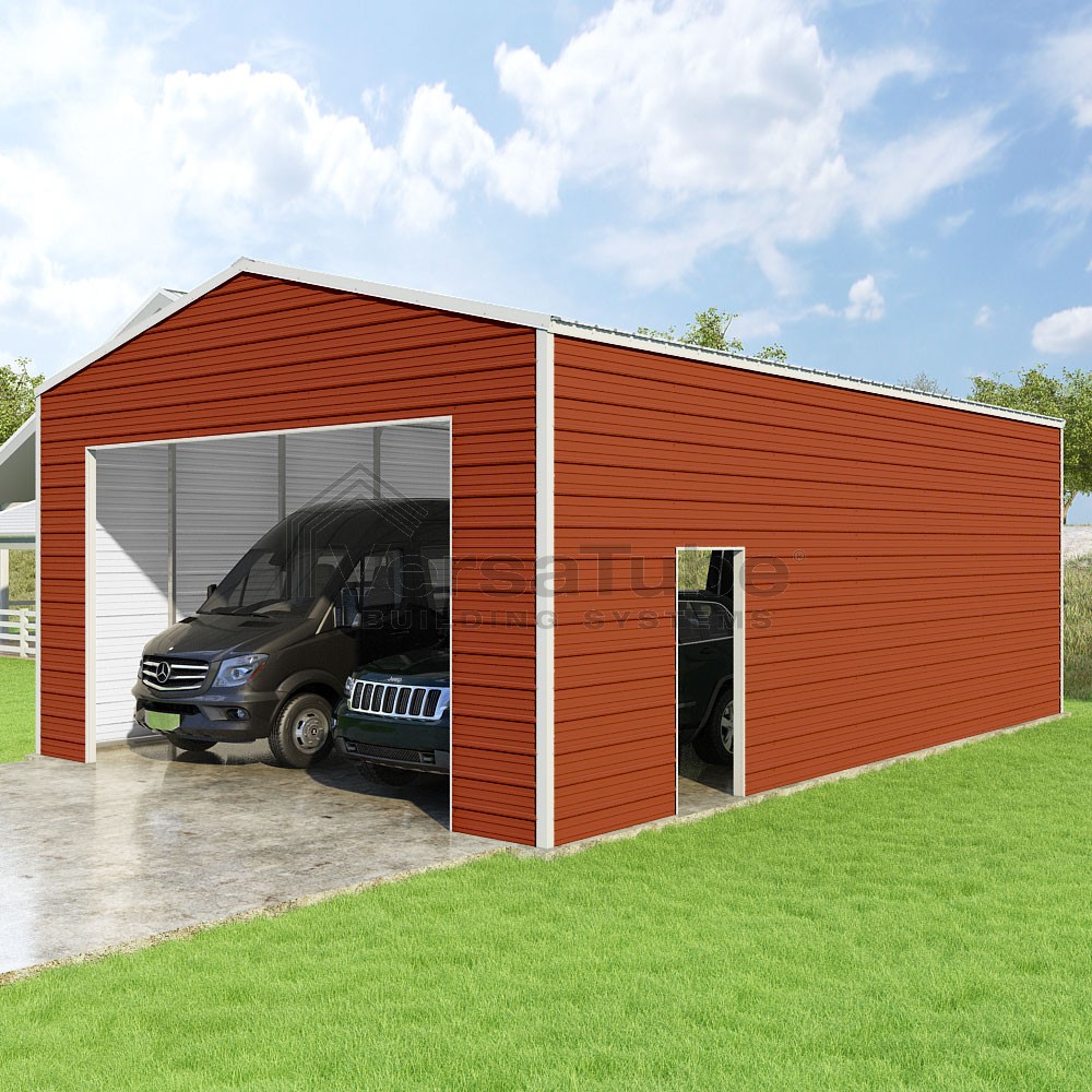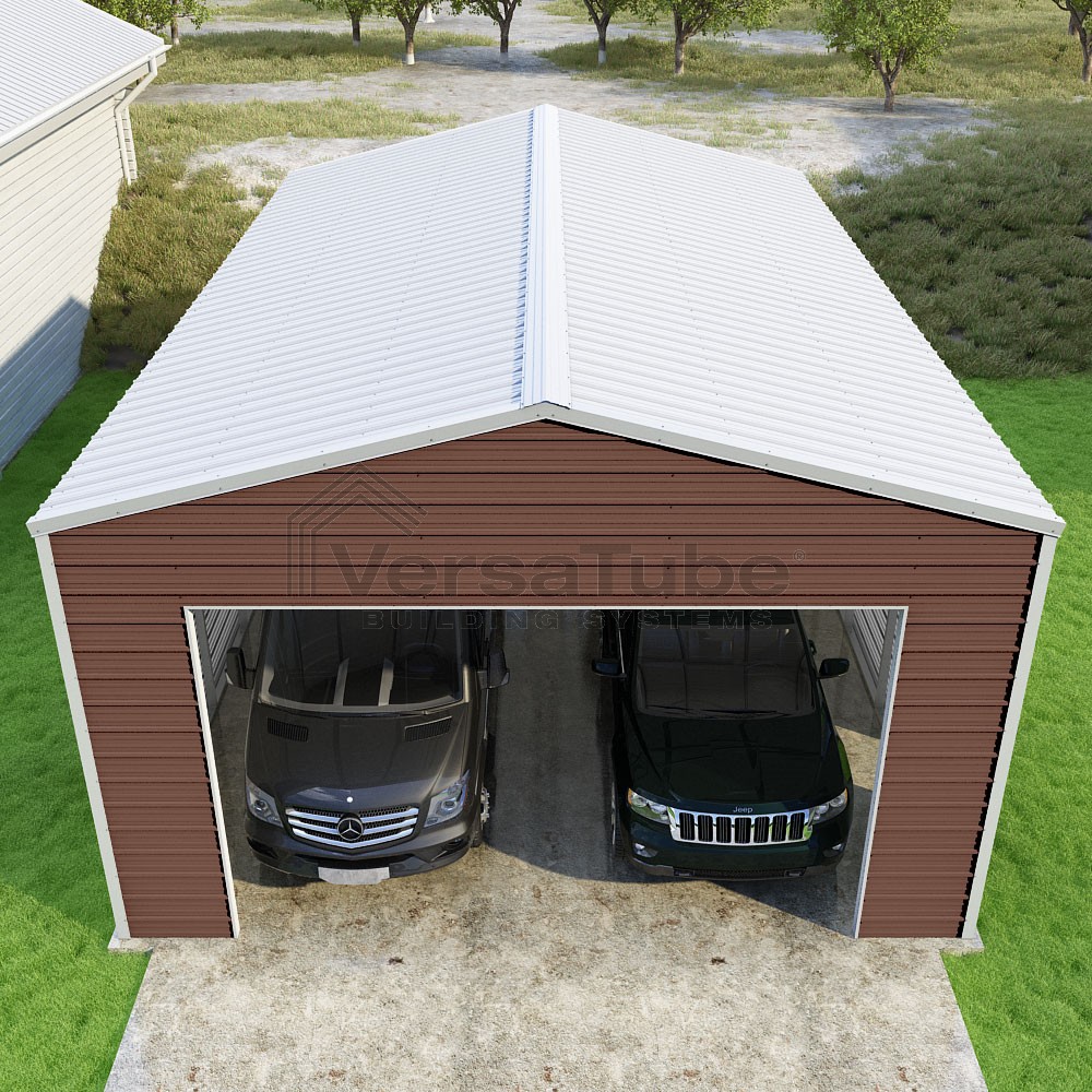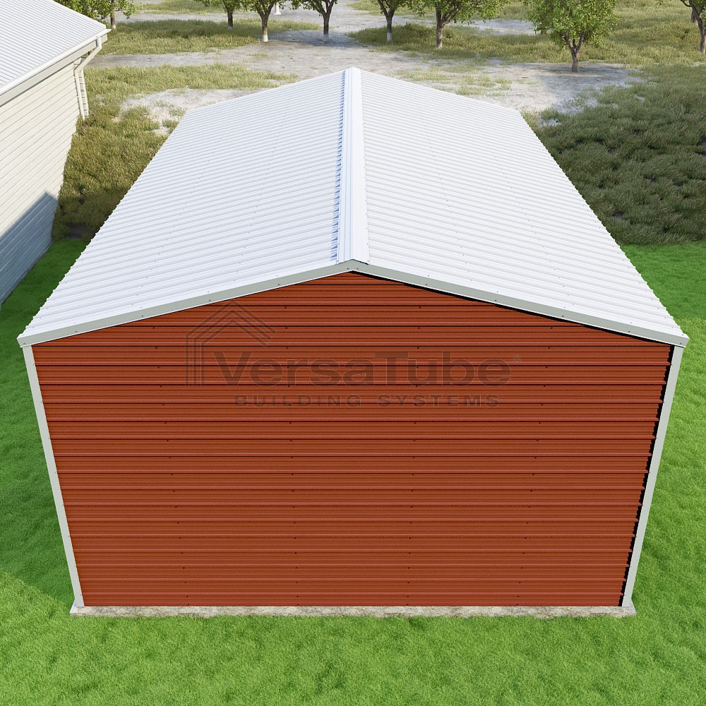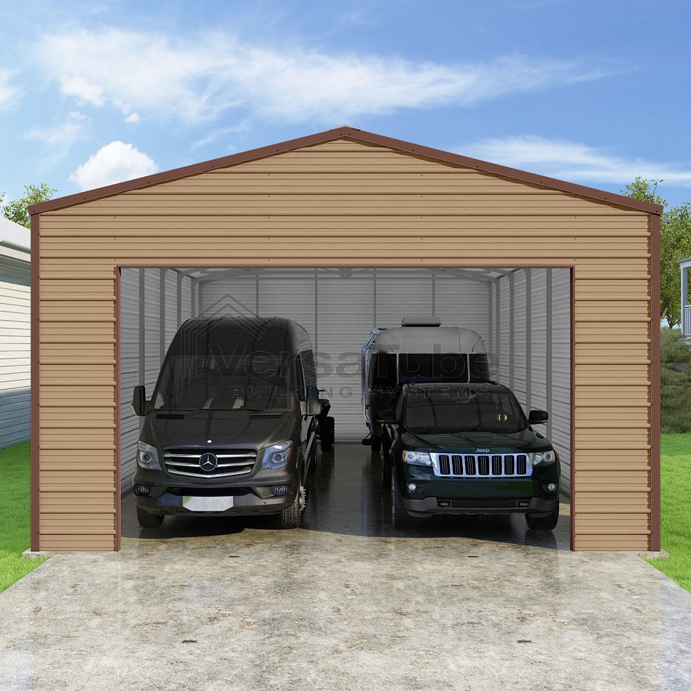 Frontier Series DIY garage kit features vertical sheet metal roof panels with horizontal siding panels..