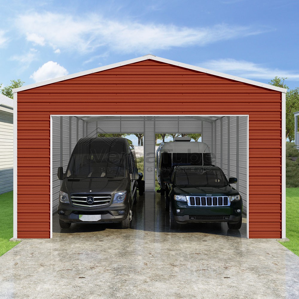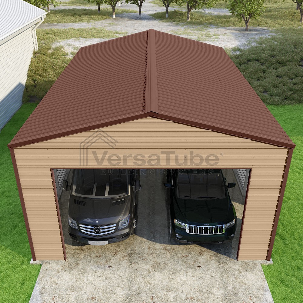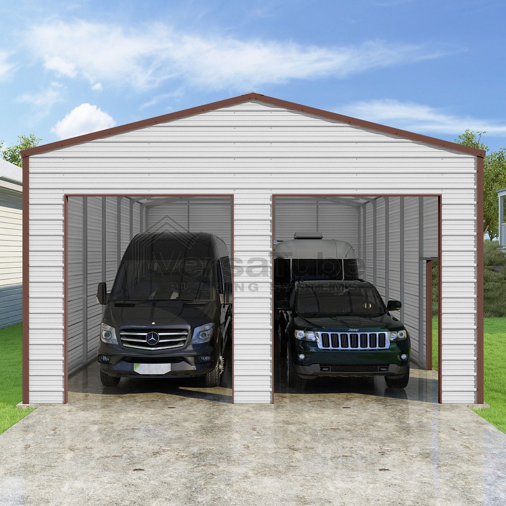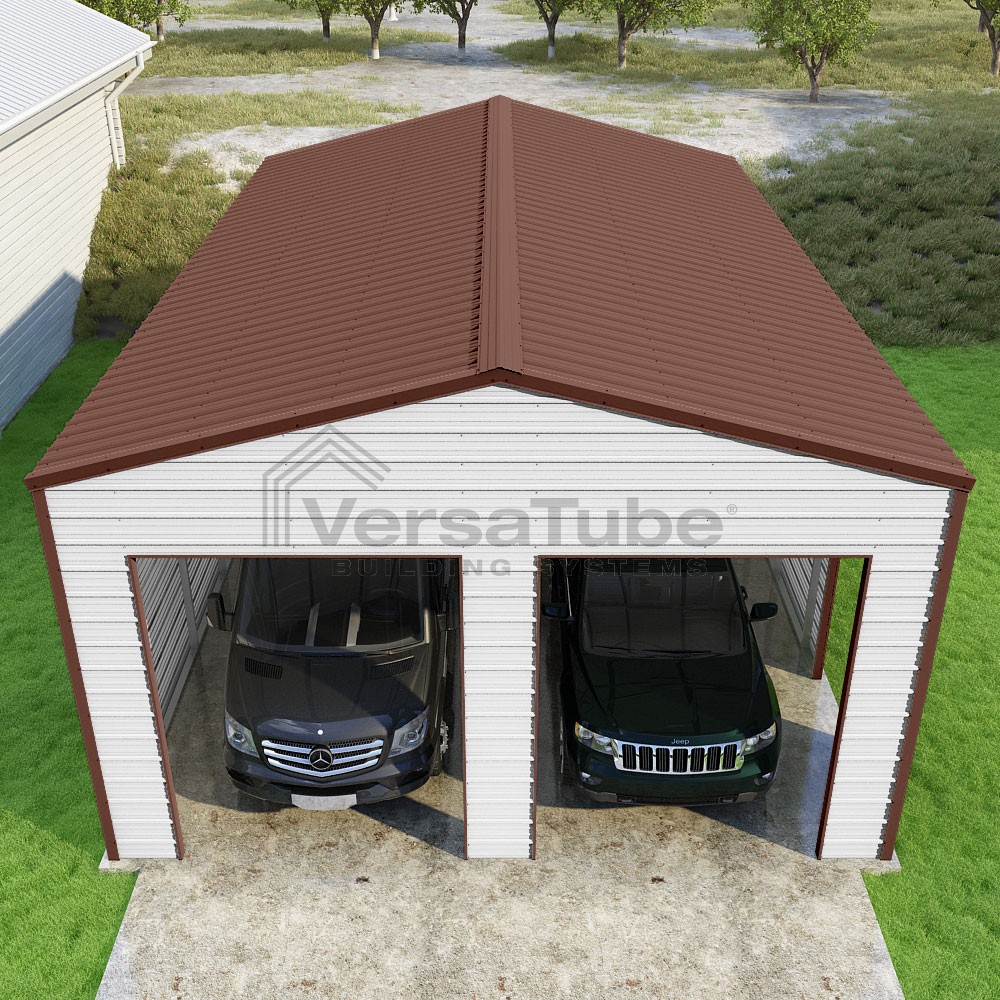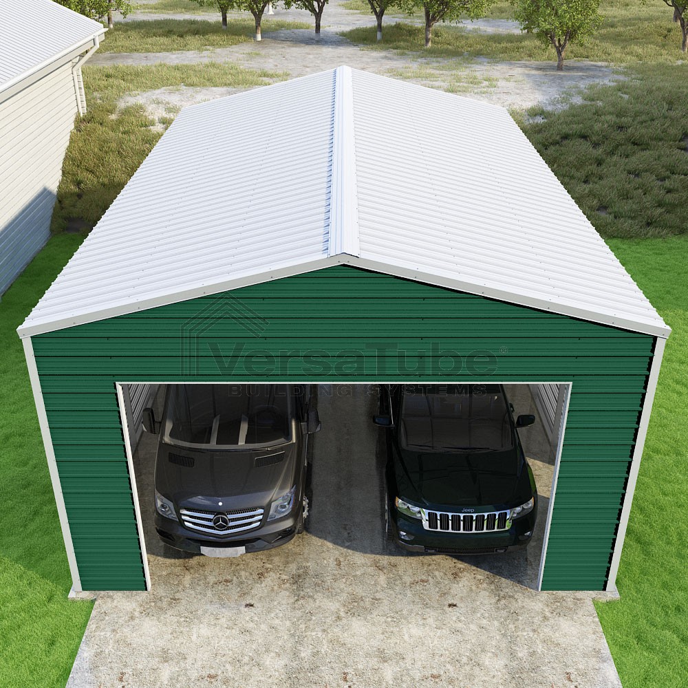 Frontier Series DIY garage kit features vertical sheet metal roof panels with horizontal siding panels..