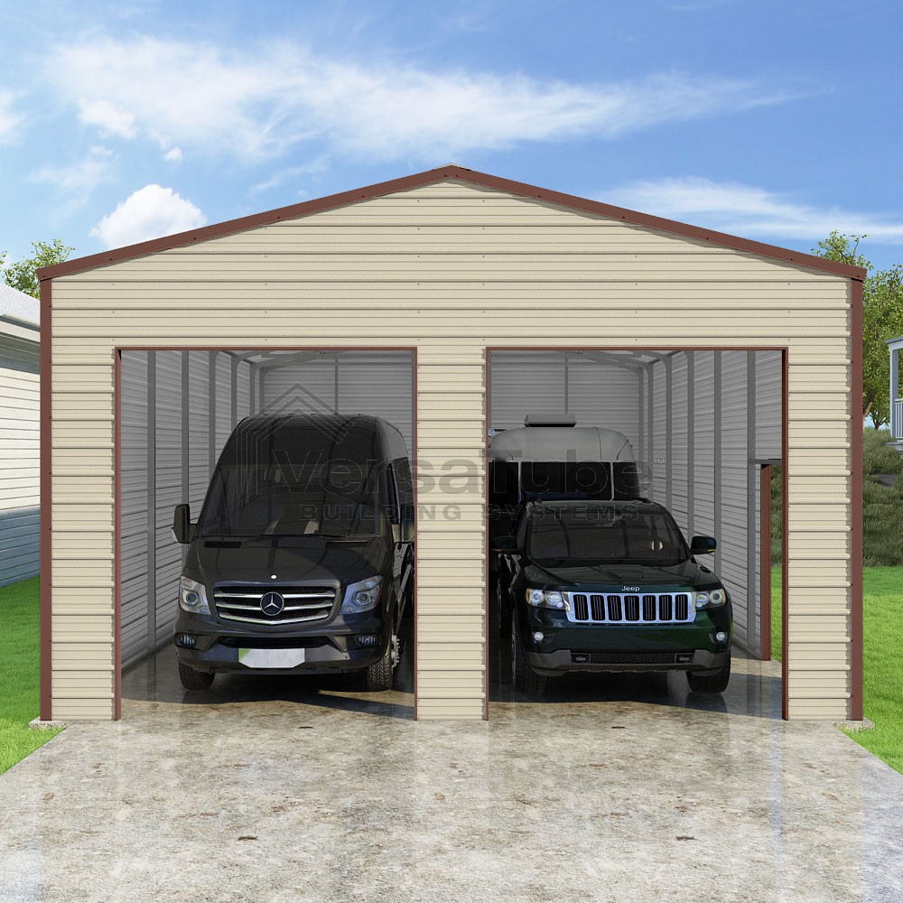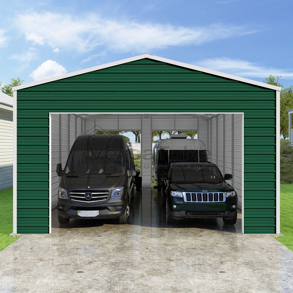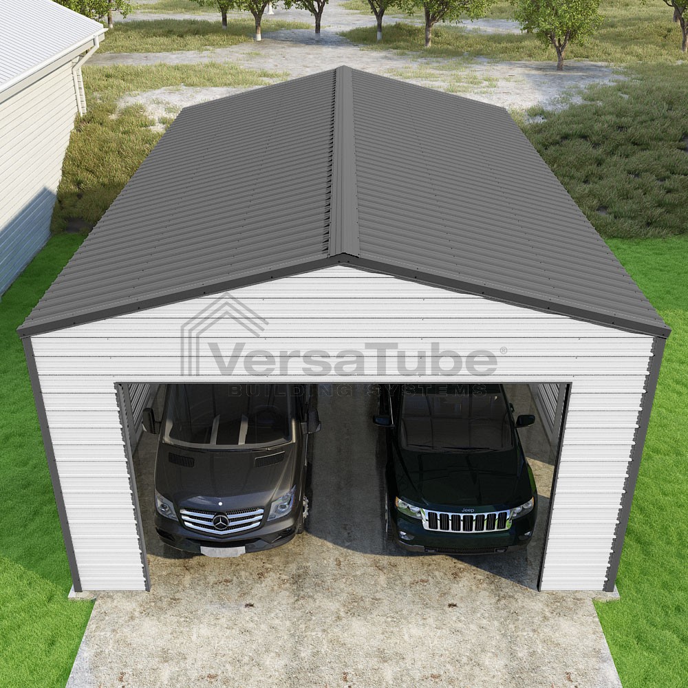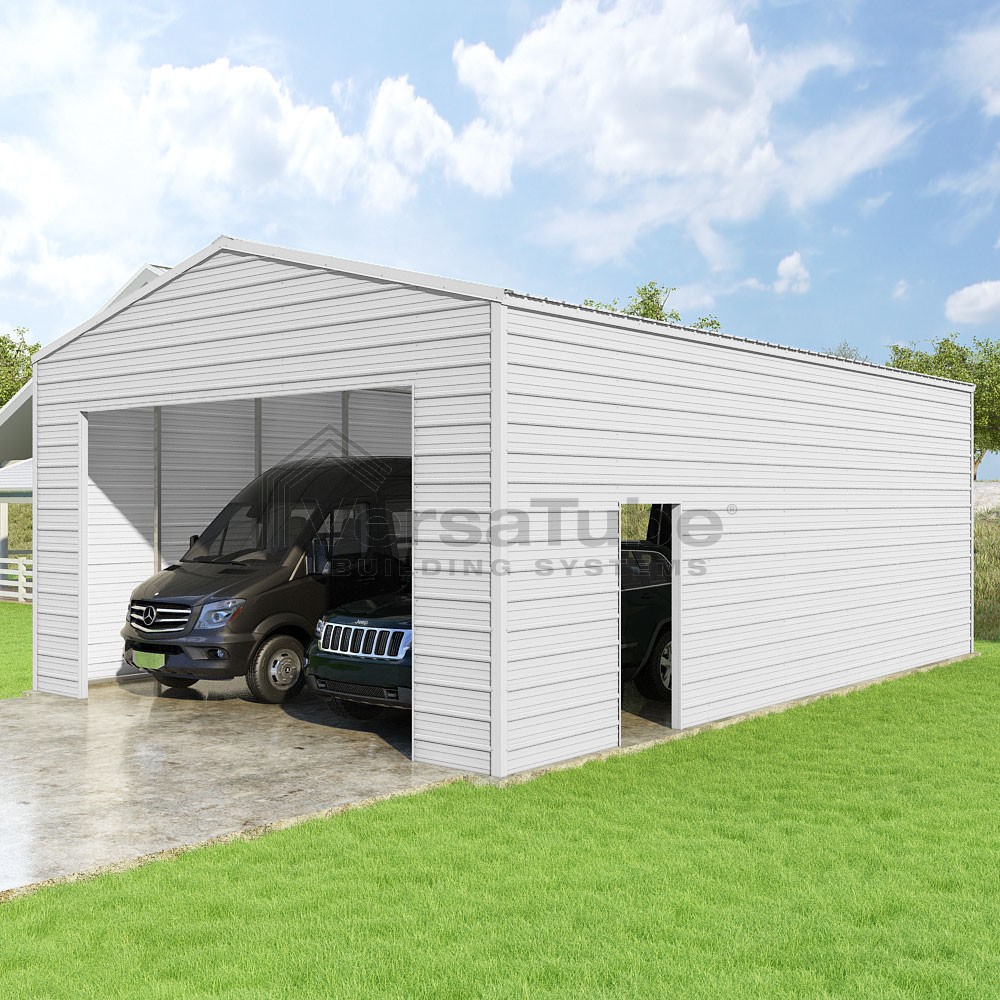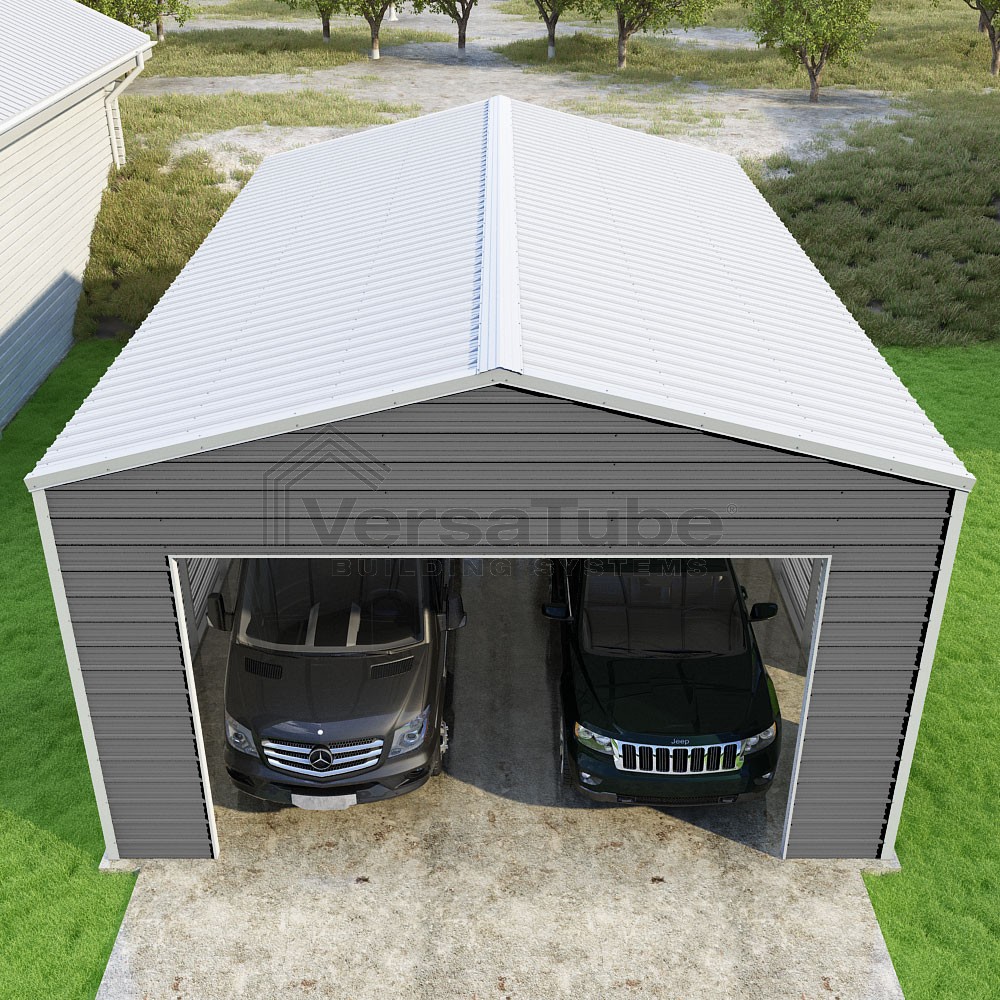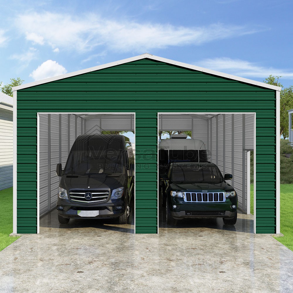 Frontier Series DIY garage kit features vertical sheet metal roof panels with horizontal siding panels..