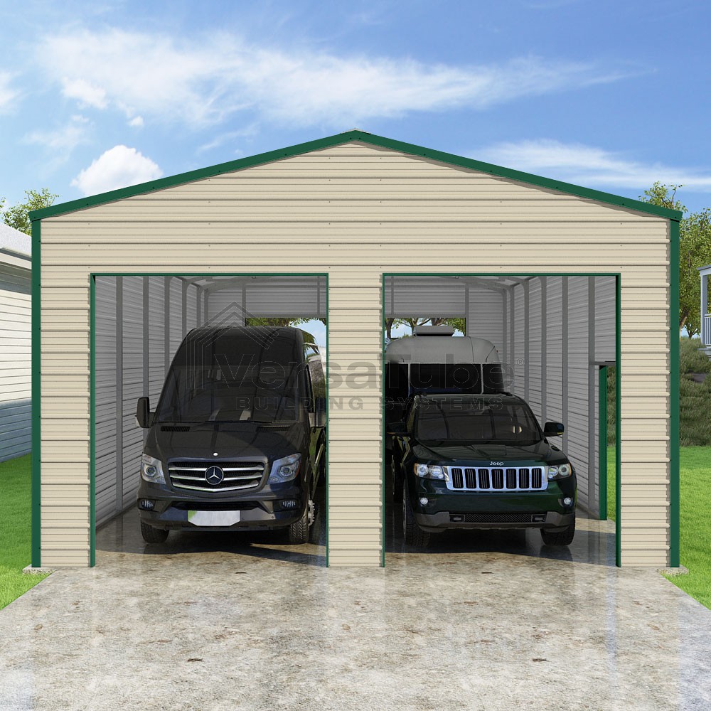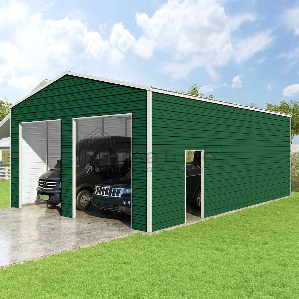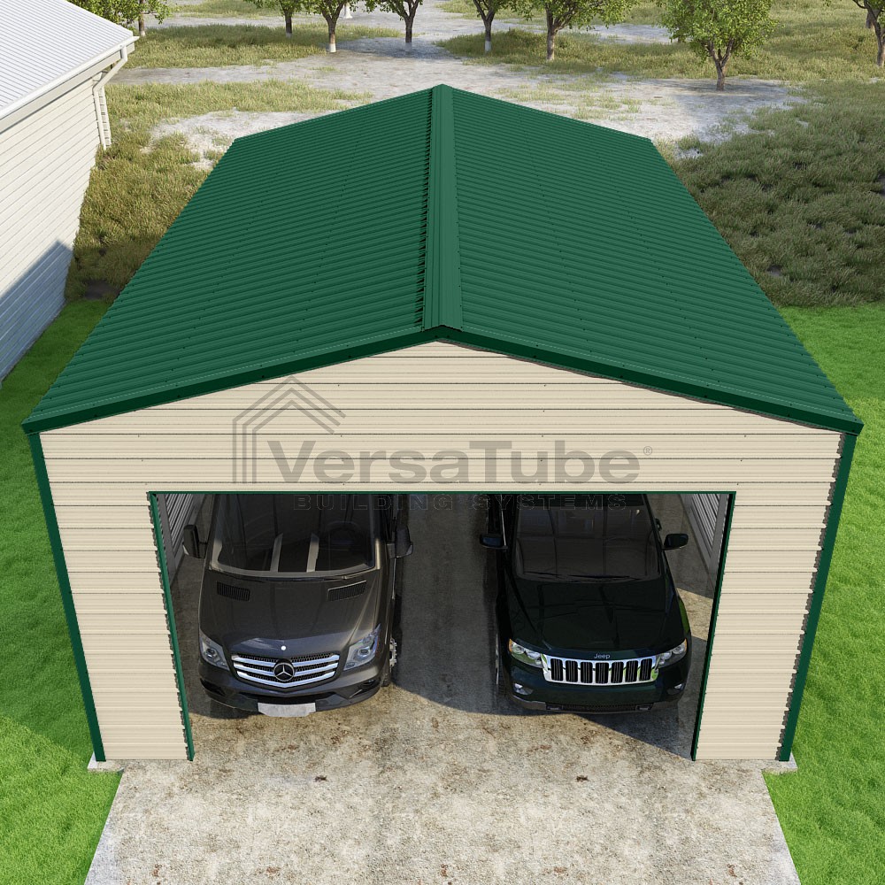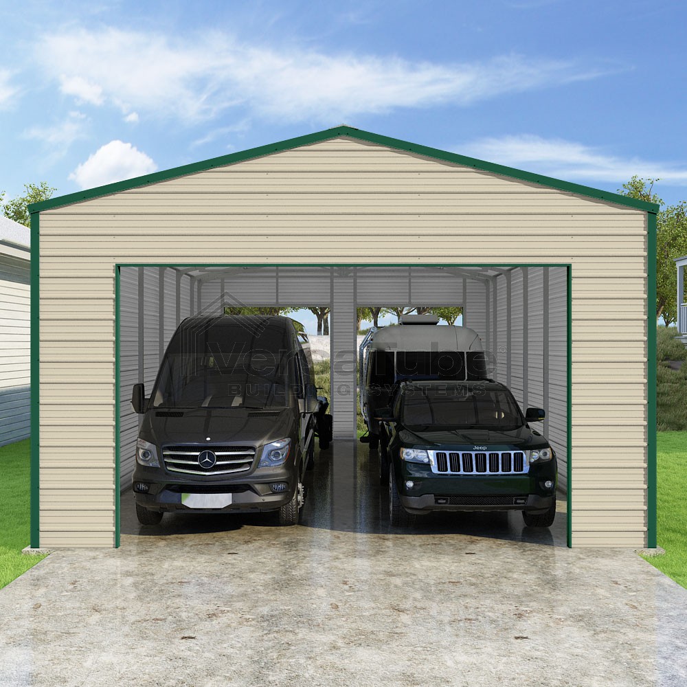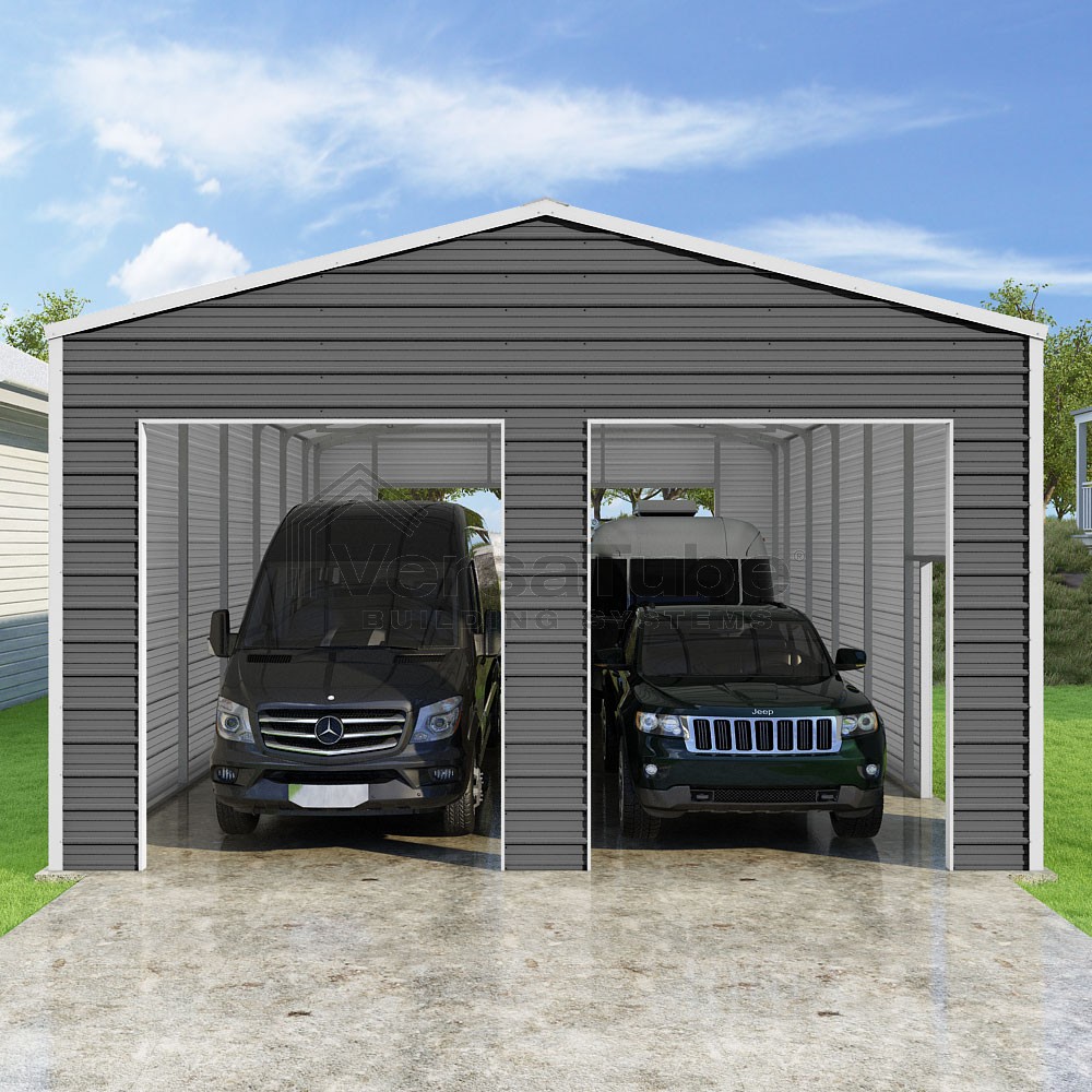 Frontier Series DIY garage kit features vertical sheet metal roof panels with horizontal siding panels..