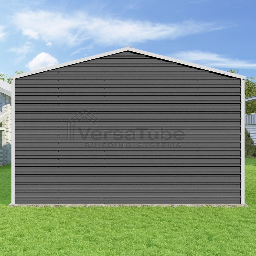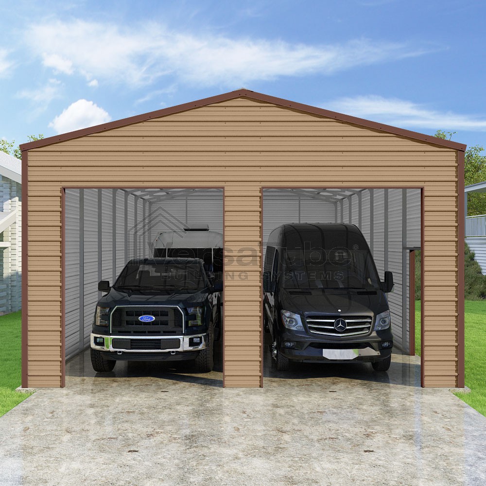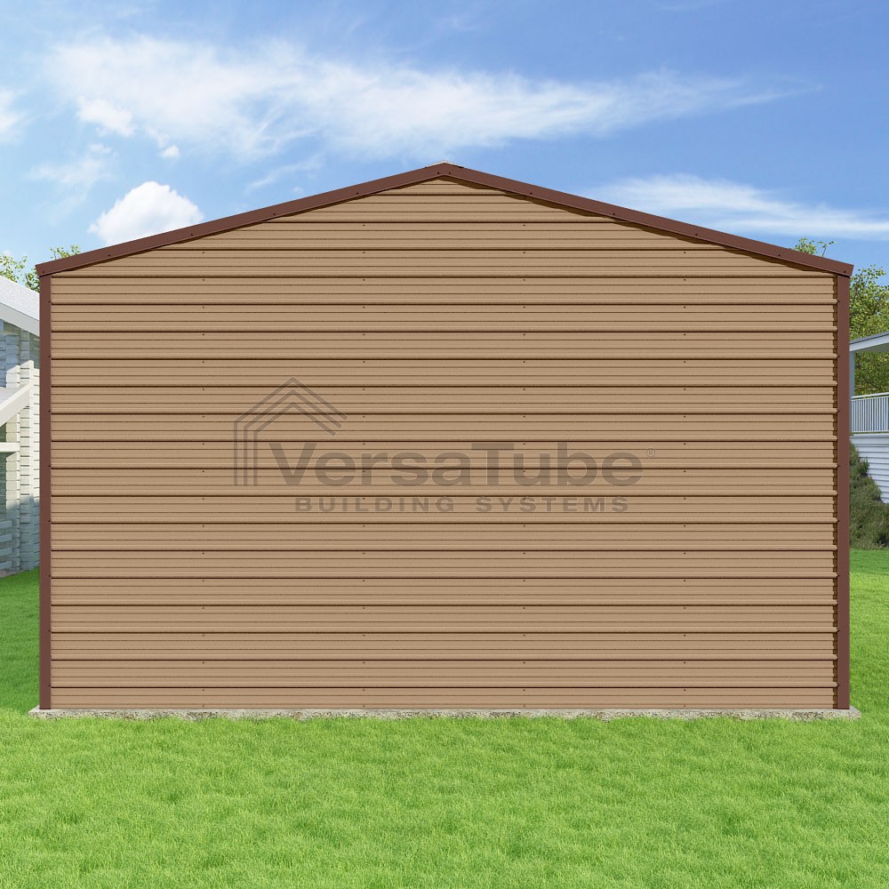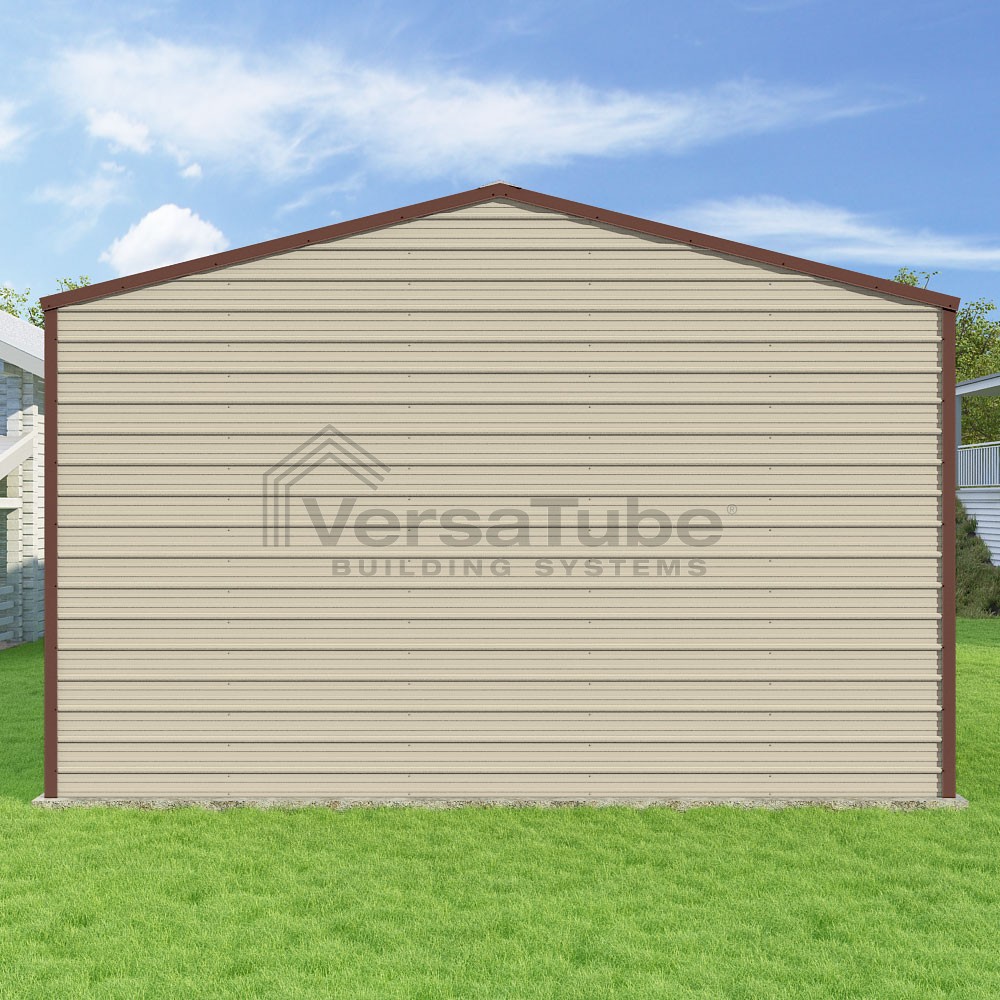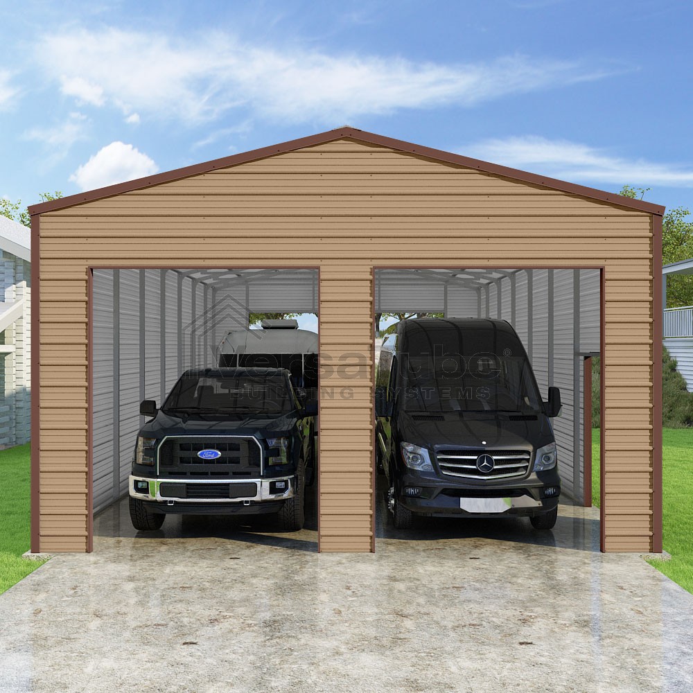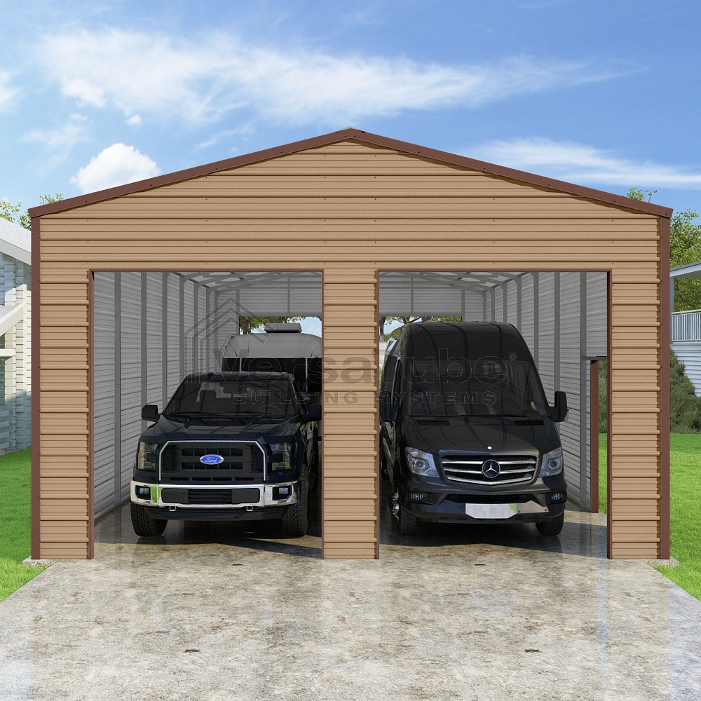 Frontier Series DIY garage kit features vertical sheet metal roof panels with horizontal siding panels..