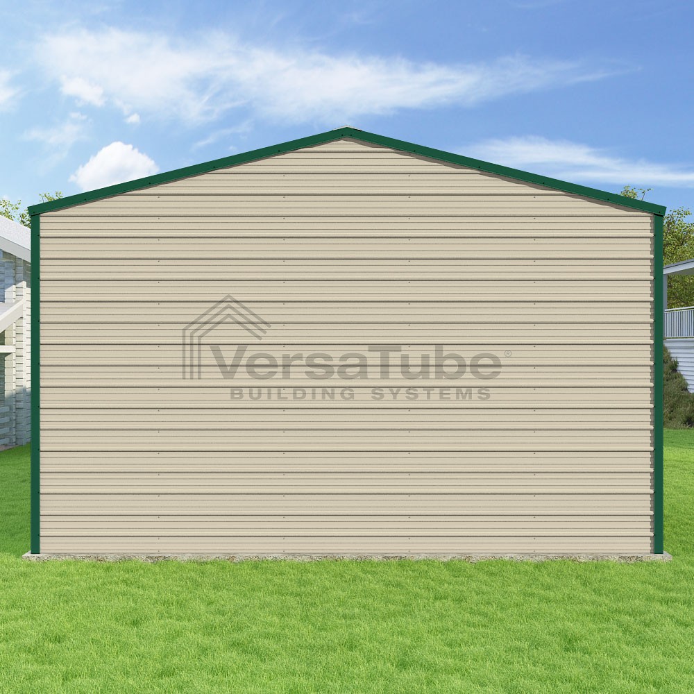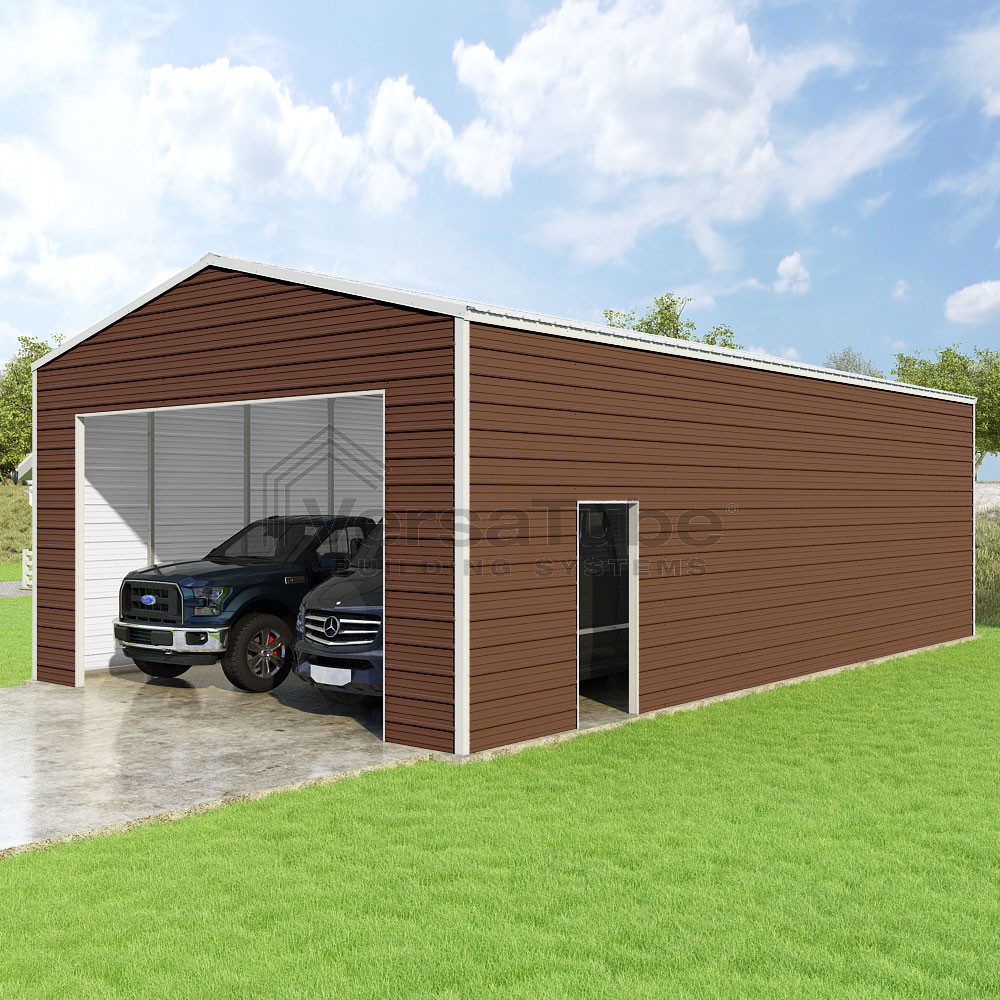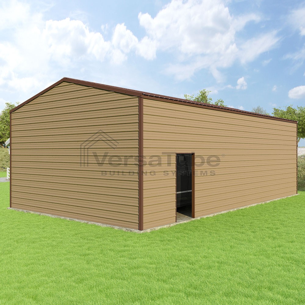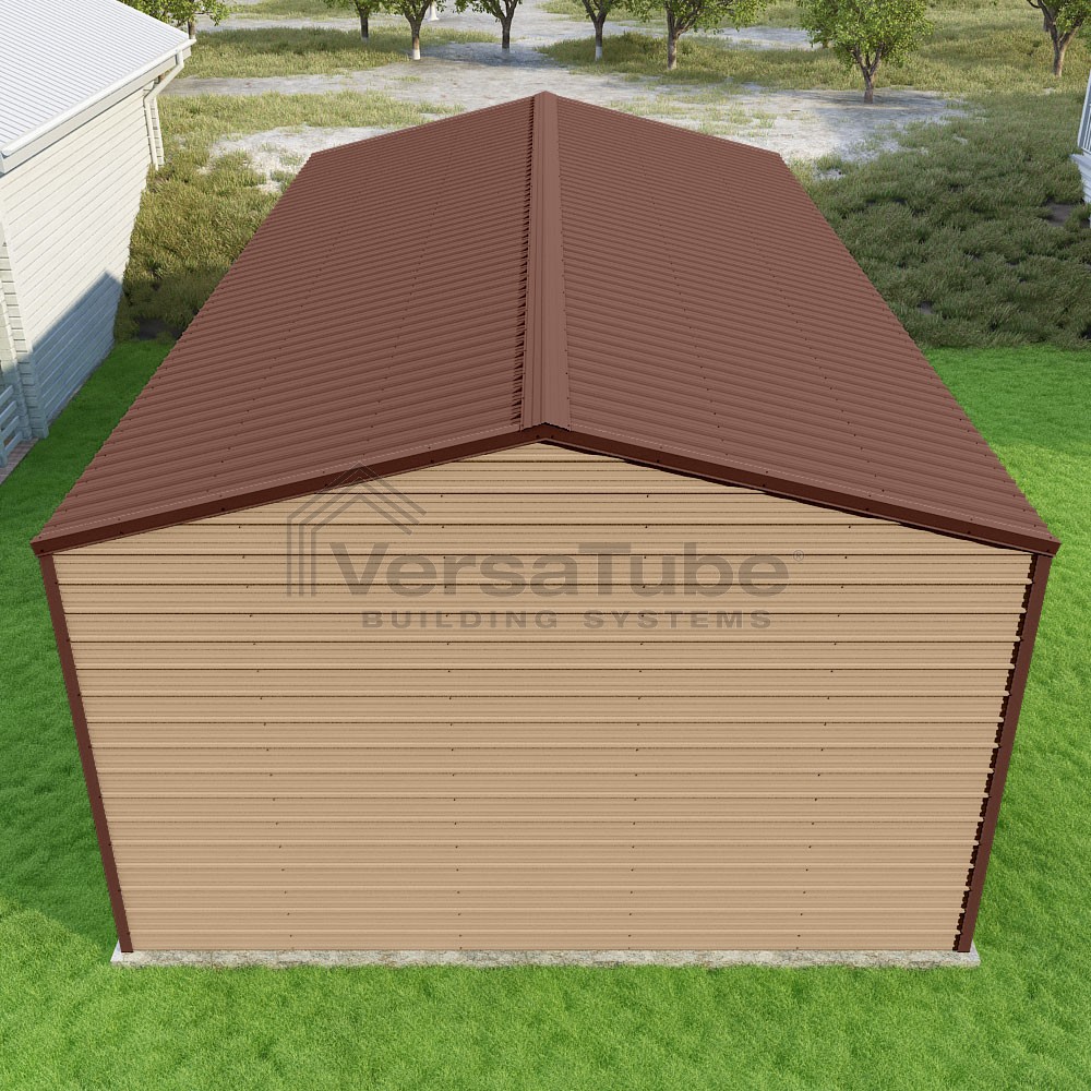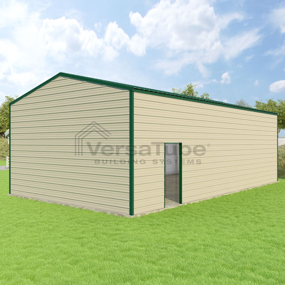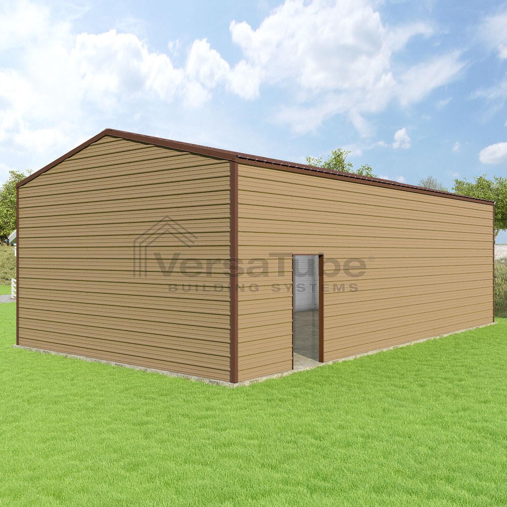 Frontier Series DIY garage kit features vertical sheet metal roof panels with horizontal siding panels..