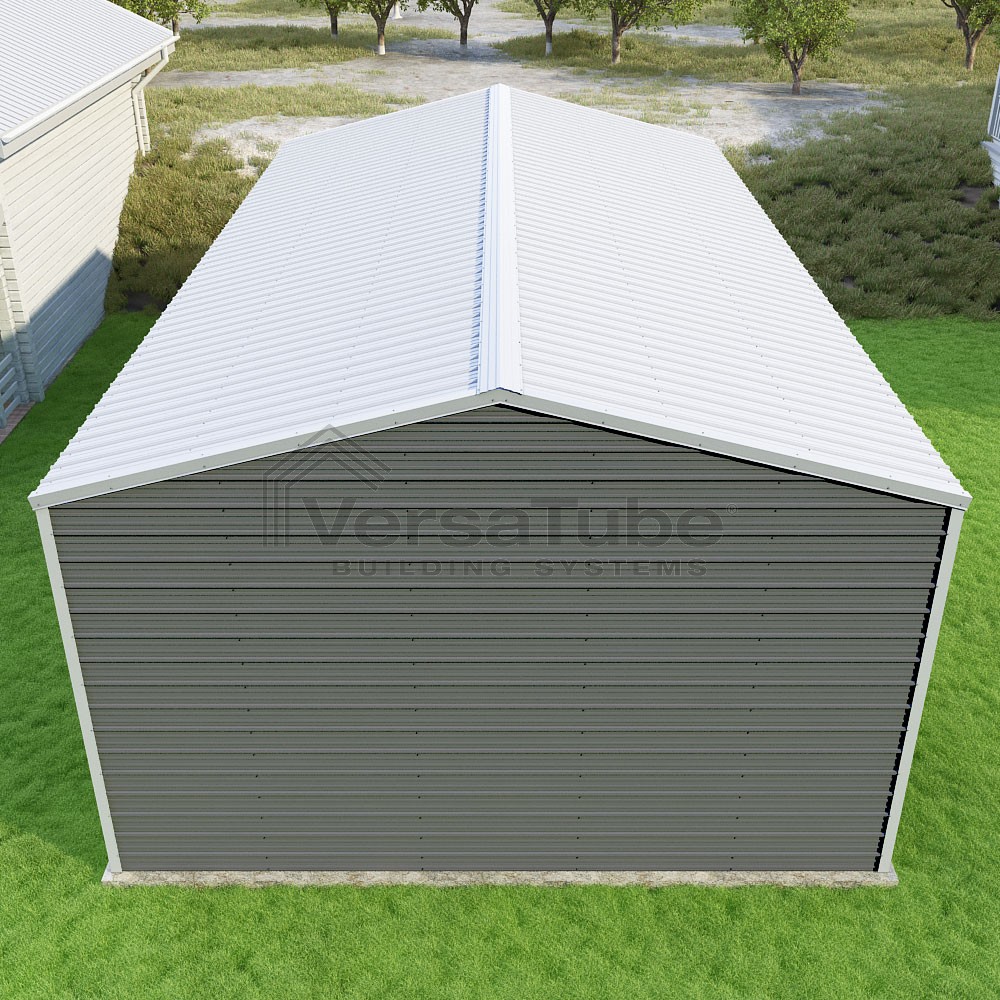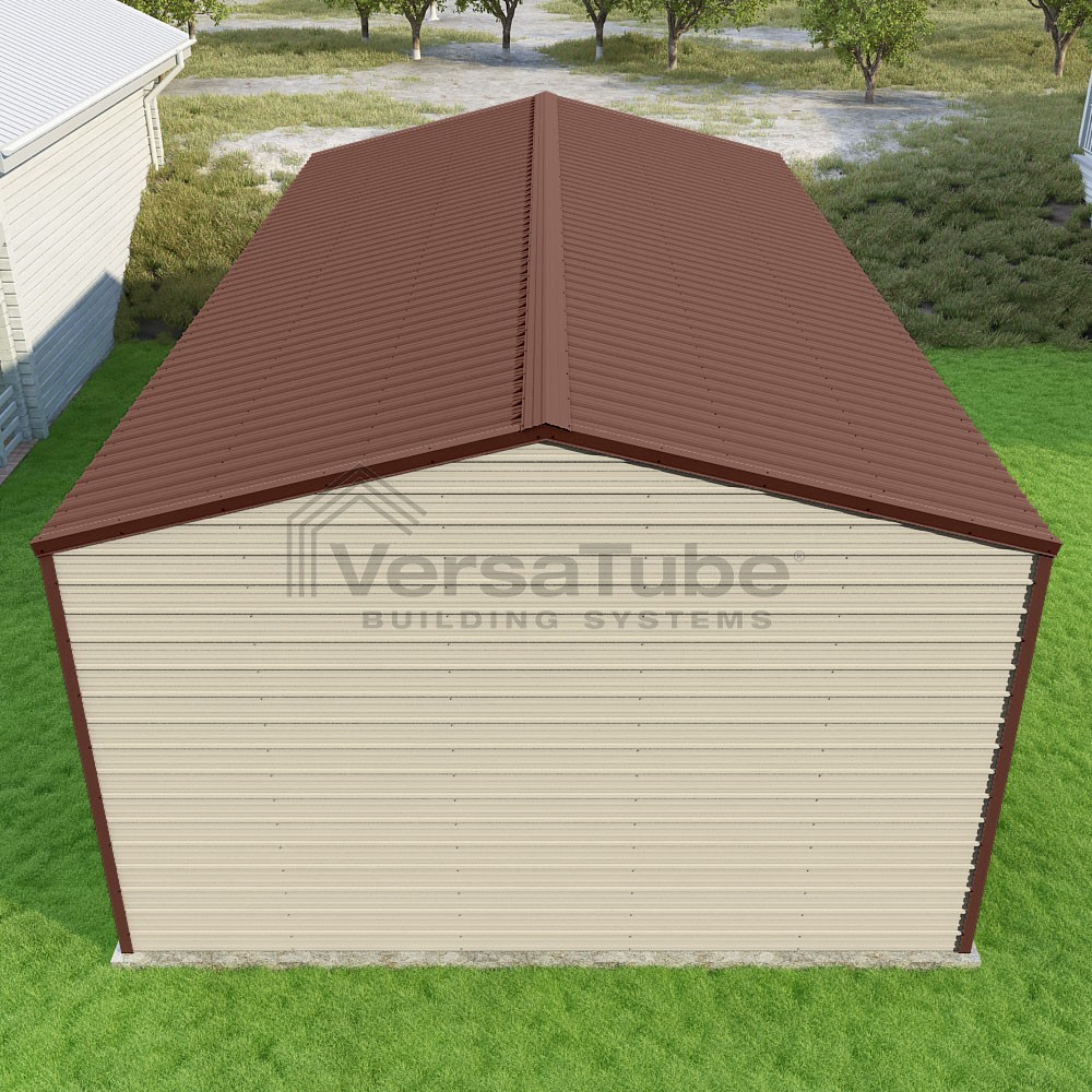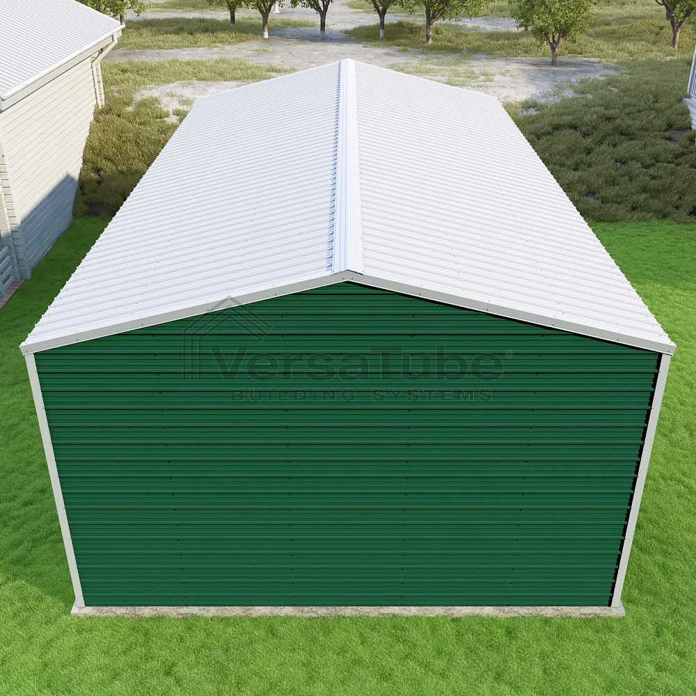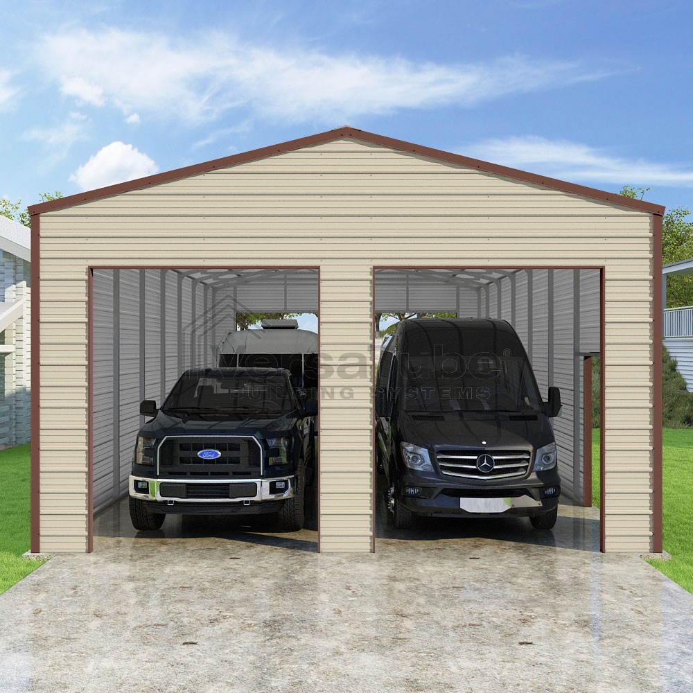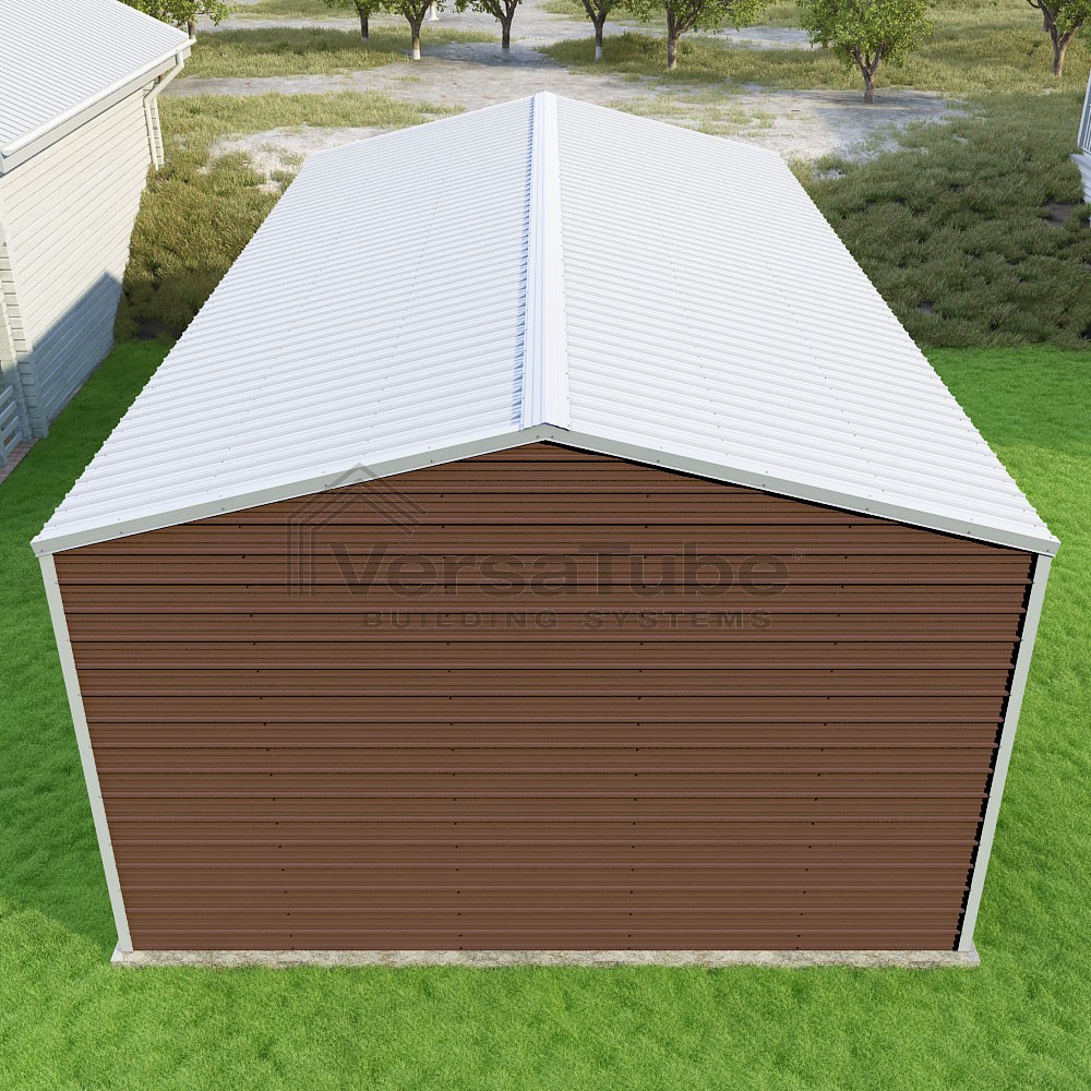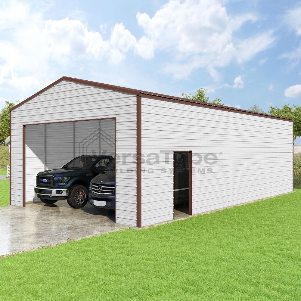 Frontier Series DIY garage kit features vertical sheet metal roof panels with horizontal siding panels..