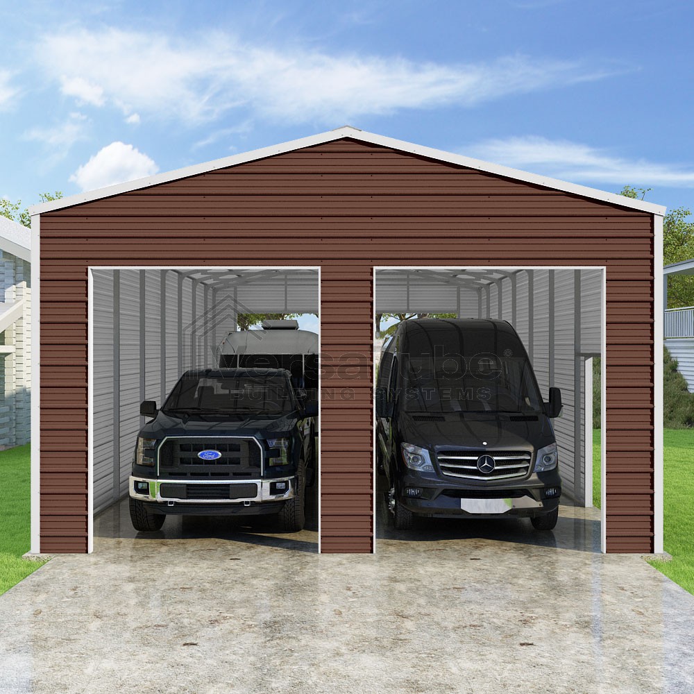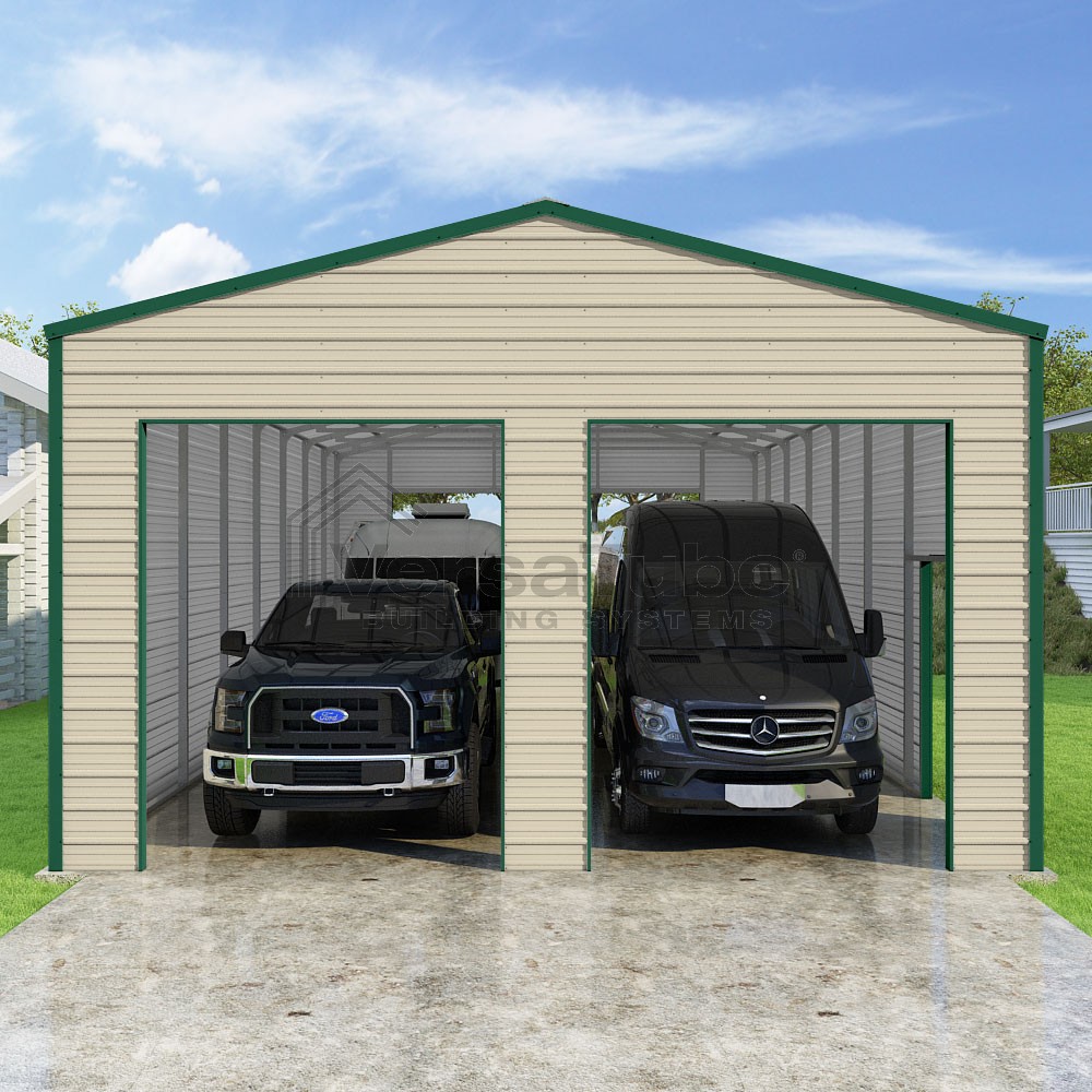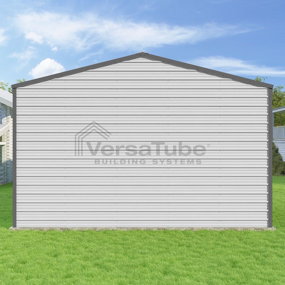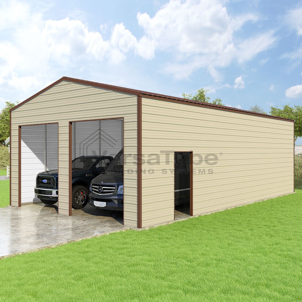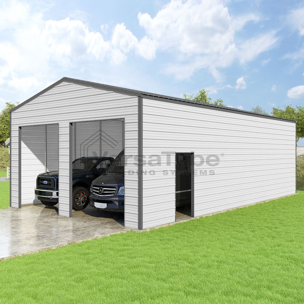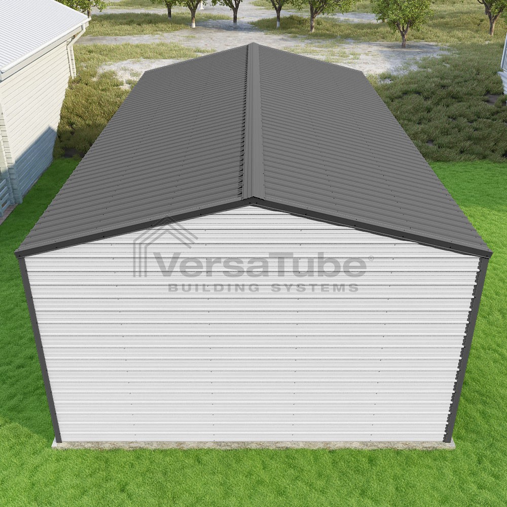 Frontier Series DIY garage kit features vertical sheet metal roof panels with horizontal siding panels..