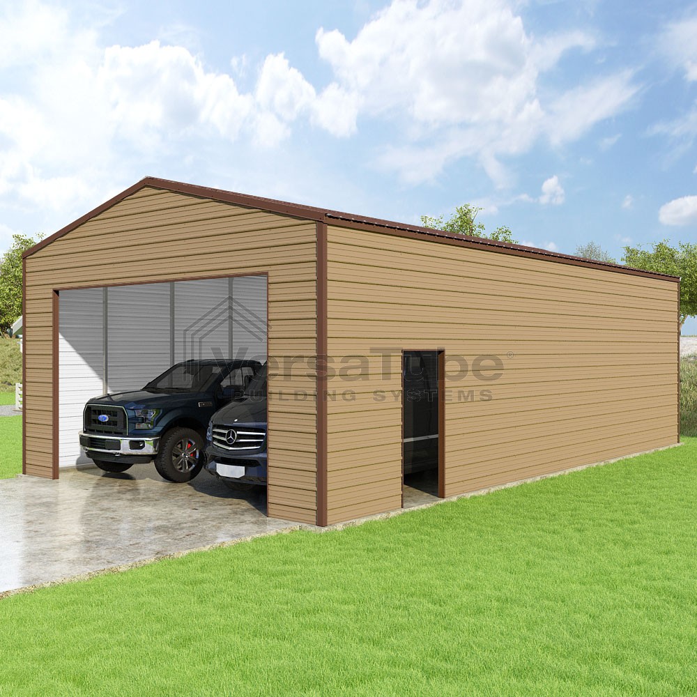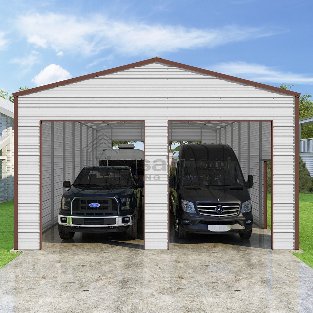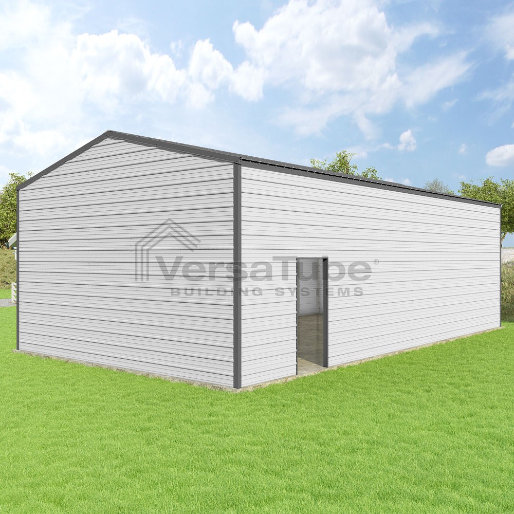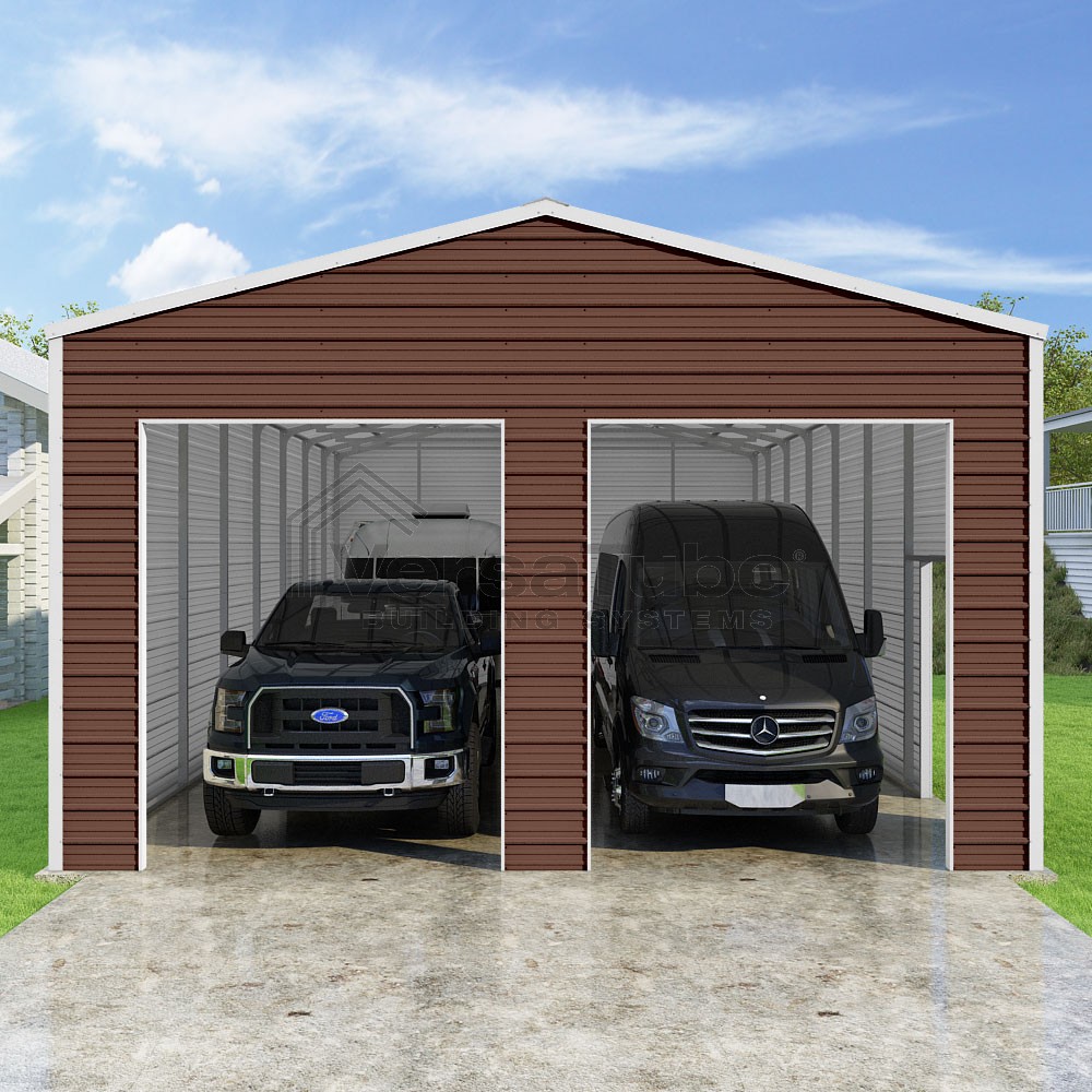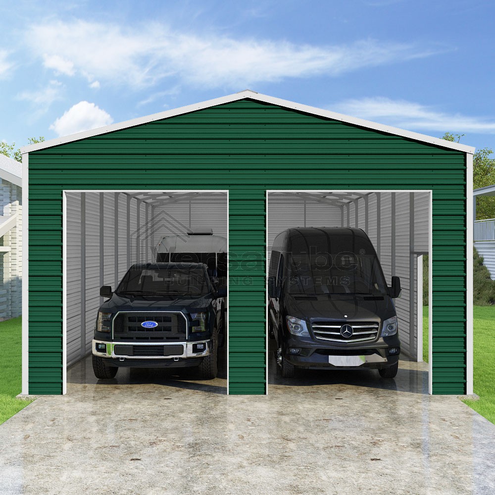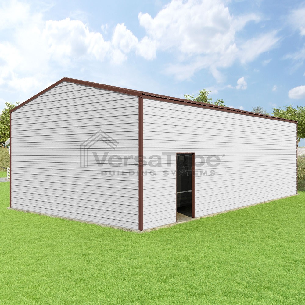 Frontier Series DIY garage kit features vertical sheet metal roof panels with horizontal siding panels..