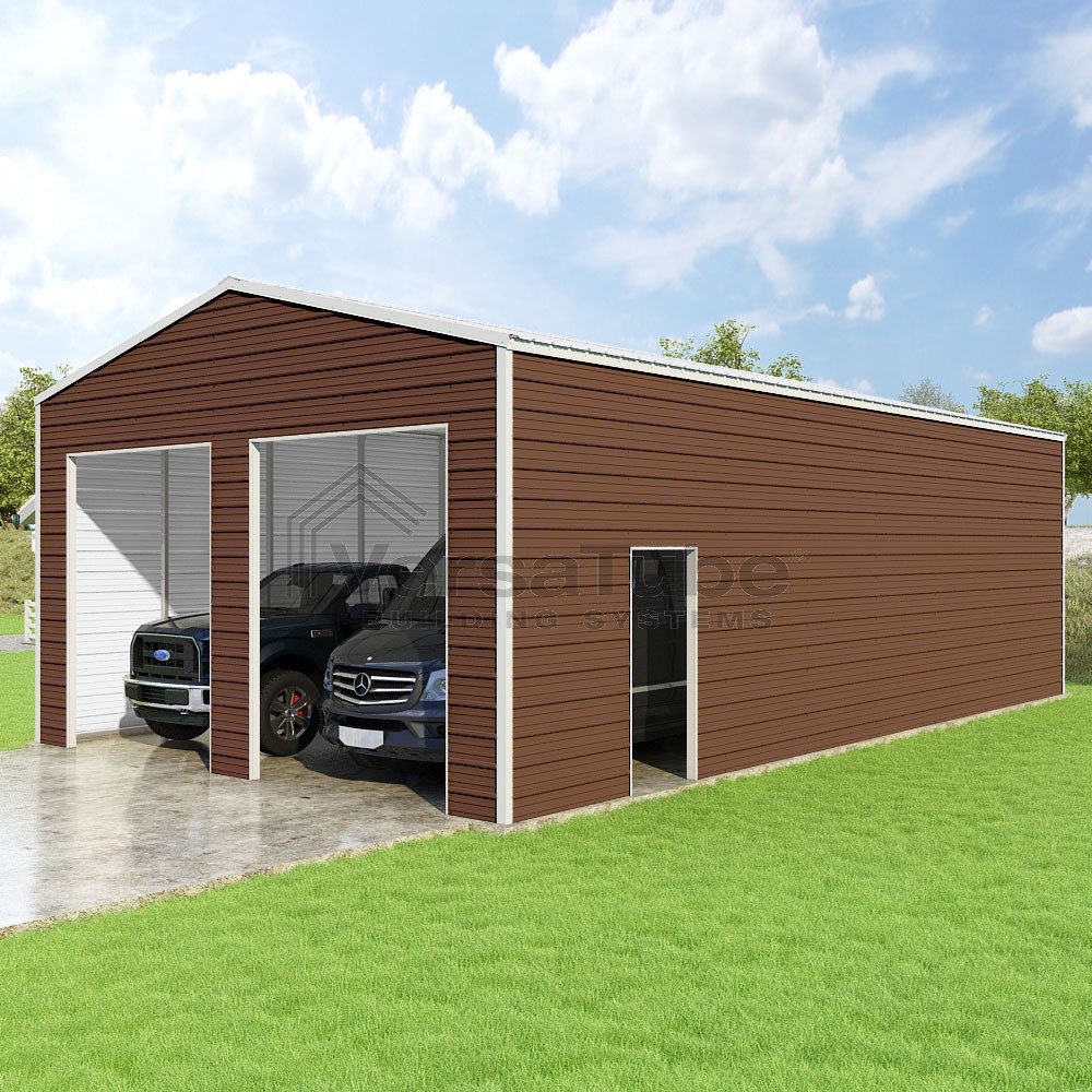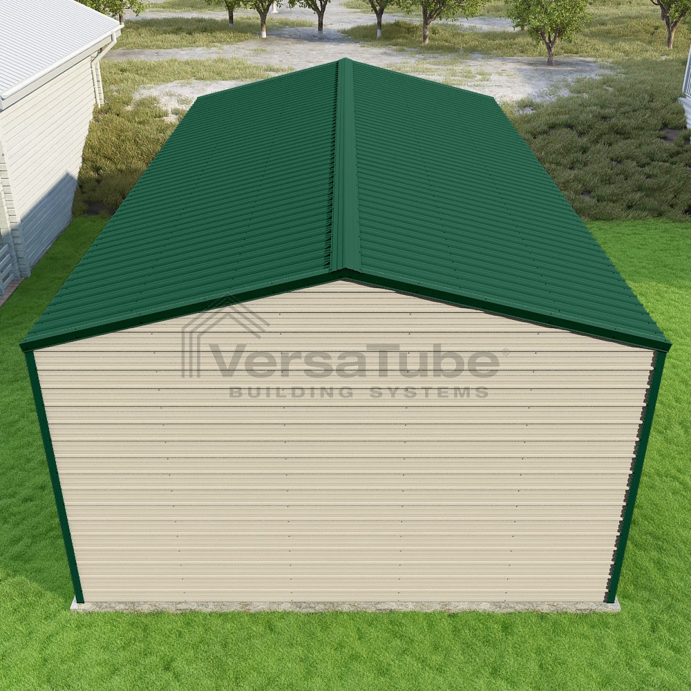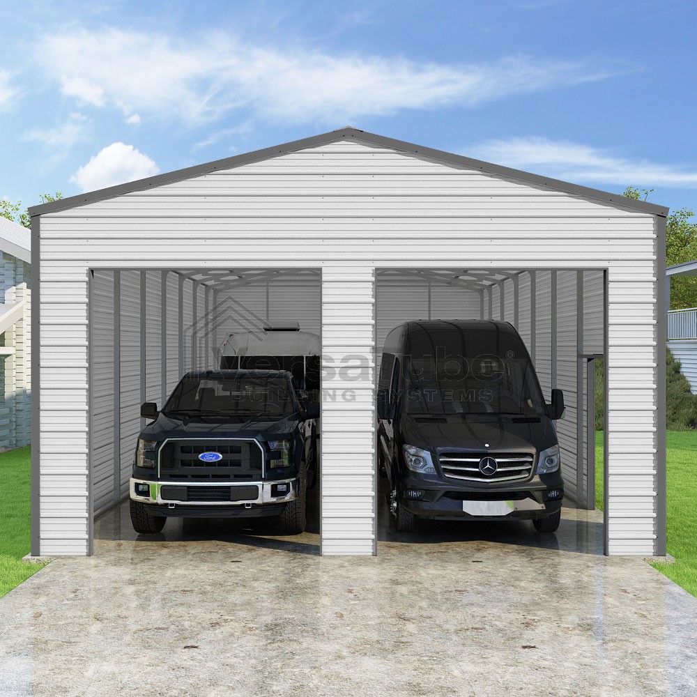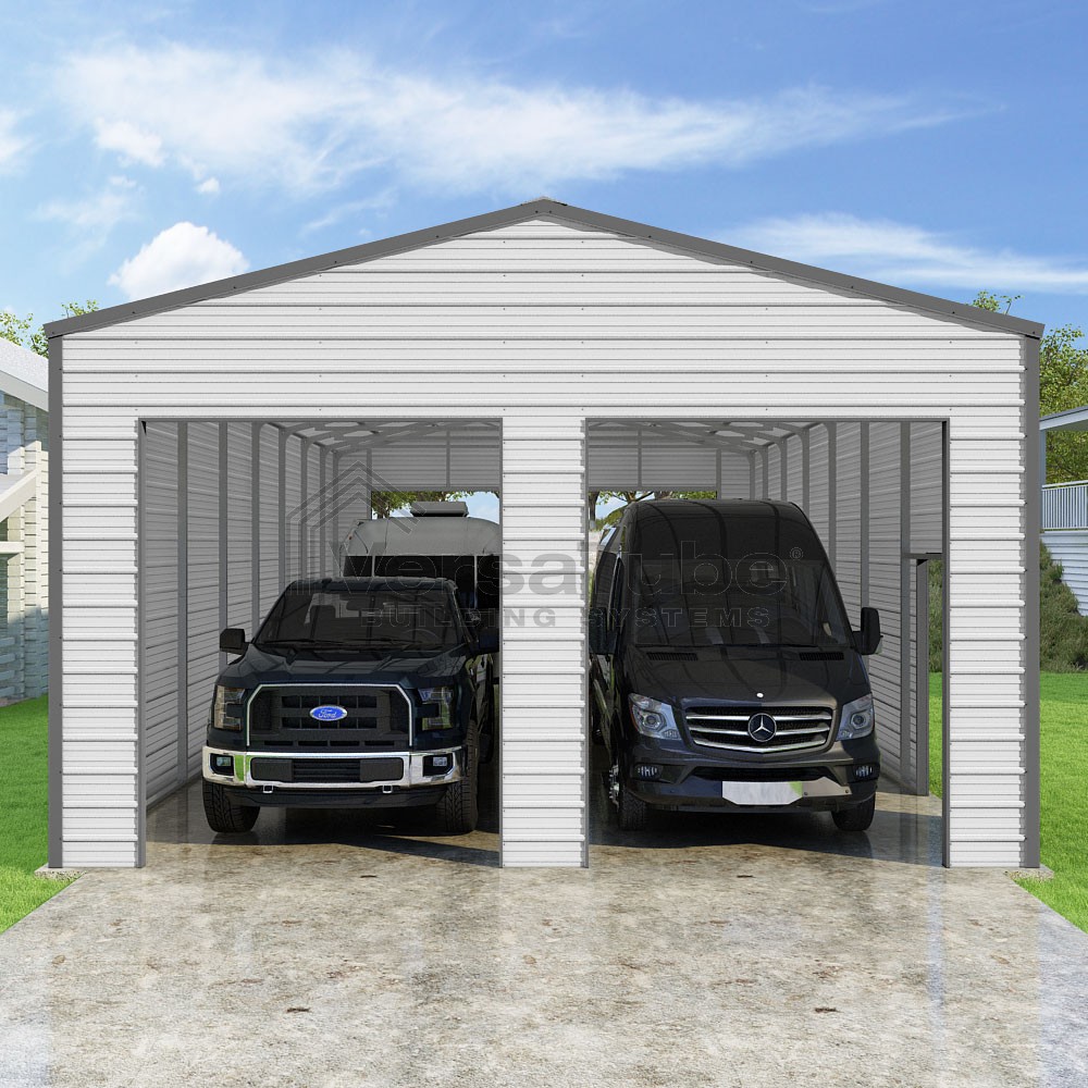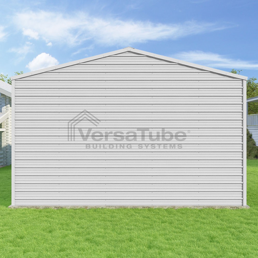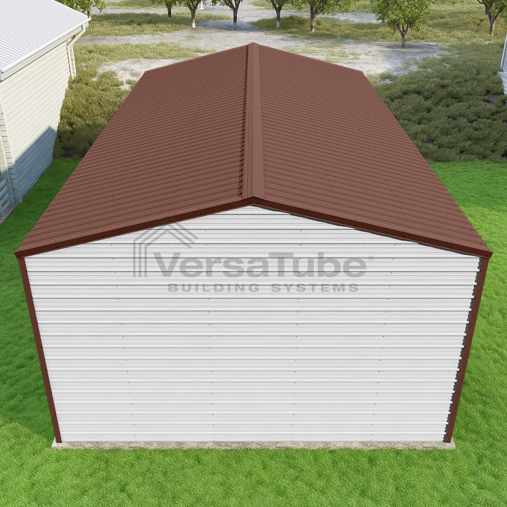 Frontier Series DIY garage kit features vertical sheet metal roof panels with horizontal siding panels..
