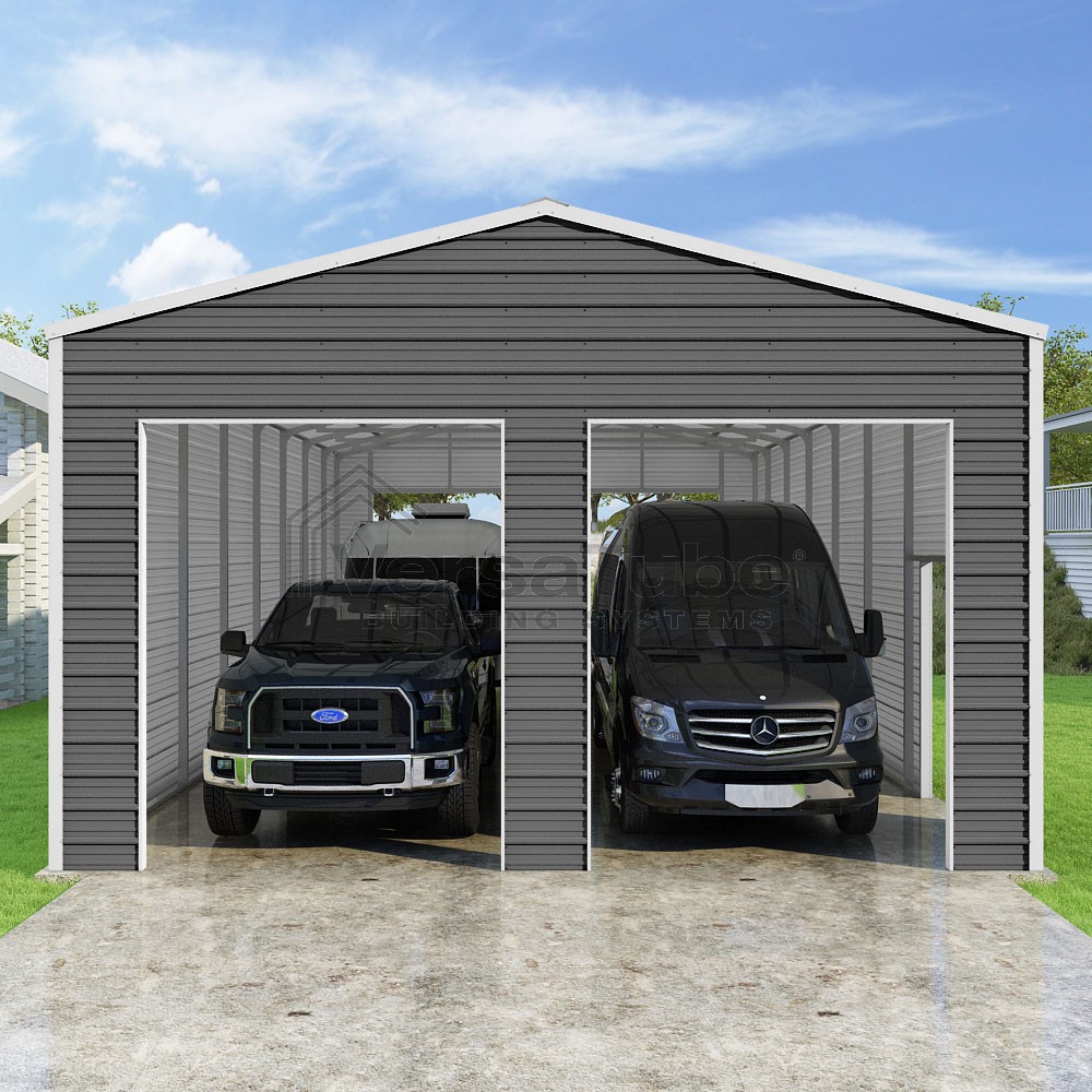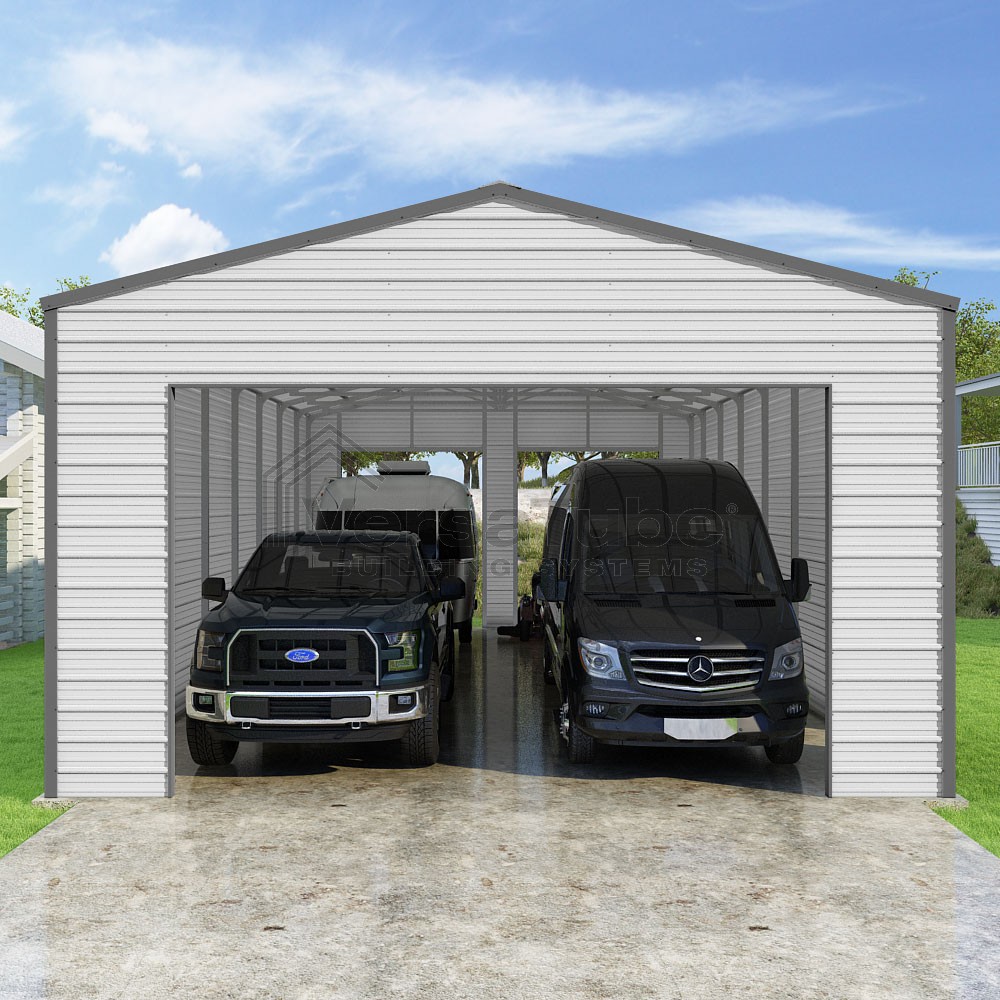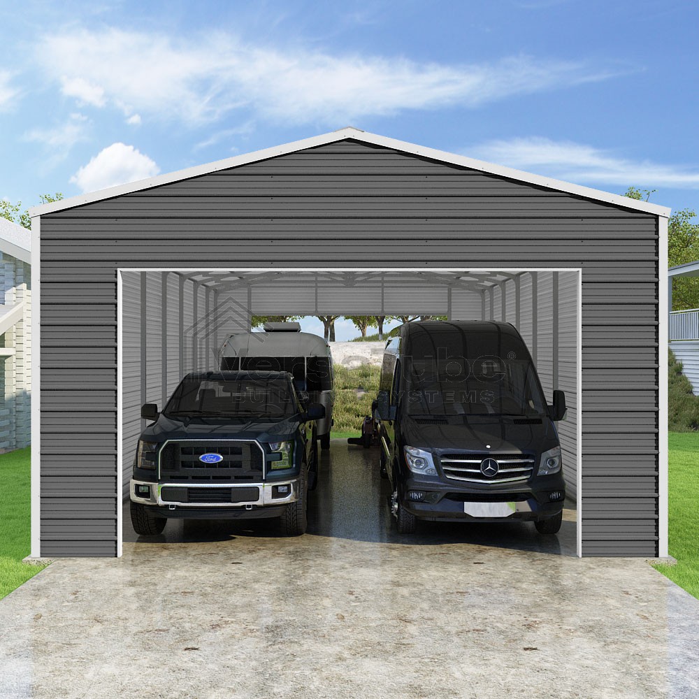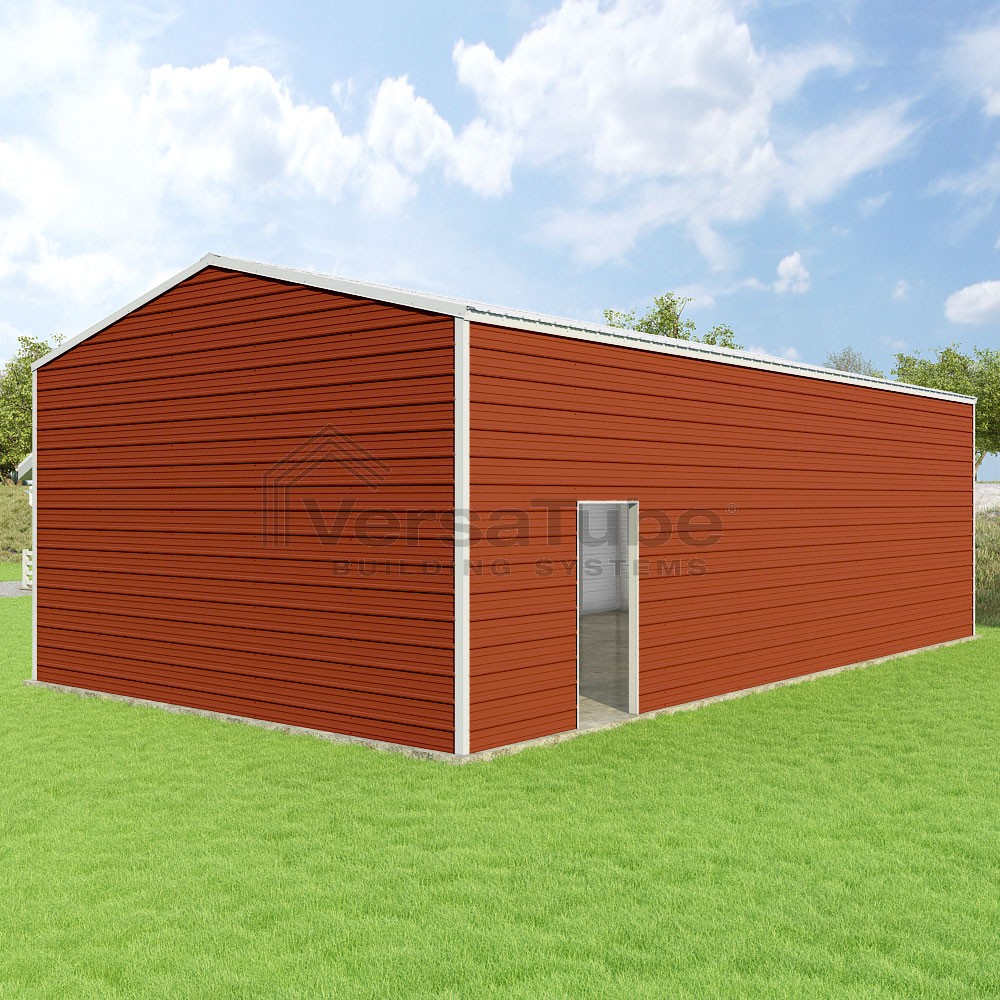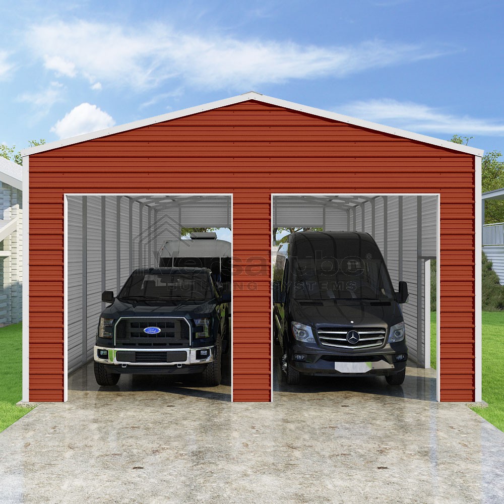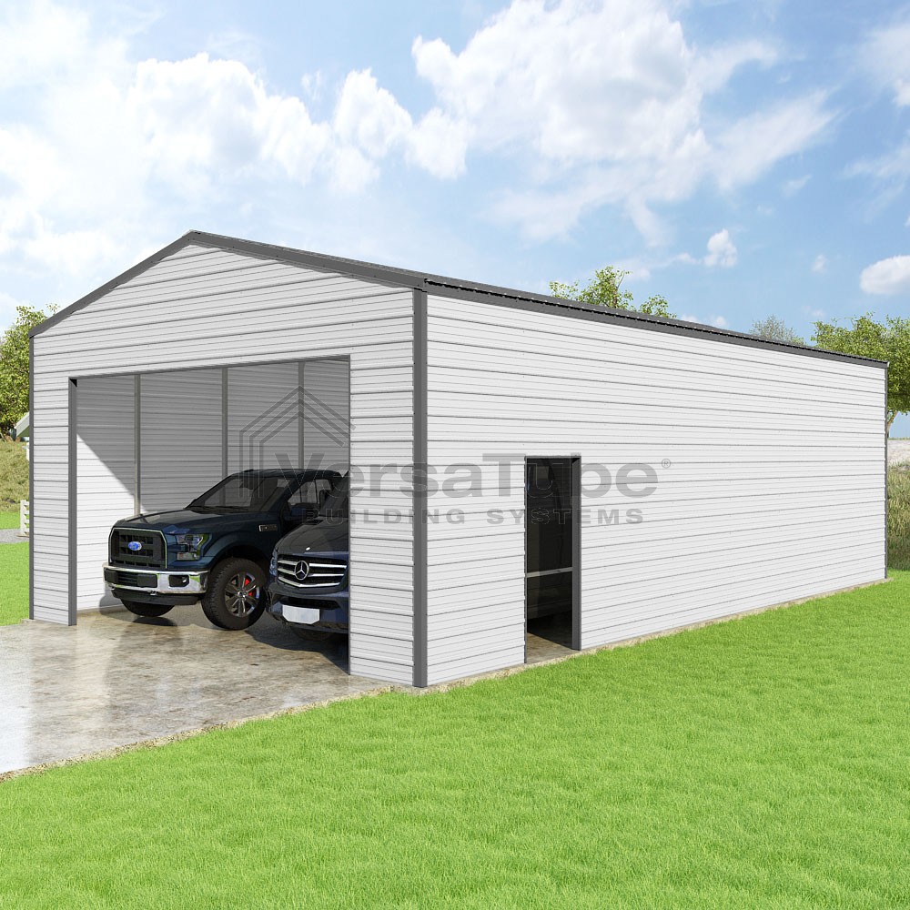 Frontier Series DIY garage kit features vertical sheet metal roof panels with horizontal siding panels..