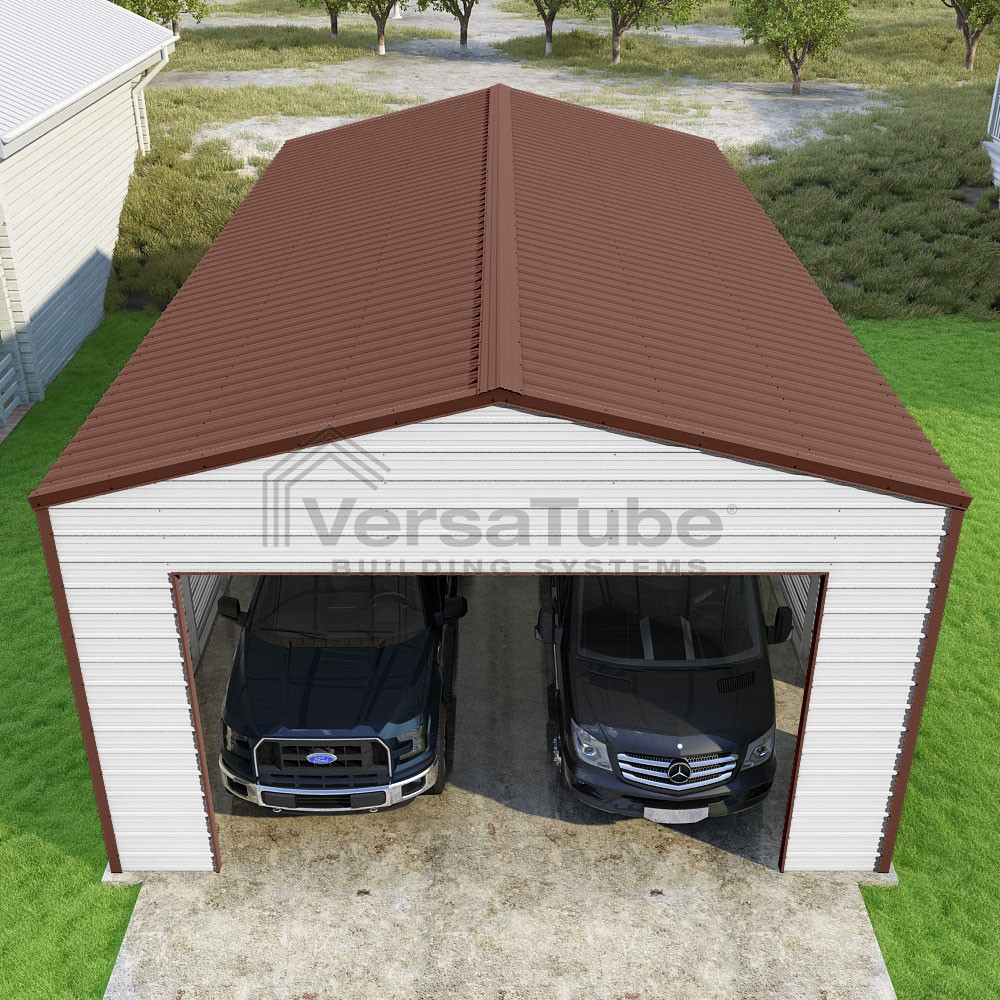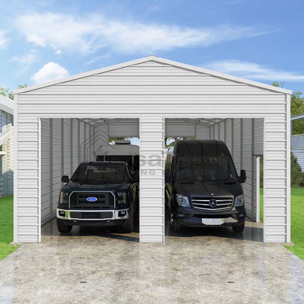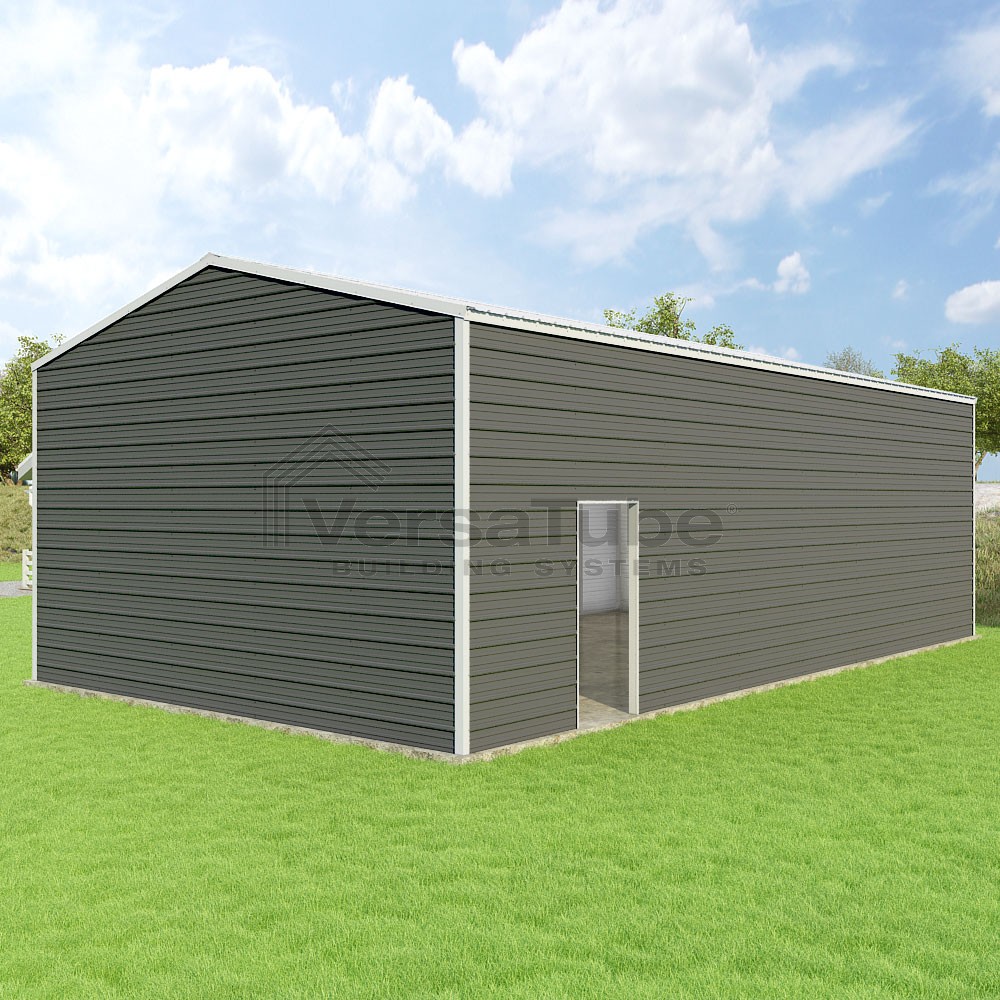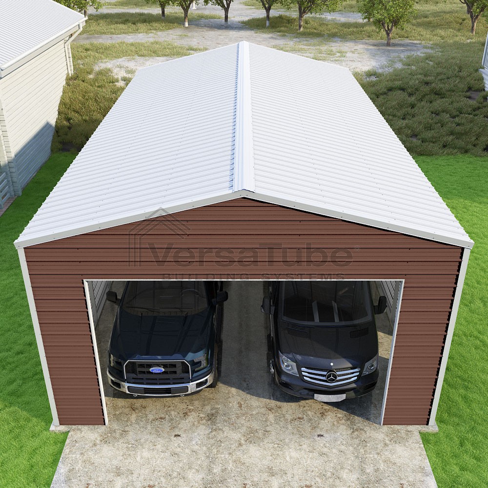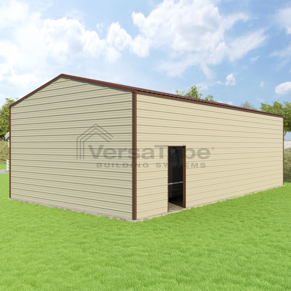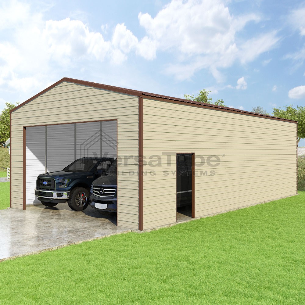 Frontier Series DIY garage kit features vertical sheet metal roof panels with horizontal siding panels..