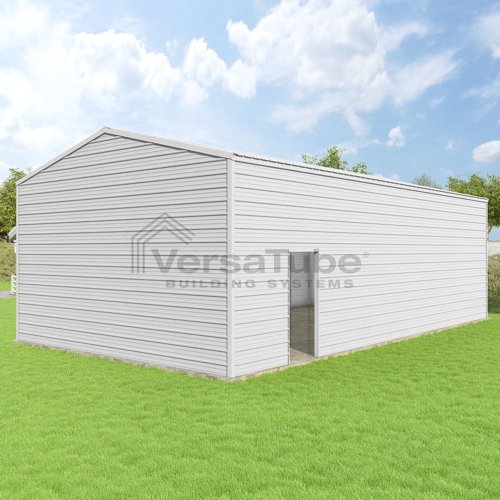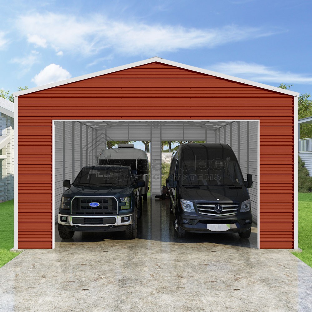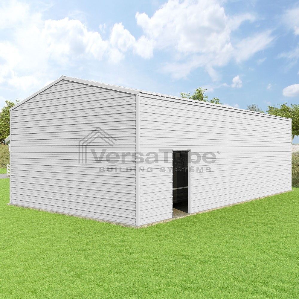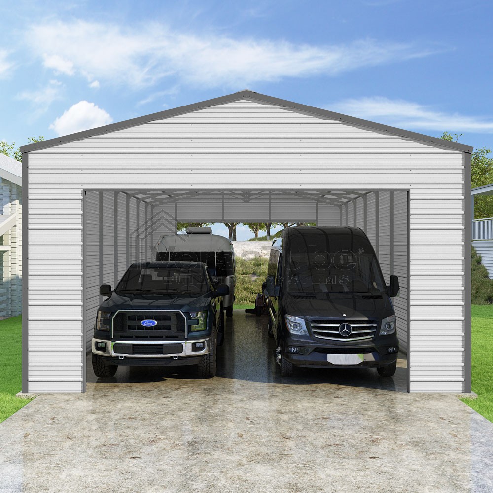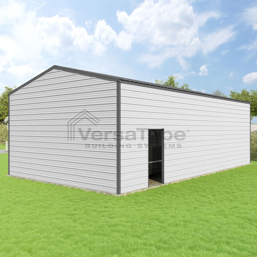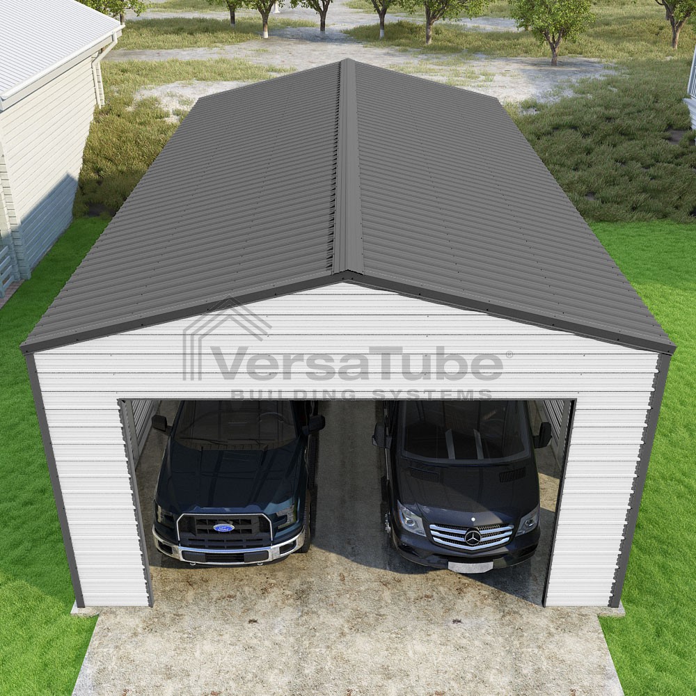 Frontier Series DIY garage kit features vertical sheet metal roof panels with horizontal siding panels..