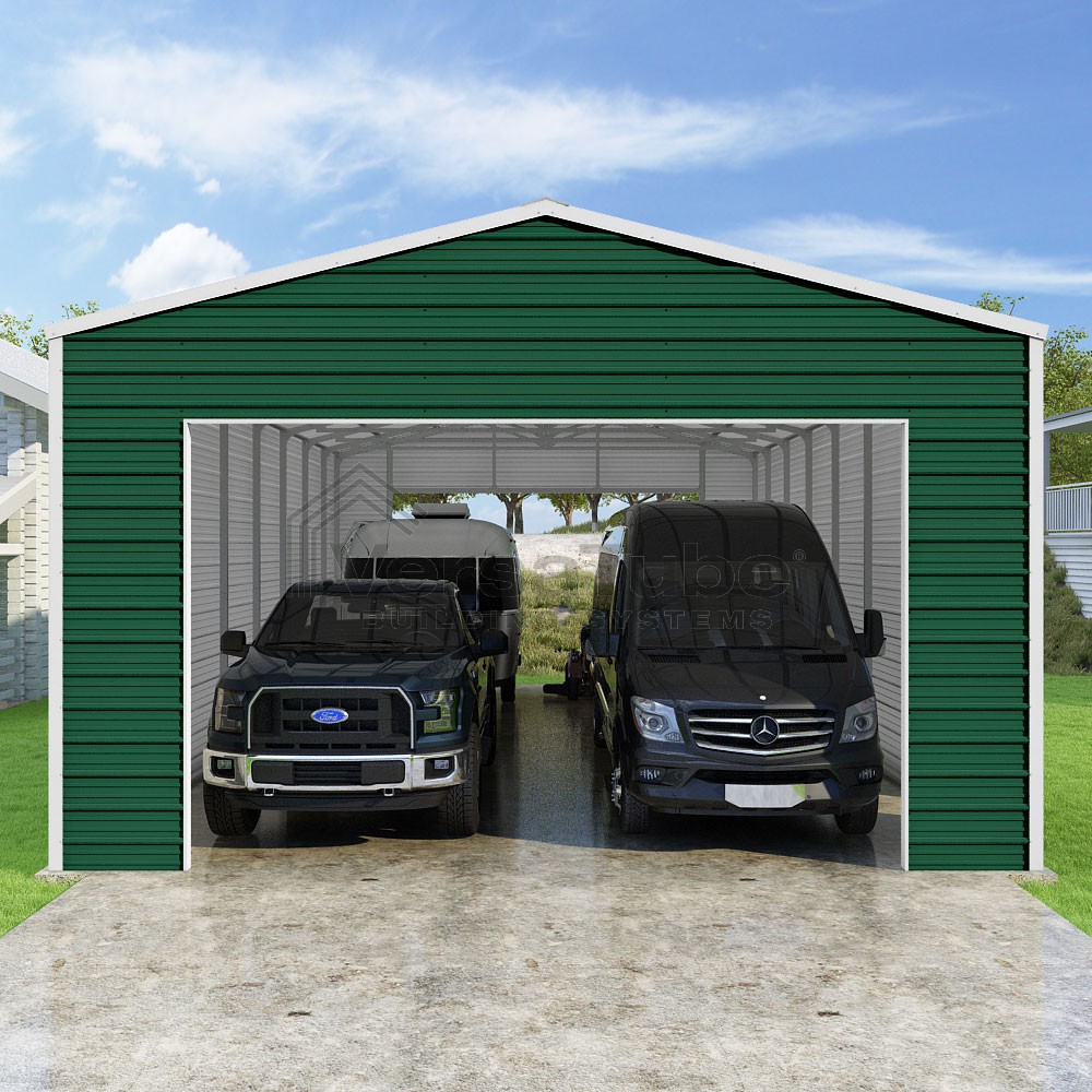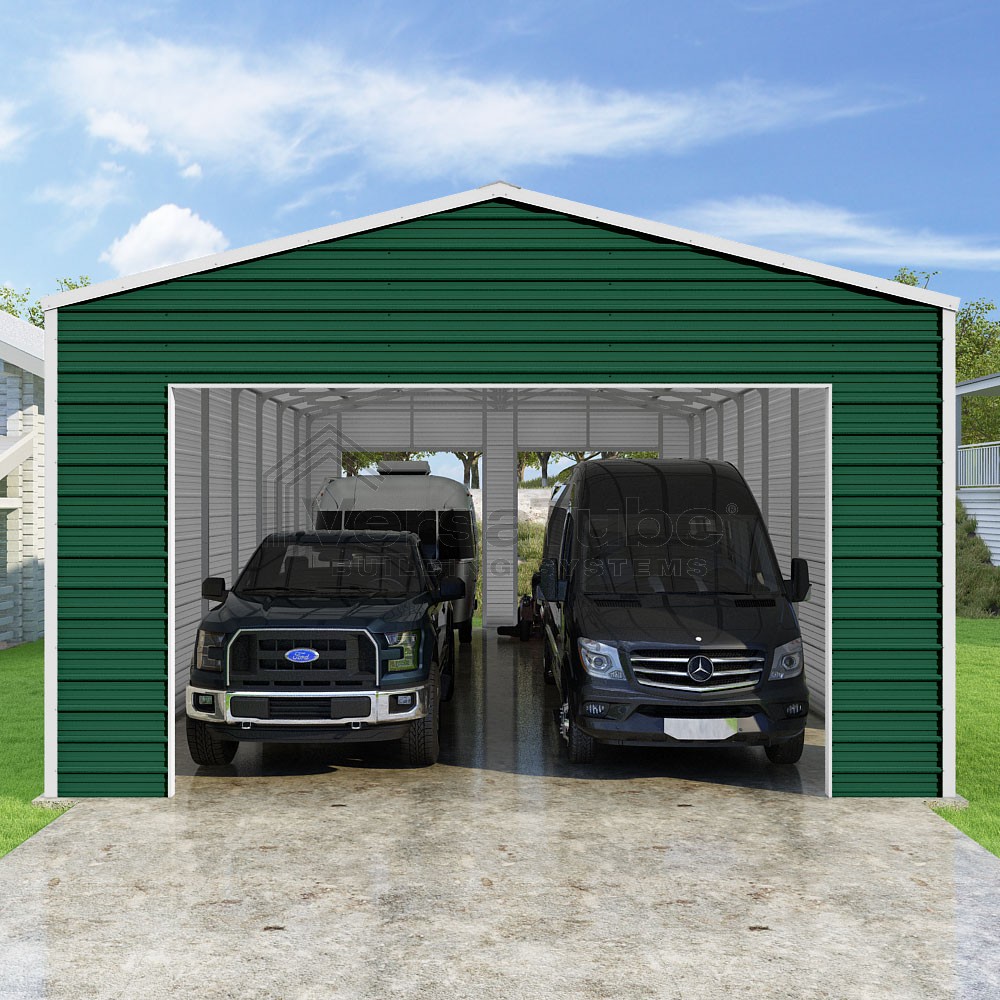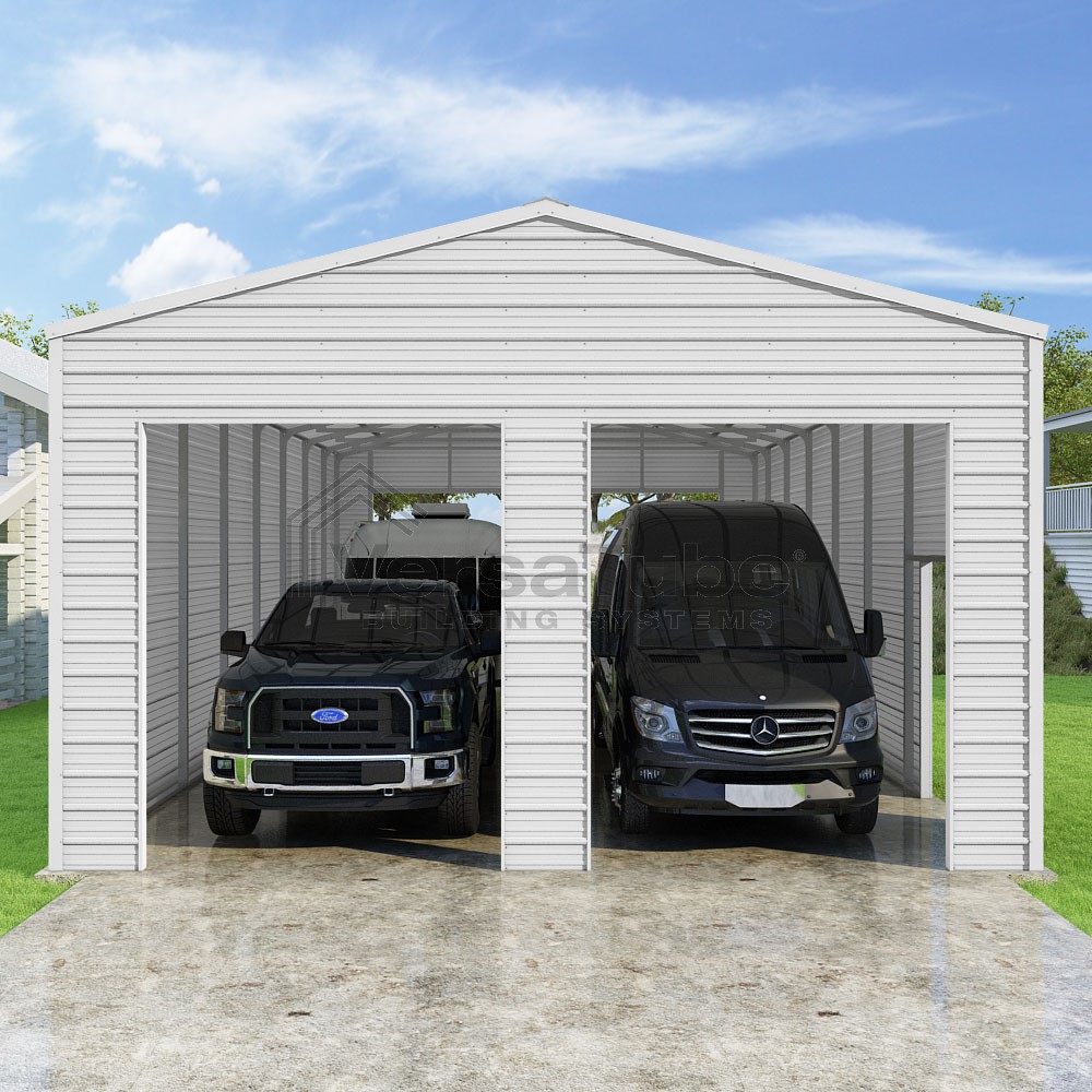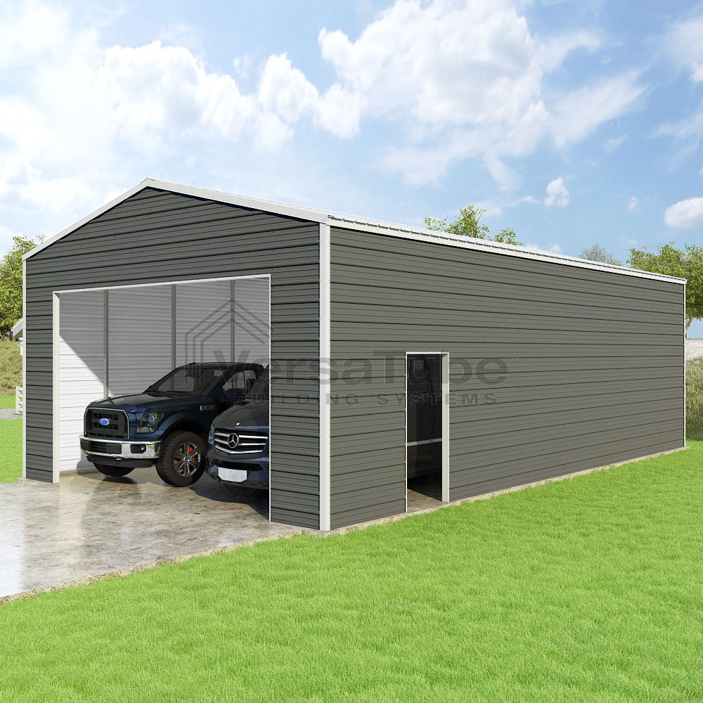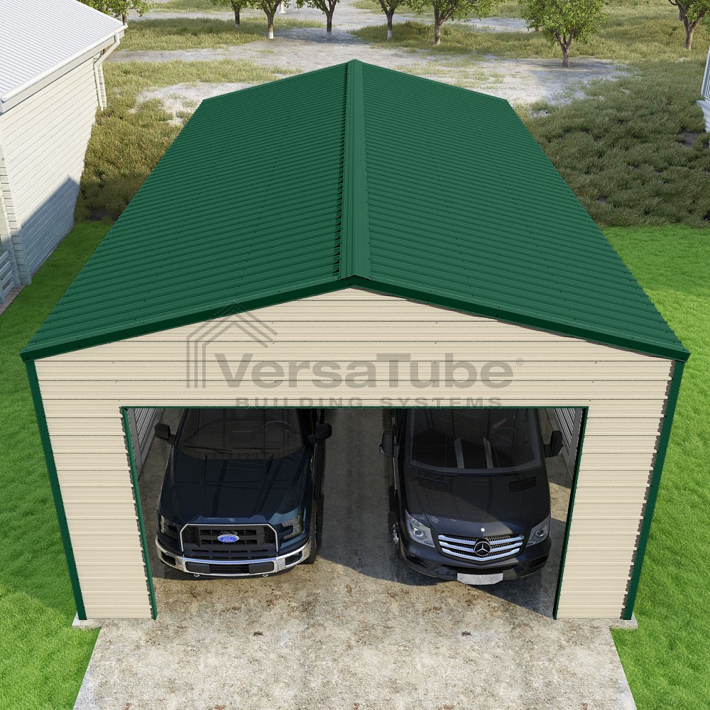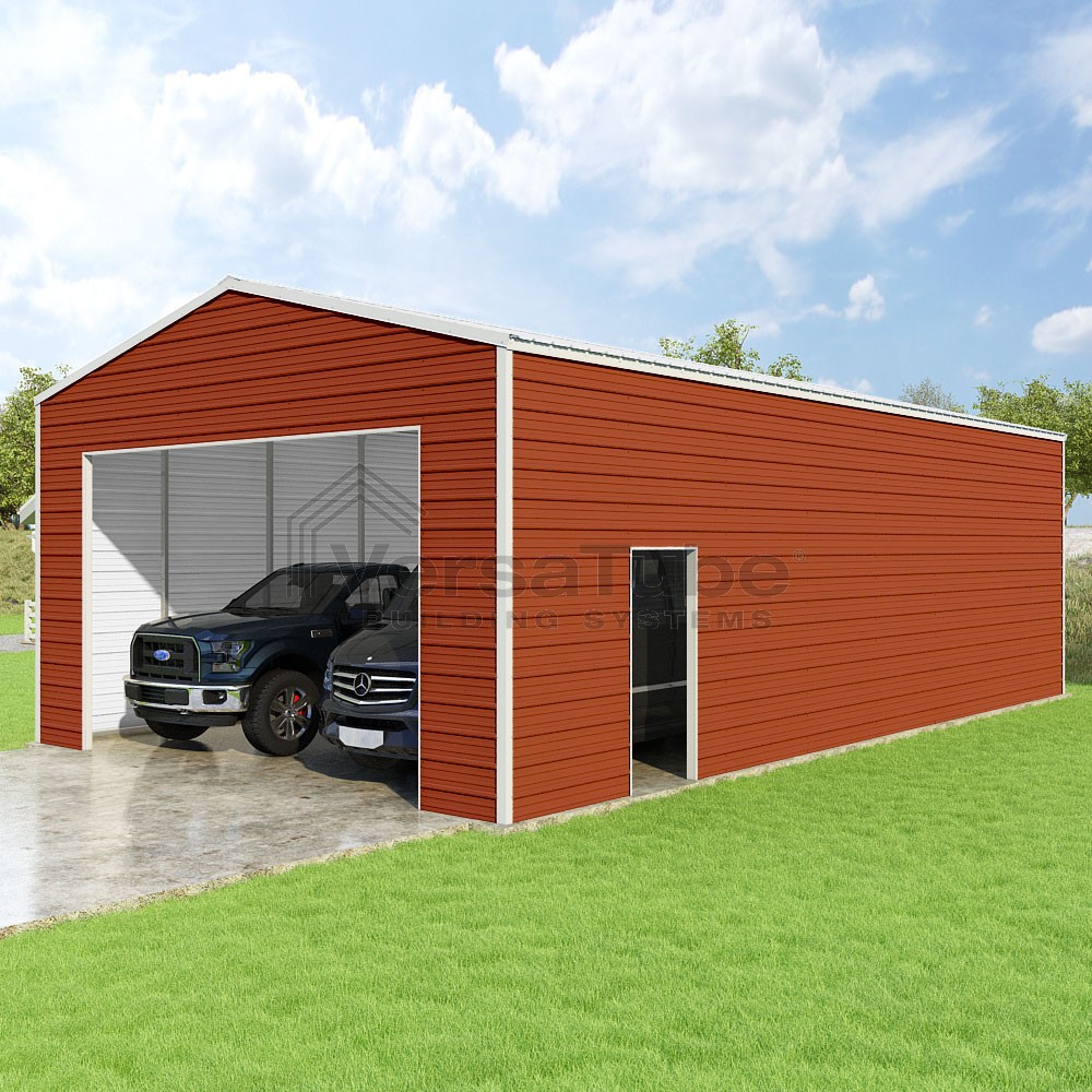 Frontier Series DIY garage kit features vertical sheet metal roof panels with horizontal siding panels..