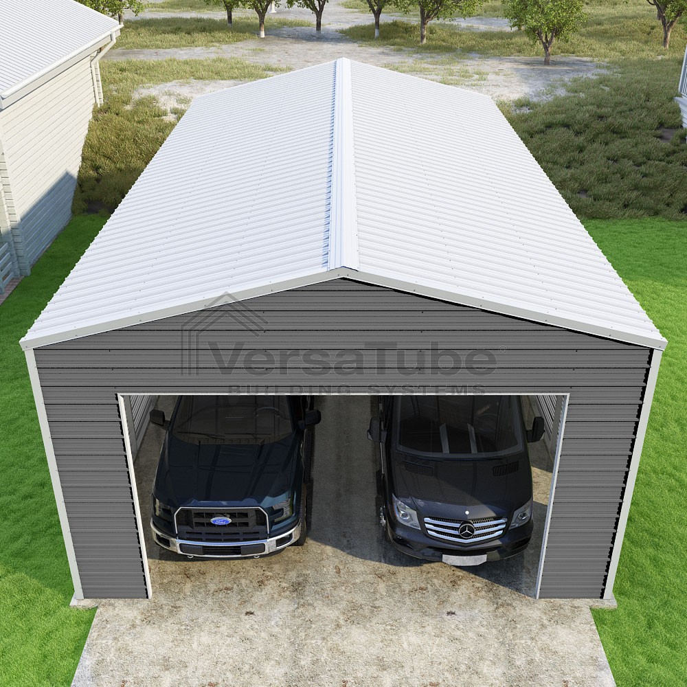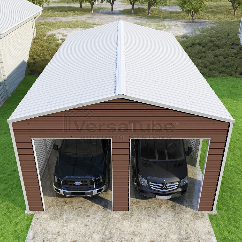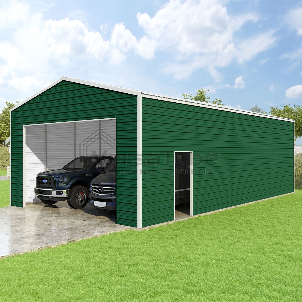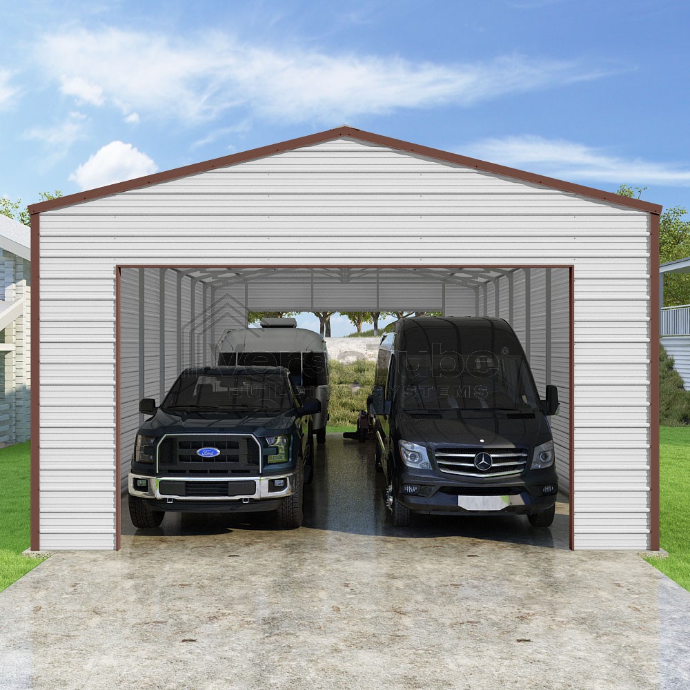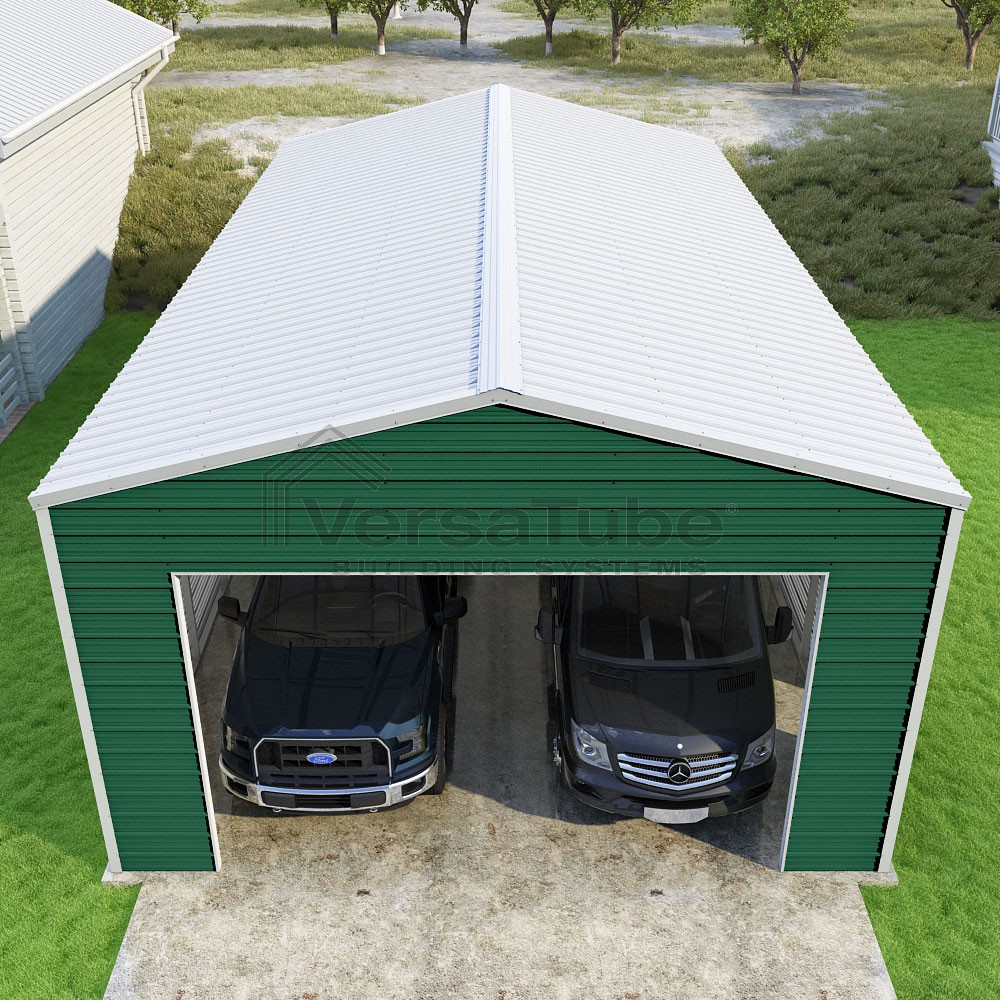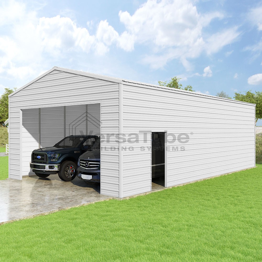 Frontier Series DIY garage kit features vertical sheet metal roof panels with horizontal siding panels..