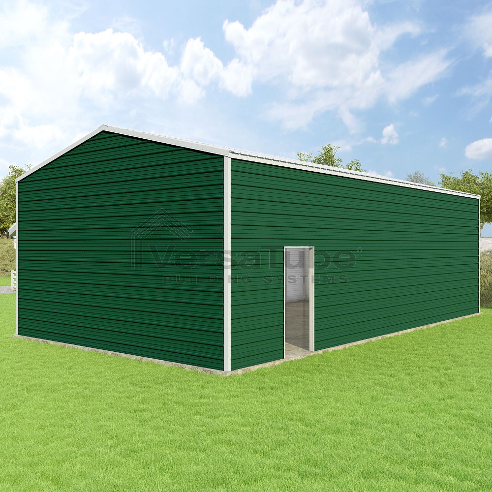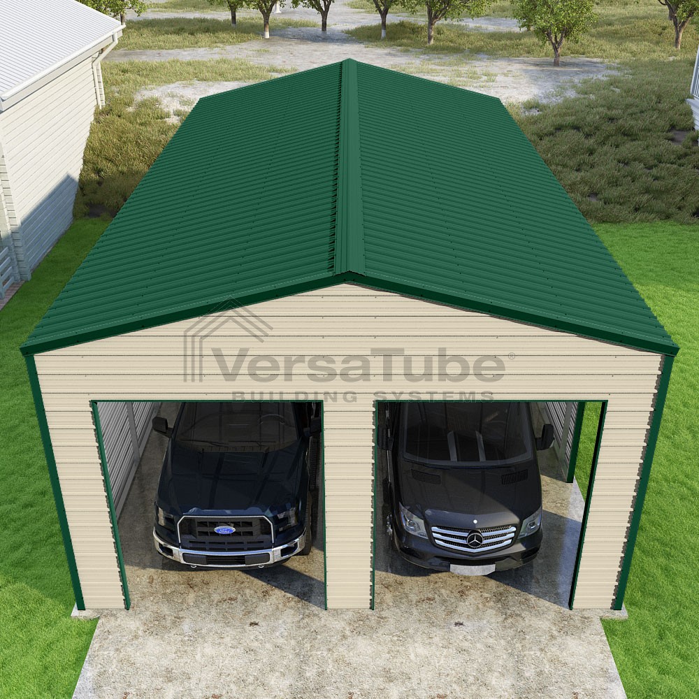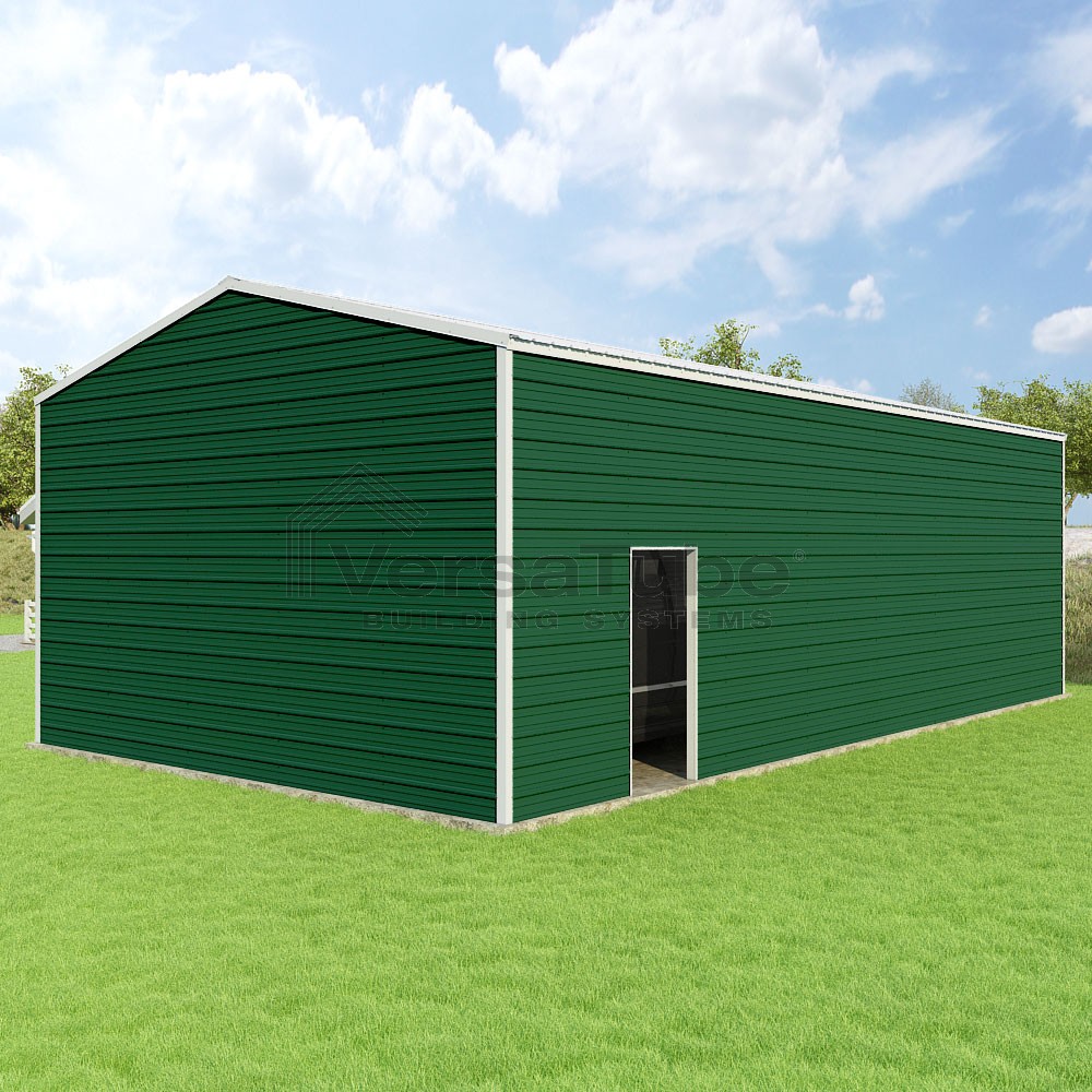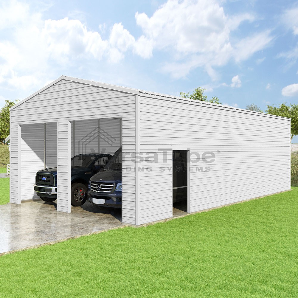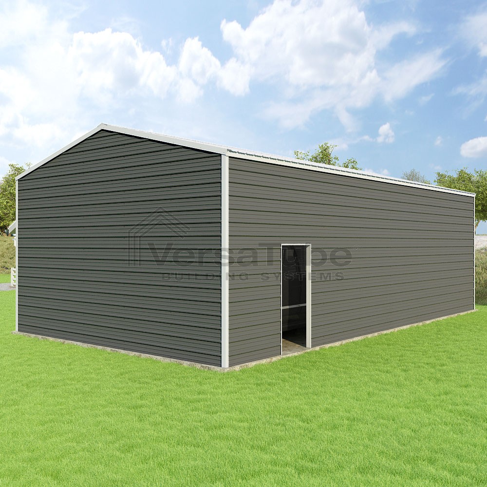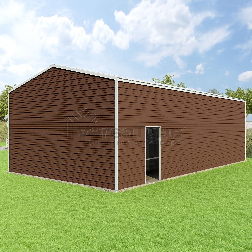Frontier Series DIY garage kit features vertical sheet metal roof panels with horizontal siding panels..