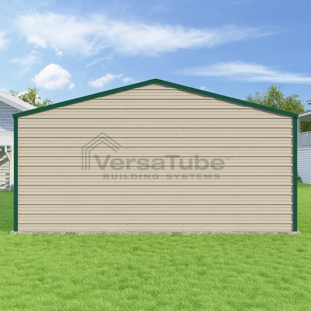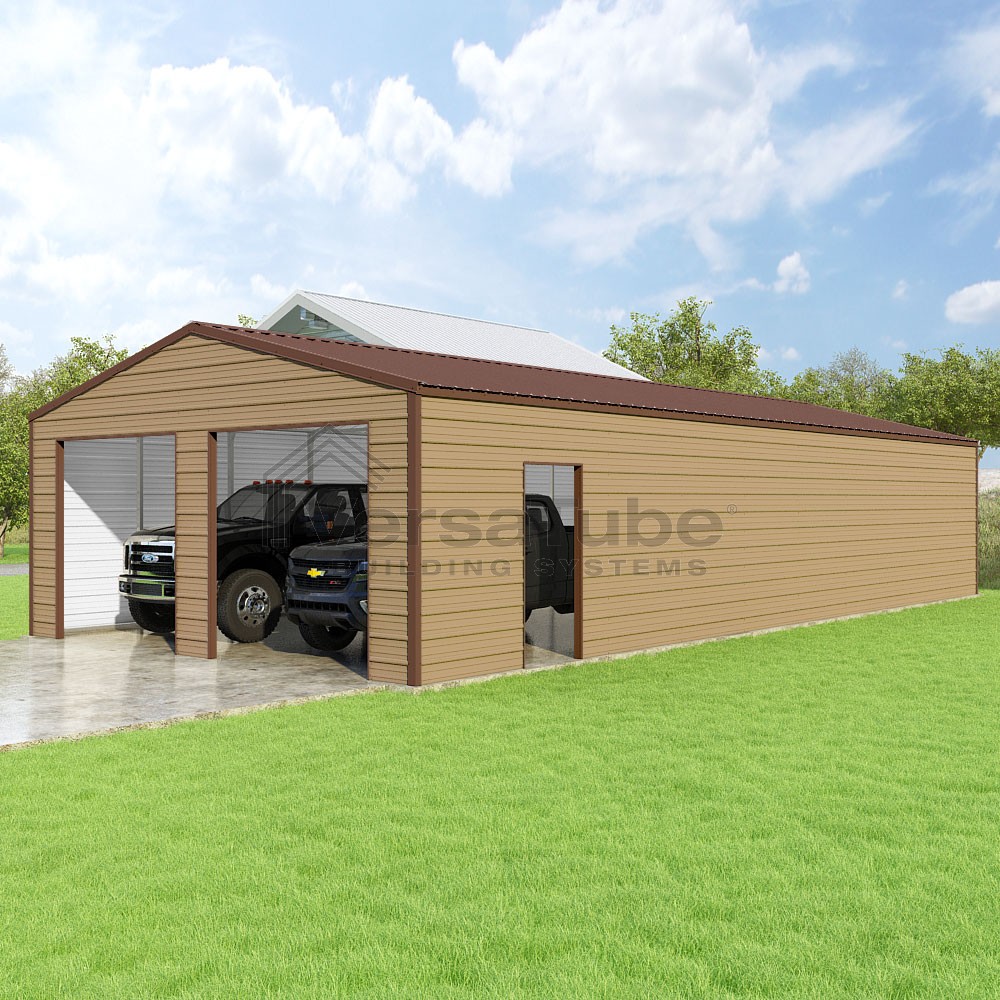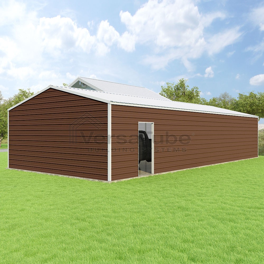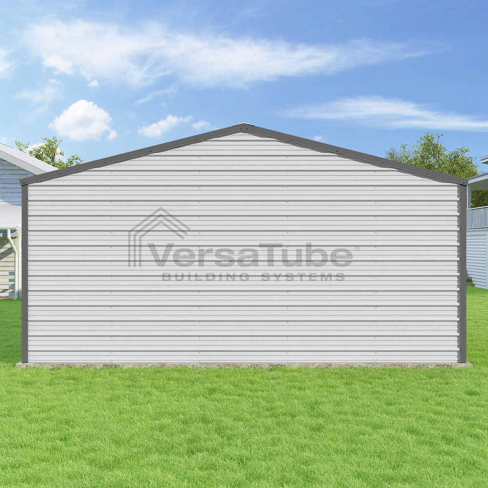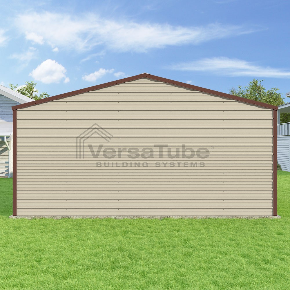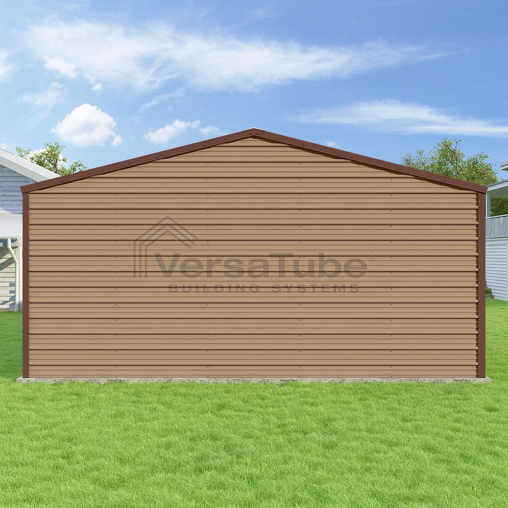 Frontier Series DIY garage kit features vertical sheet metal roof panels with horizontal siding panels..