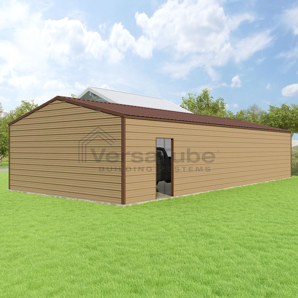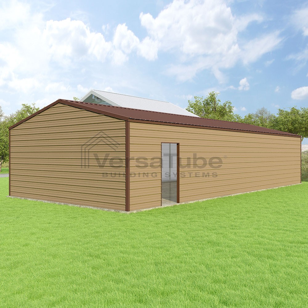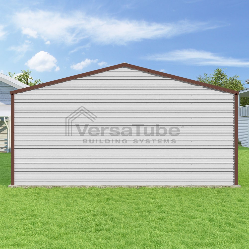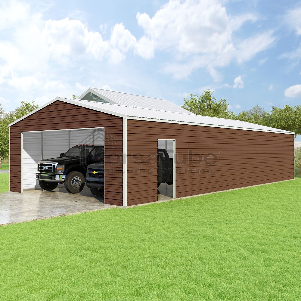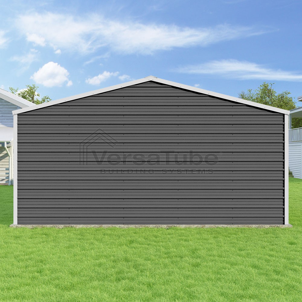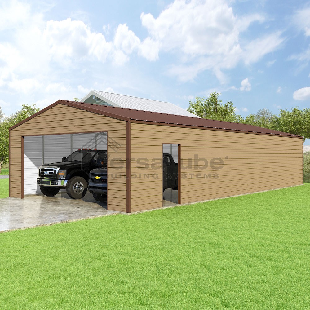 Frontier Series DIY garage kit features vertical sheet metal roof panels with horizontal siding panels..