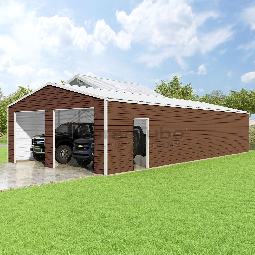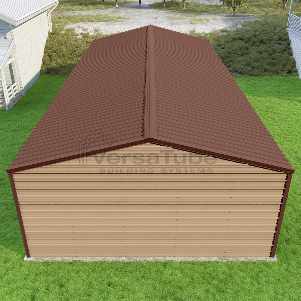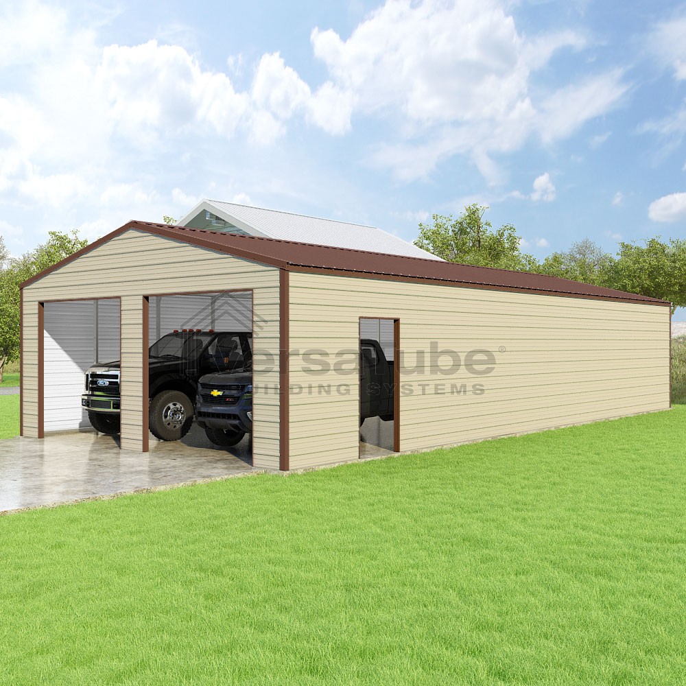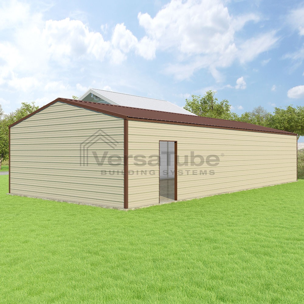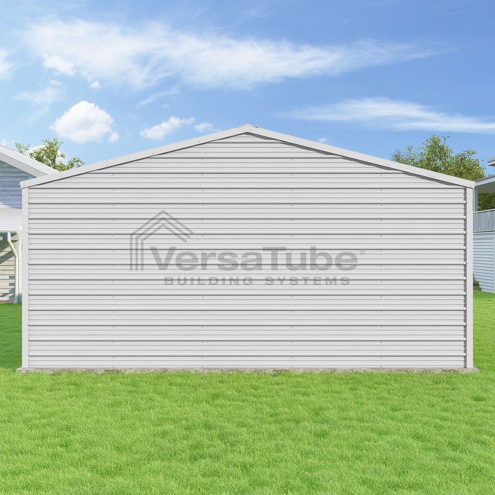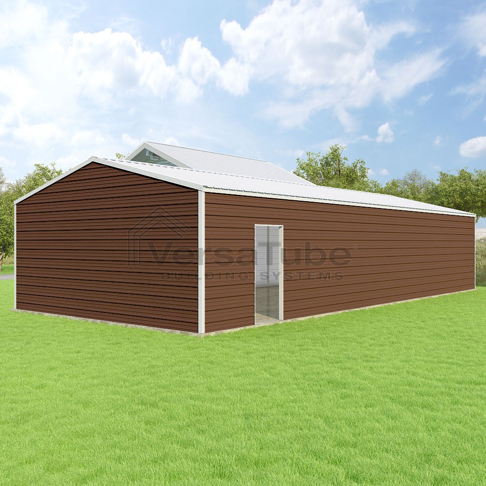 Frontier Series DIY garage kit features vertical sheet metal roof panels with horizontal siding panels..