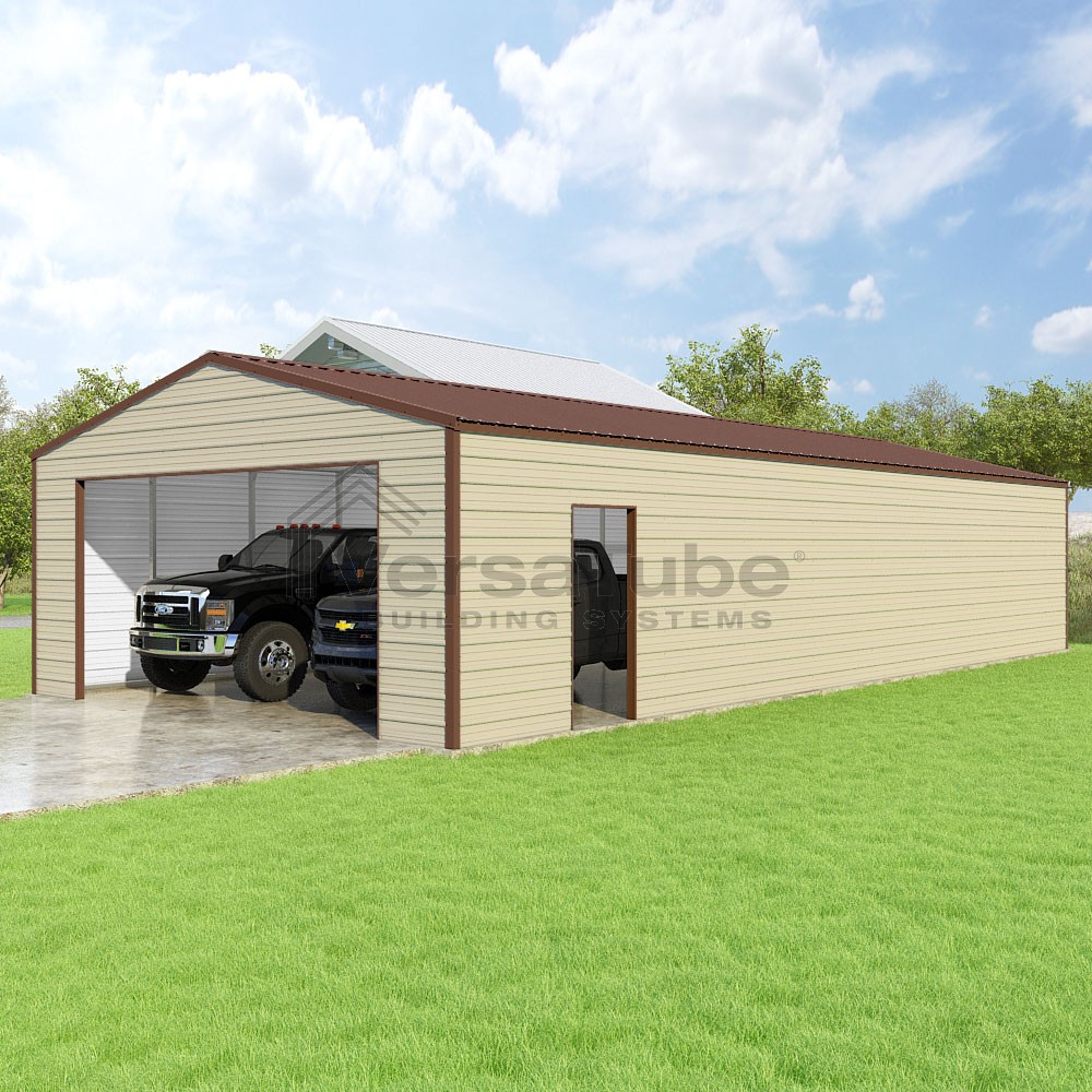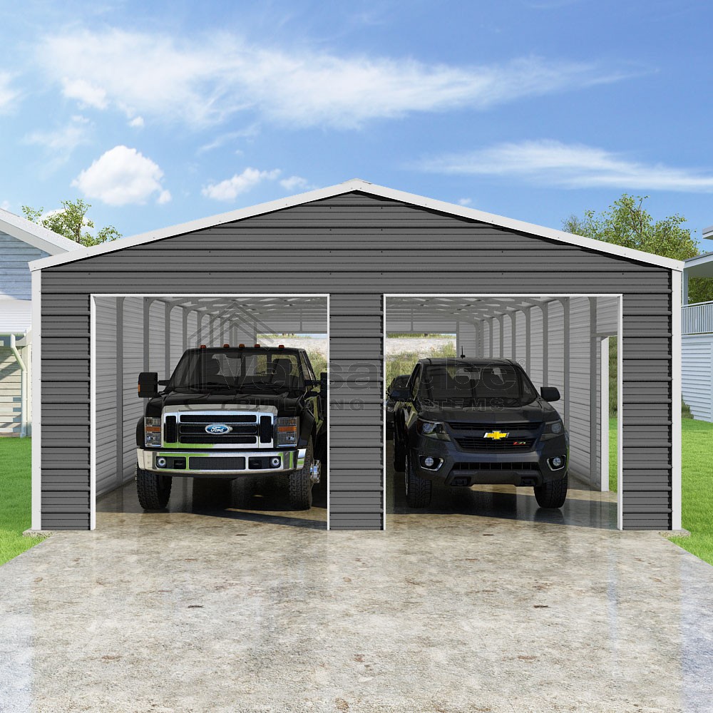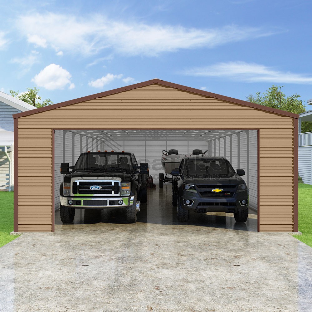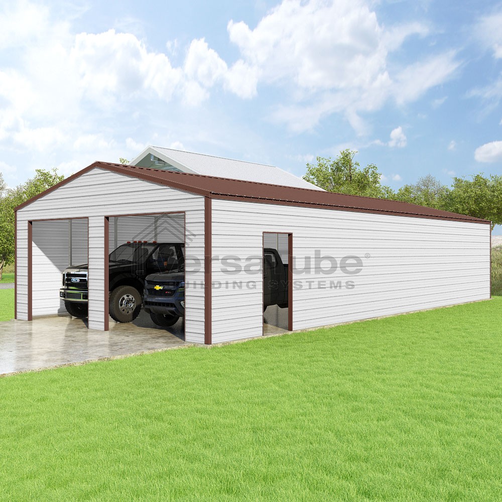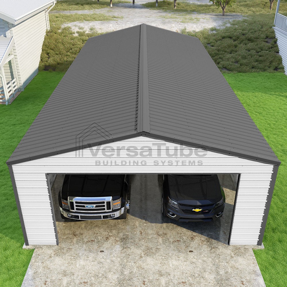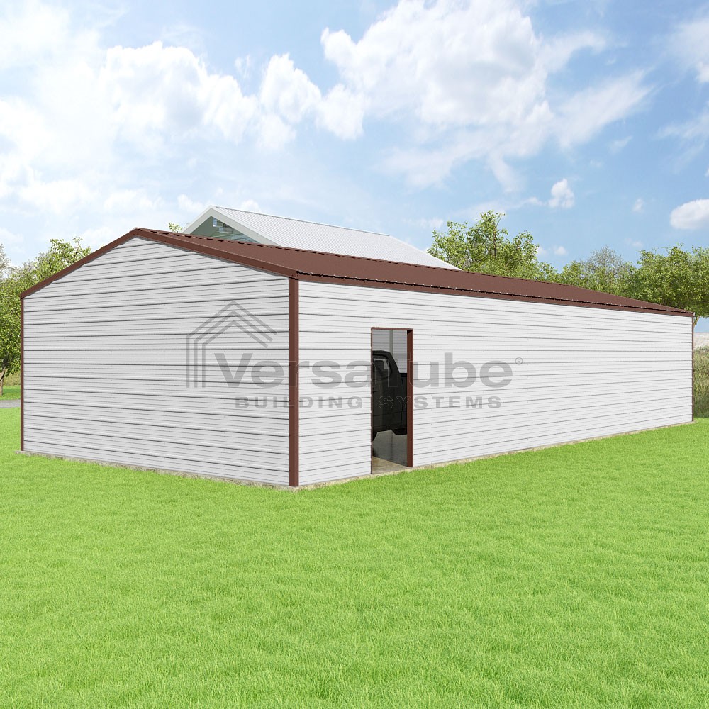 Frontier Series DIY garage kit features vertical sheet metal roof panels with horizontal siding panels..