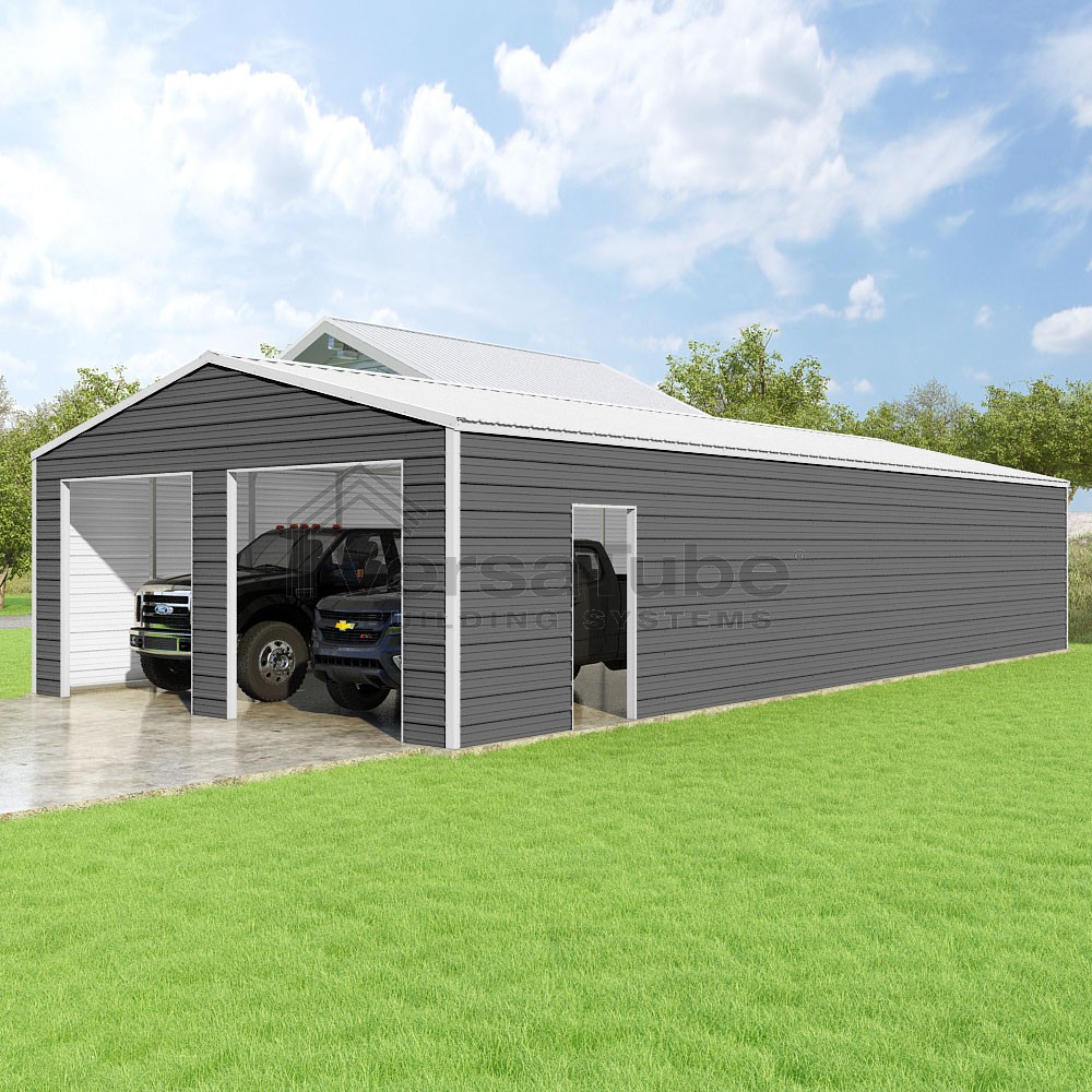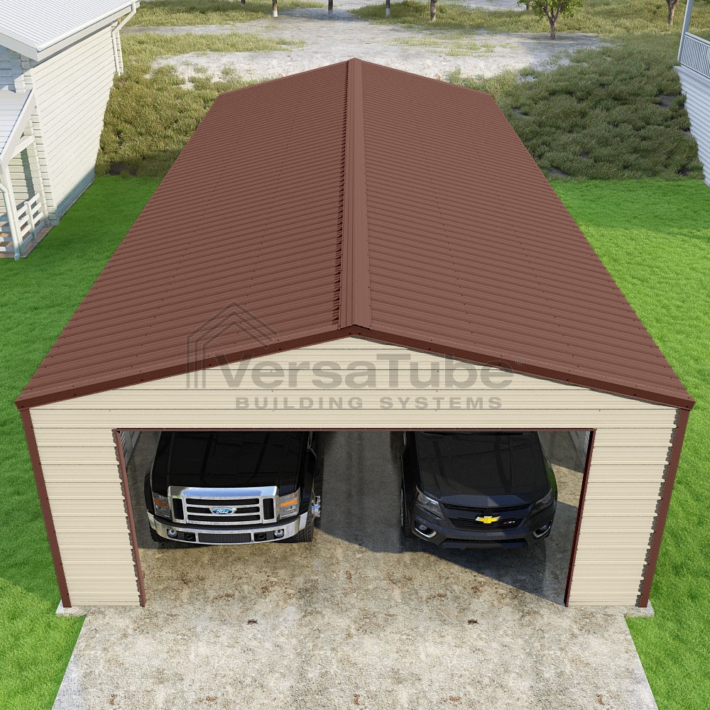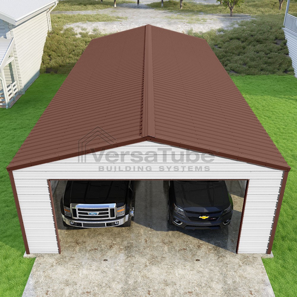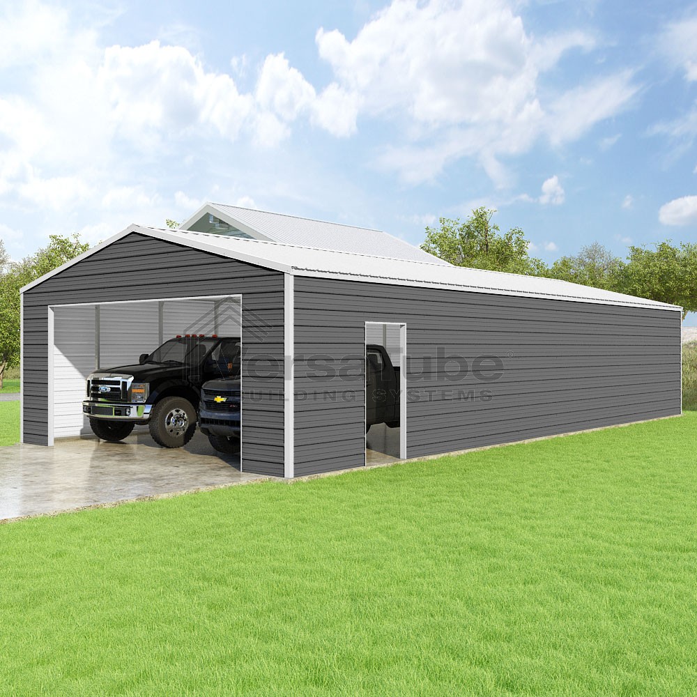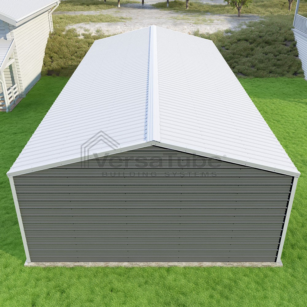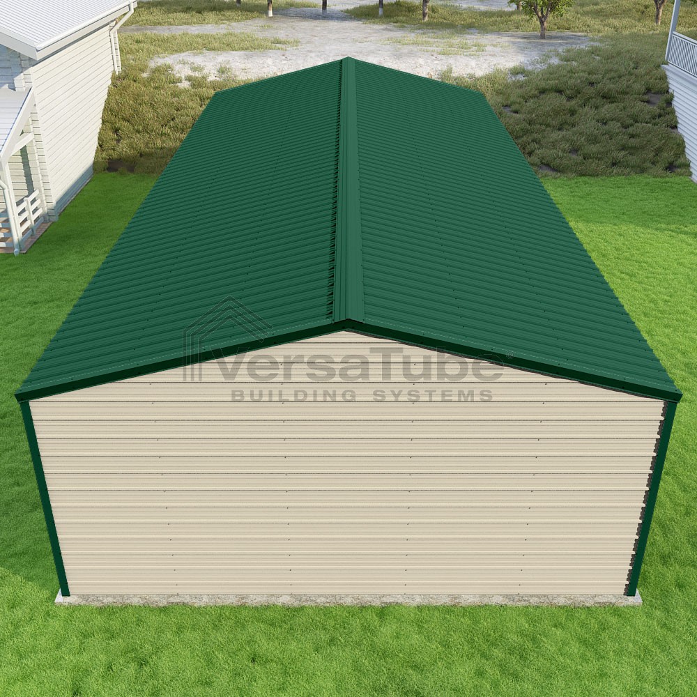 Frontier Series DIY garage kit features vertical sheet metal roof panels with horizontal siding panels..