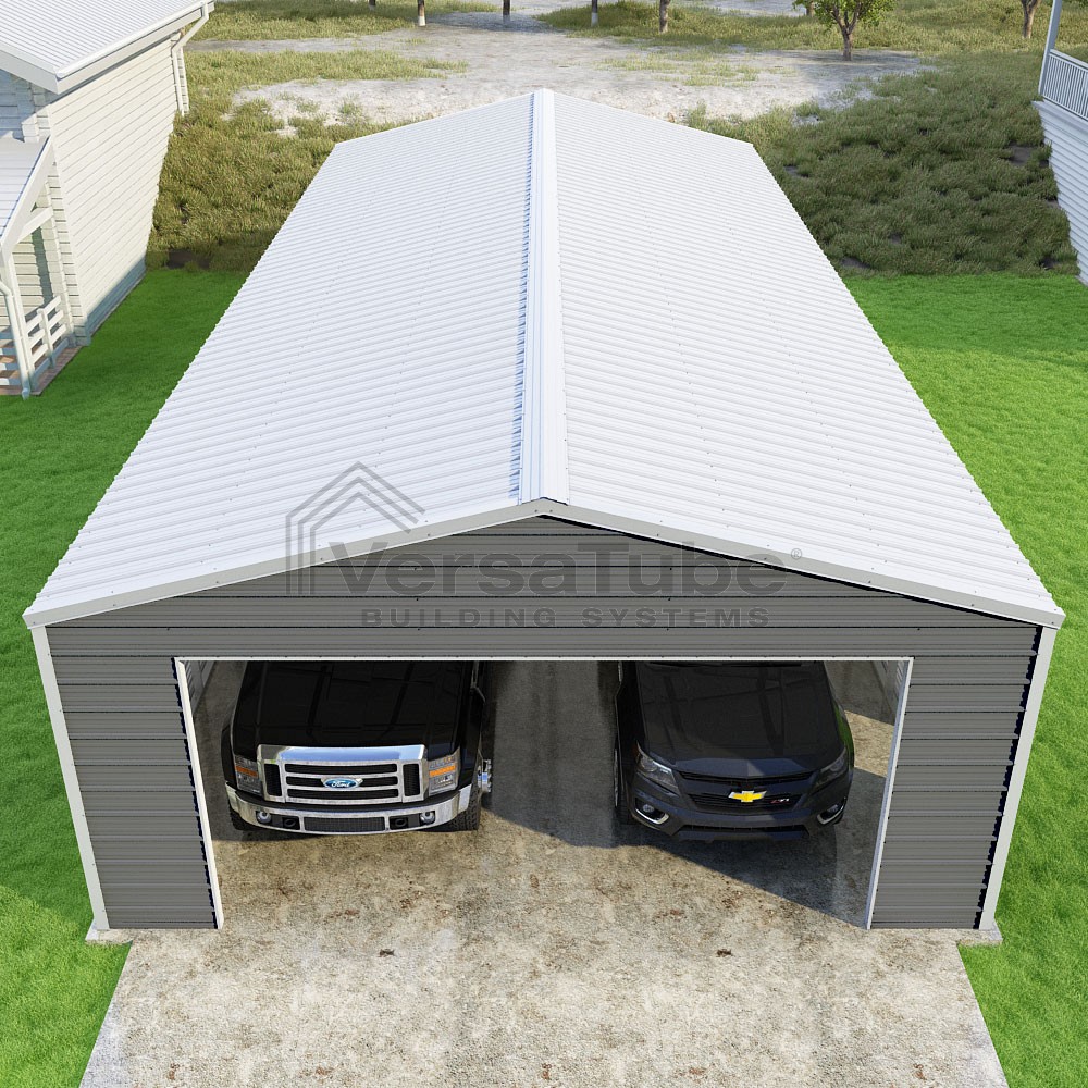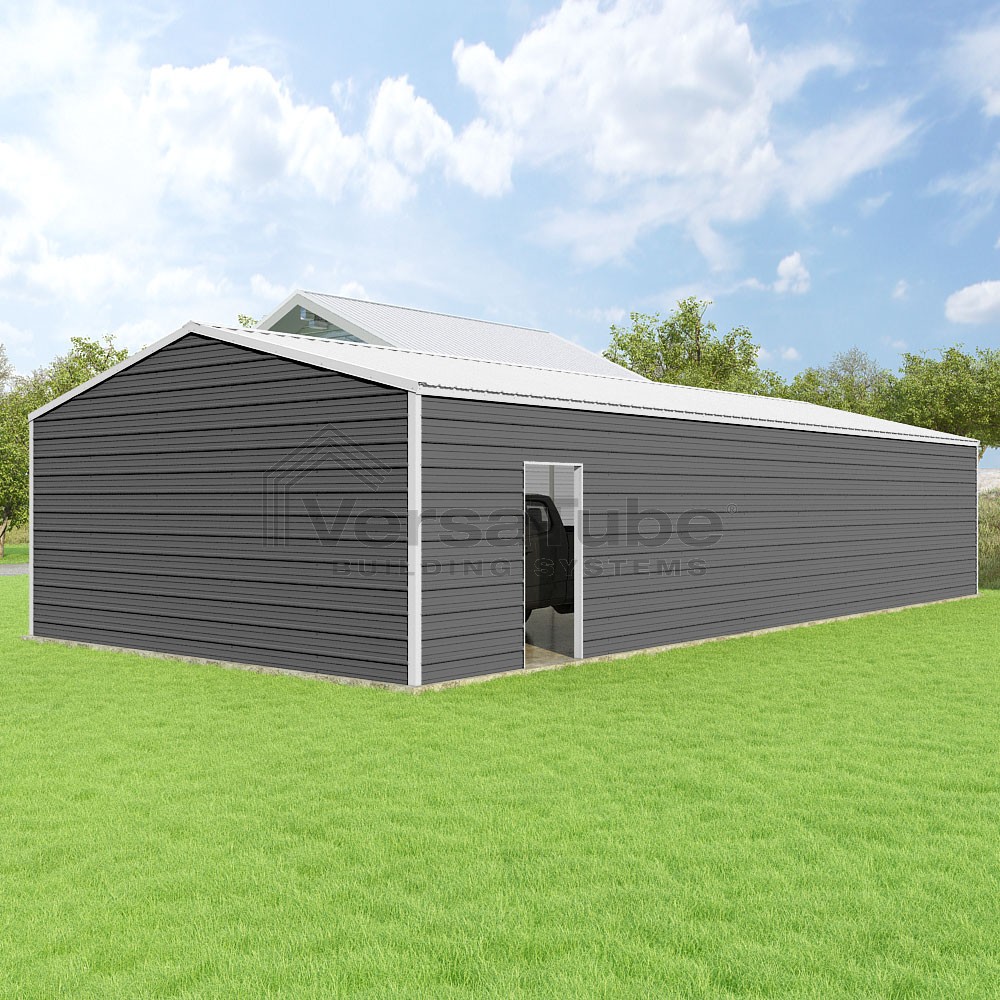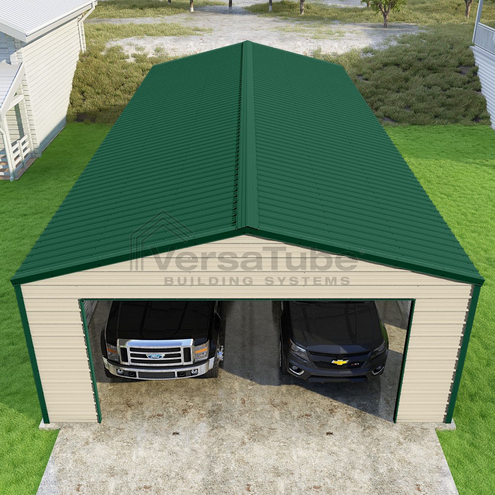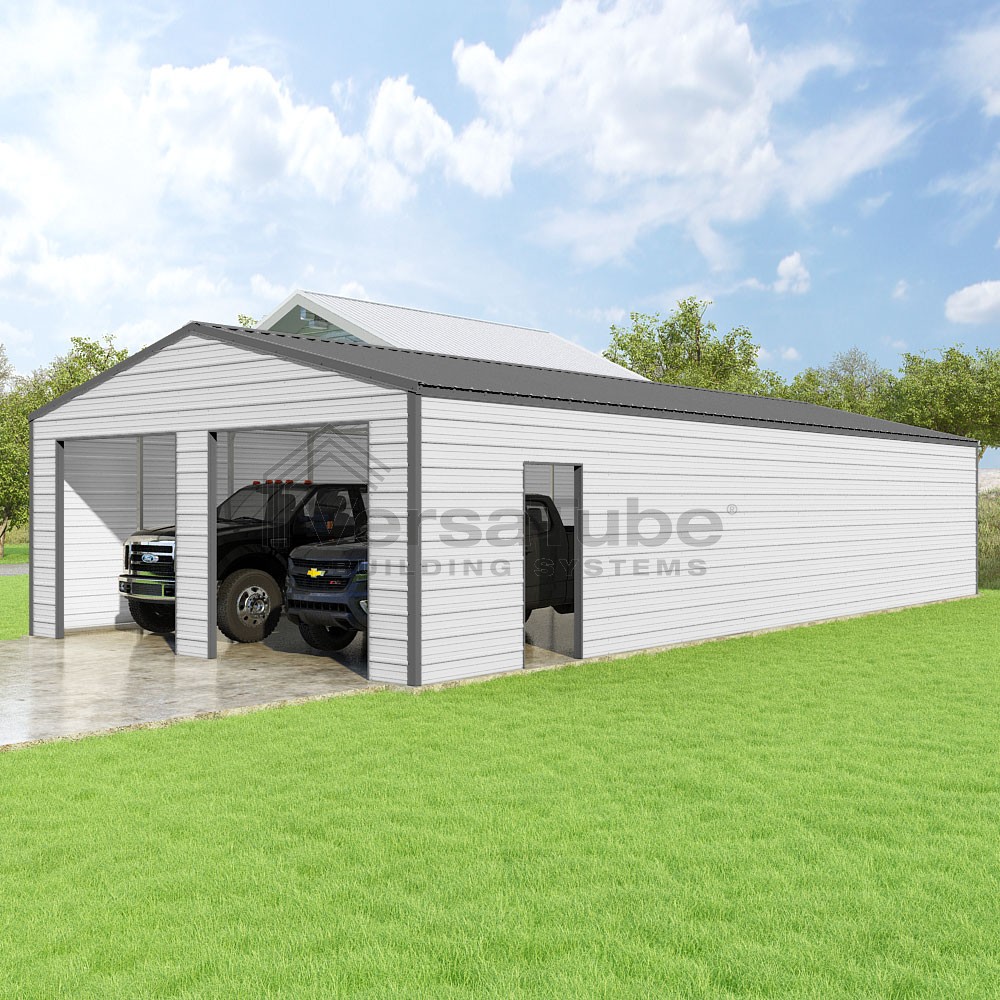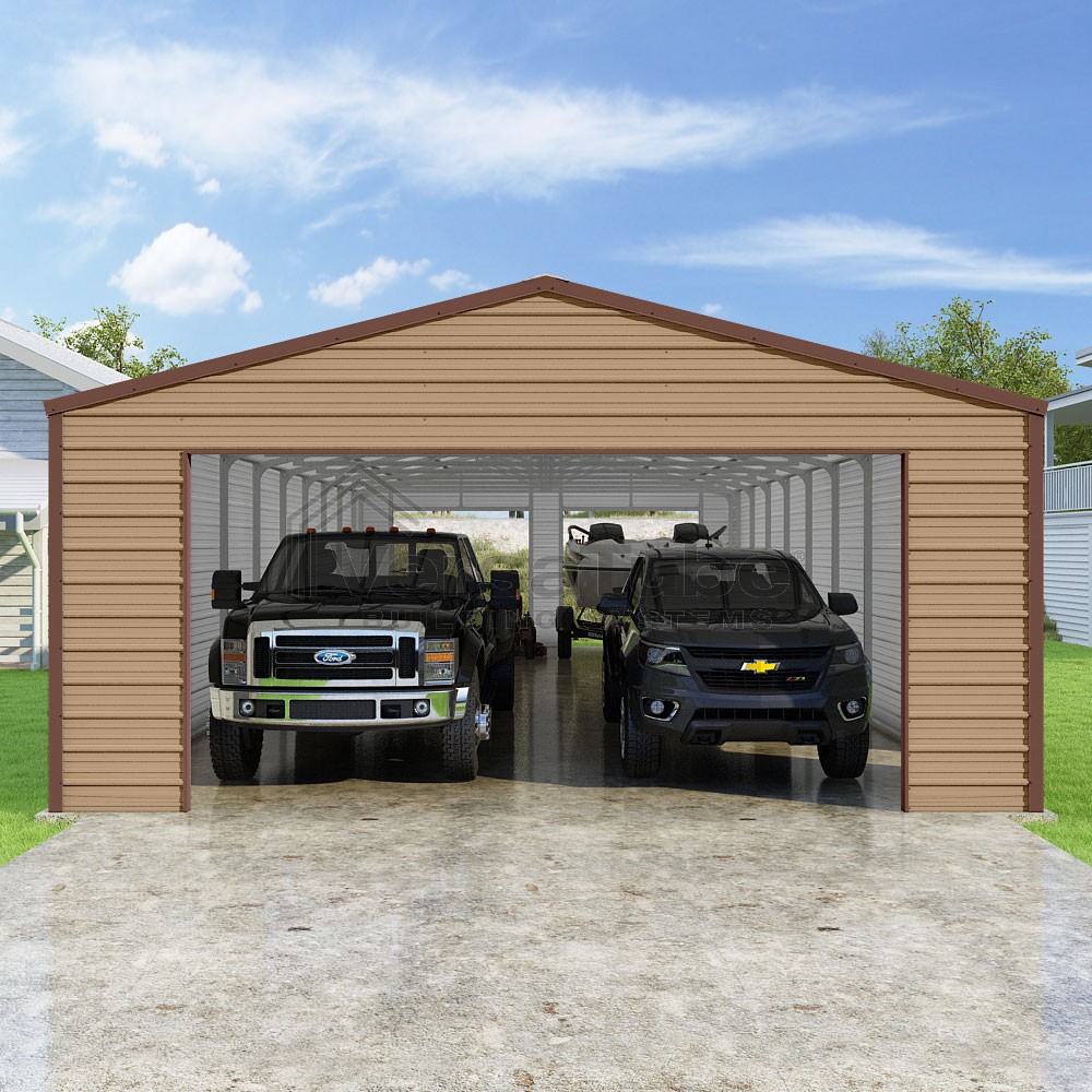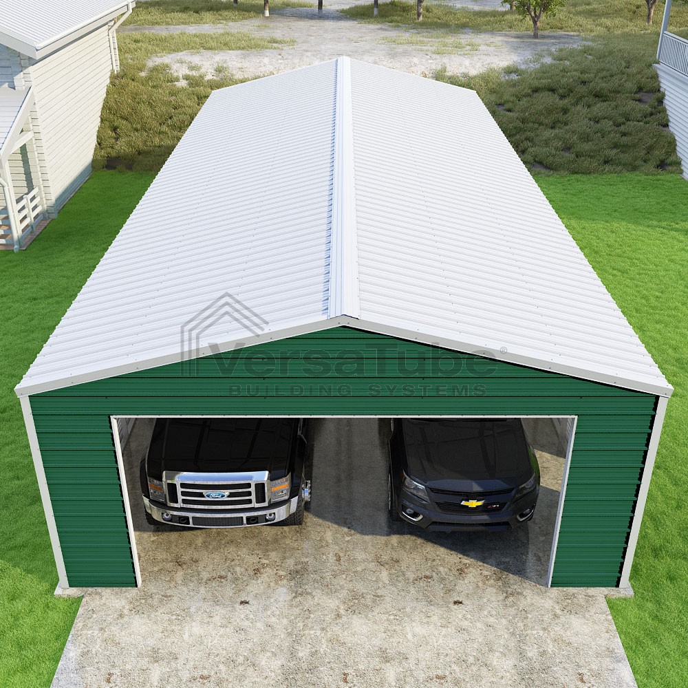 Frontier Series DIY garage kit features vertical sheet metal roof panels with horizontal siding panels..