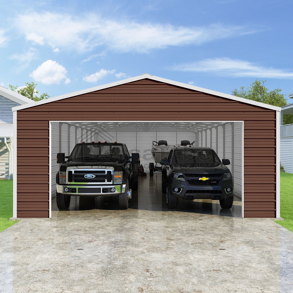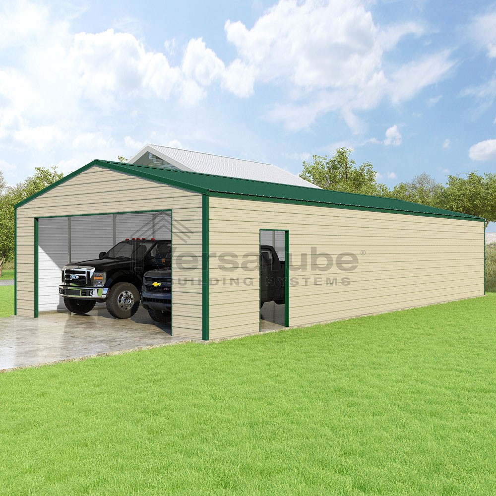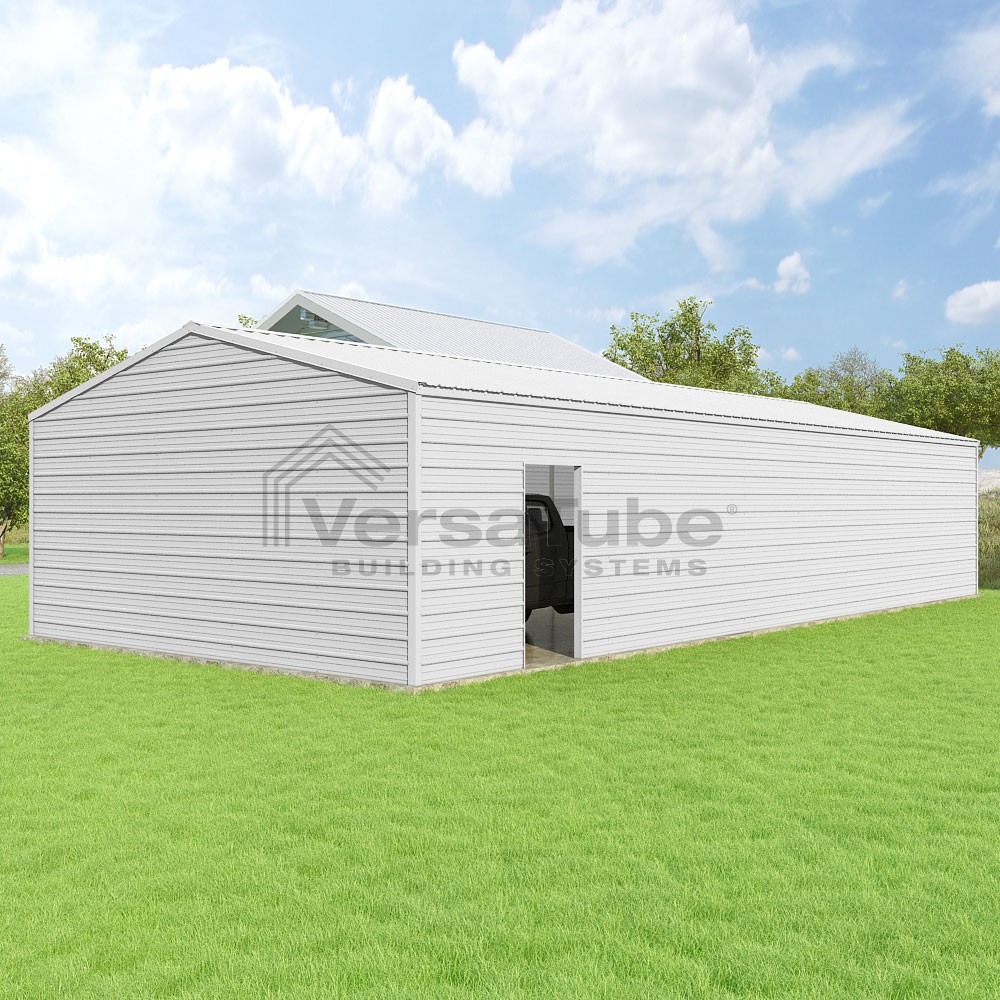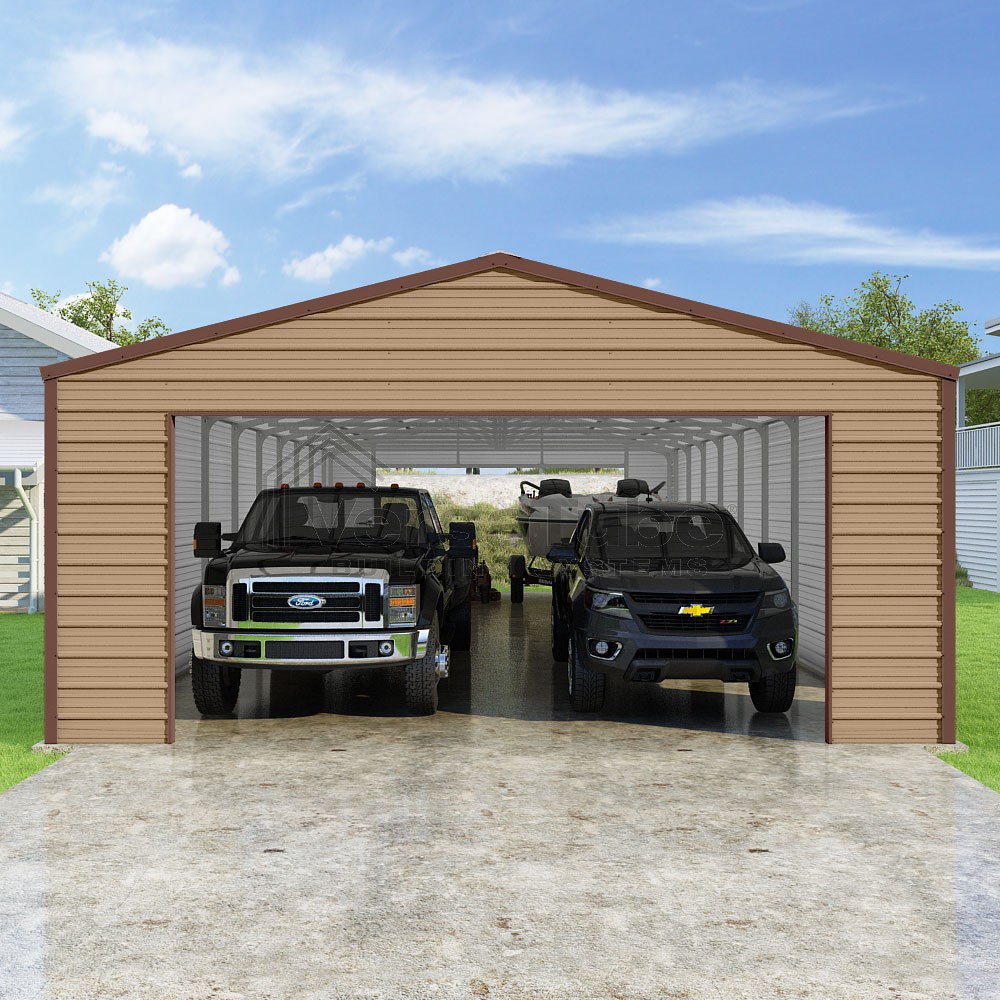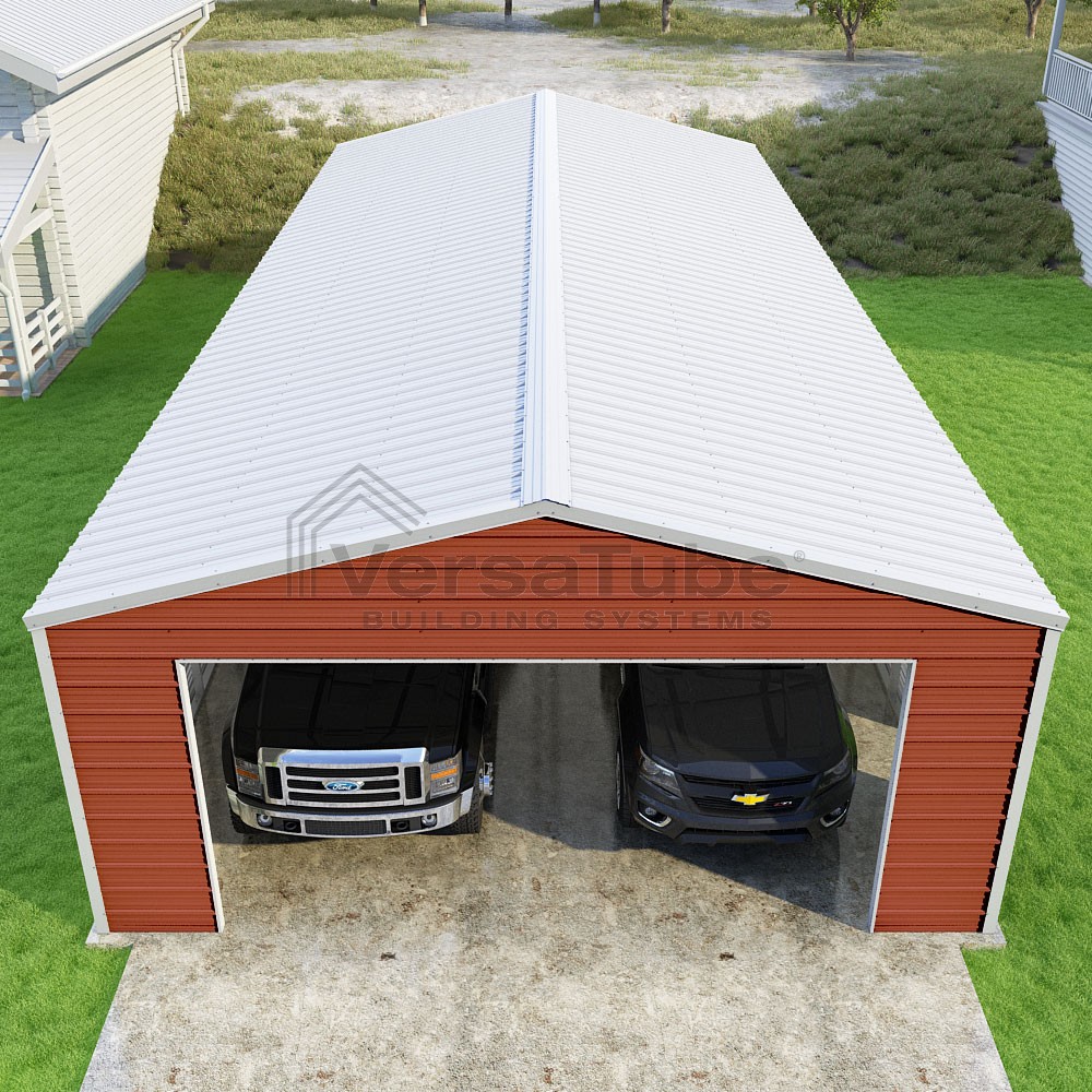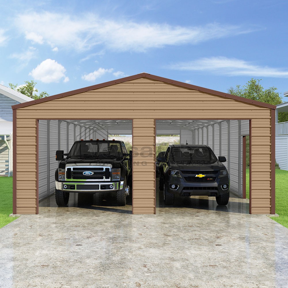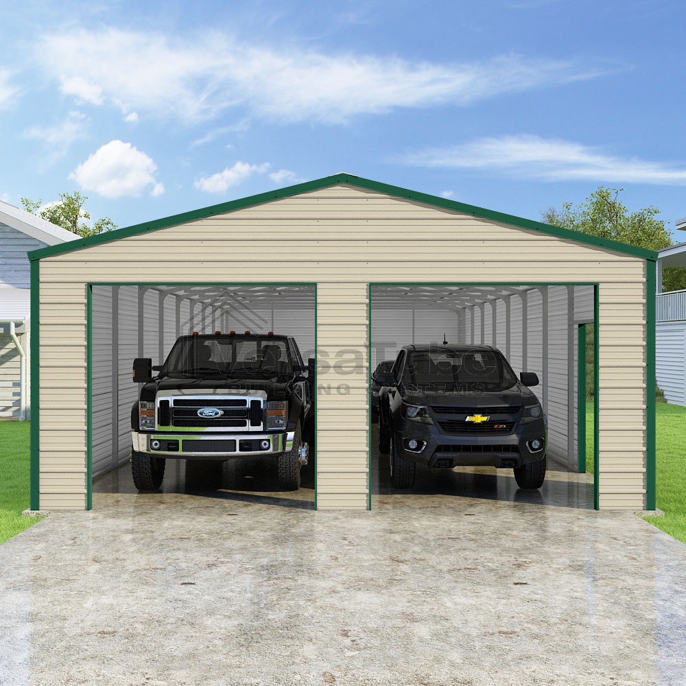 Frontier Series DIY garage kit features vertical sheet metal roof panels with horizontal siding panels..
