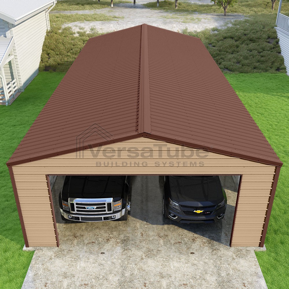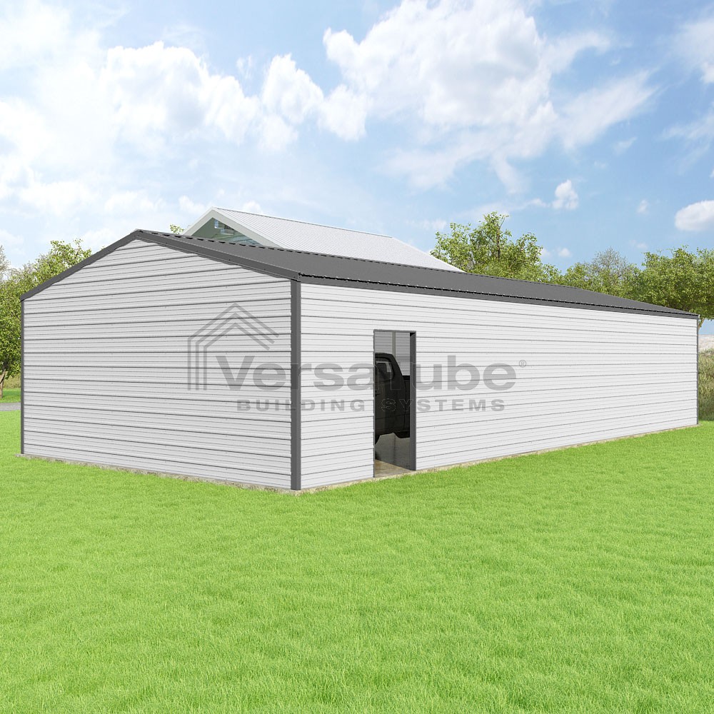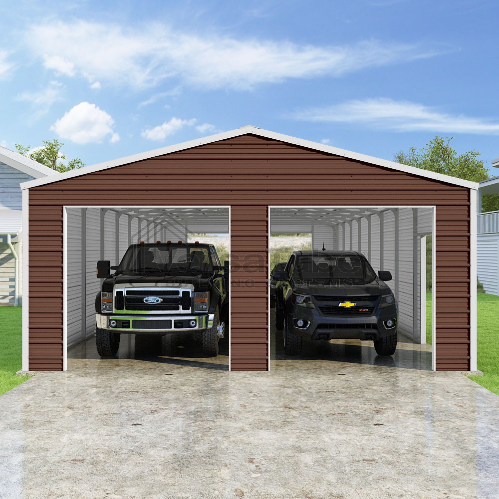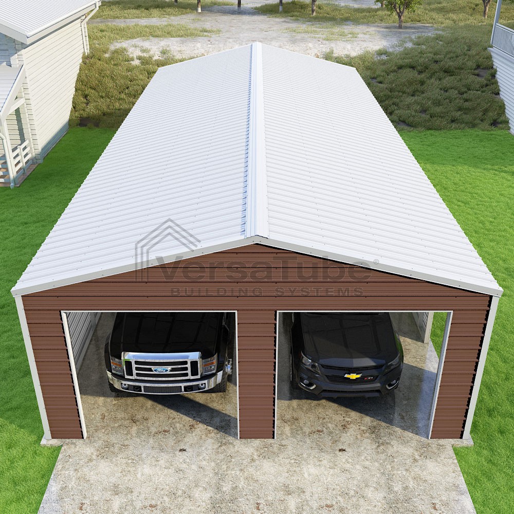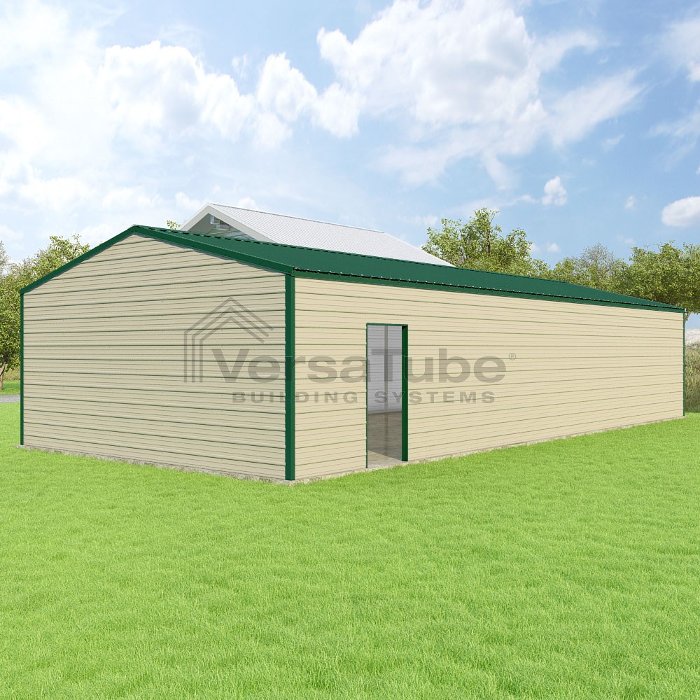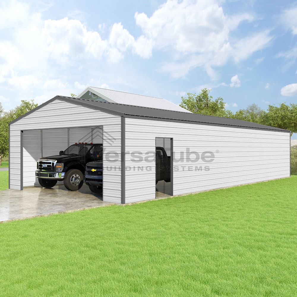Frontier Series DIY garage kit features vertical sheet metal roof panels with horizontal siding panels..