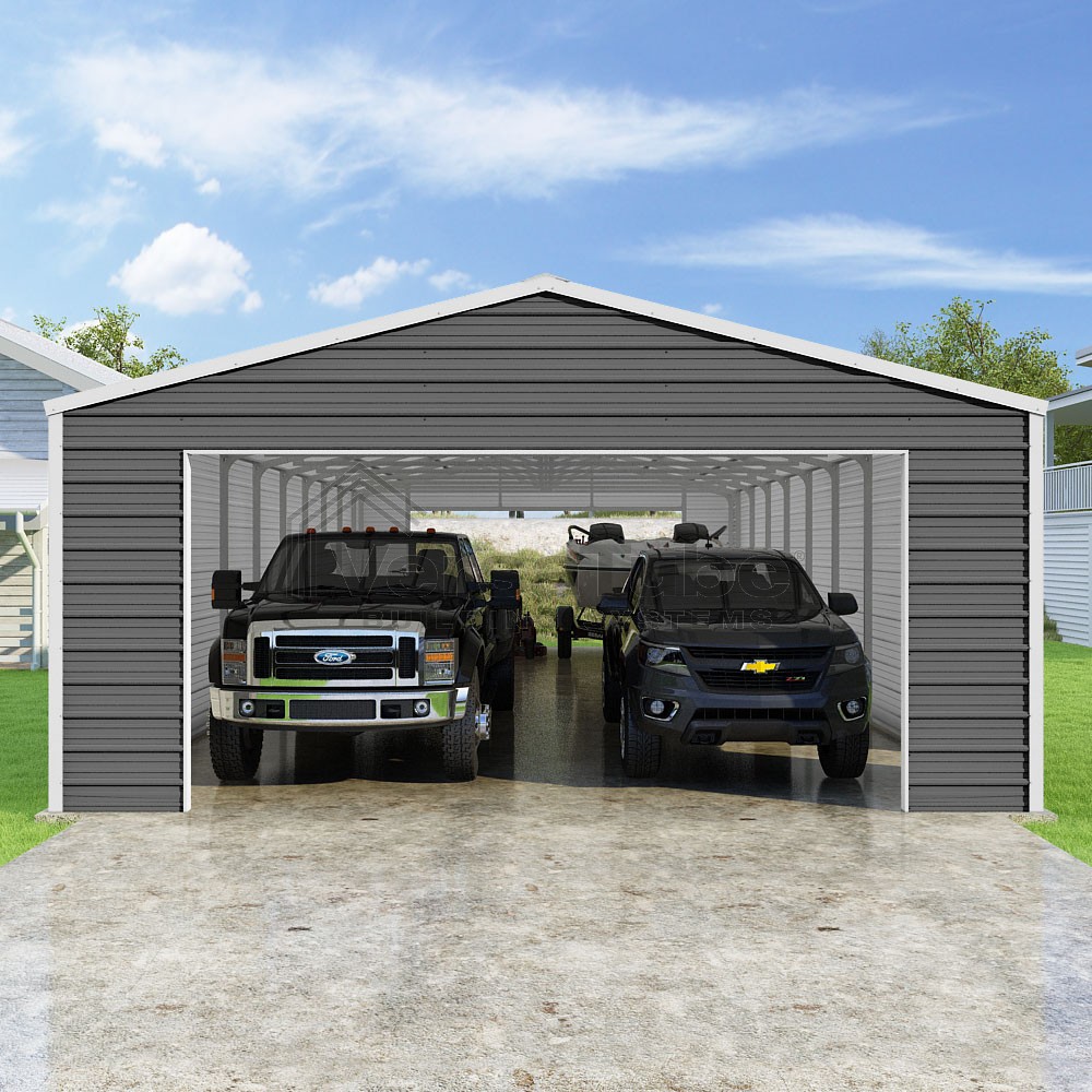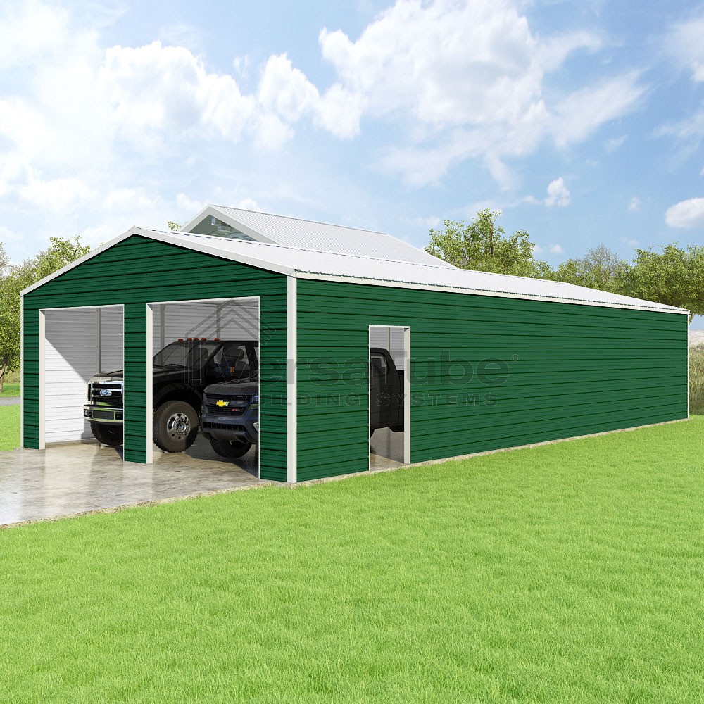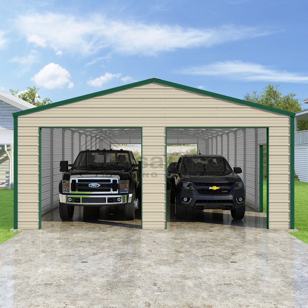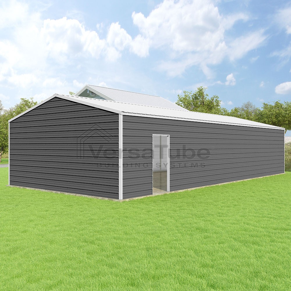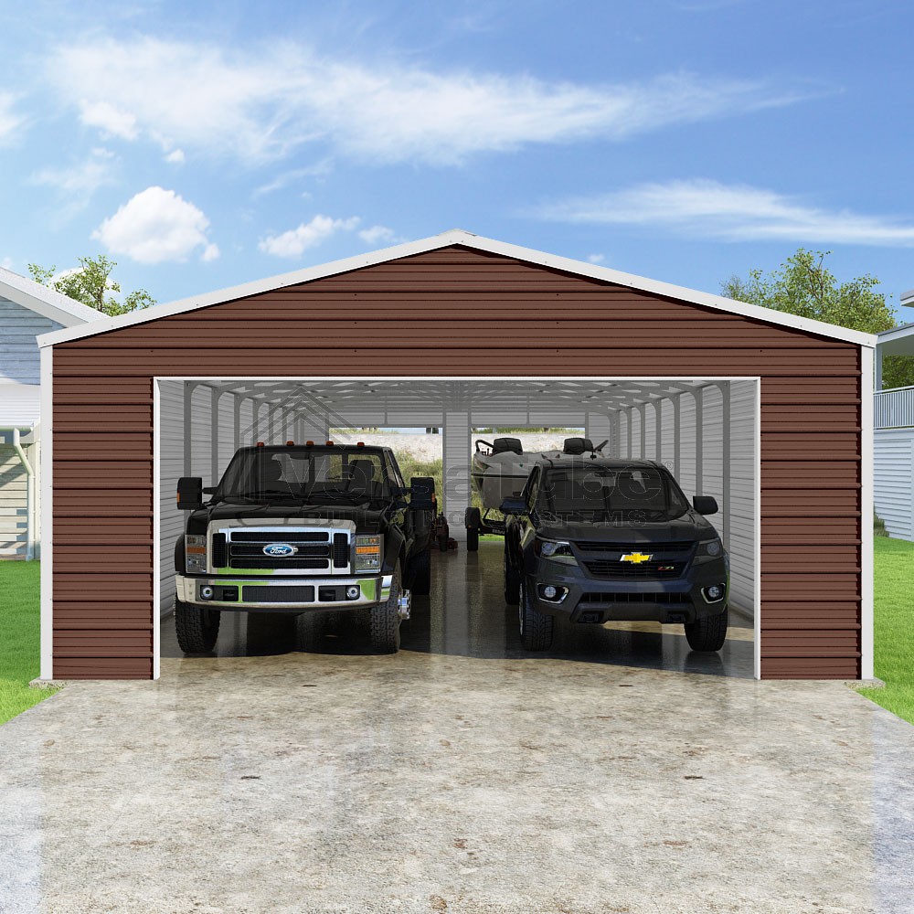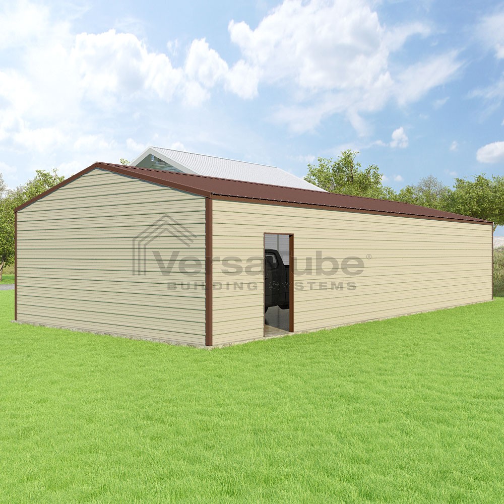 Frontier Series DIY garage kit features vertical sheet metal roof panels with horizontal siding panels..