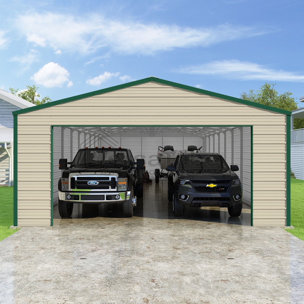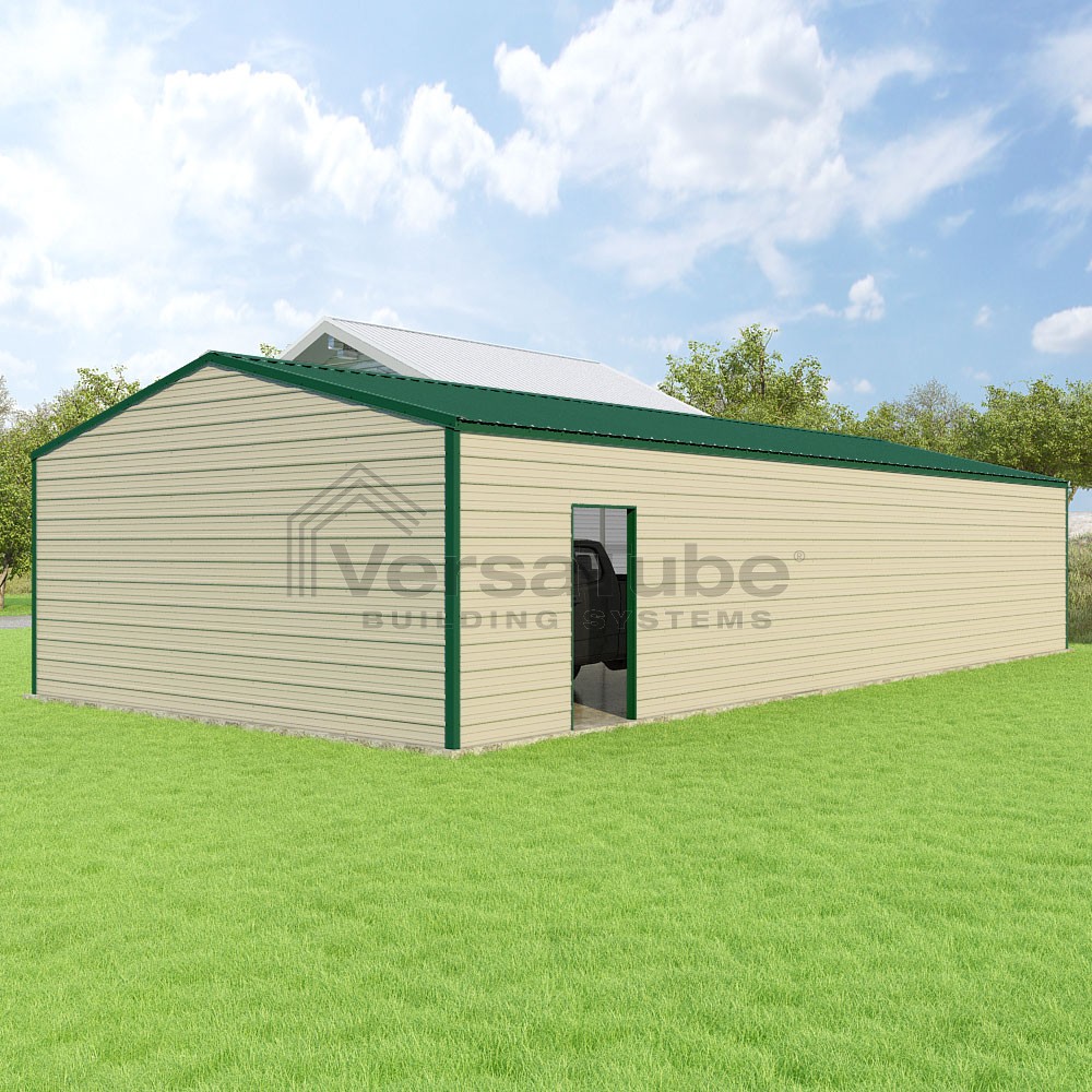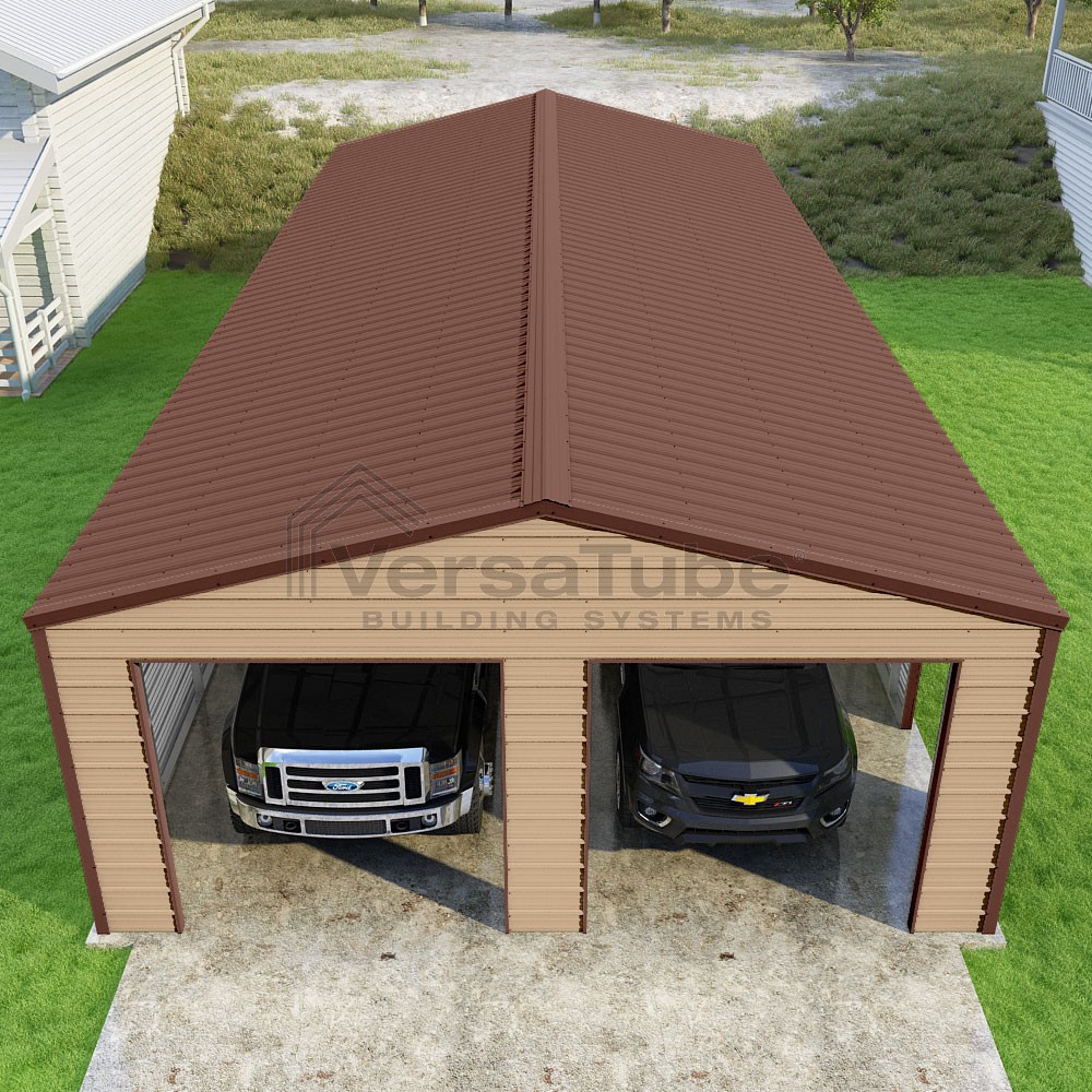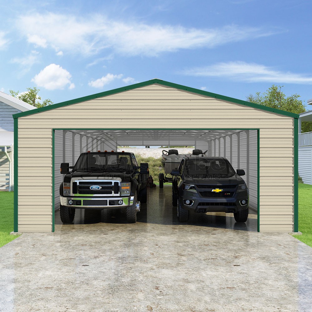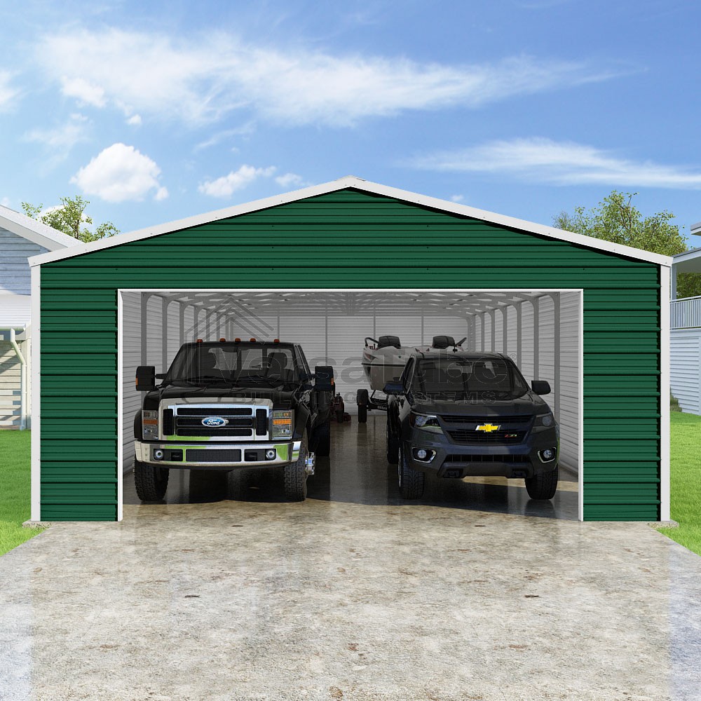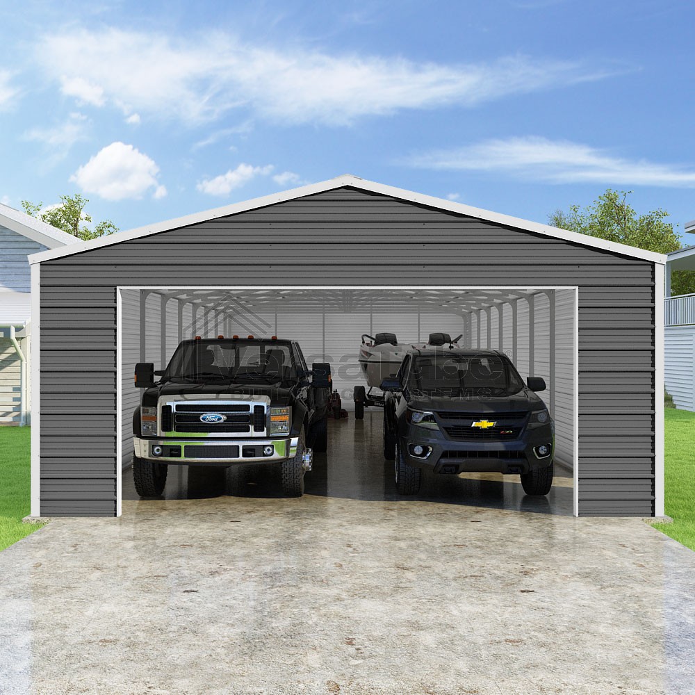 Frontier Series DIY garage kit features vertical sheet metal roof panels with horizontal siding panels..