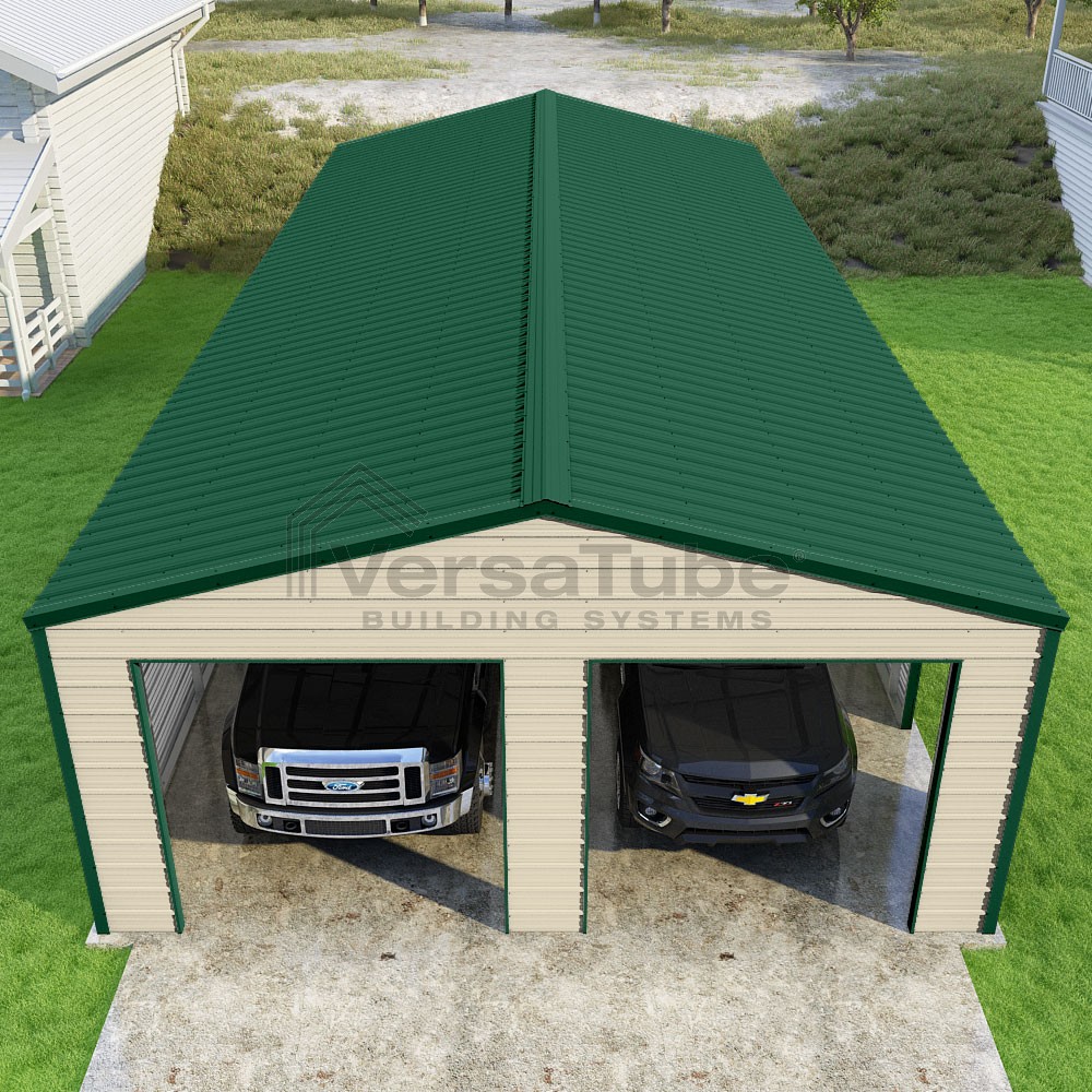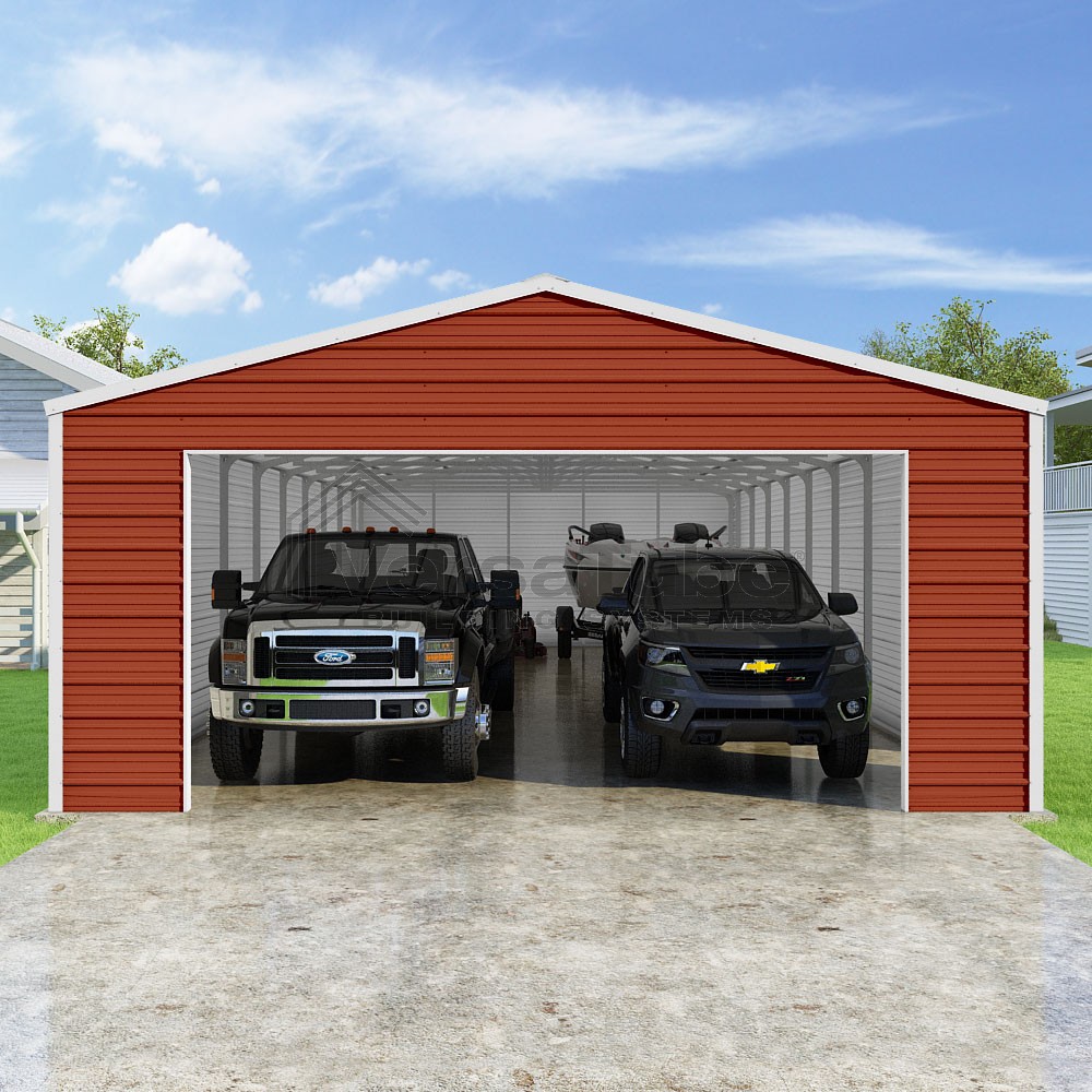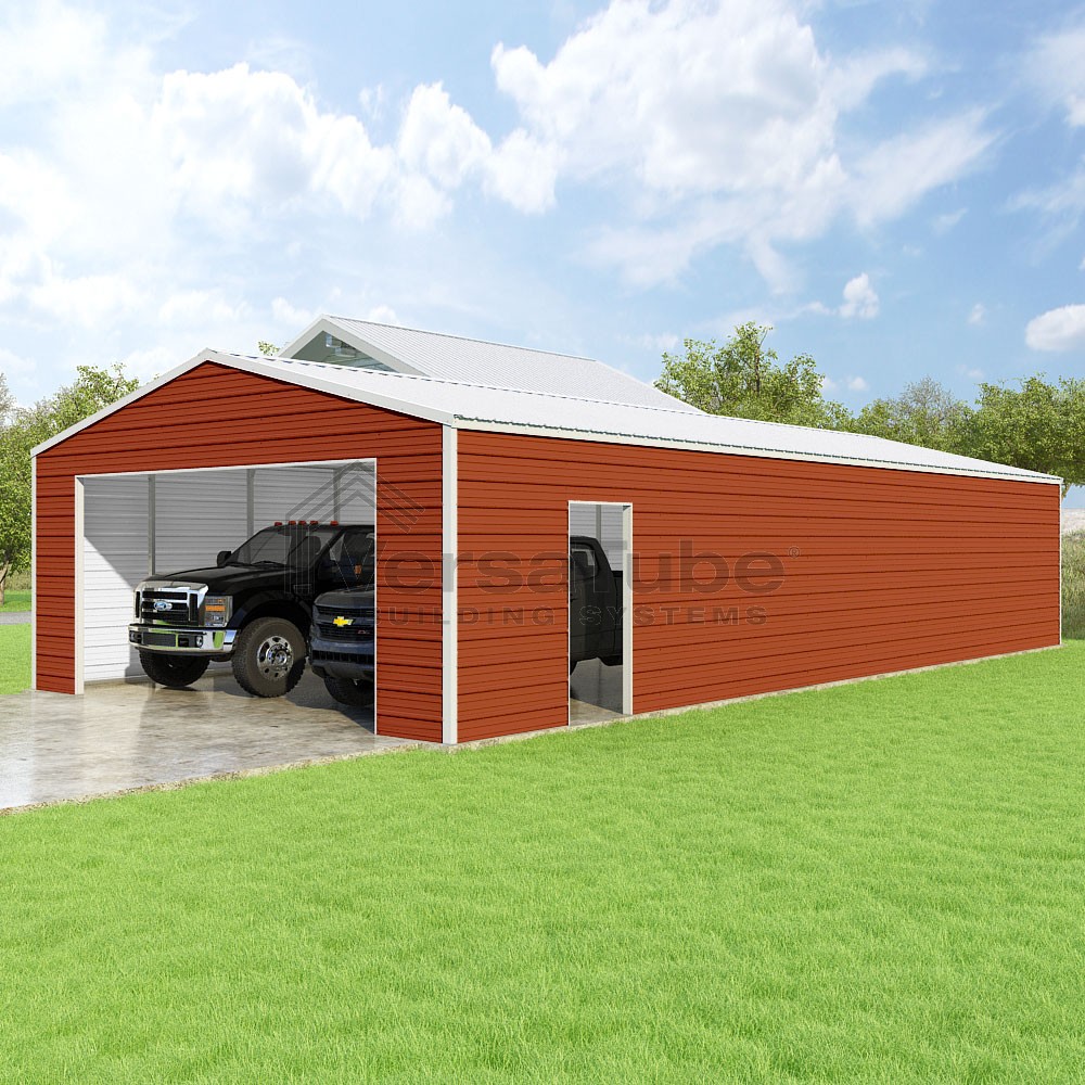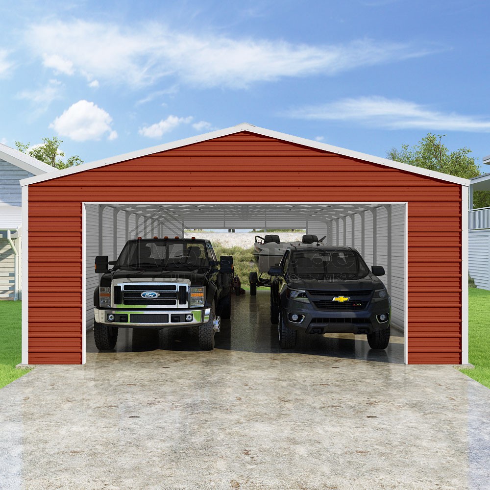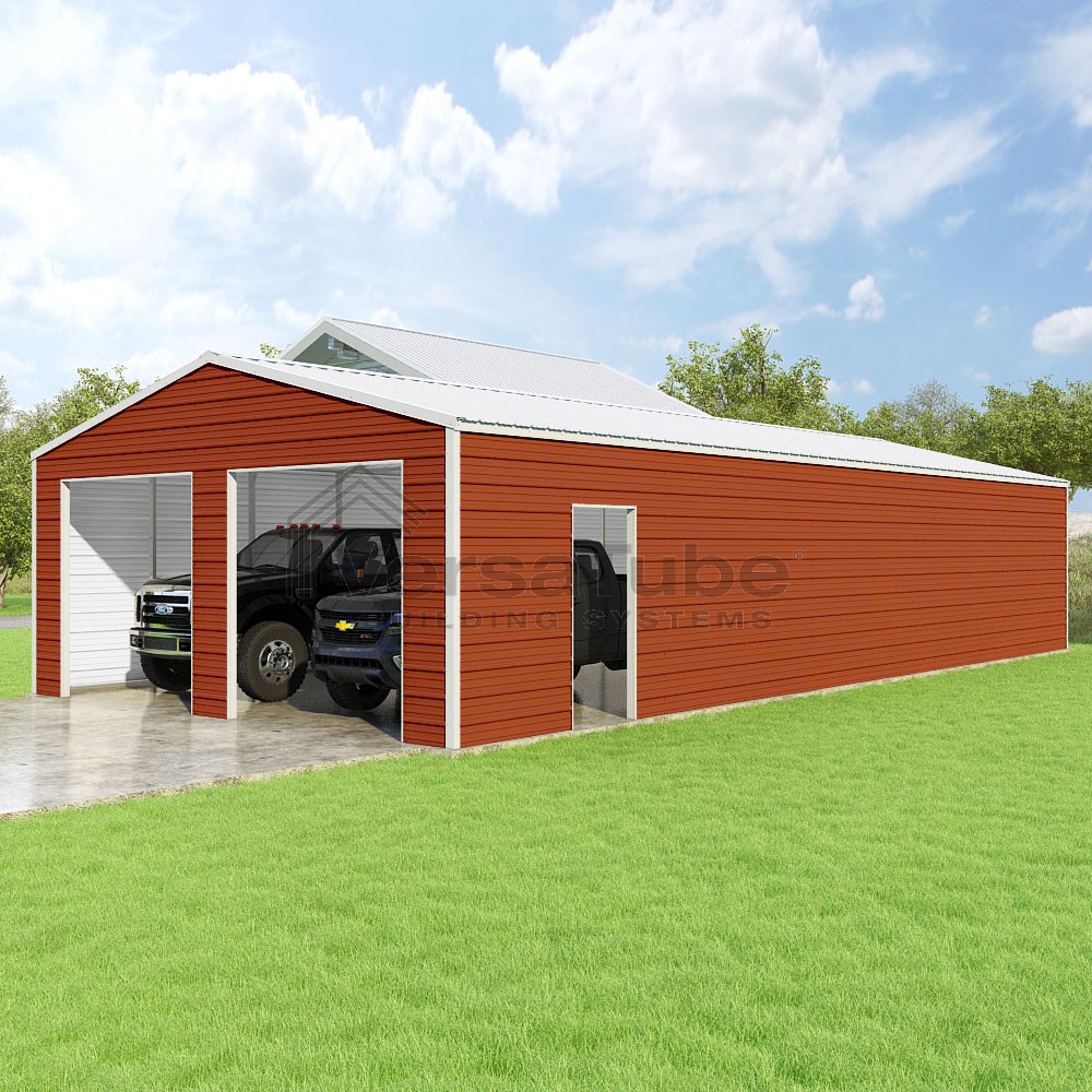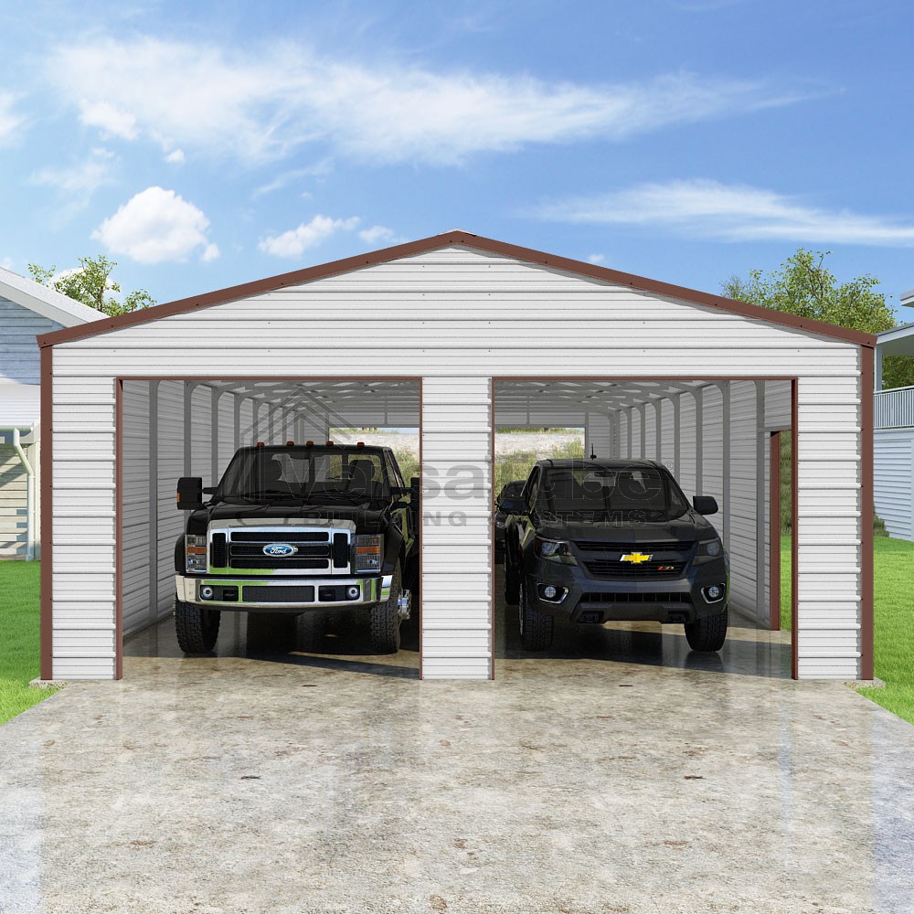 Frontier Series DIY garage kit features vertical sheet metal roof panels with horizontal siding panels..
