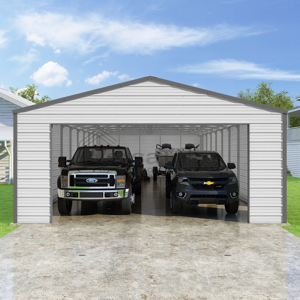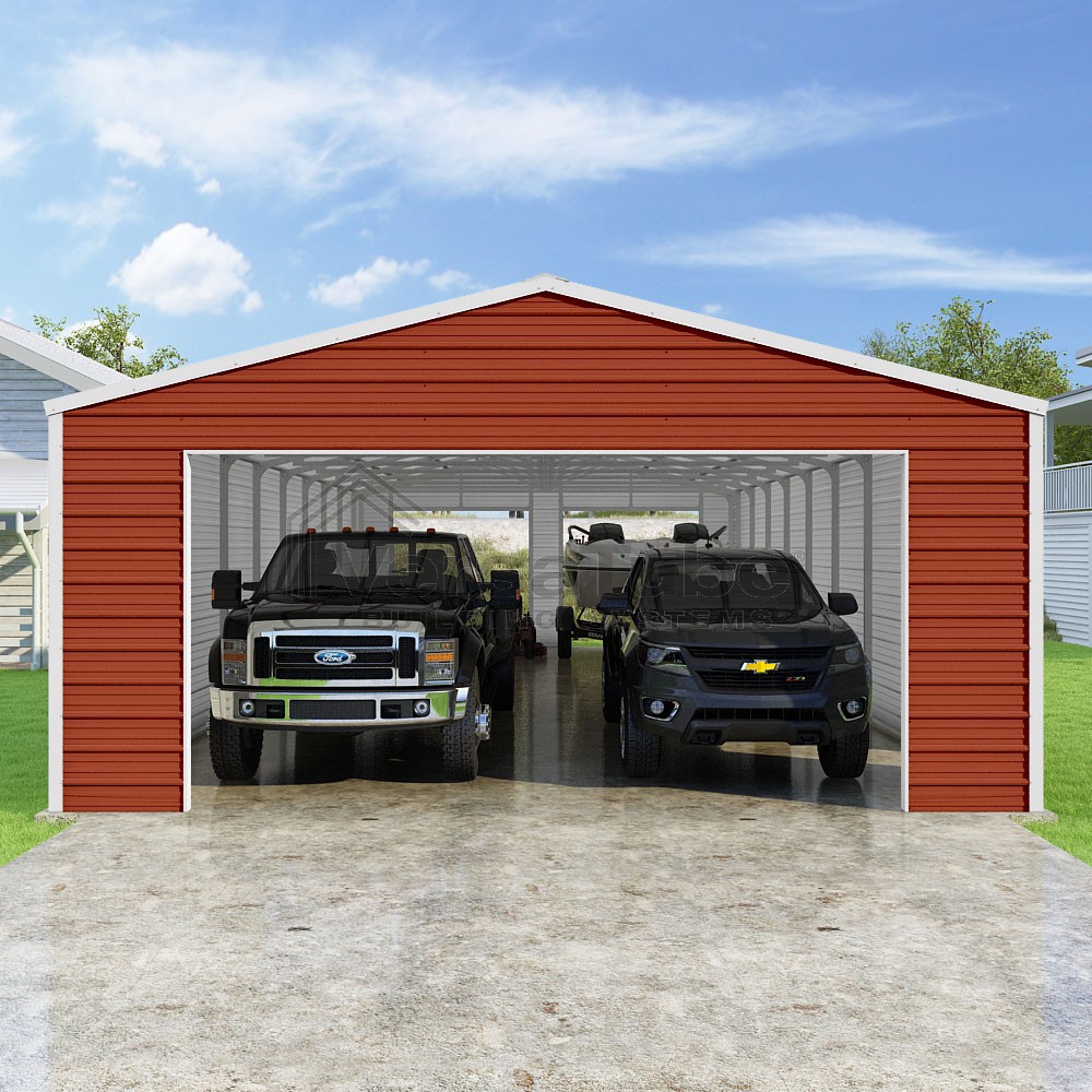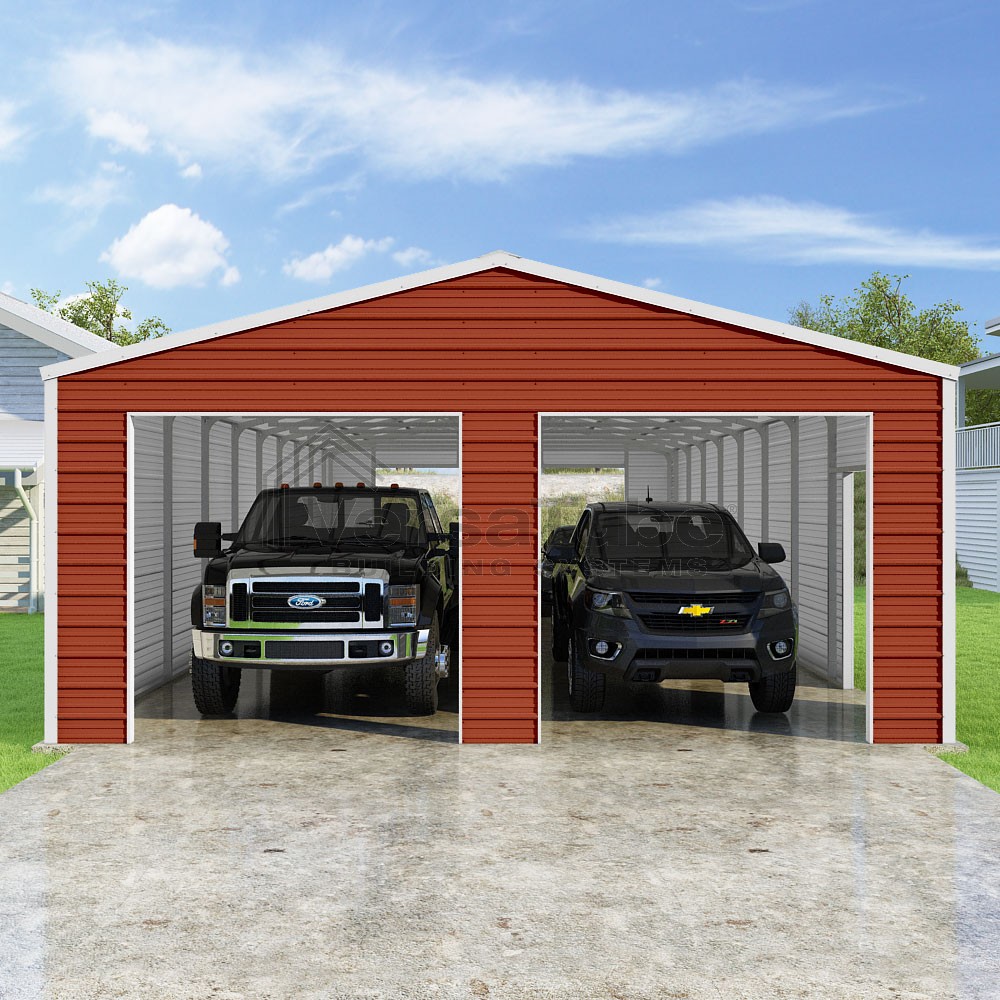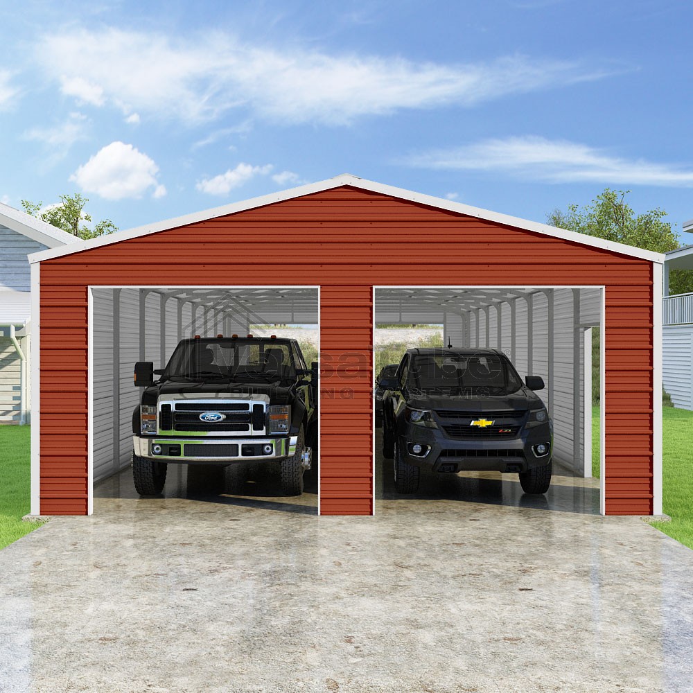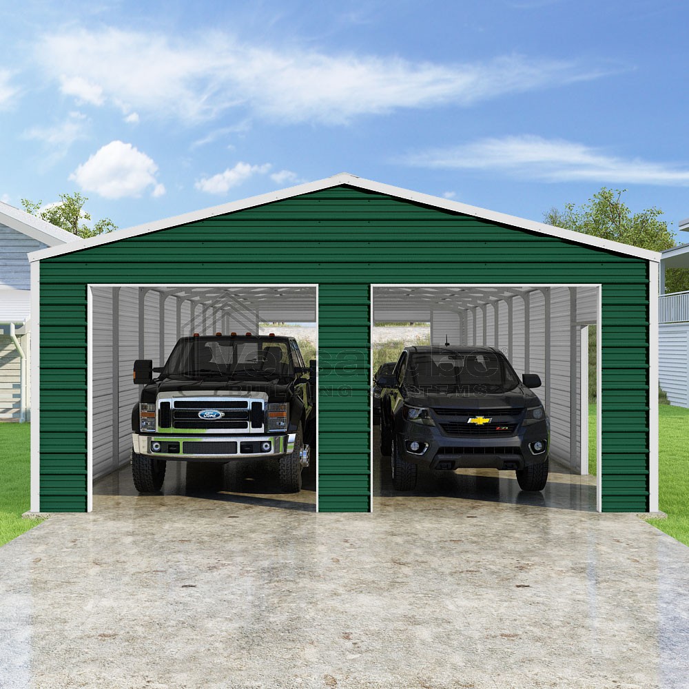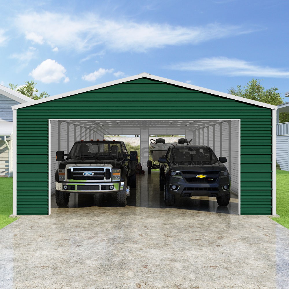 Frontier Series DIY garage kit features vertical sheet metal roof panels with horizontal siding panels..