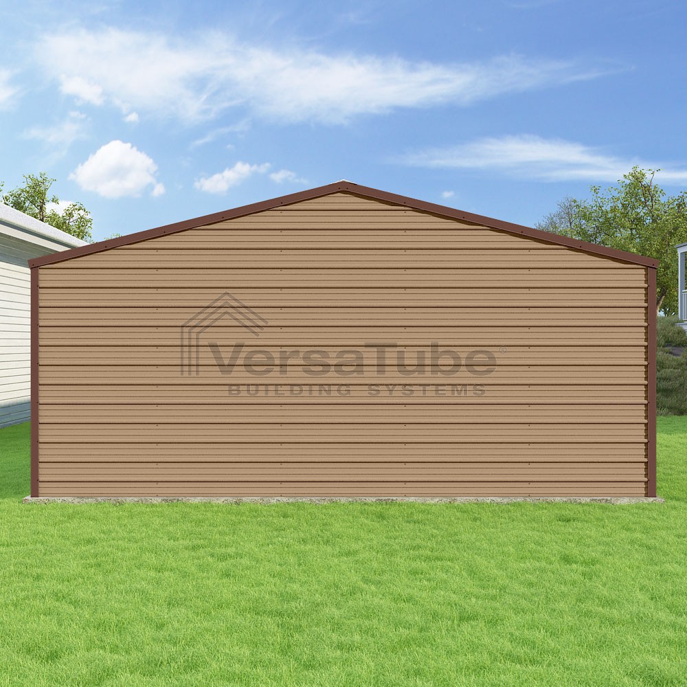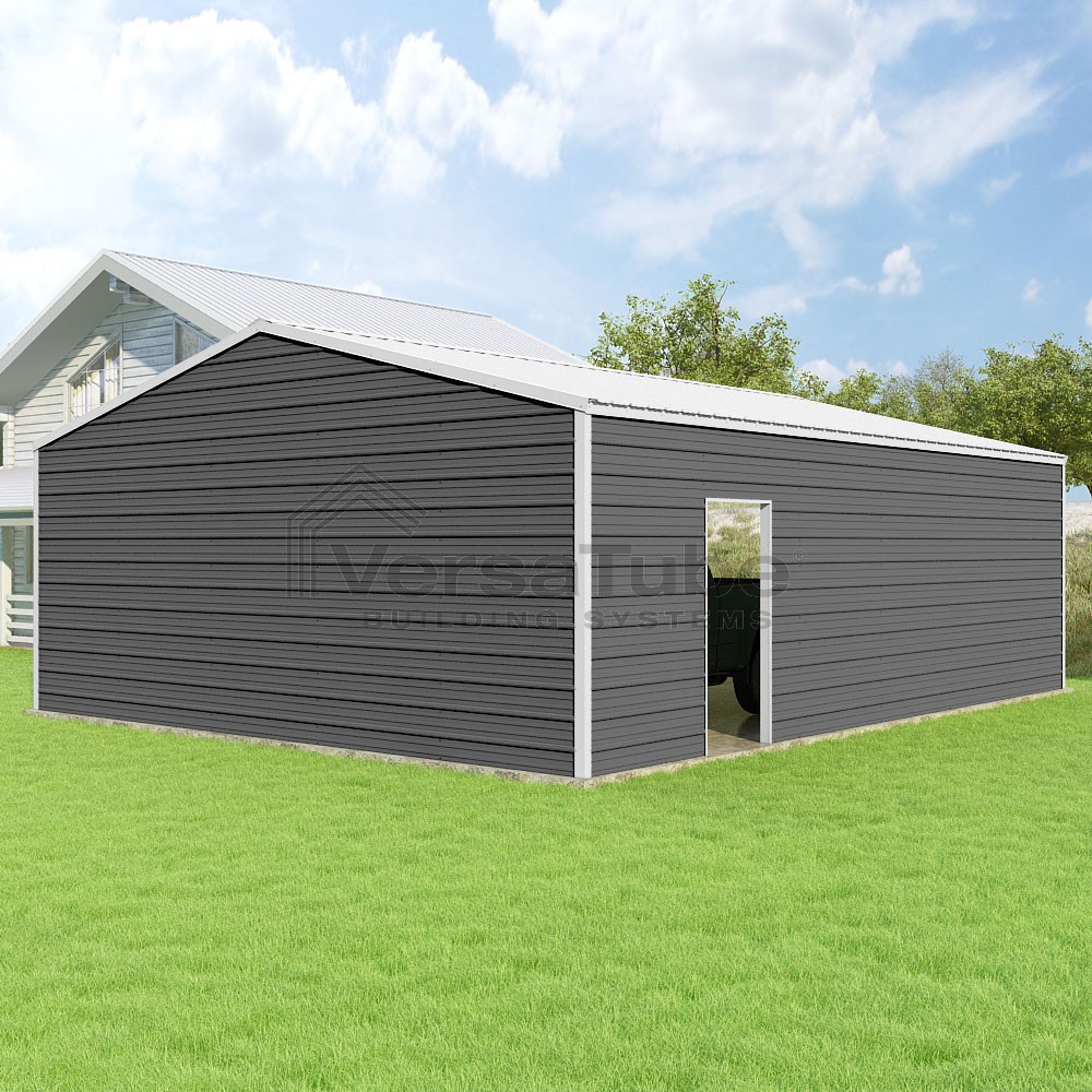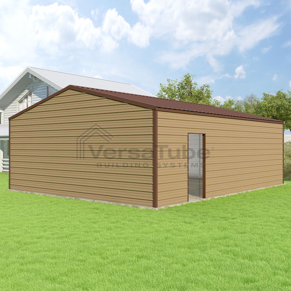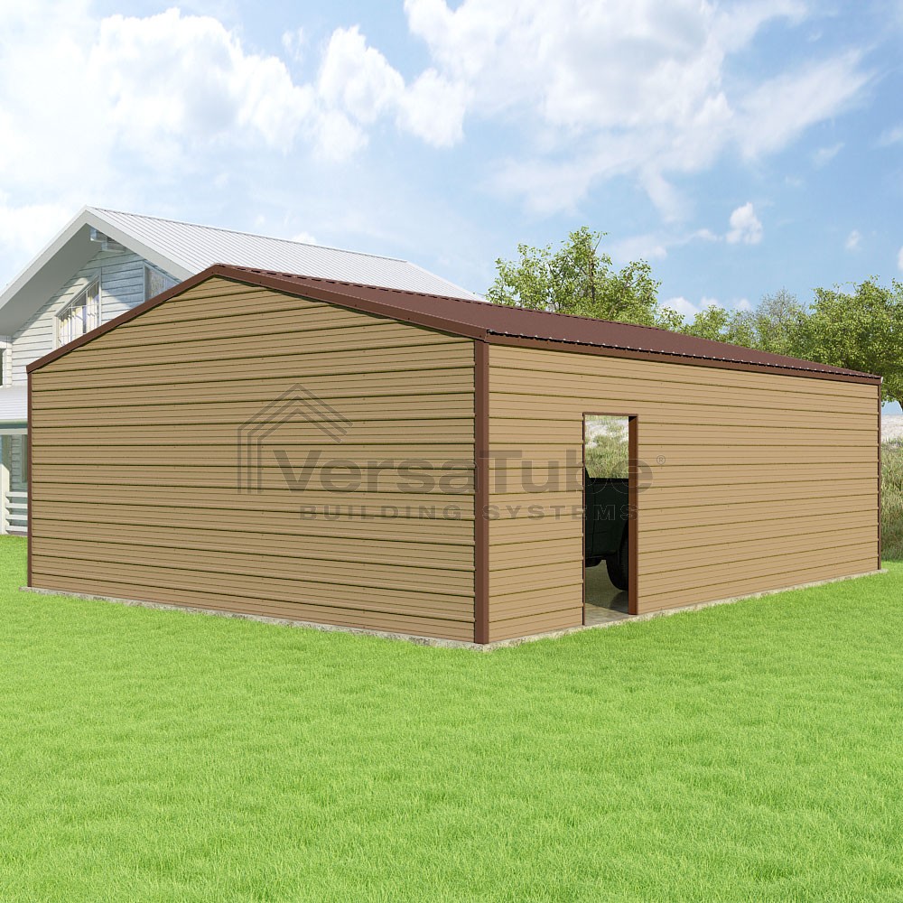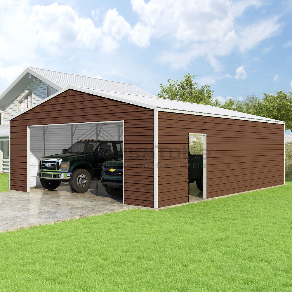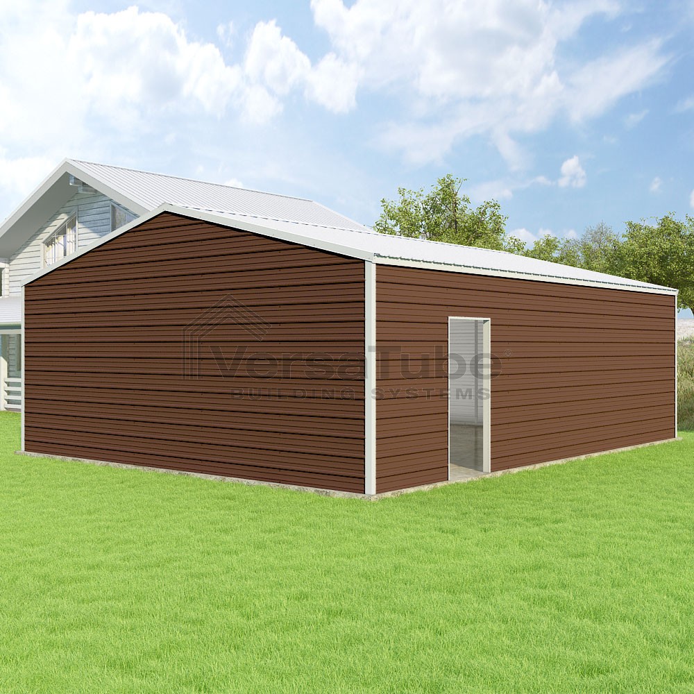 Frontier Series DIY garage kit features vertical sheet metal roof panels with horizontal siding panels..