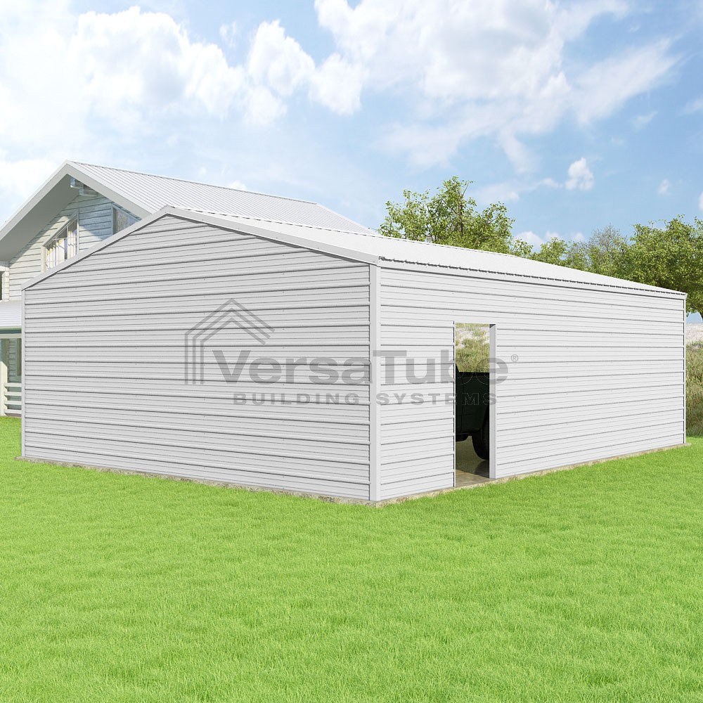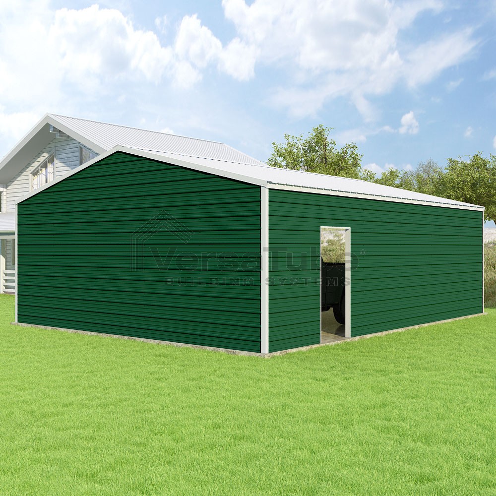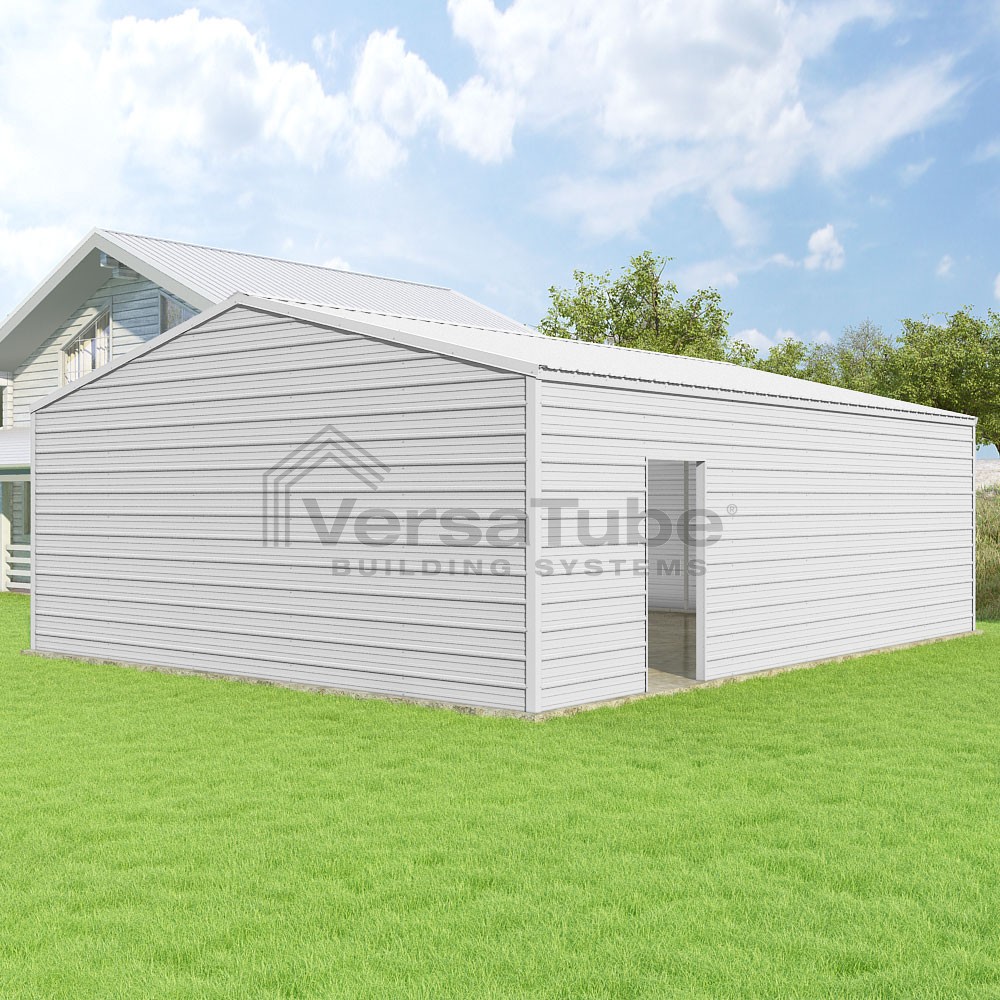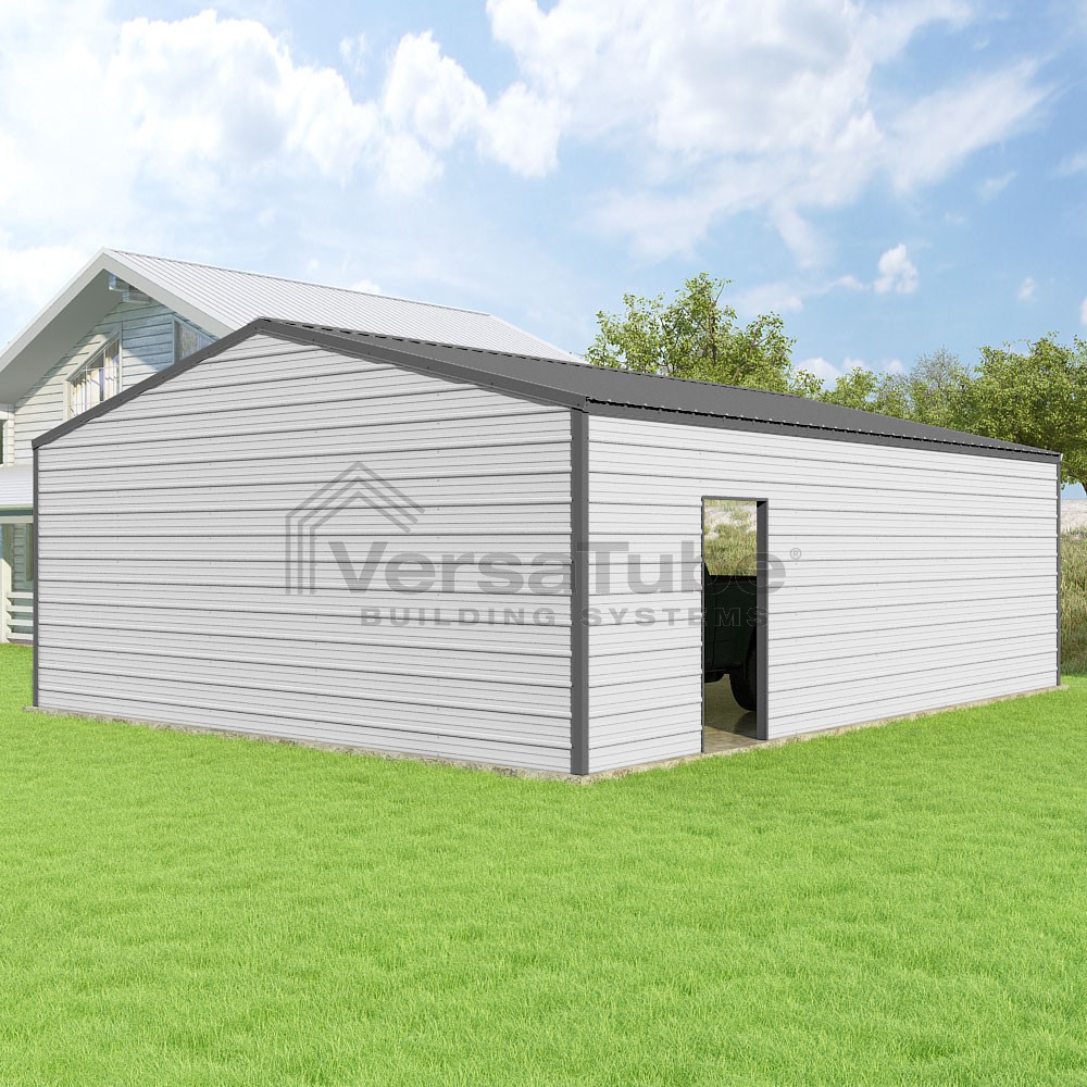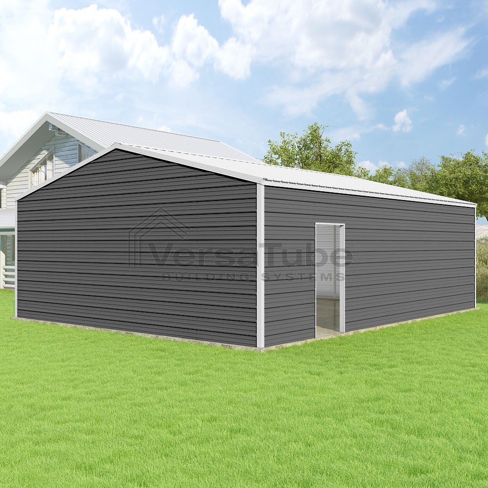 Frontier Series DIY garage kit features vertical sheet metal roof panels with horizontal siding panels..