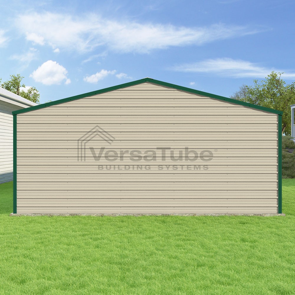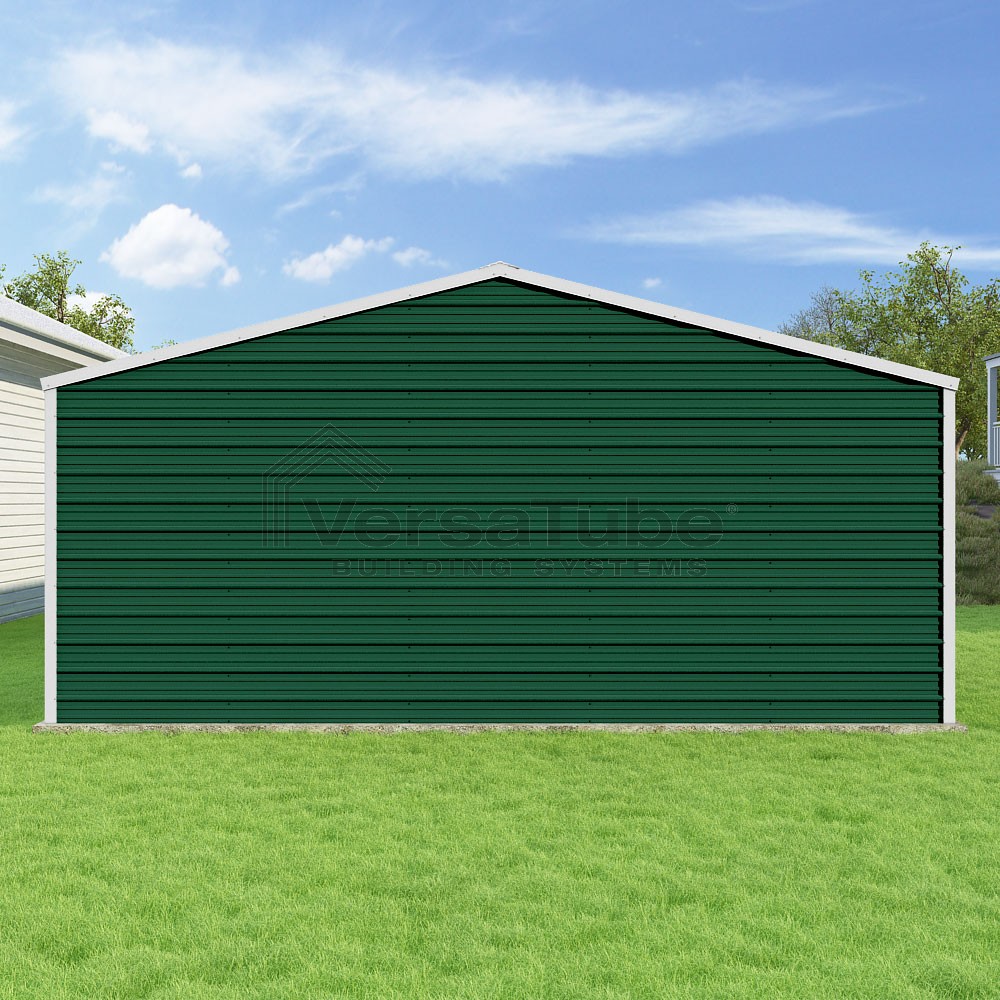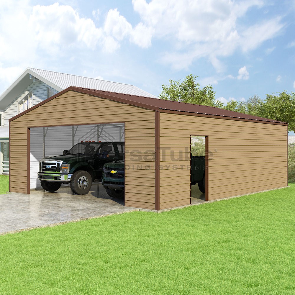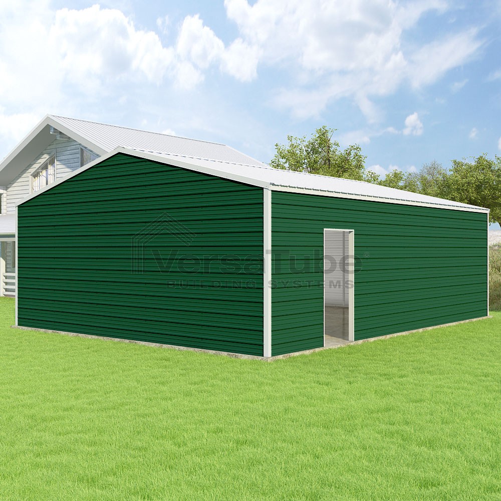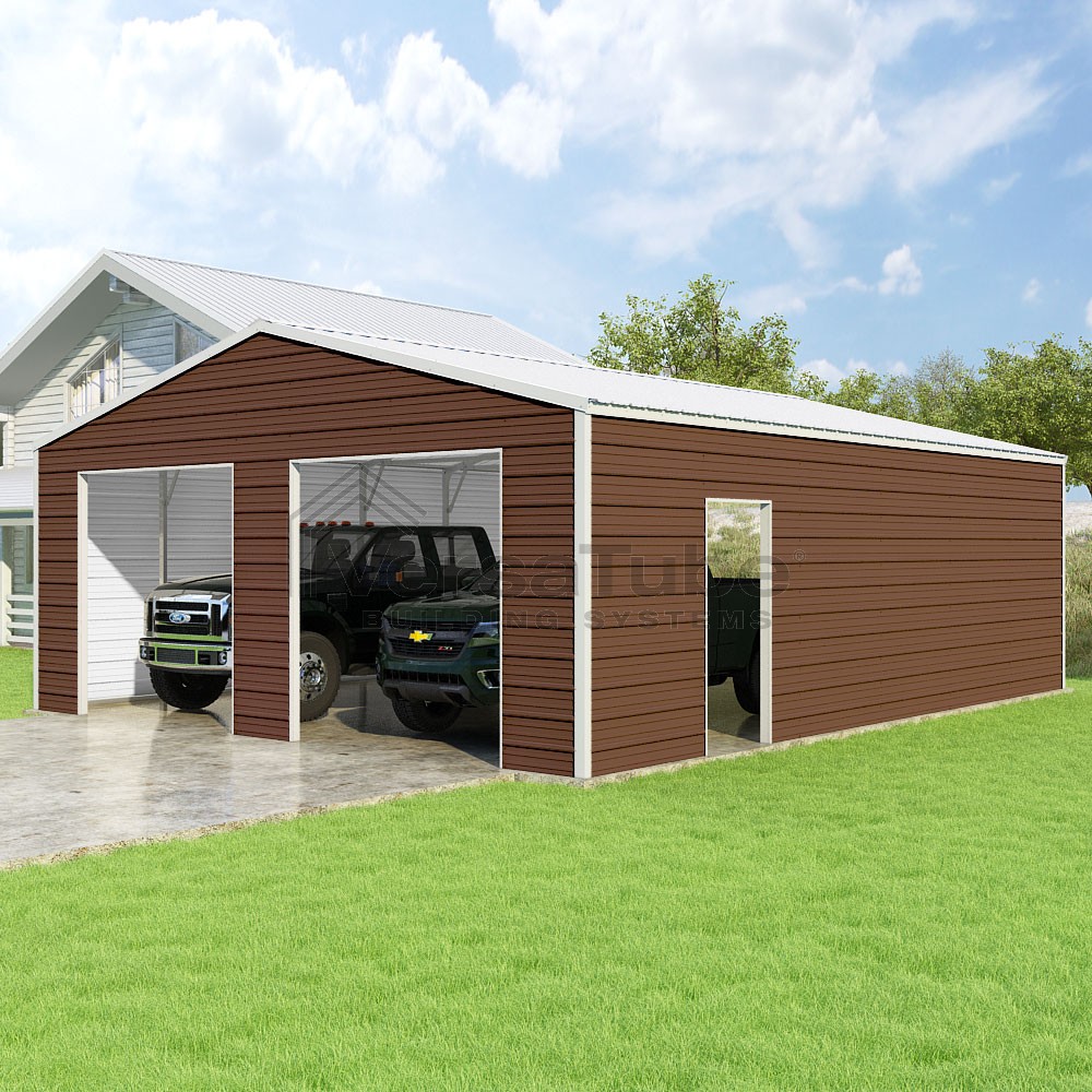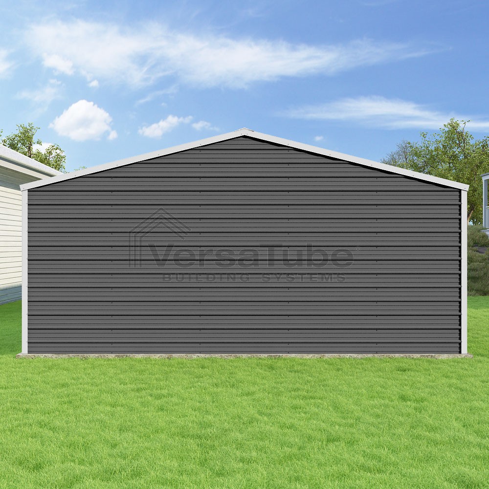 Frontier Series DIY garage kit features vertical sheet metal roof panels with horizontal siding panels..