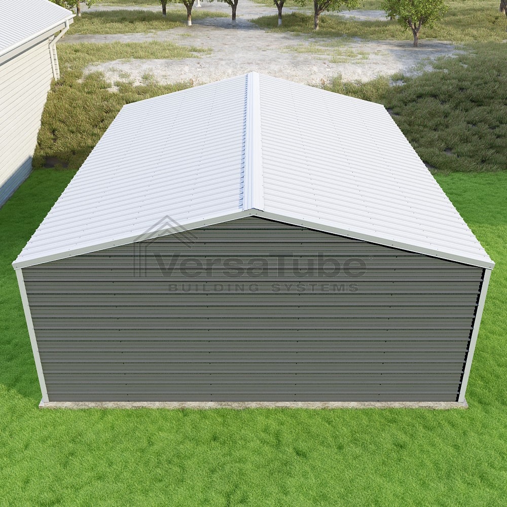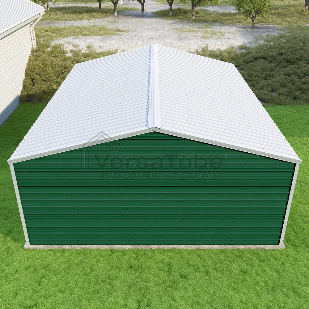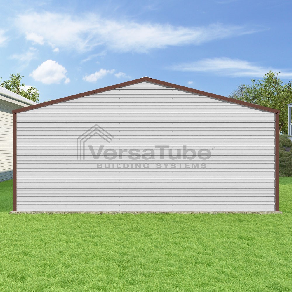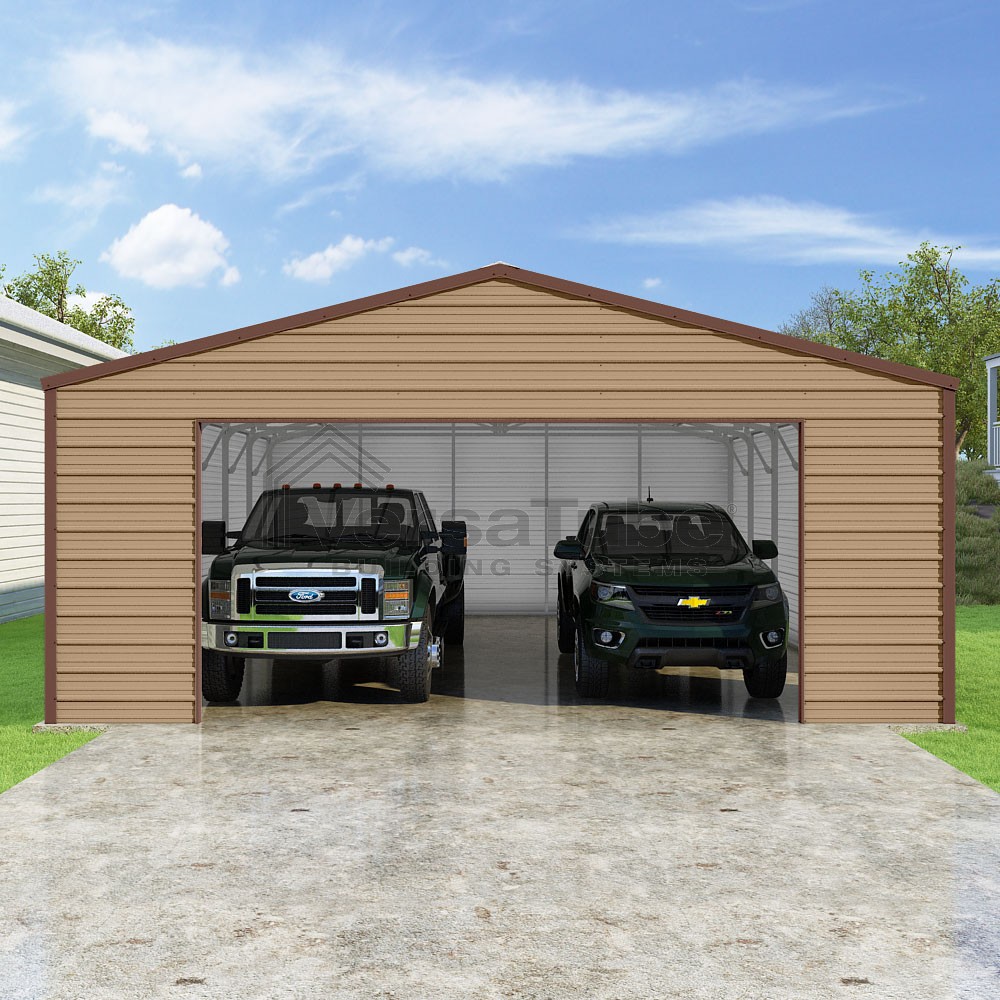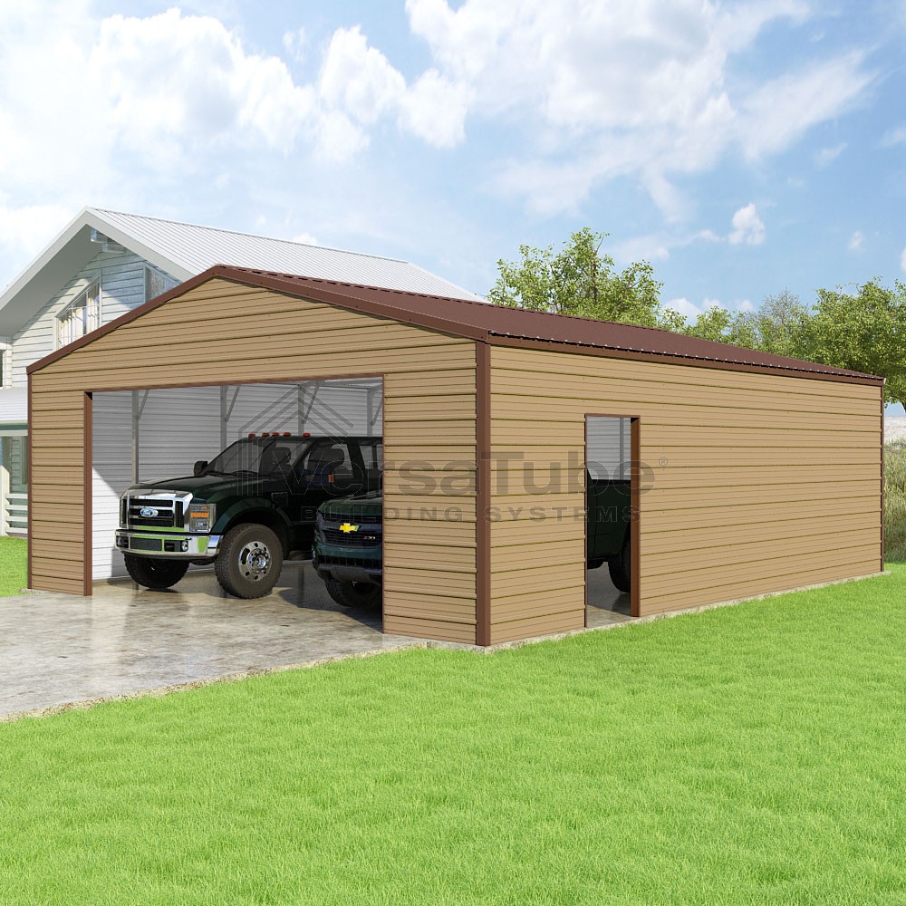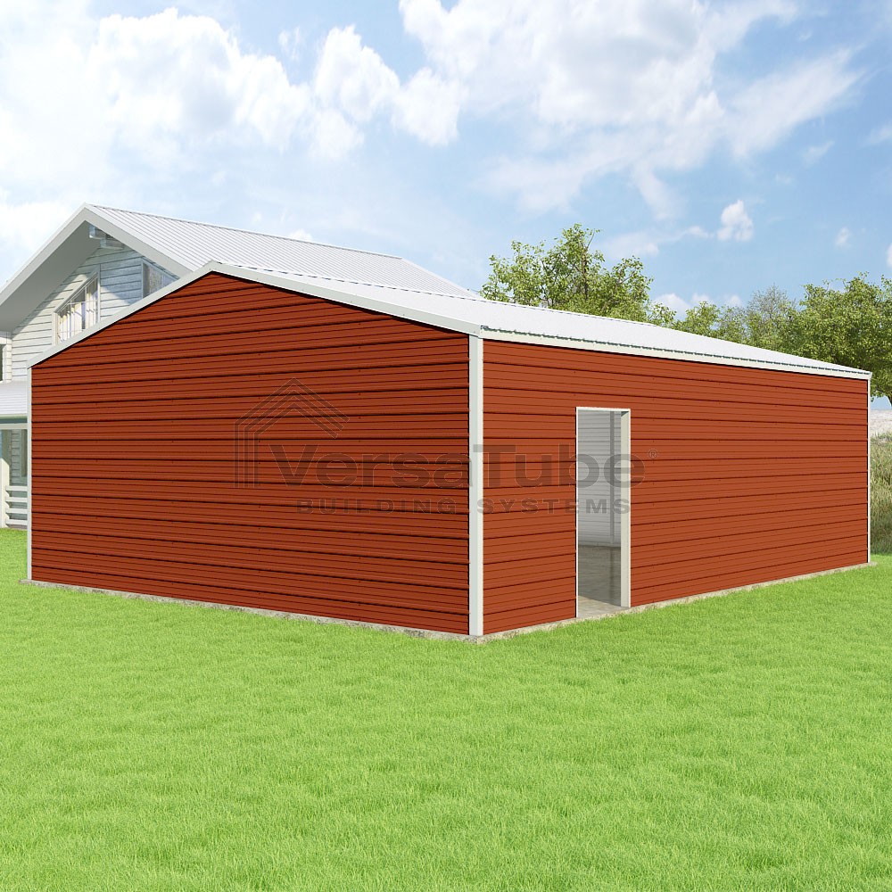 Frontier Series DIY garage kit features vertical sheet metal roof panels with horizontal siding panels..
