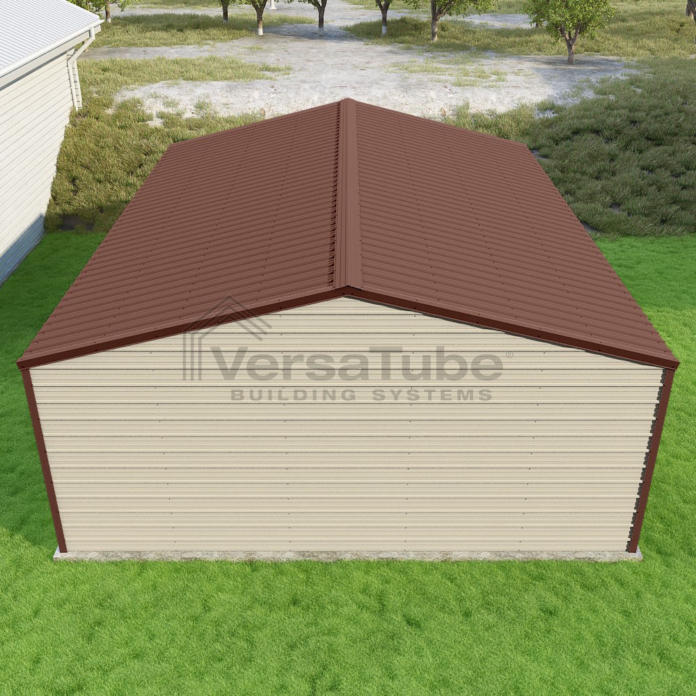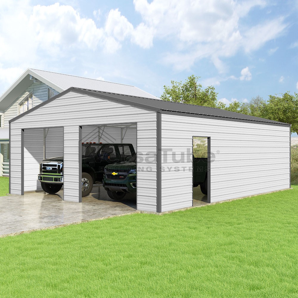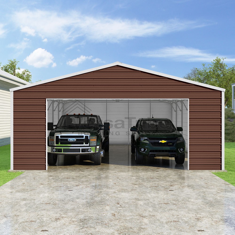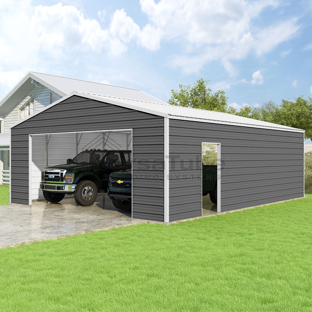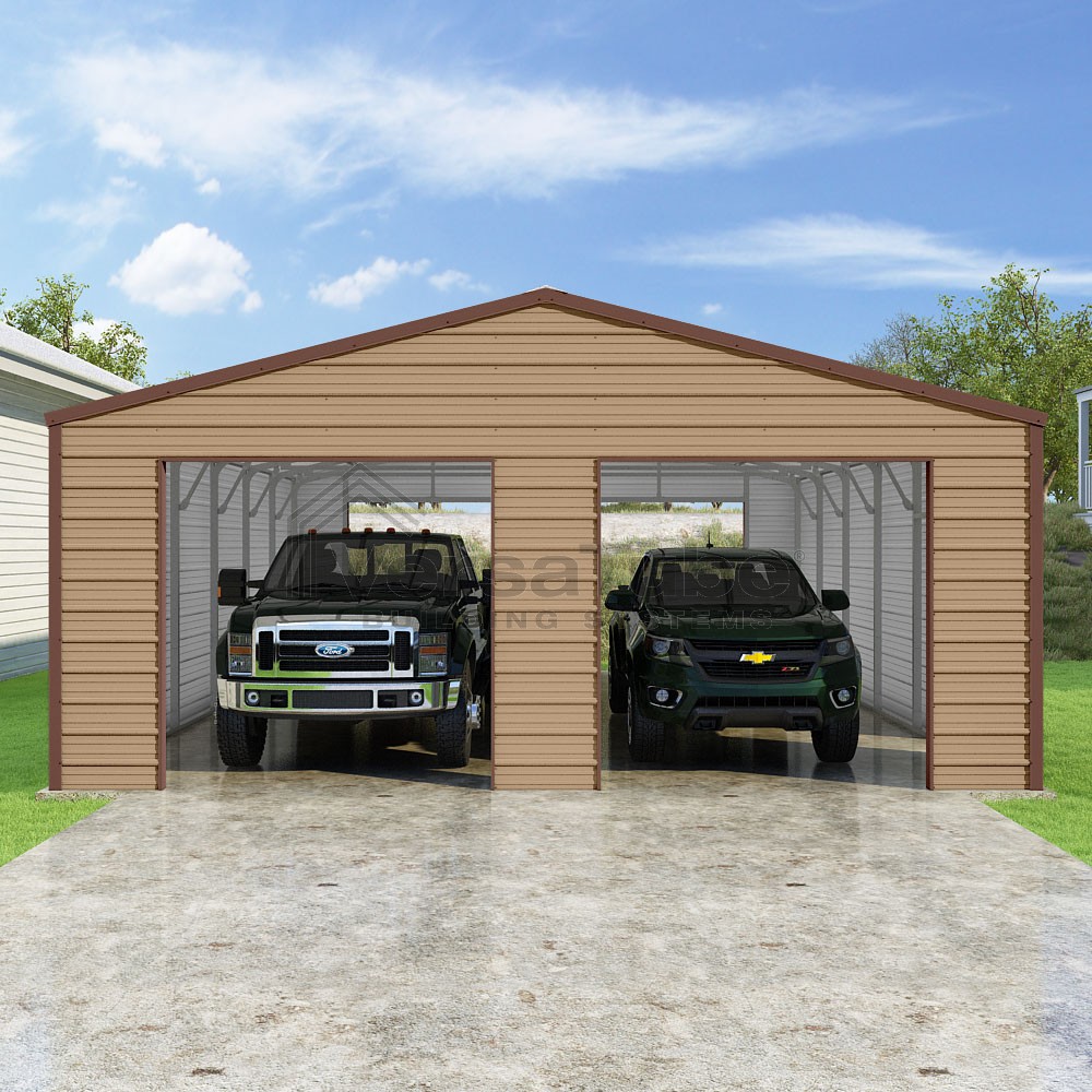 Frontier Series DIY garage kit features vertical sheet metal roof panels with horizontal siding panels..
