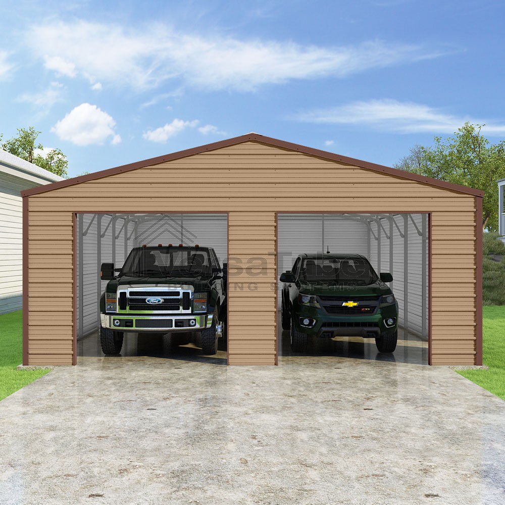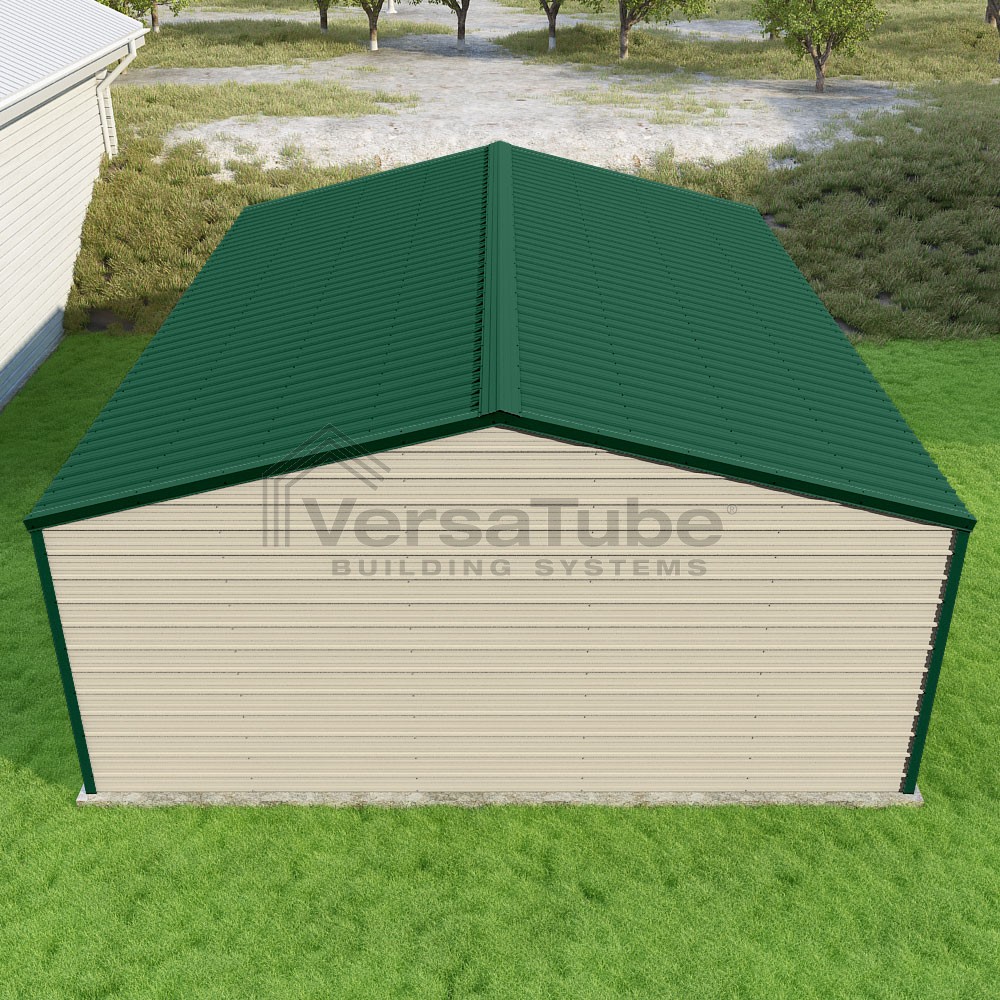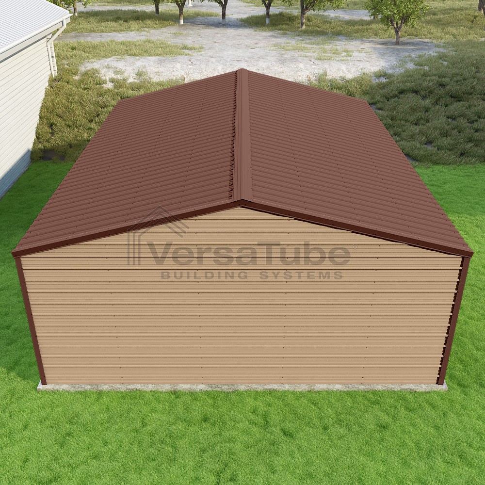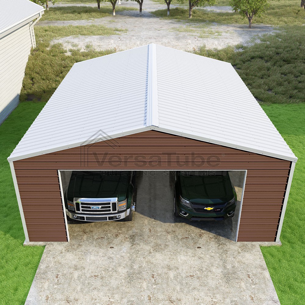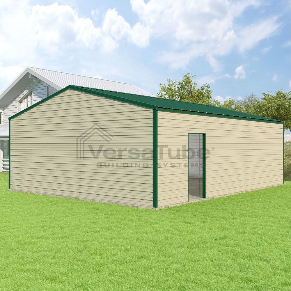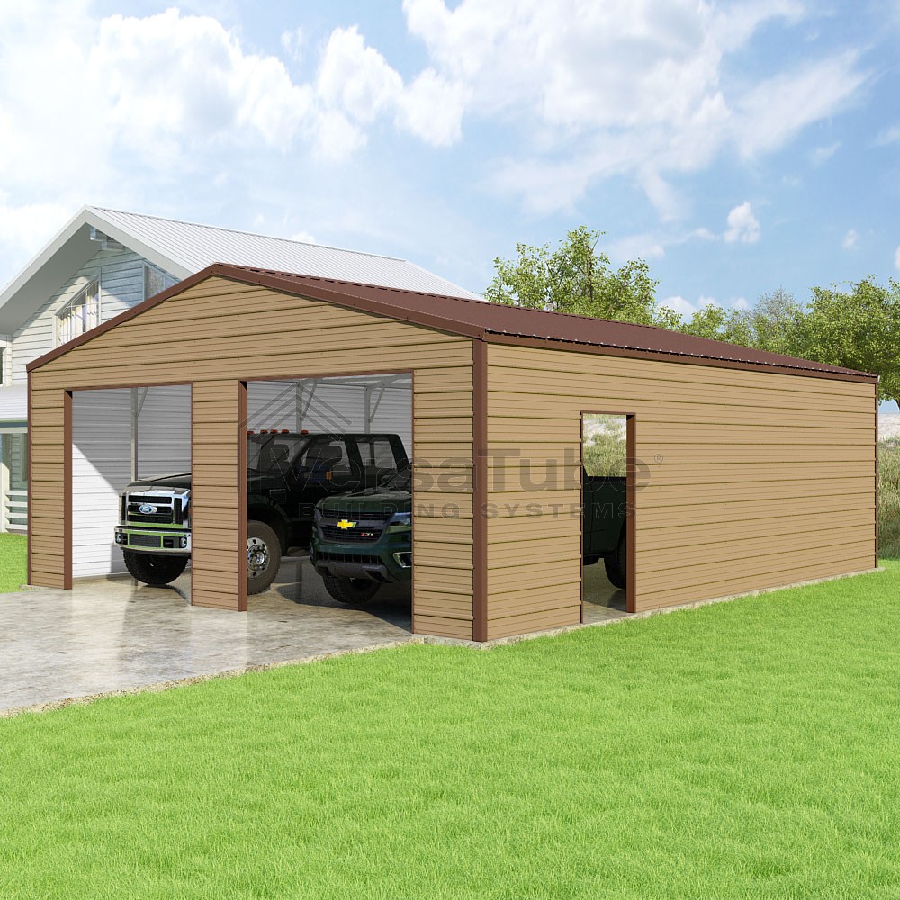 Frontier Series DIY garage kit features vertical sheet metal roof panels with horizontal siding panels..