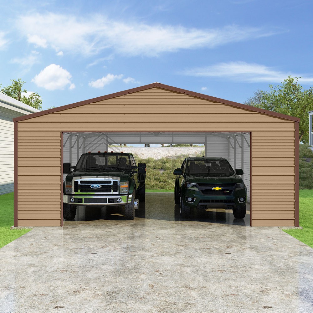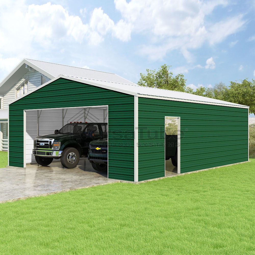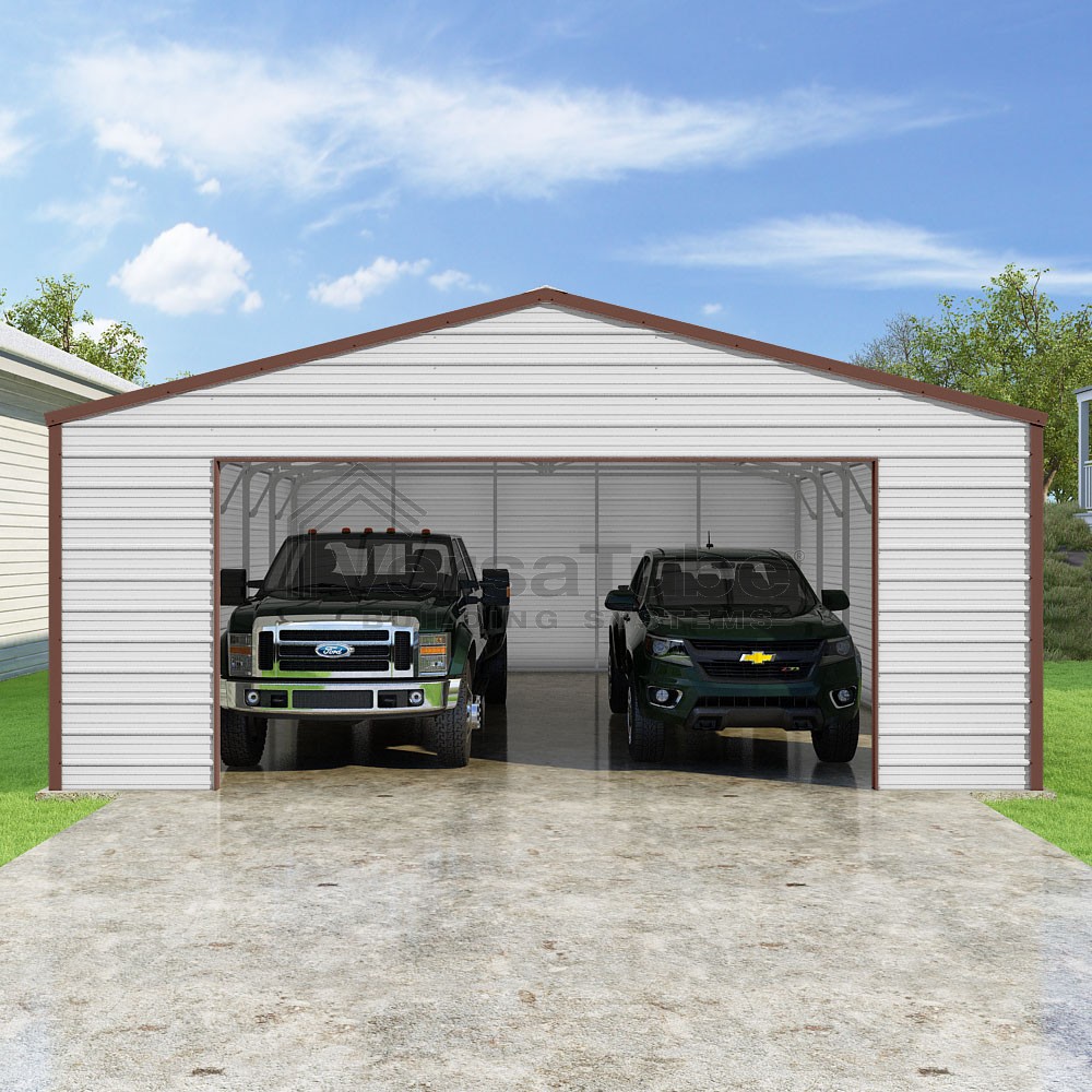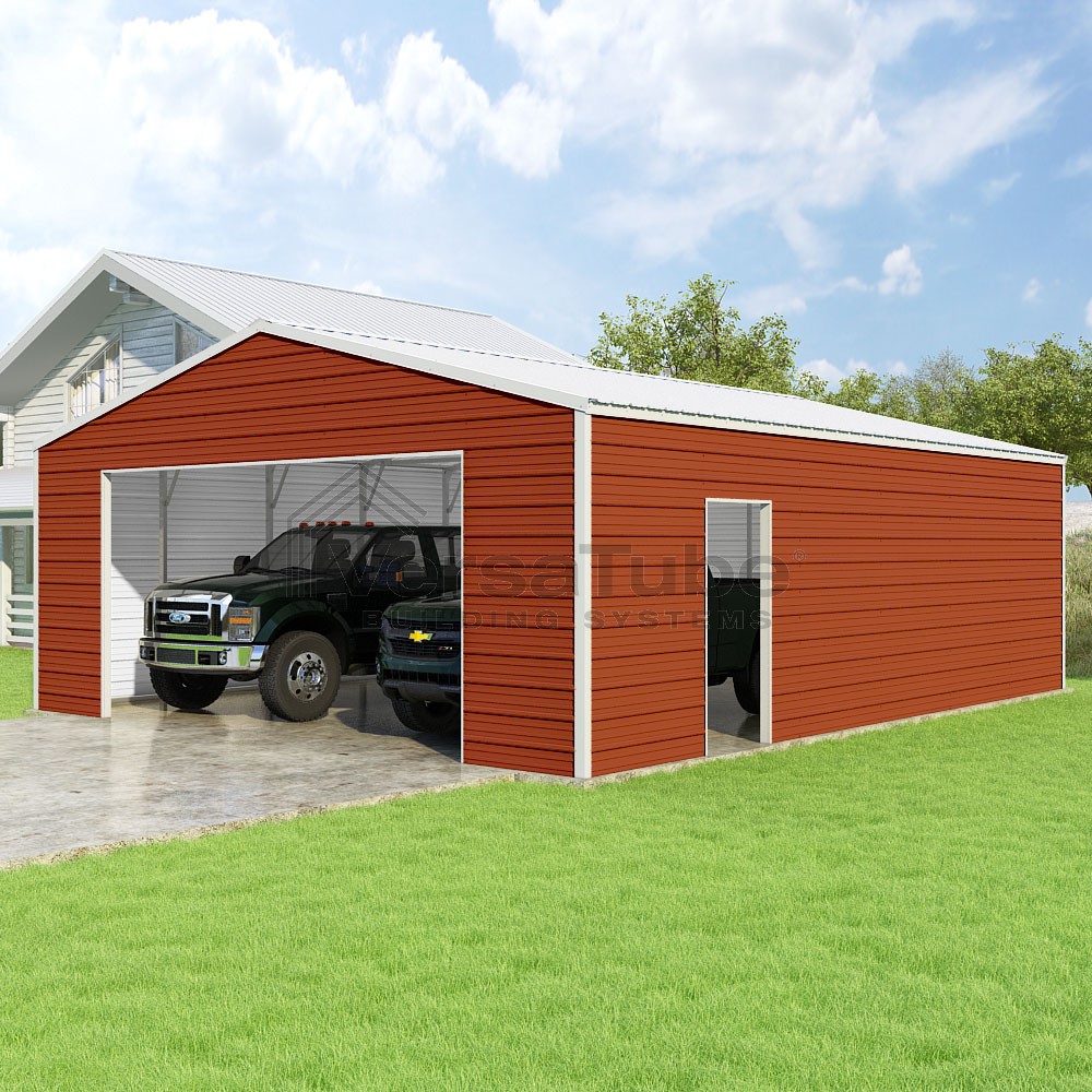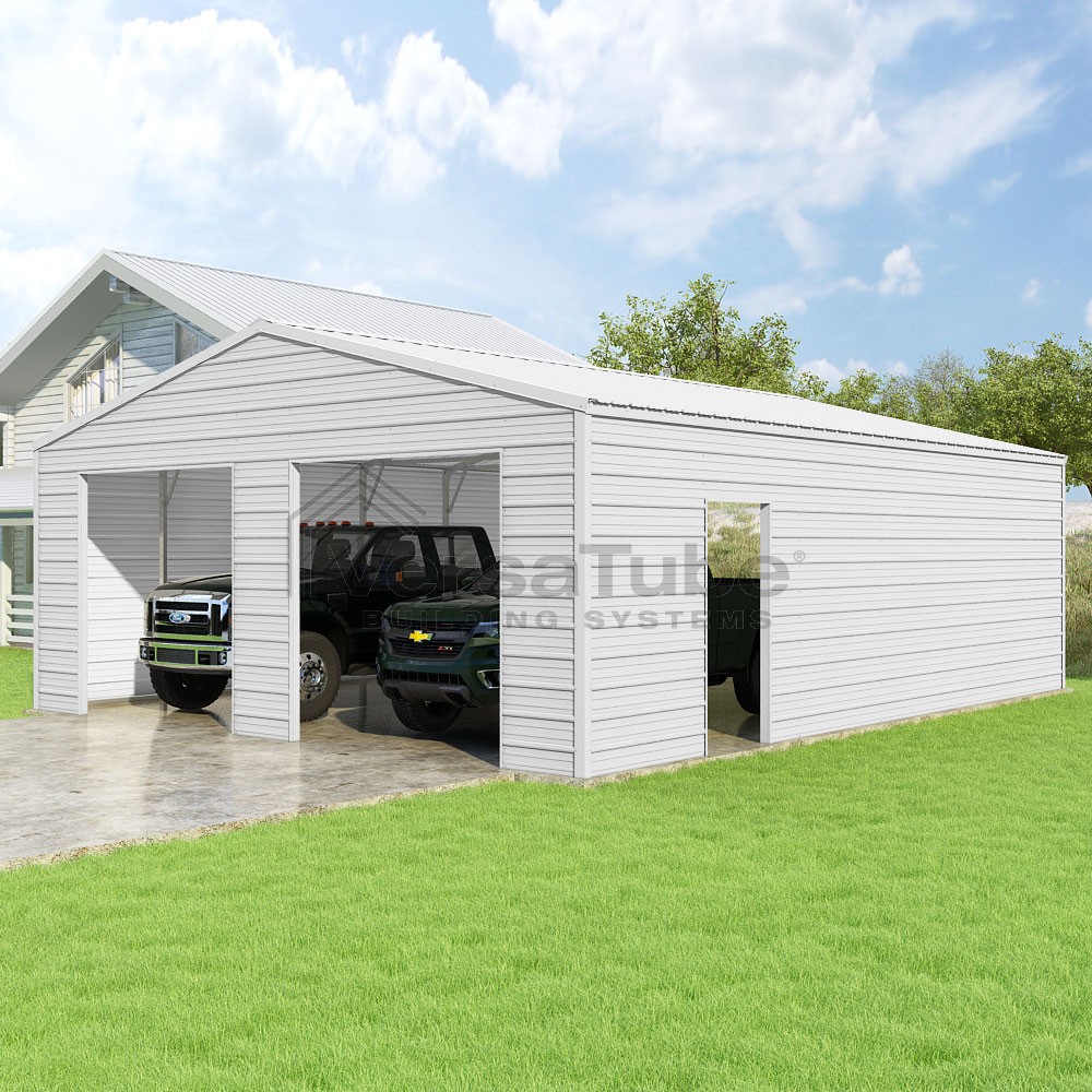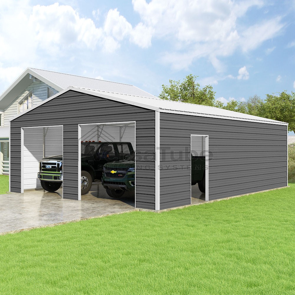 Frontier Series DIY garage kit features vertical sheet metal roof panels with horizontal siding panels..
