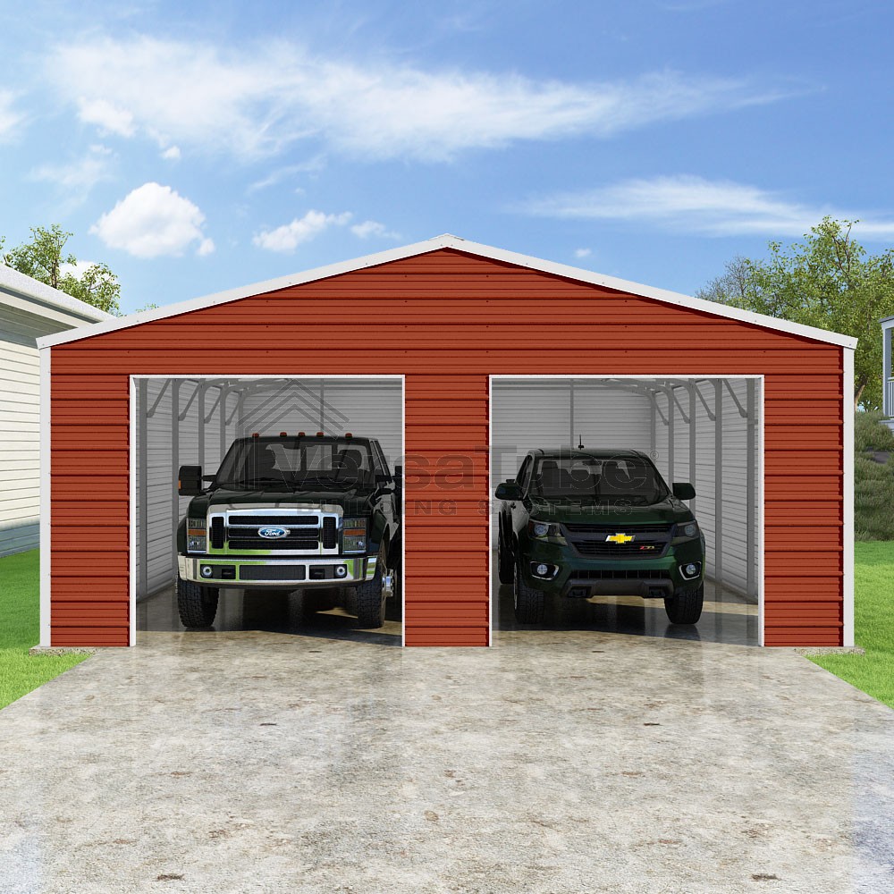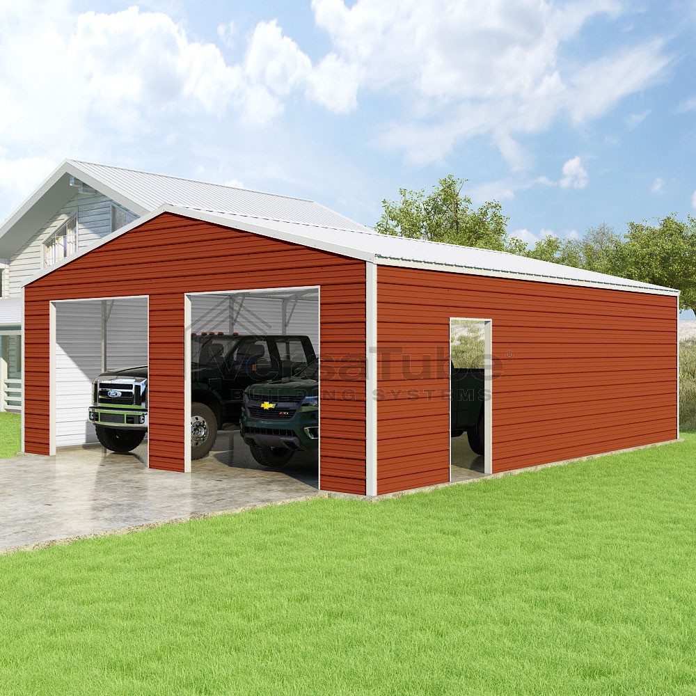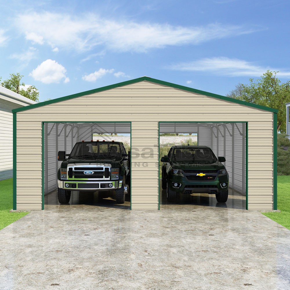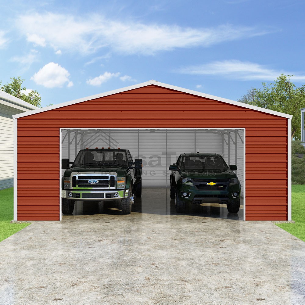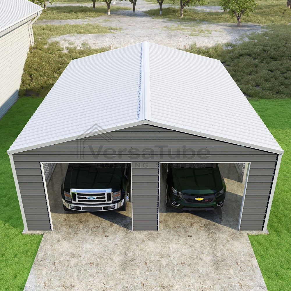 Frontier Series DIY garage kit features vertical sheet metal roof panels with horizontal siding panels..