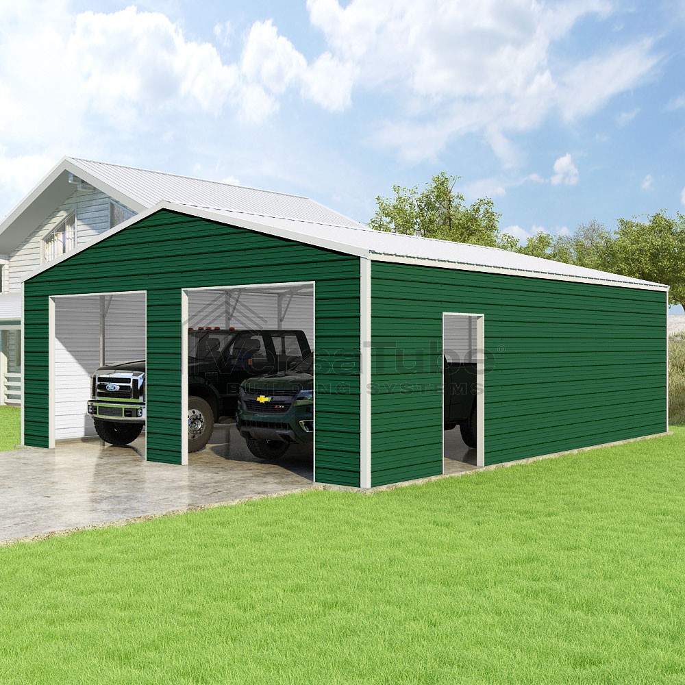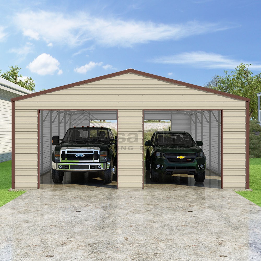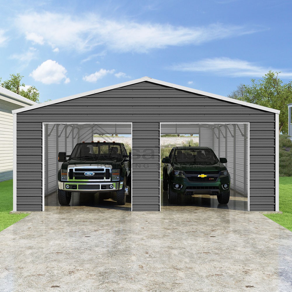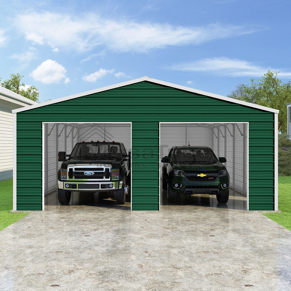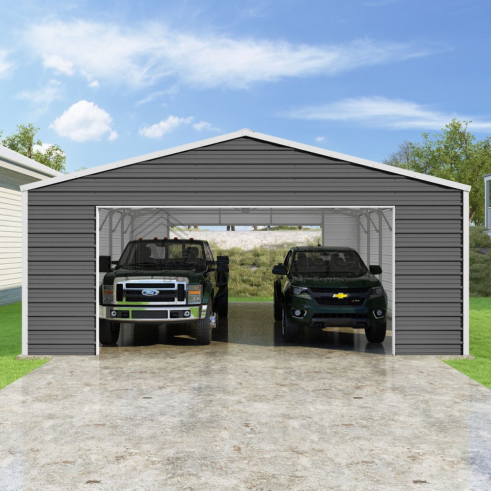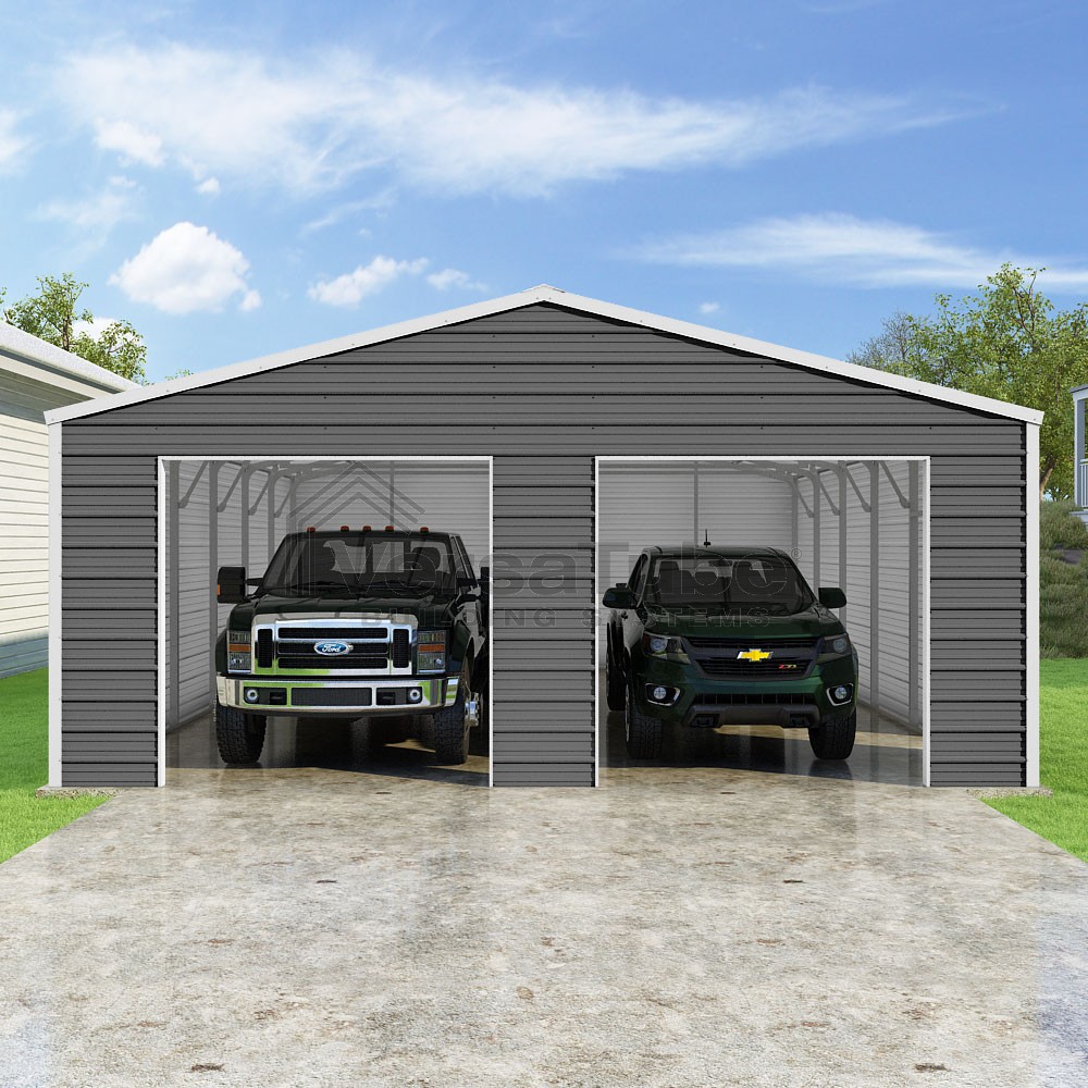 Frontier Series DIY garage kit features vertical sheet metal roof panels with horizontal siding panels..