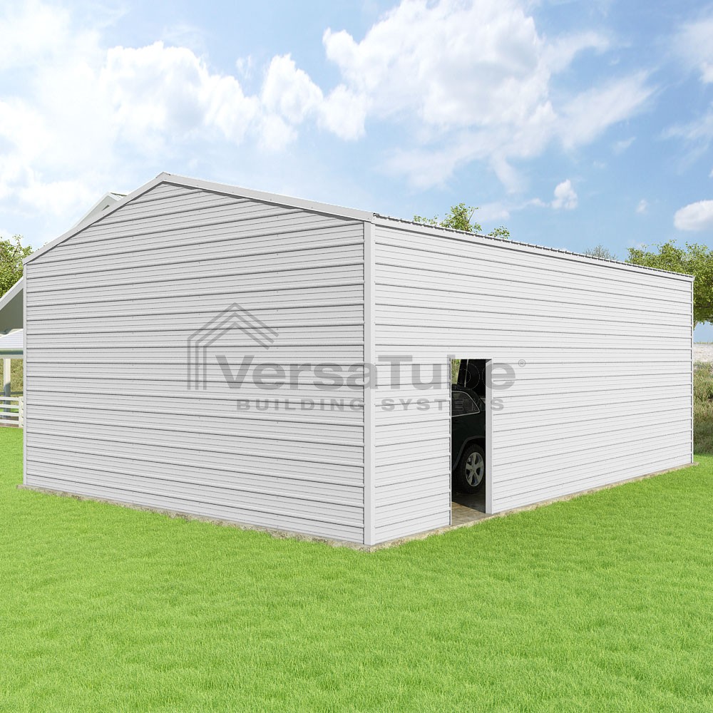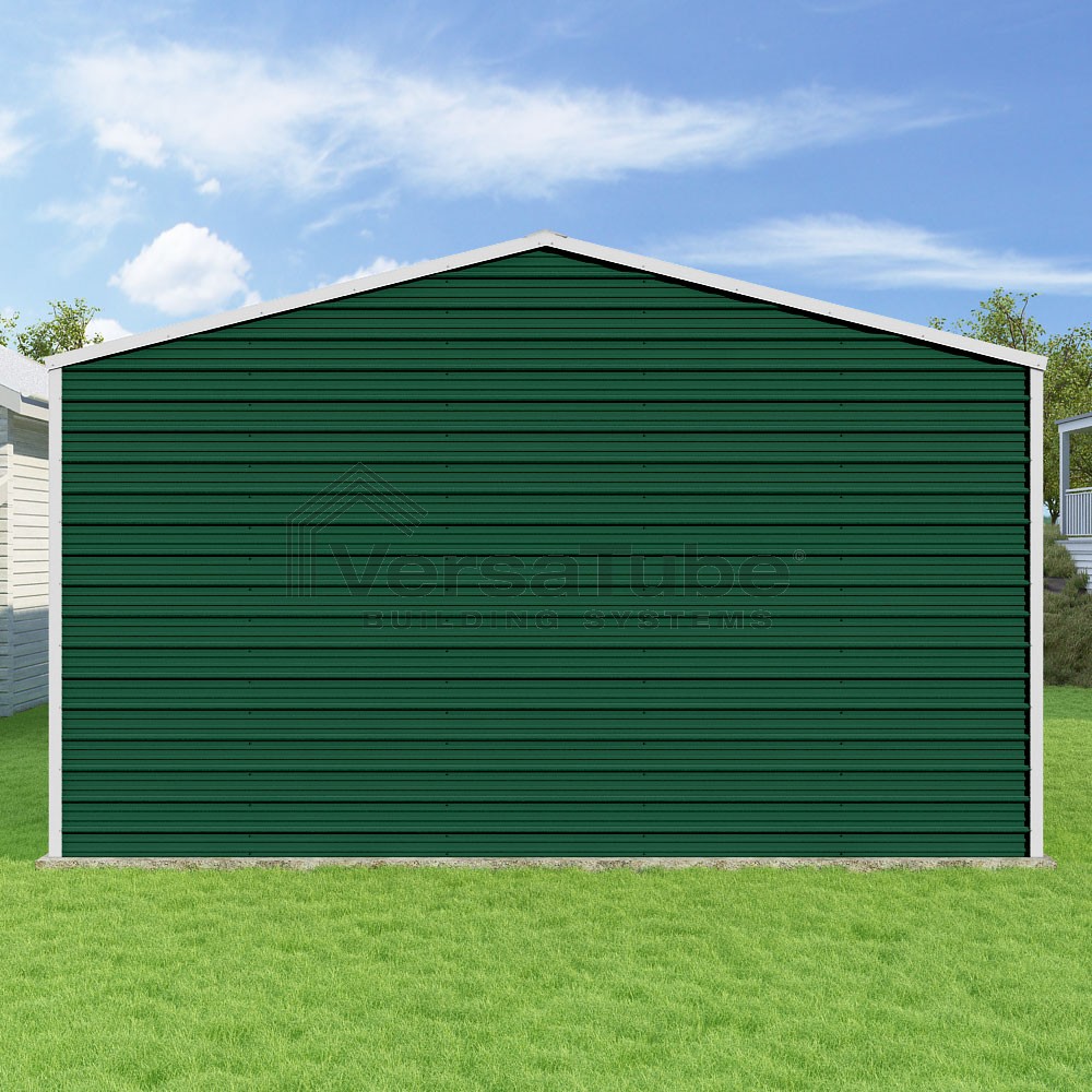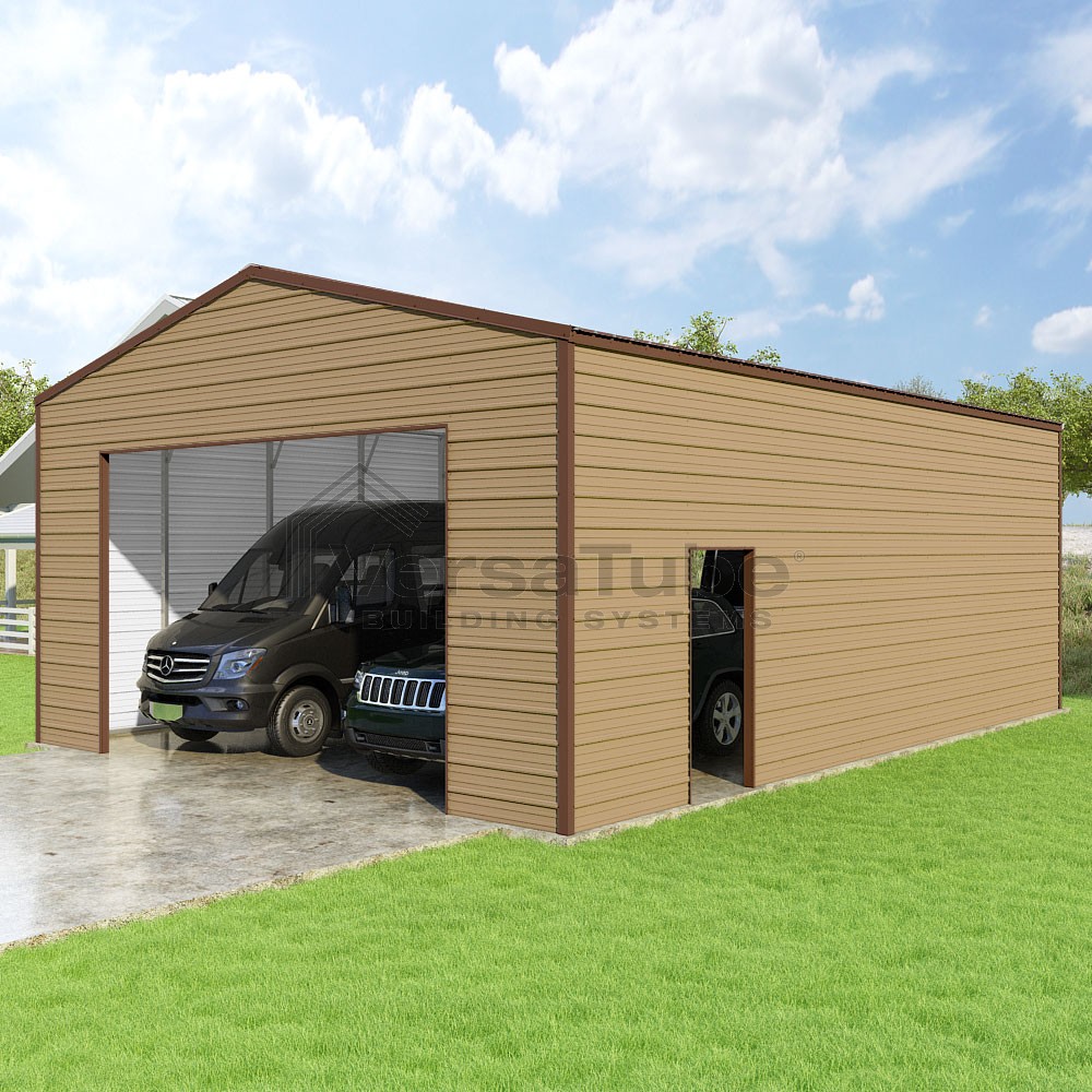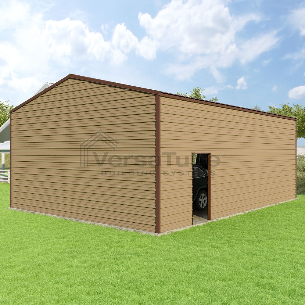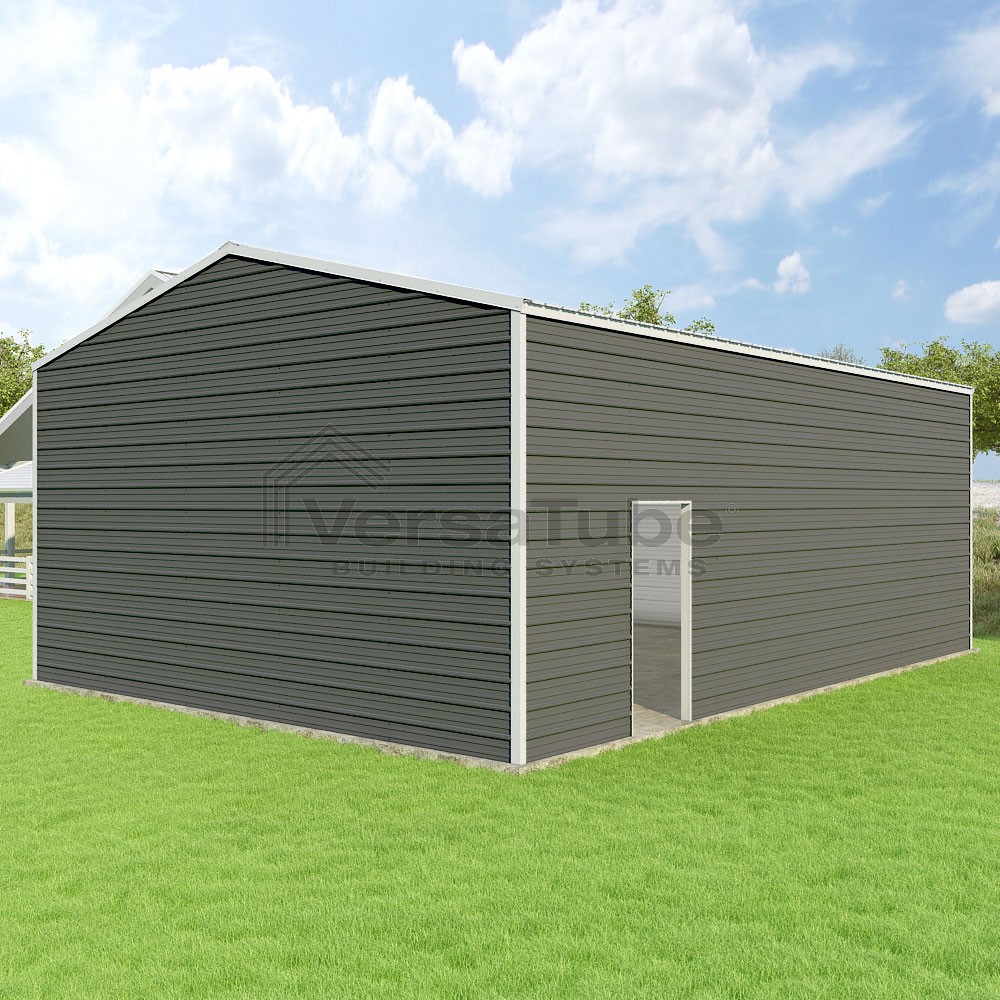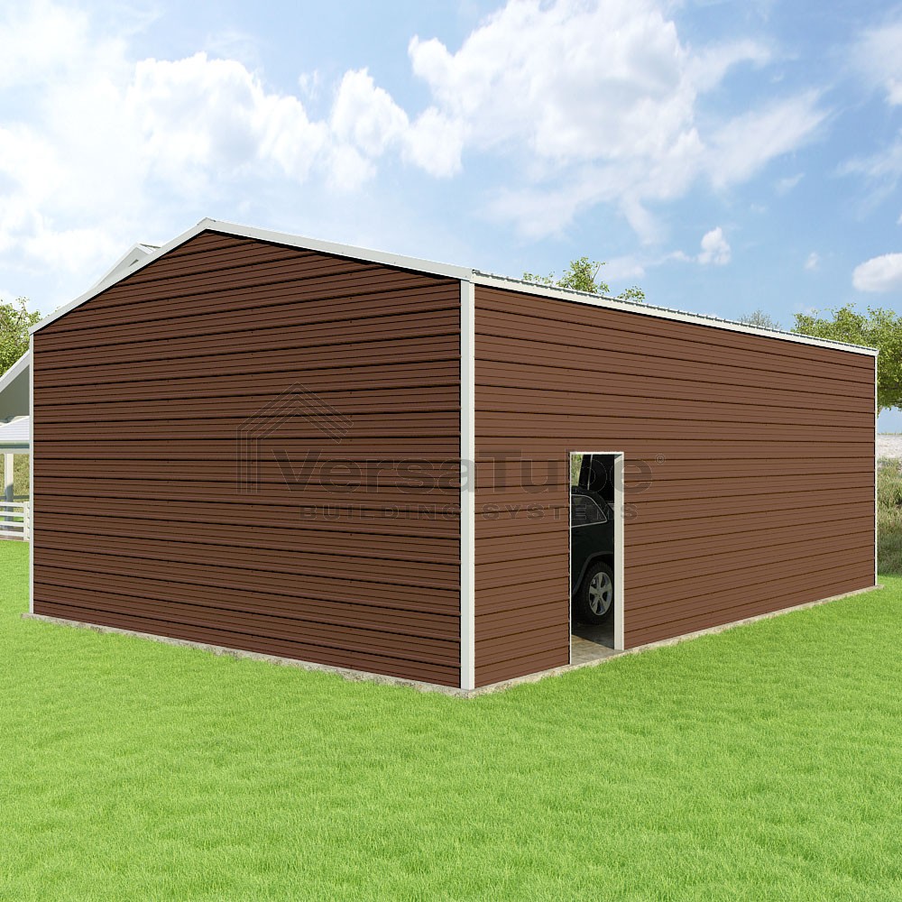 Frontier Series DIY garage kit features vertical sheet metal roof panels with horizontal siding panels..