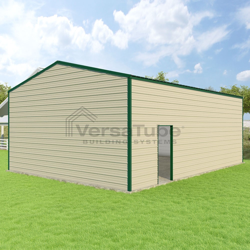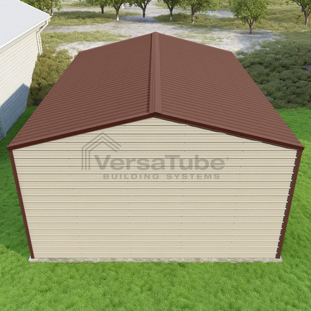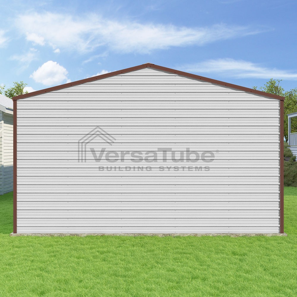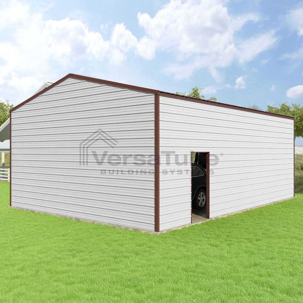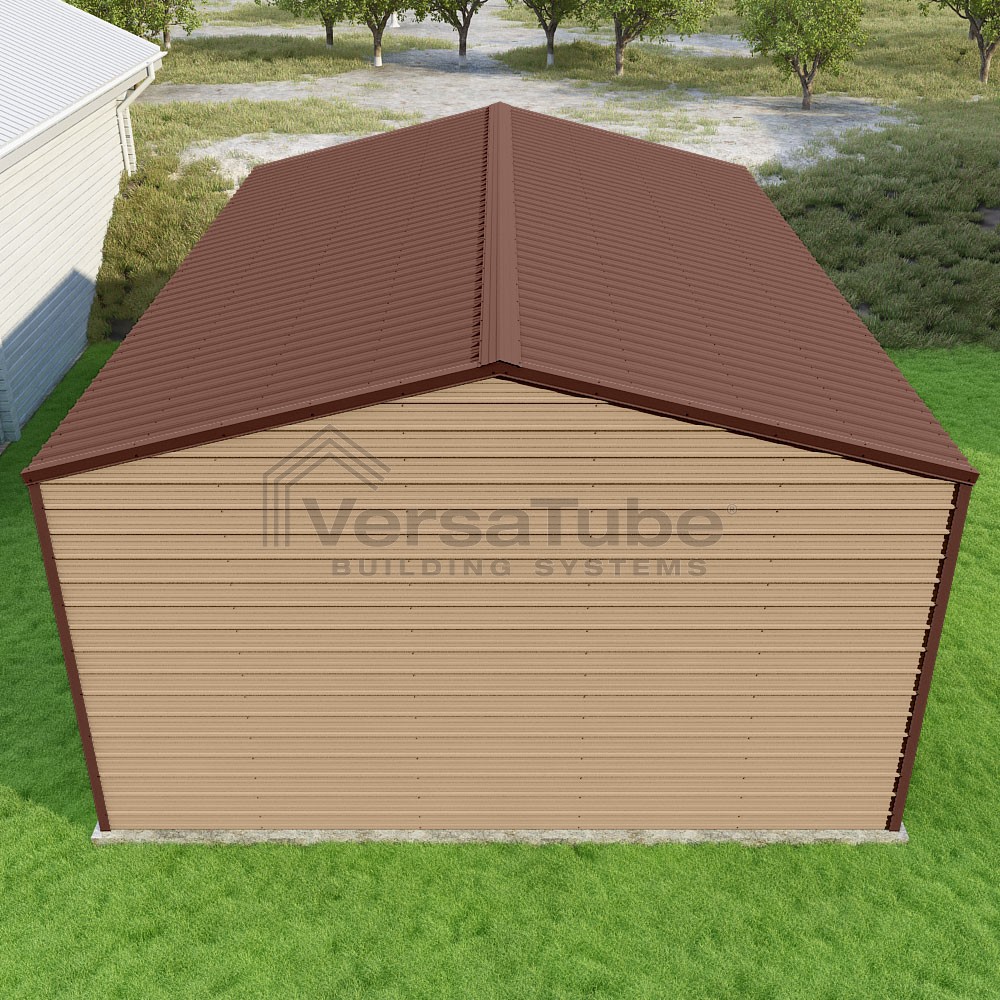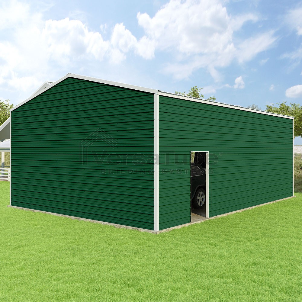 Frontier Series DIY garage kit features vertical sheet metal roof panels with horizontal siding panels..