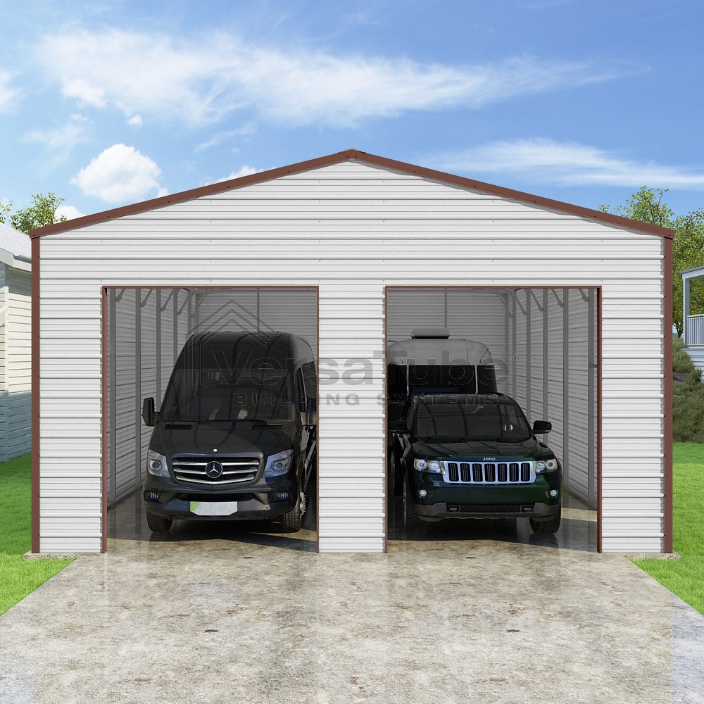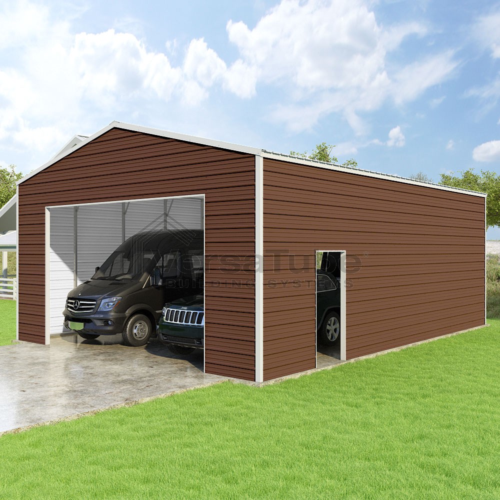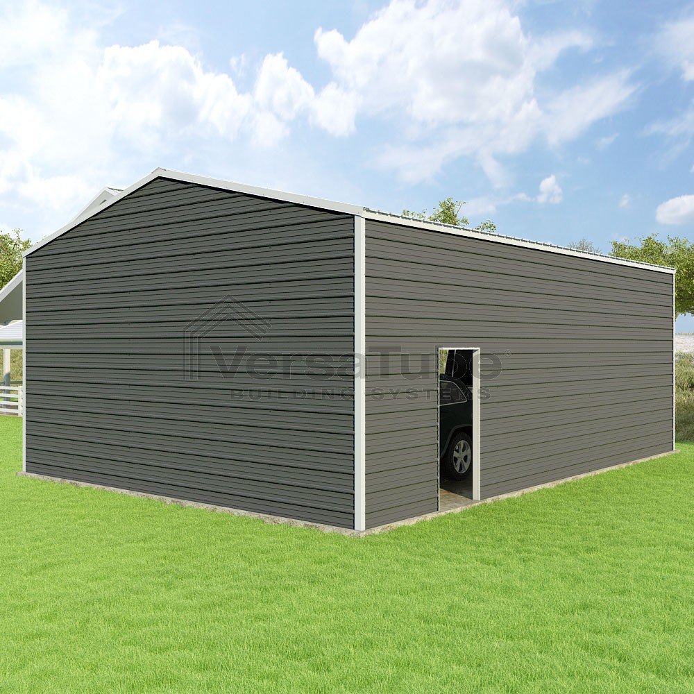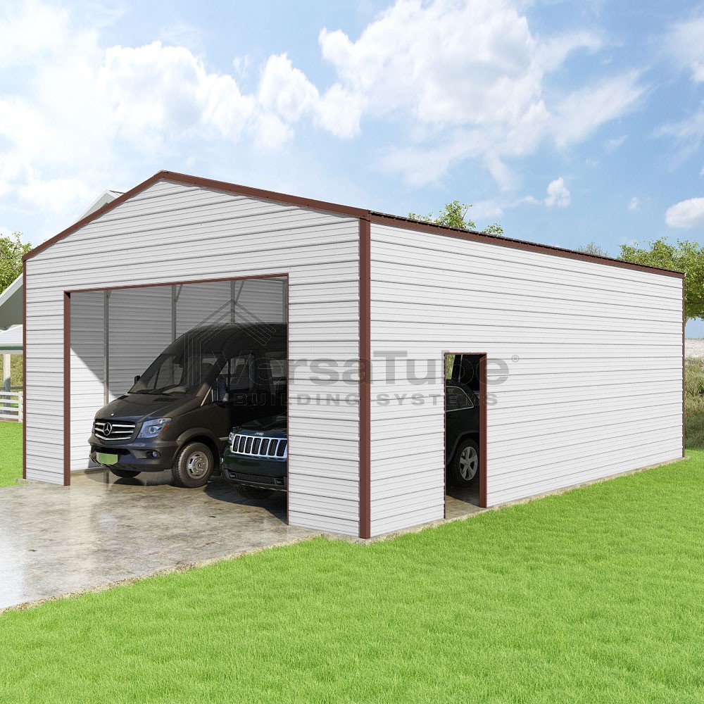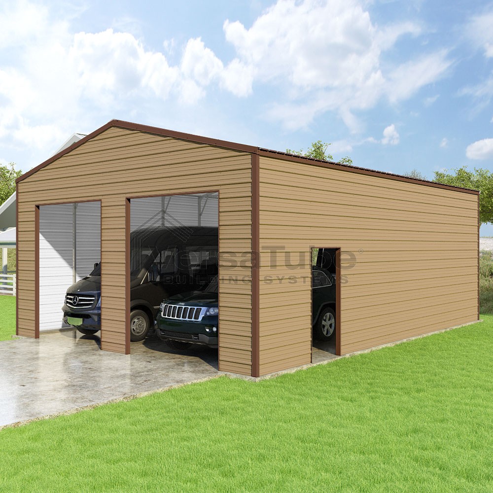 Frontier Series DIY garage kit features vertical sheet metal roof panels with horizontal siding panels..