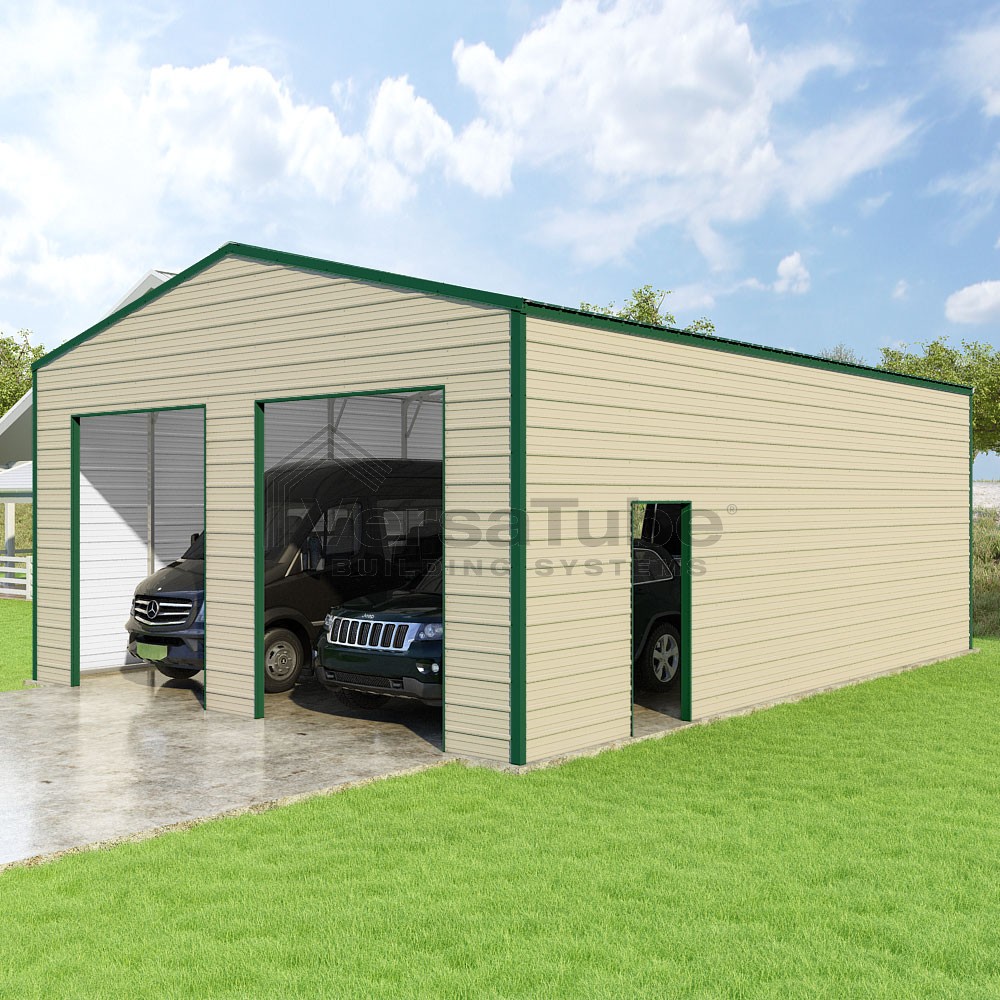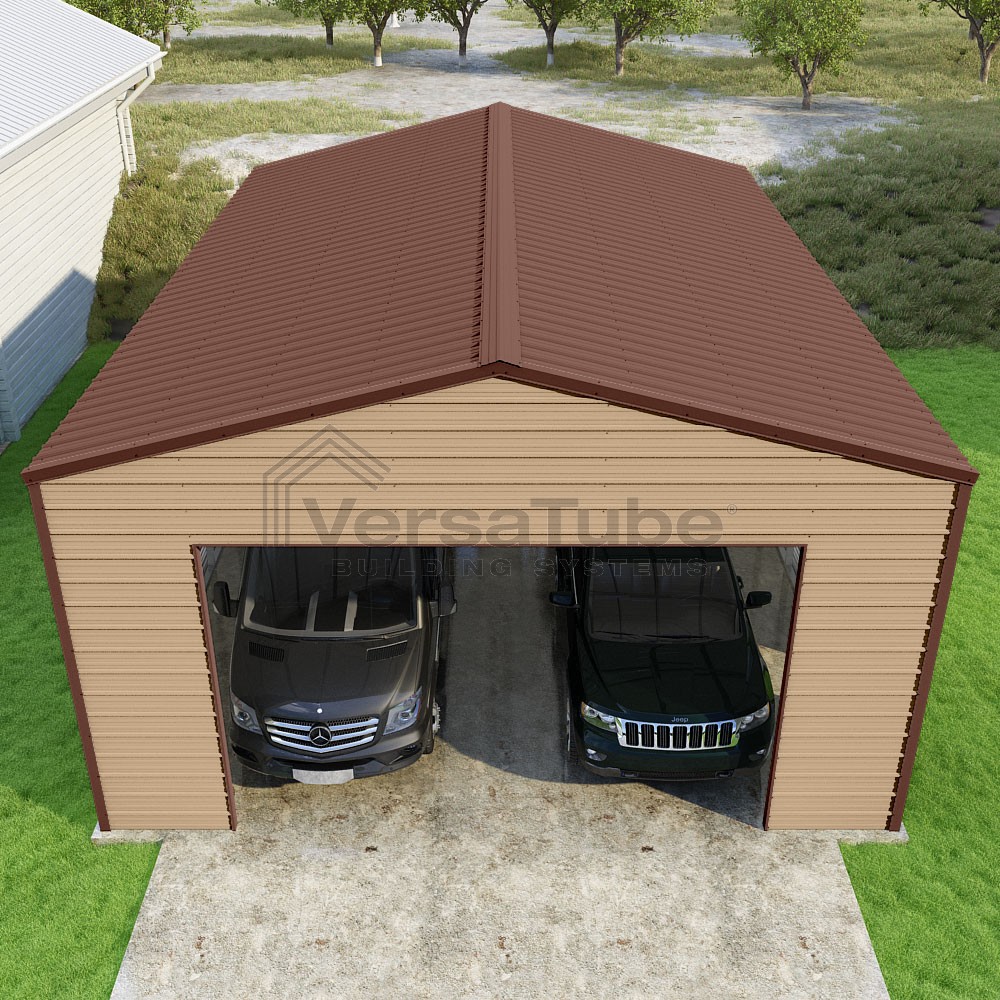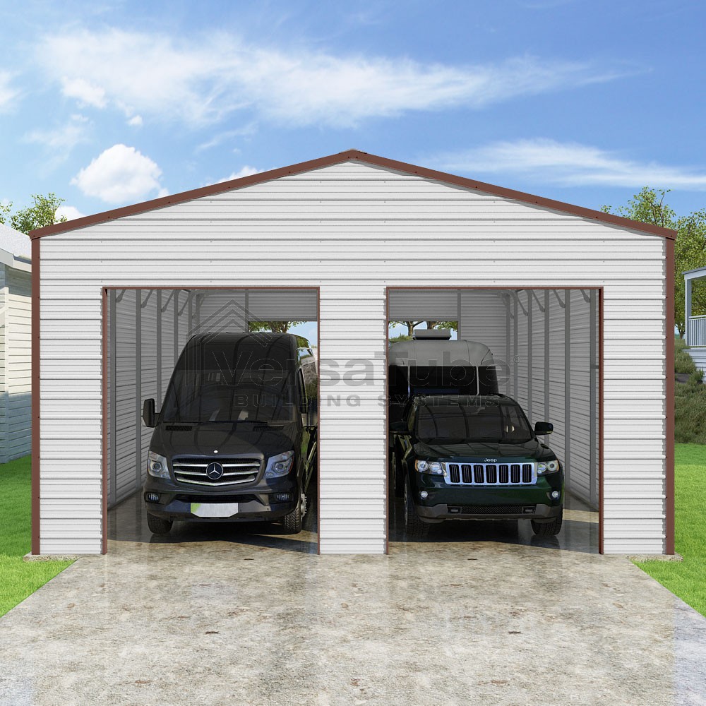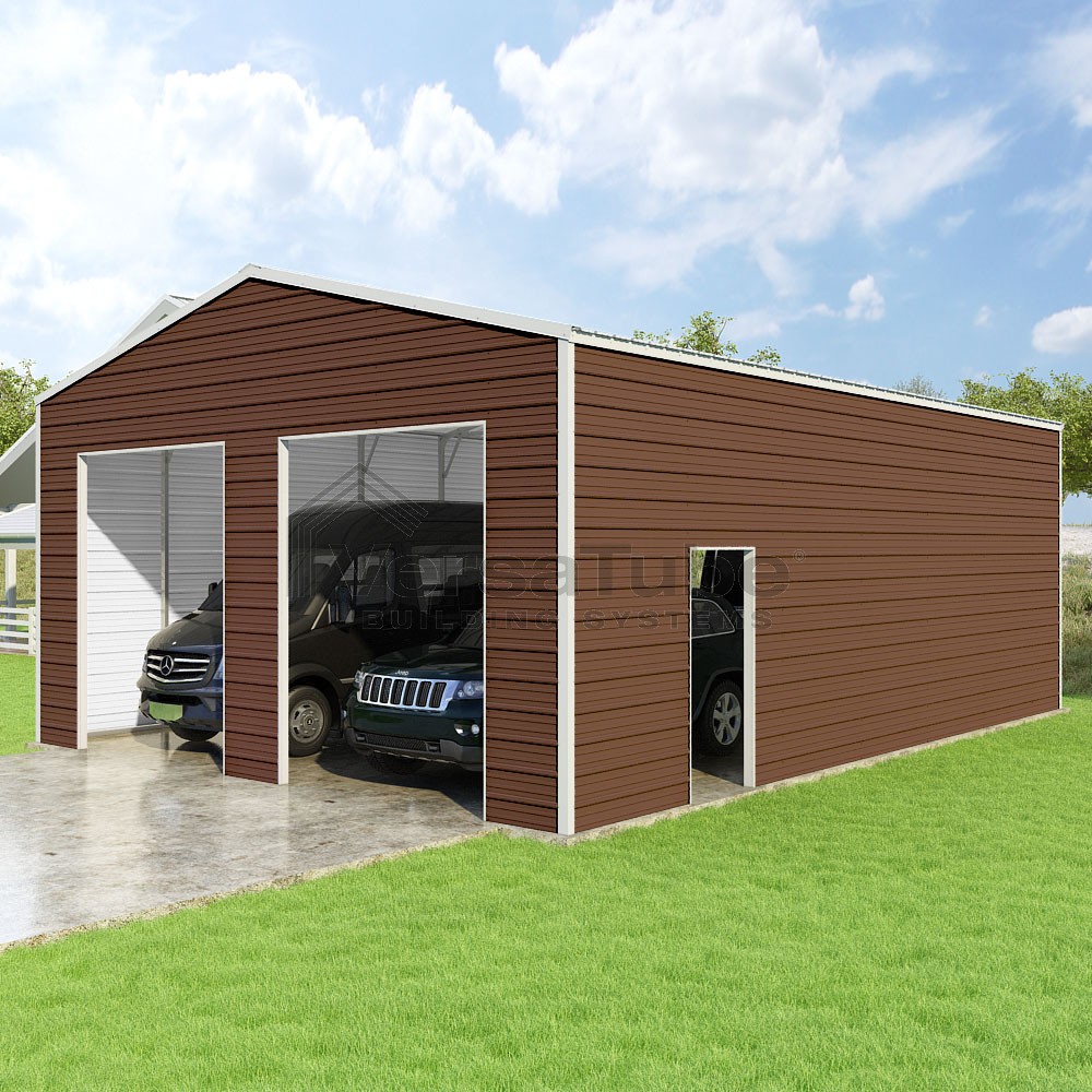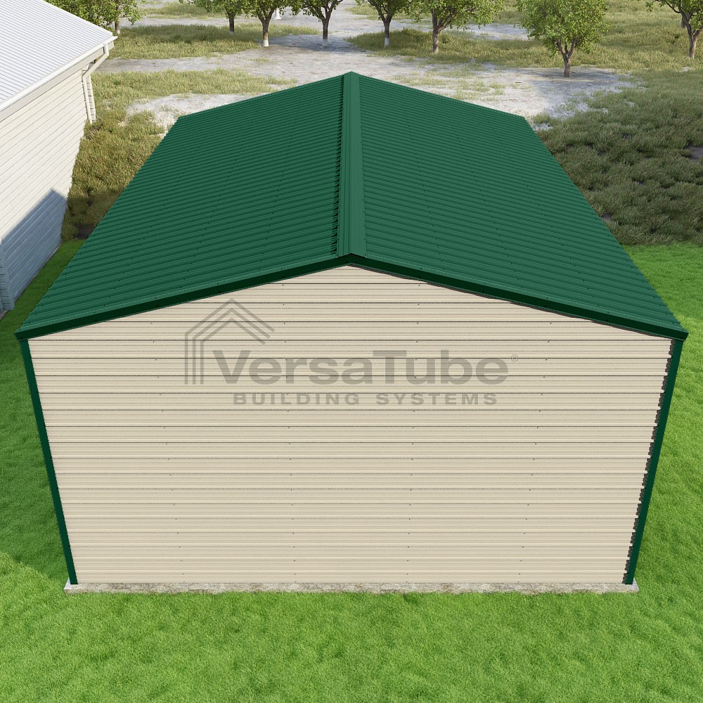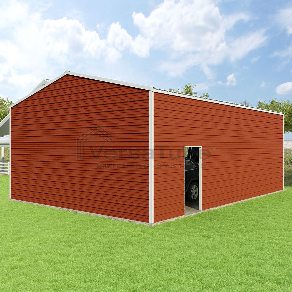 Frontier Series DIY garage kit features vertical sheet metal roof panels with horizontal siding panels..