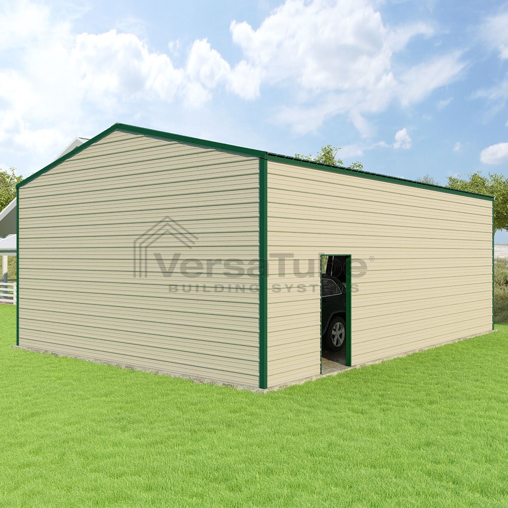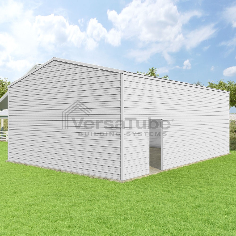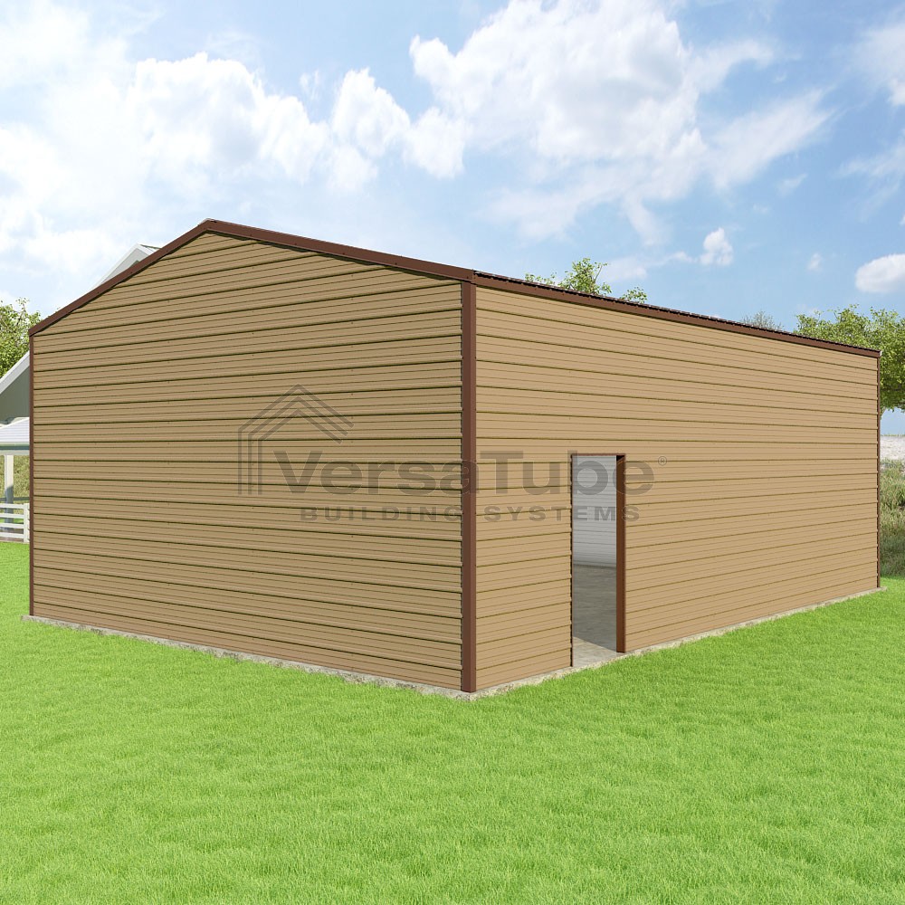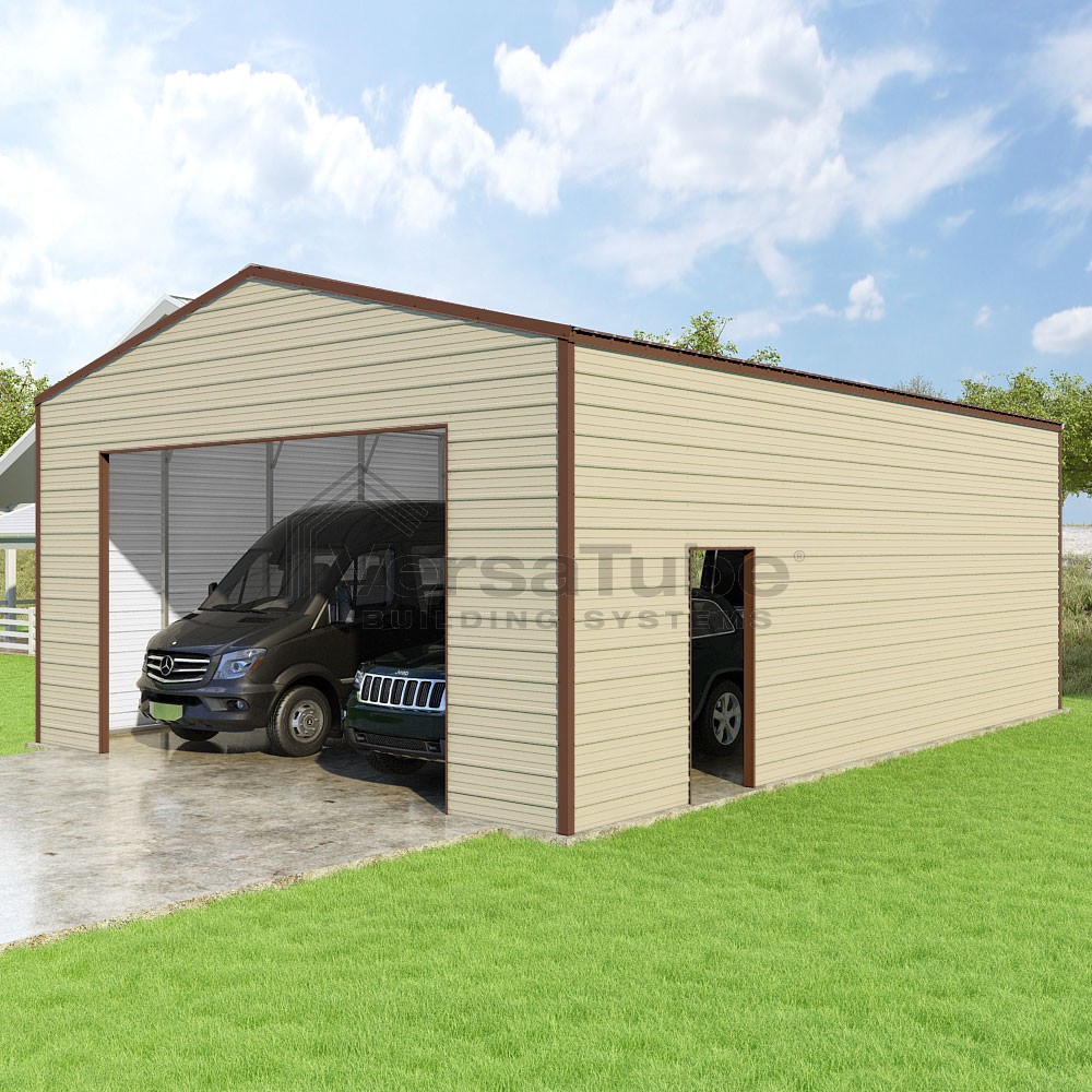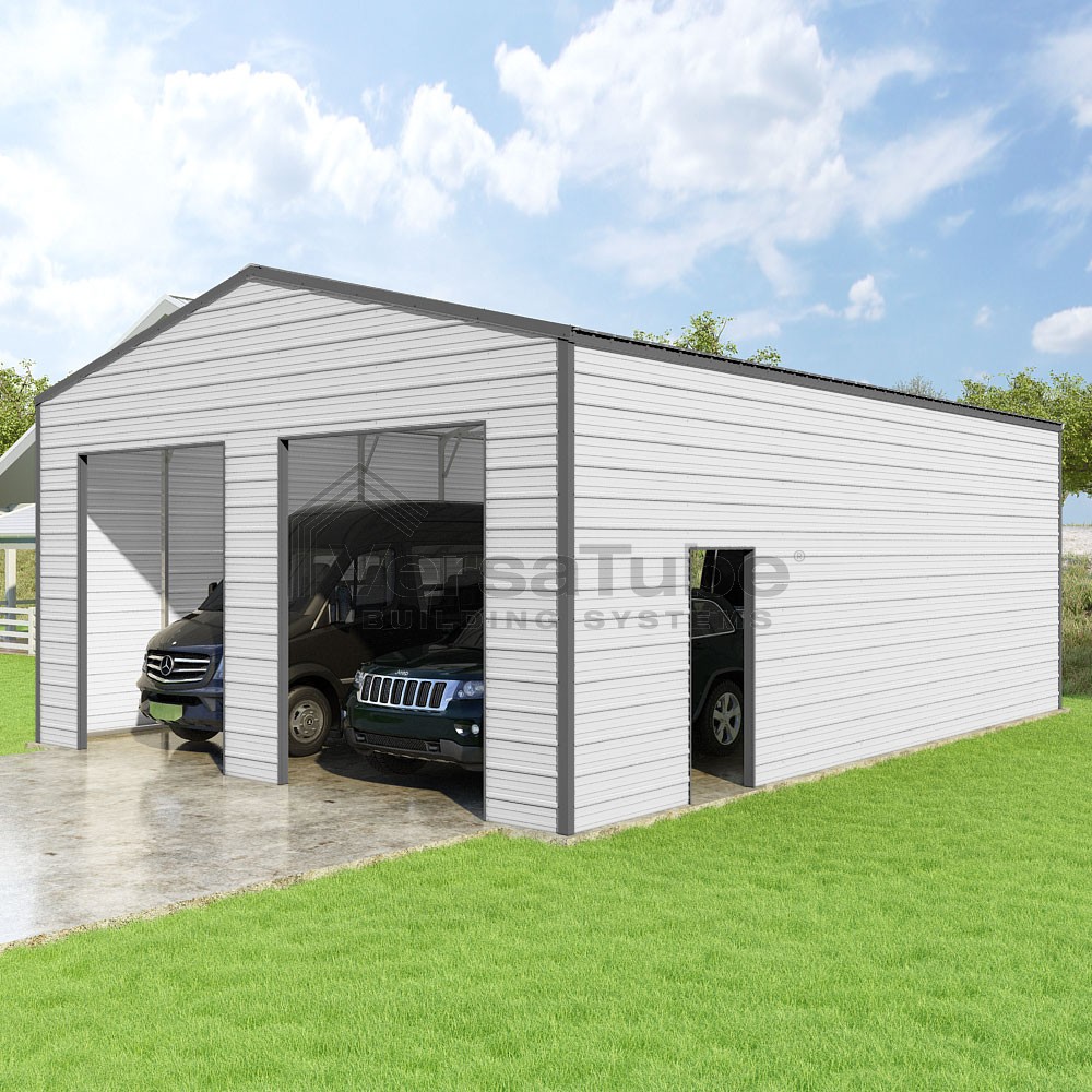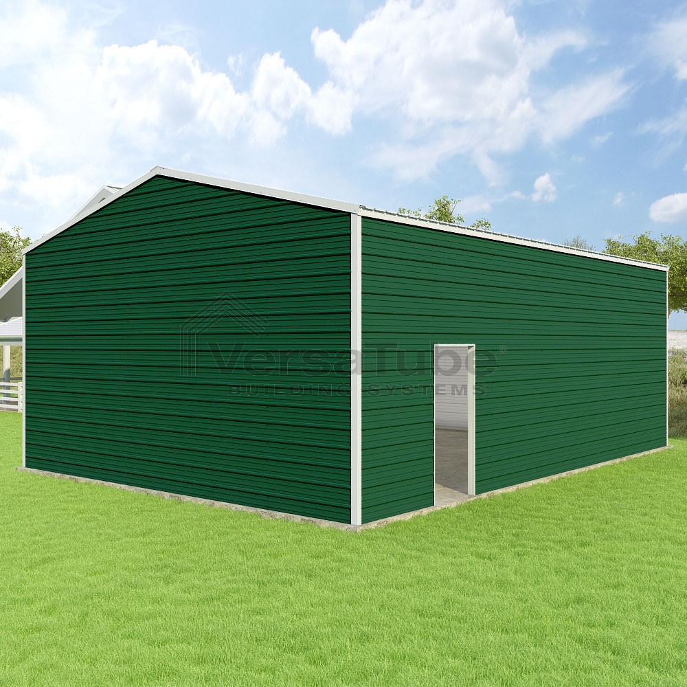 Frontier Series DIY garage kit features vertical sheet metal roof panels with horizontal siding panels..