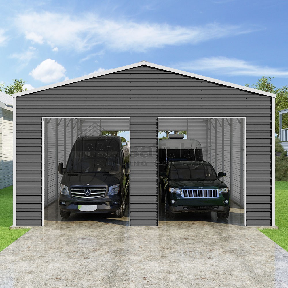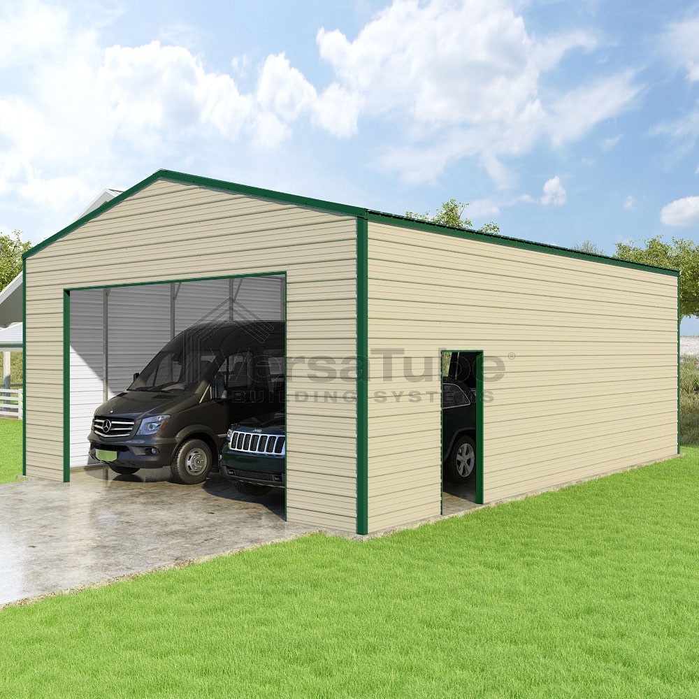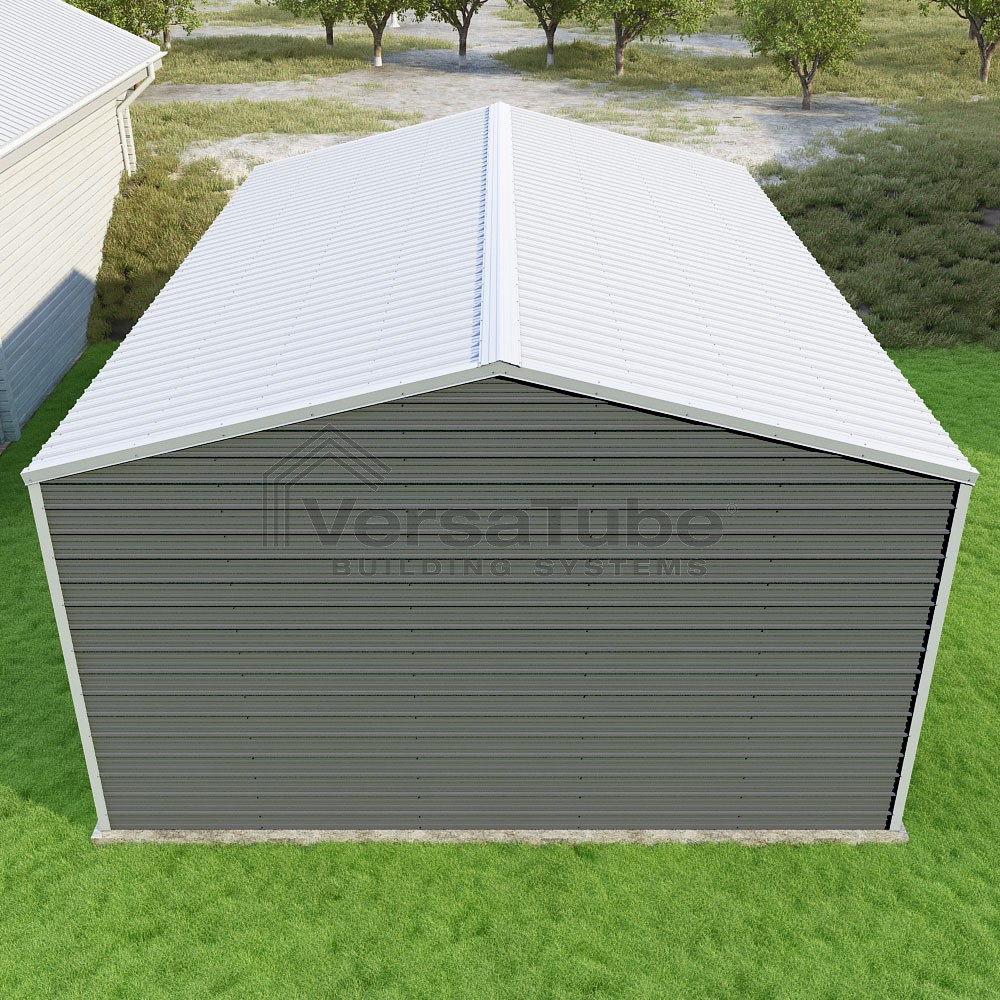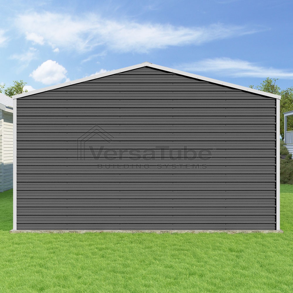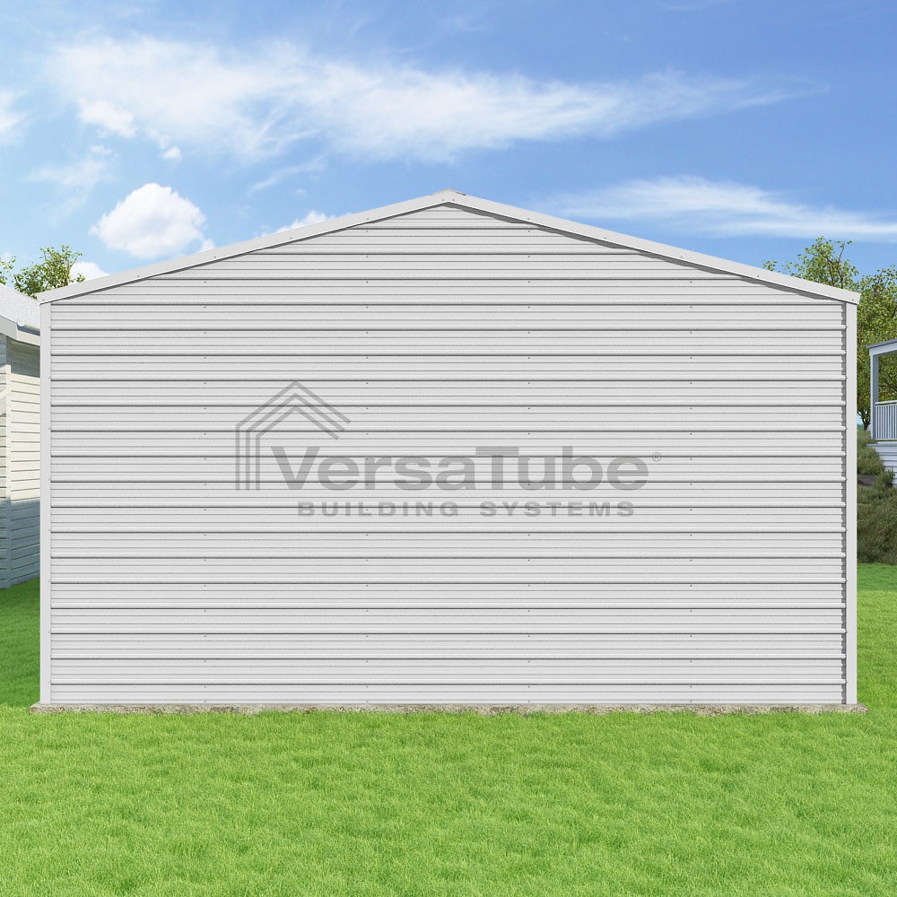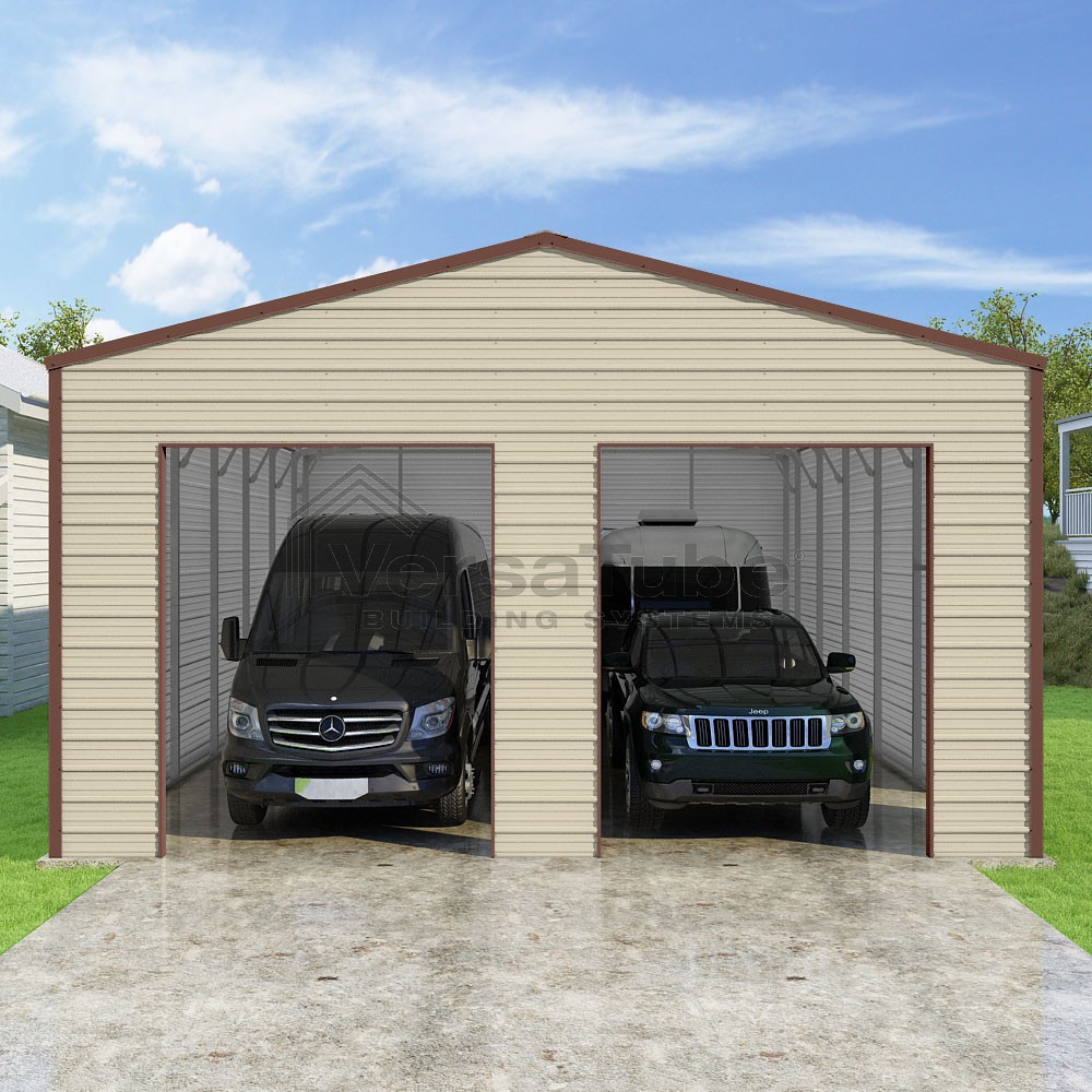 Frontier Series DIY garage kit features vertical sheet metal roof panels with horizontal siding panels..