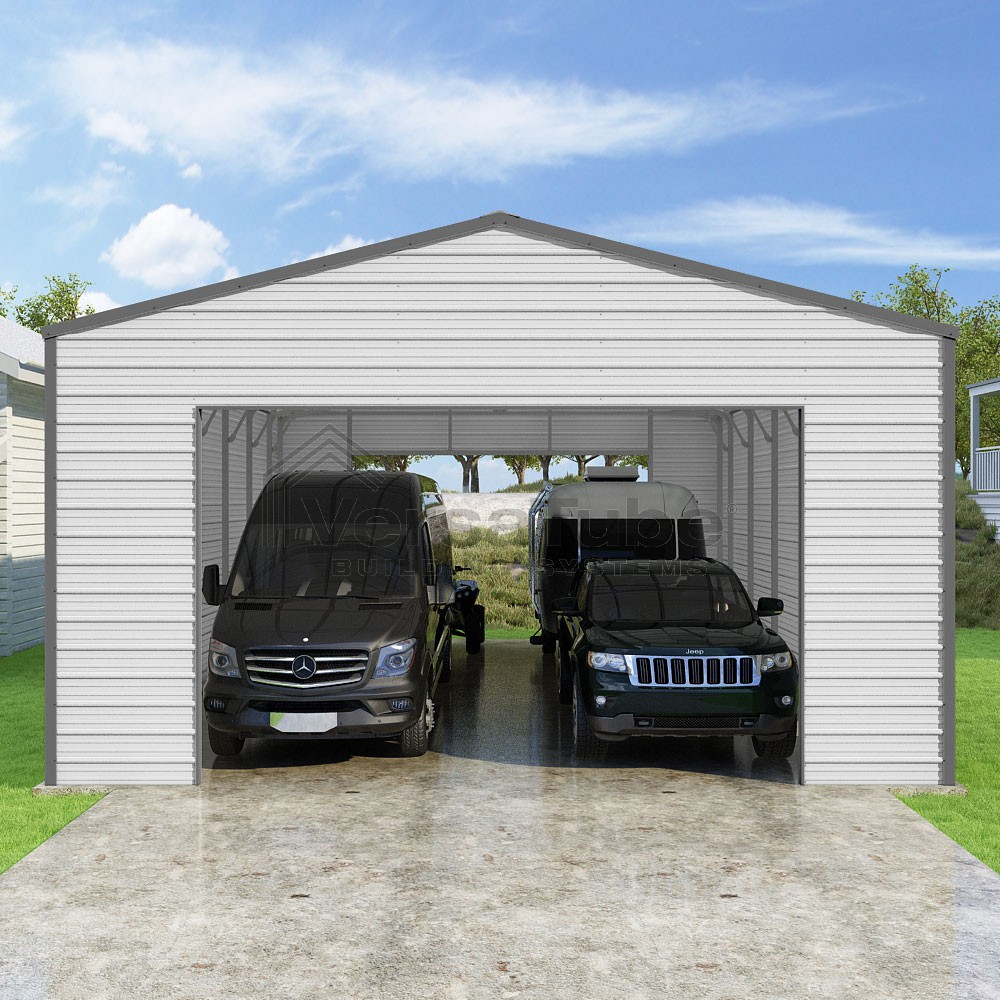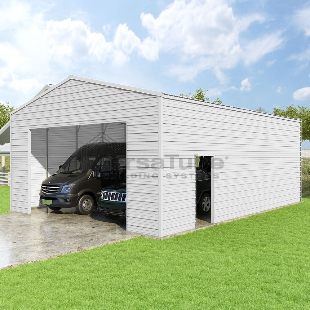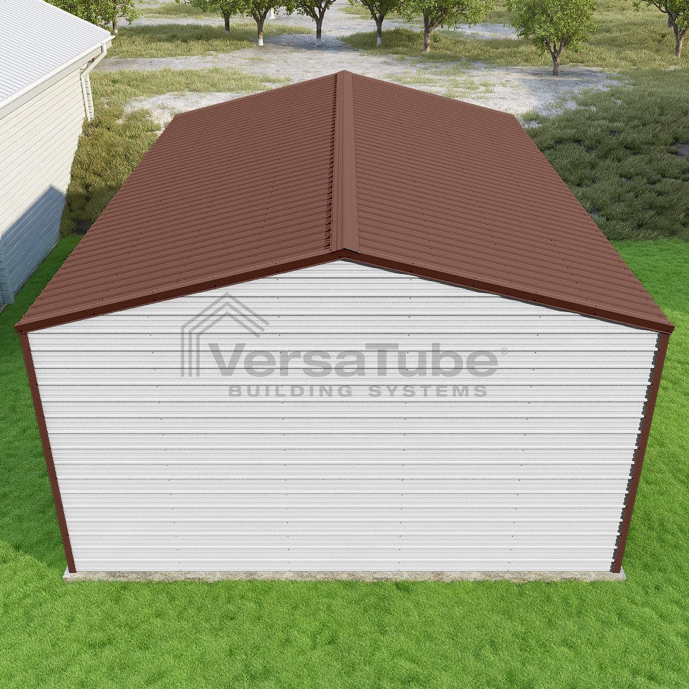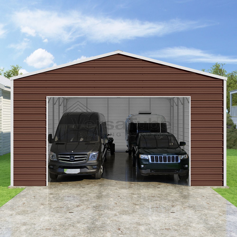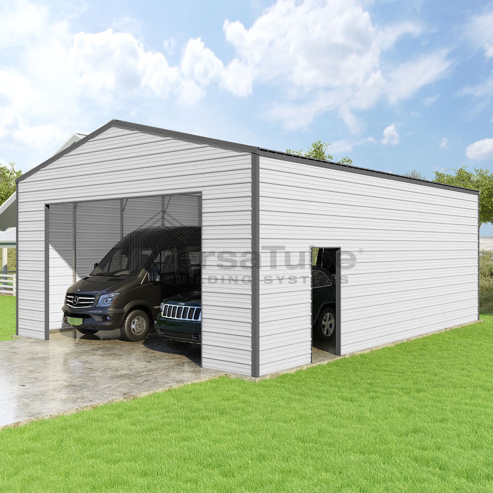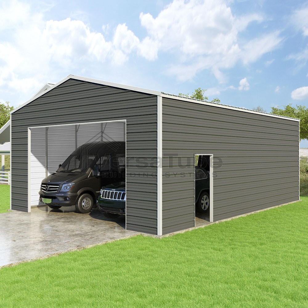 Frontier Series DIY garage kit features vertical sheet metal roof panels with horizontal siding panels..