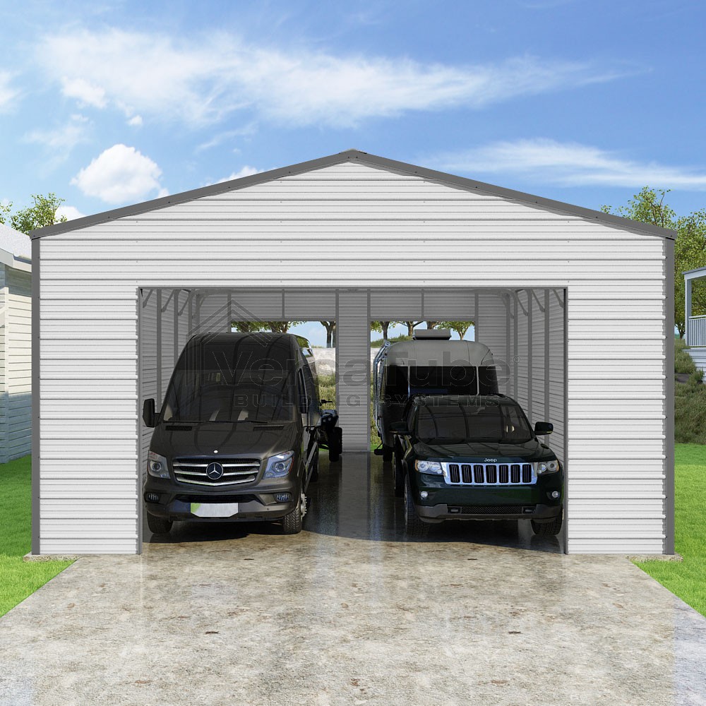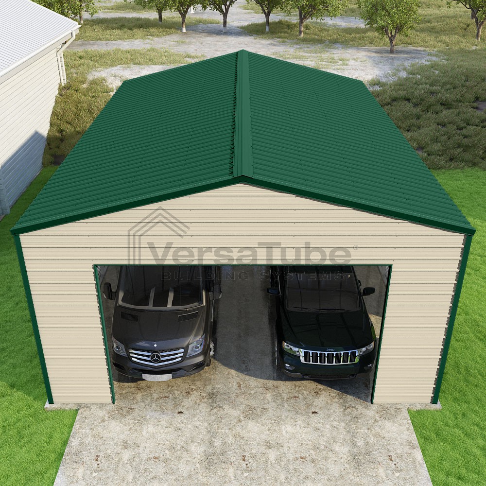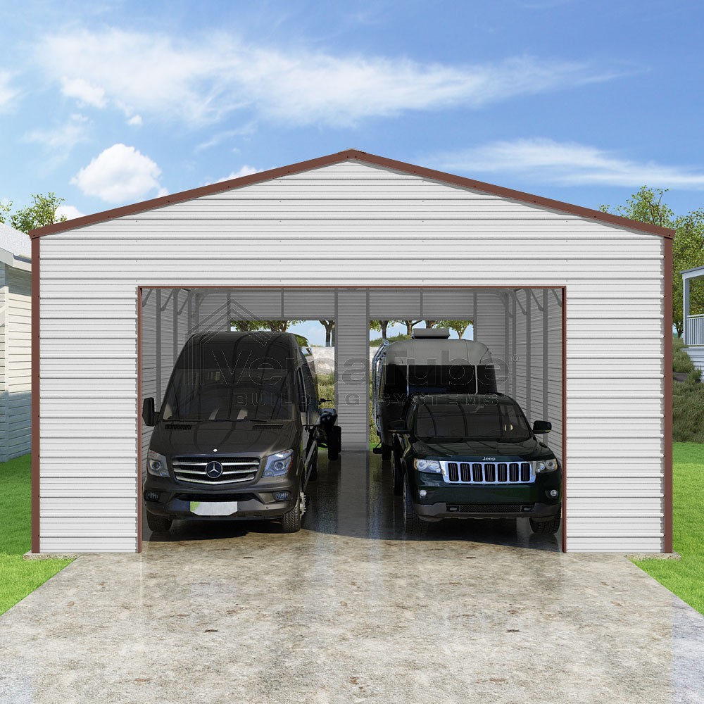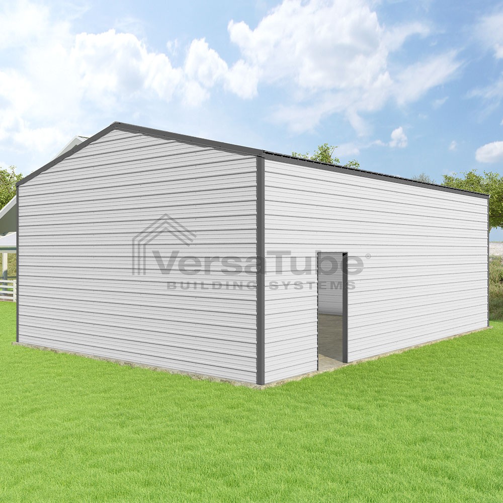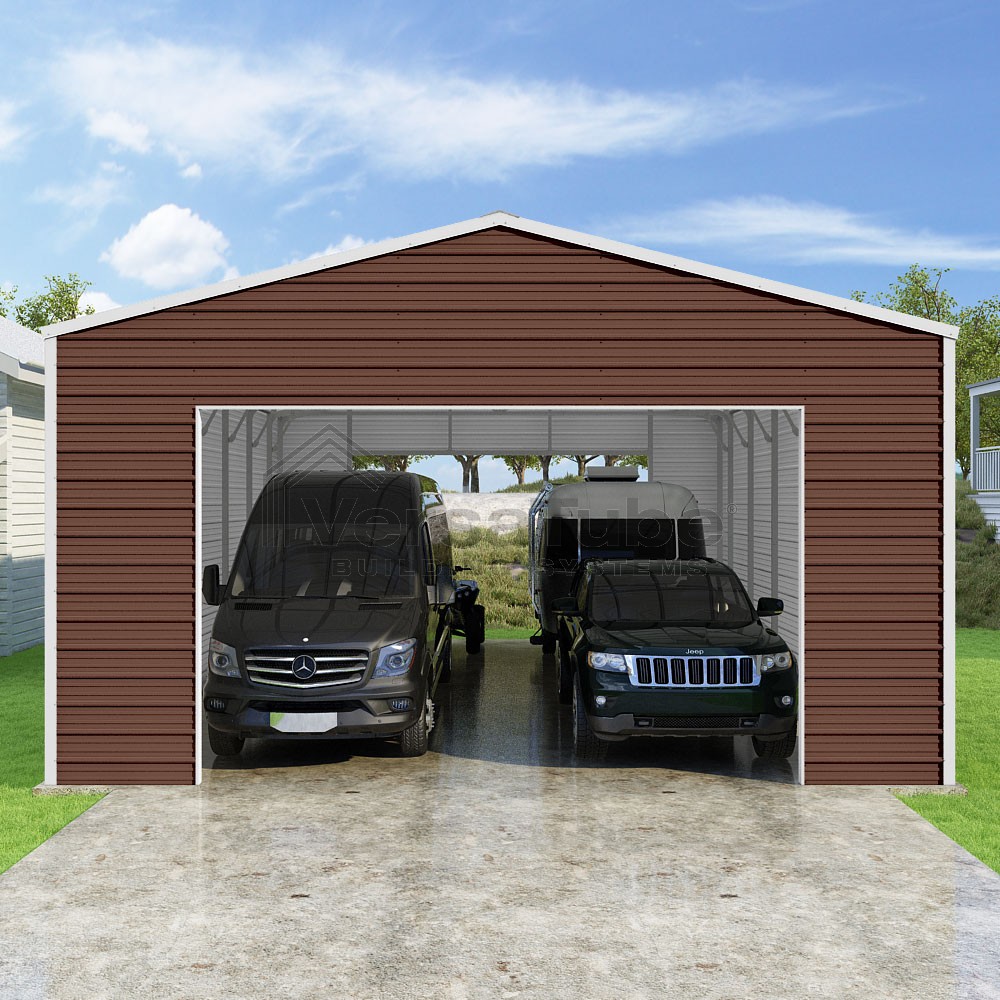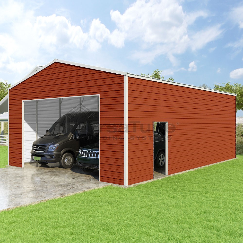 Frontier Series DIY garage kit features vertical sheet metal roof panels with horizontal siding panels..